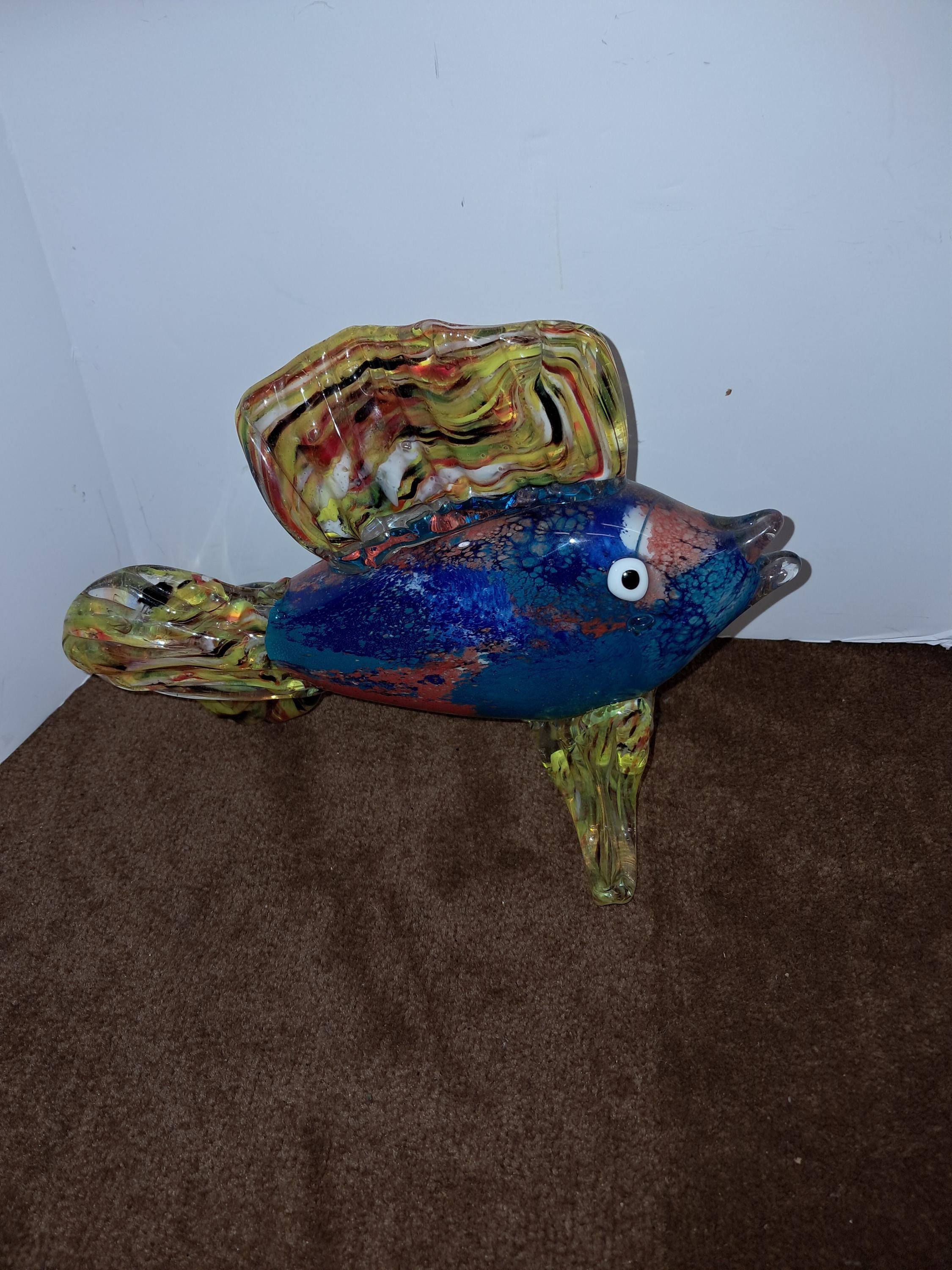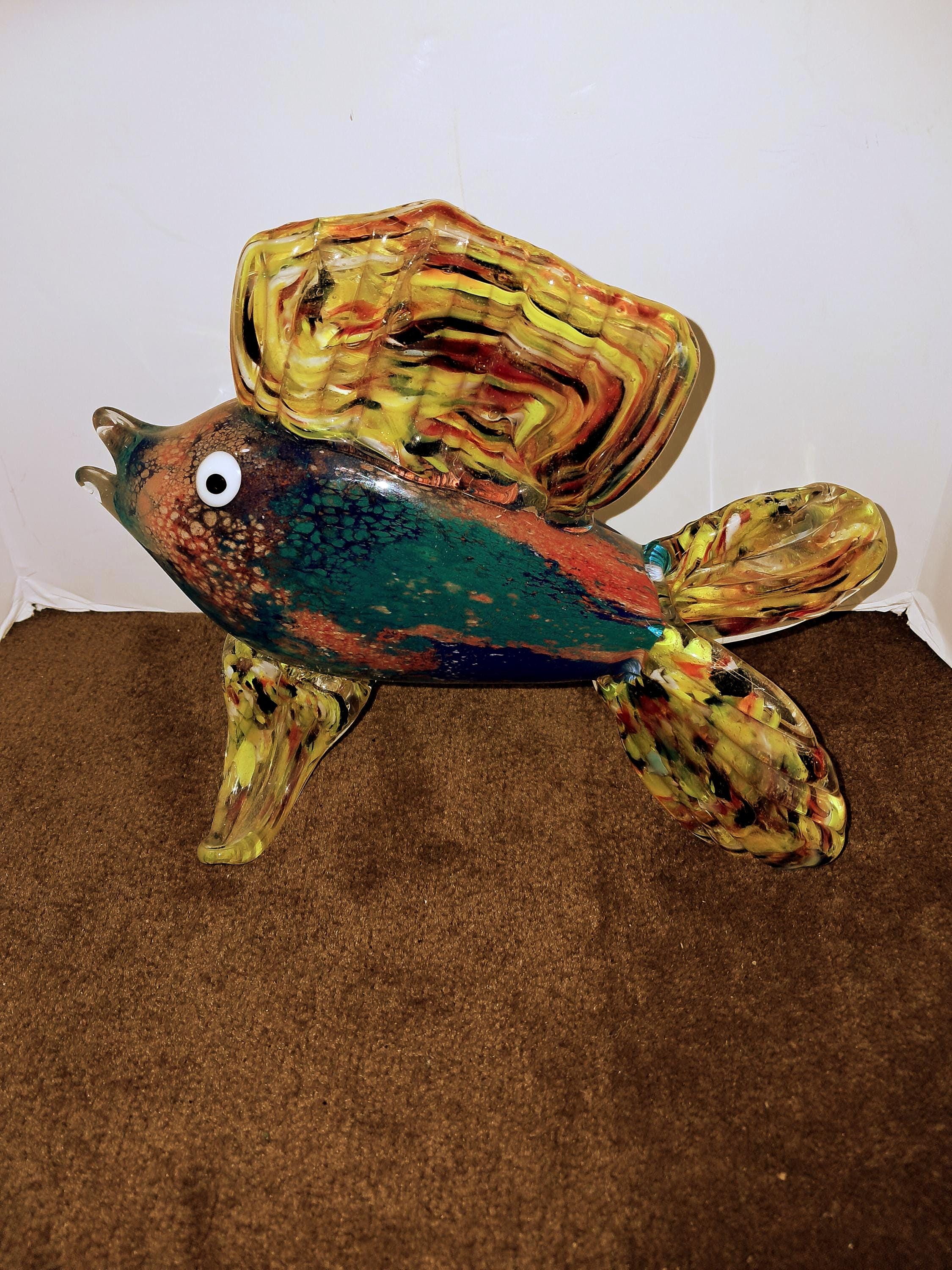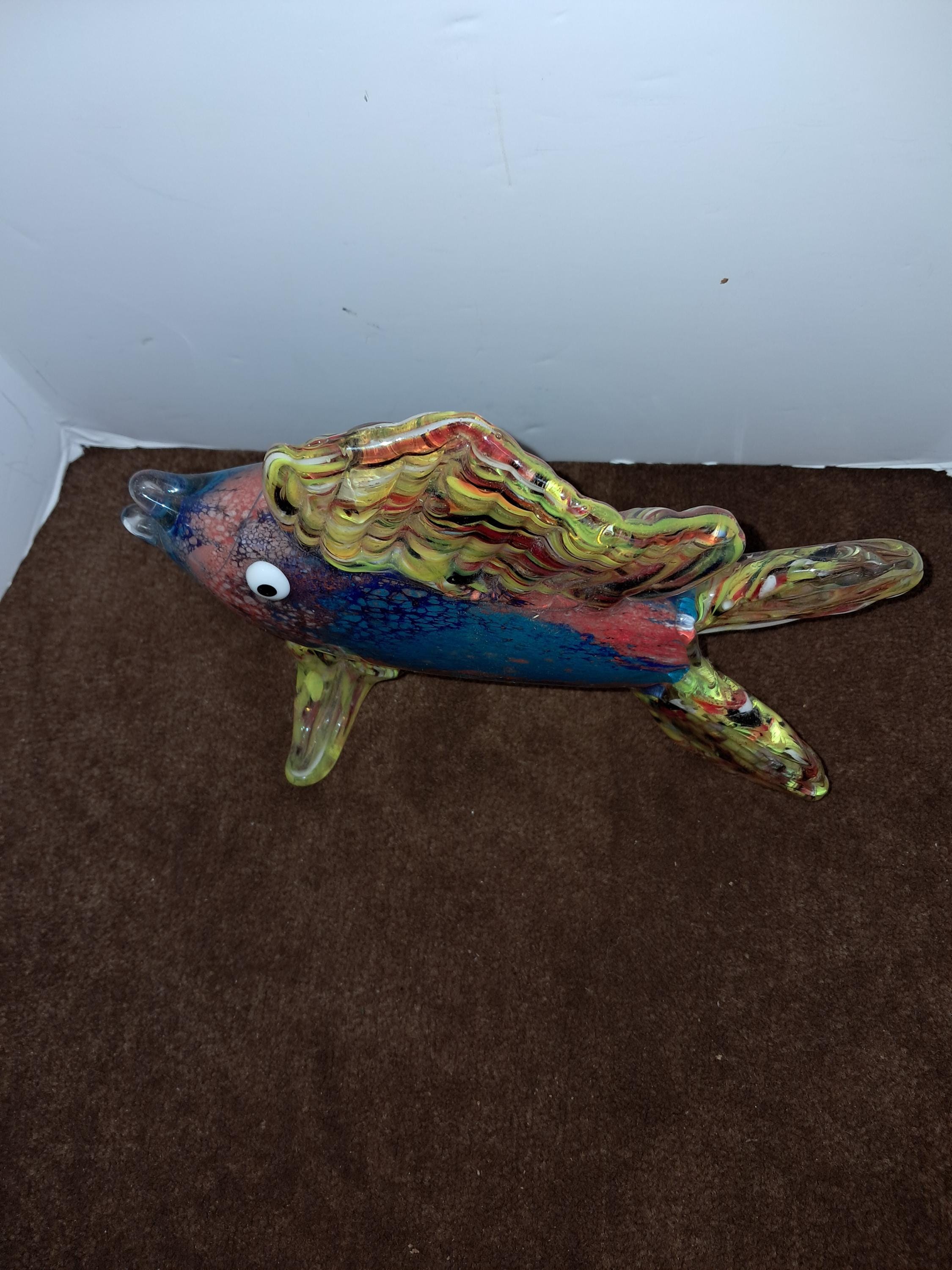 EXQUISITE hand blown multicolored art glass LARGE decorative fish sculpture. Beautiful confetti glass applied fins, with solid milk glass eyes. This is a LARGE art piece. This comes from an estate sale of a Murano collector, unfortunately there was no packaging, and any stickers had been removed. This piece falls in line with many Murano made mid-century collectibles that were quite amazing and vibrant including their clown series. There are no chips or cracks. This is a truly beautiful collectible. Please see all photos as part of description for exact condition, measurements and amazing detail. An incredible display art piece.