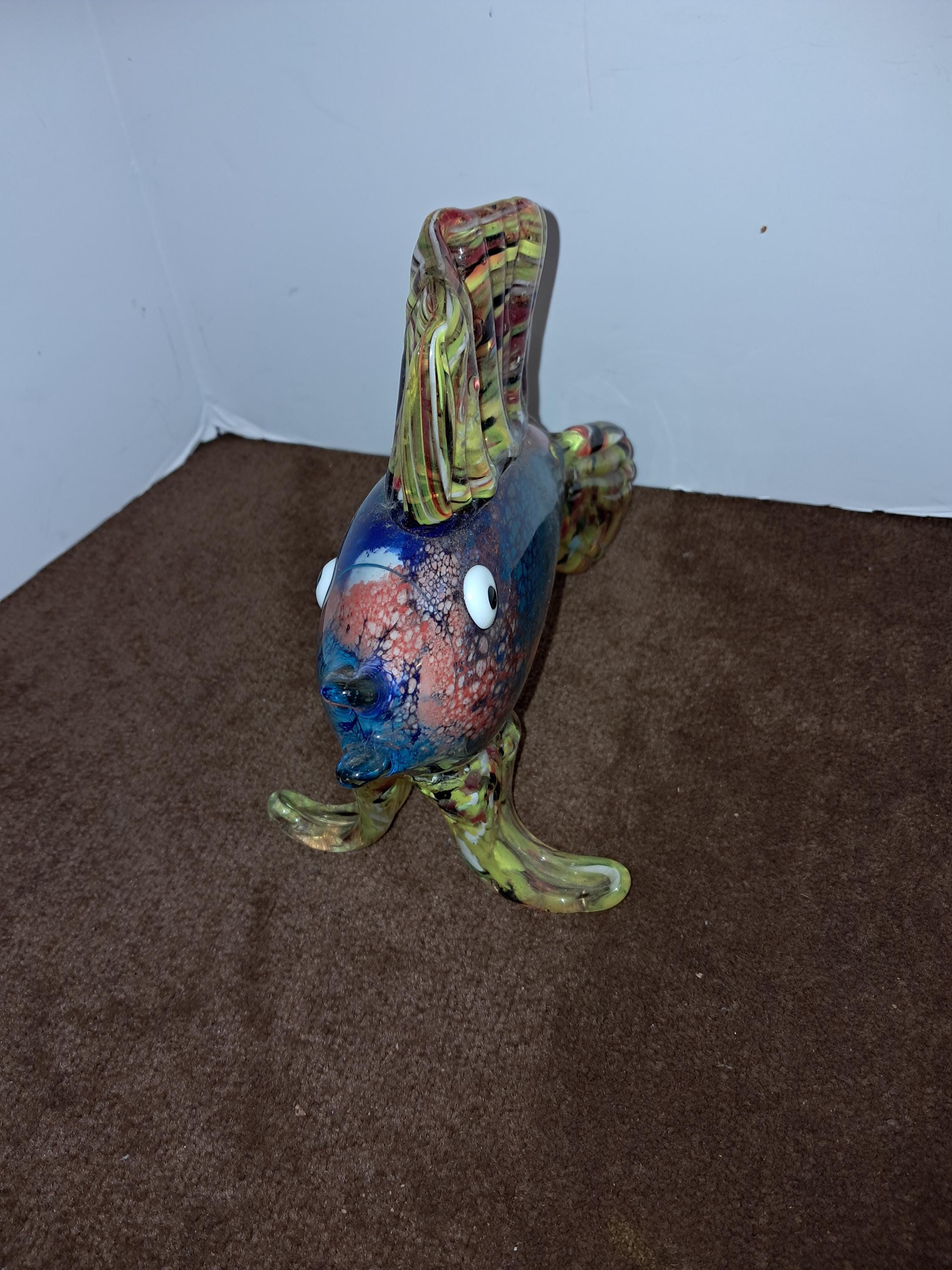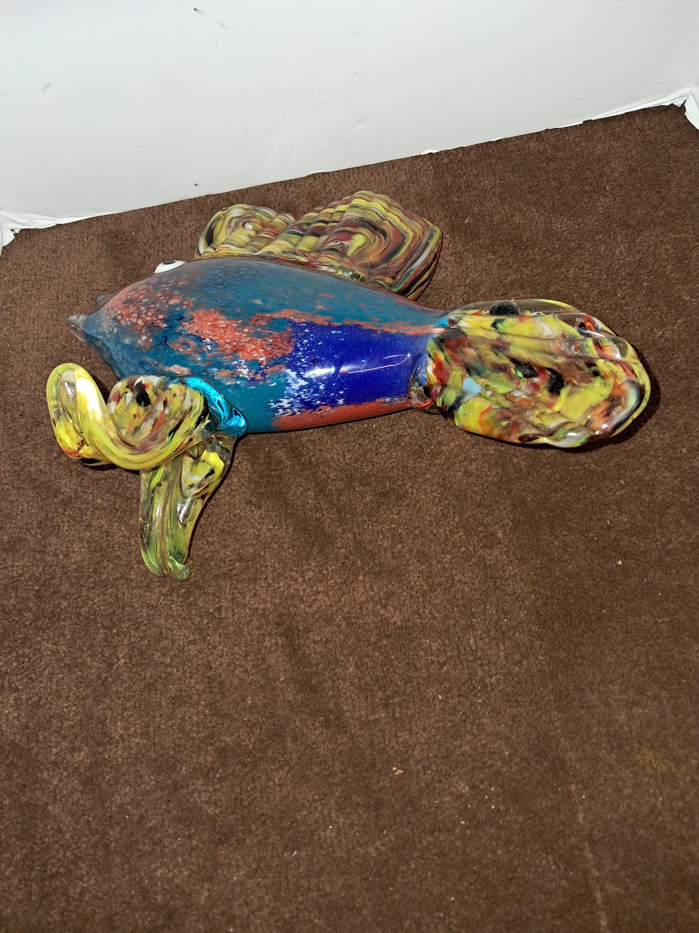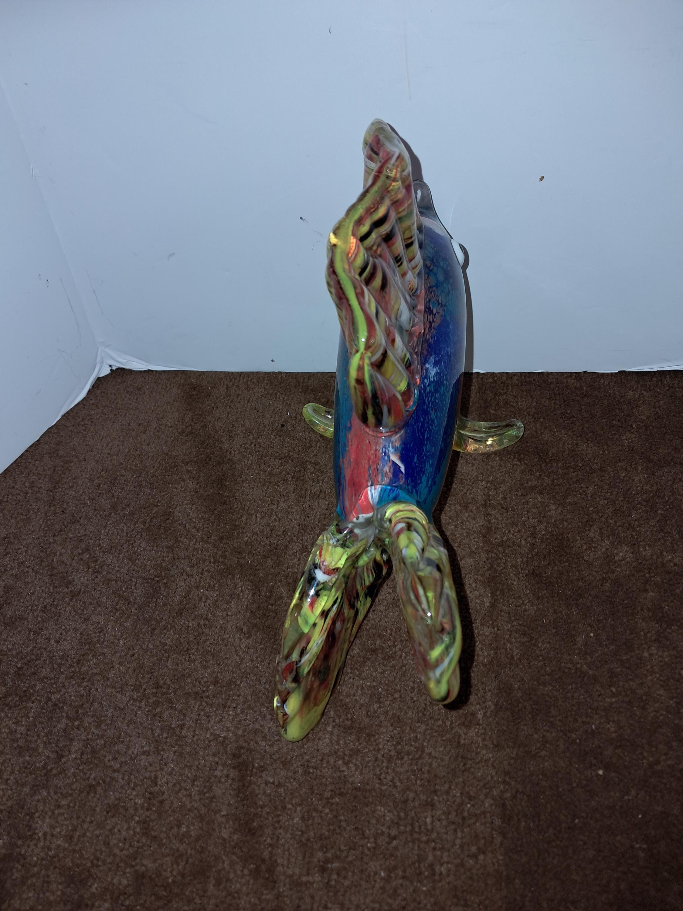 EXQUISITE hand blown multicolored art glass LARGE decorative fish sculpture. Beautiful confetti glass applied fins, with solid milk glass eyes. This is a LARGE art piece. This comes from an estate sale of a Murano collector, unfortunately there was no packaging, and any stickers had been removed. This piece falls in line with many Murano made mid-century collectibles that were quite amazing and vibrant including their clown series. There are no chips or cracks. This is a truly beautiful collectible. Please see all photos as part of description for exact condition, measurements and amazing detail. An incredible display art piece.