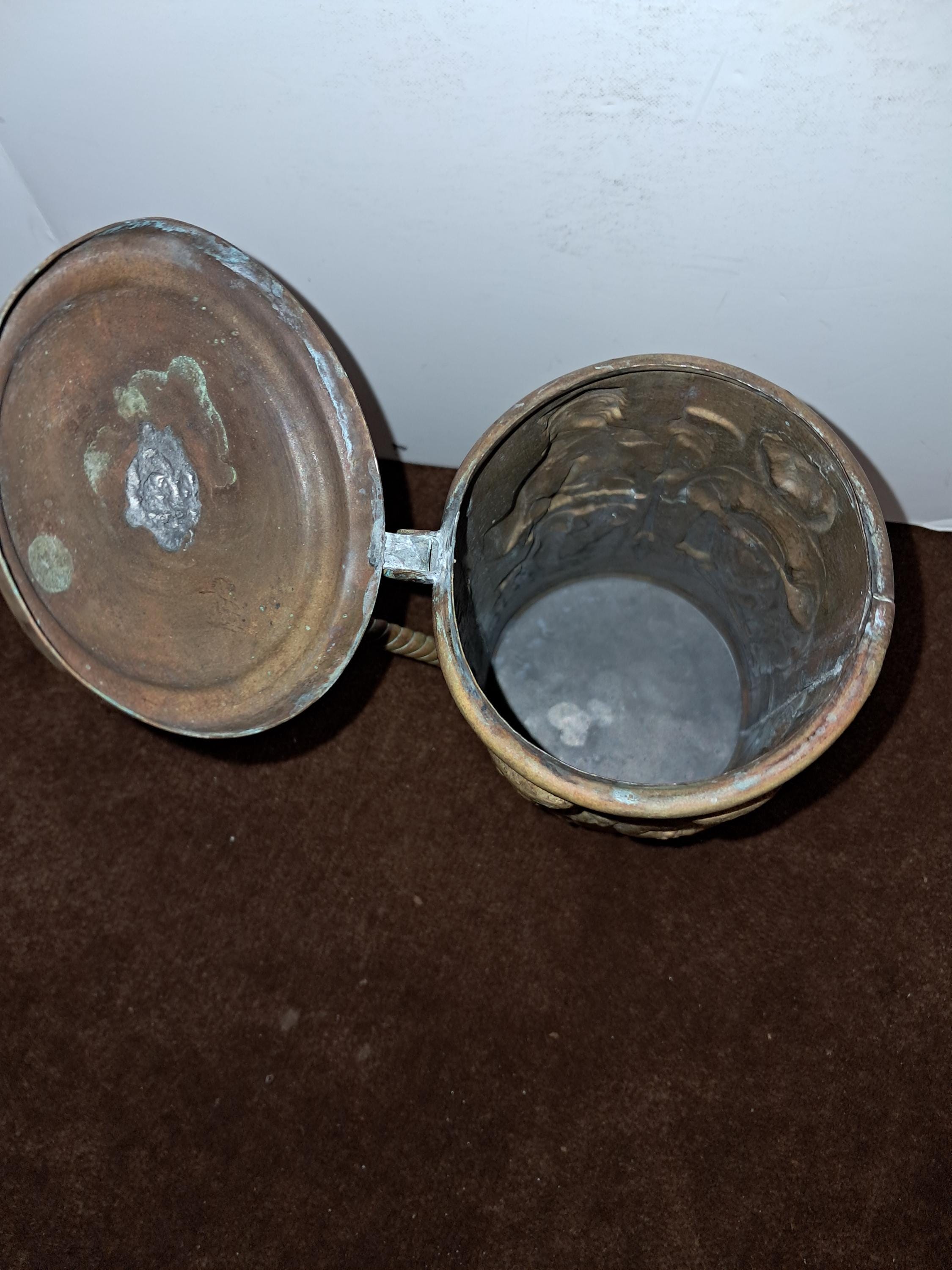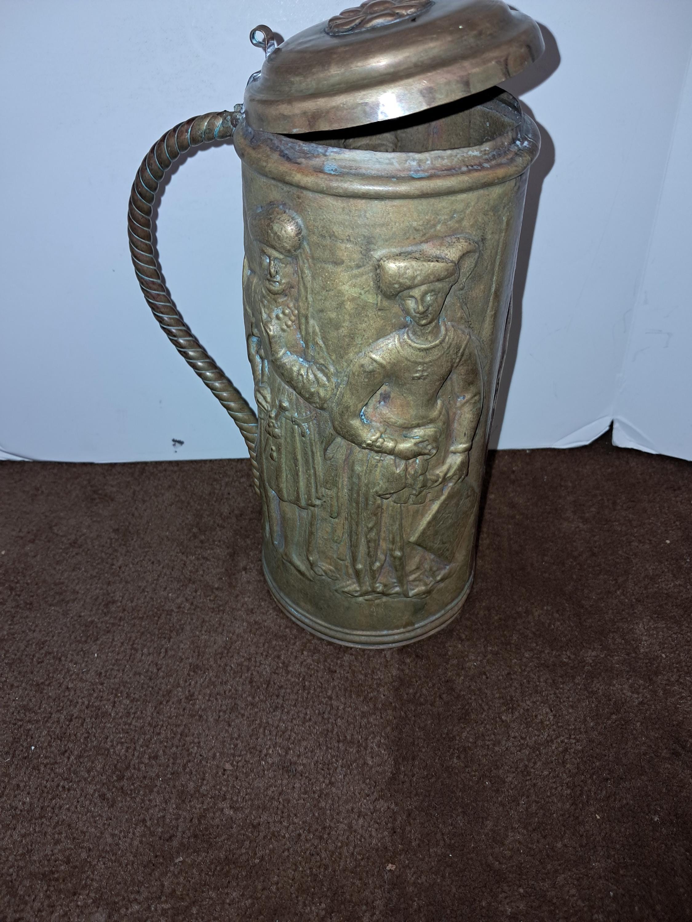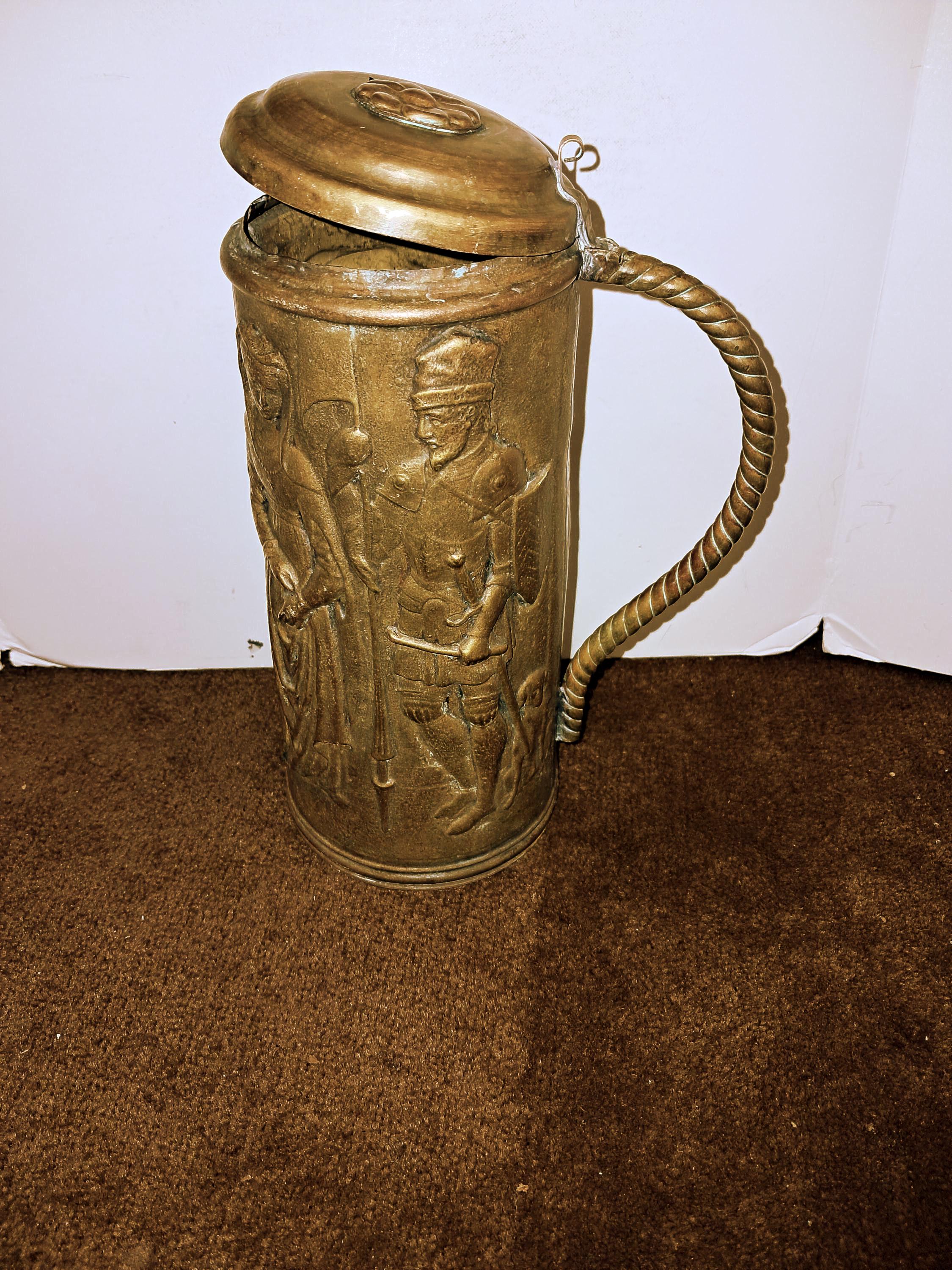 Antique Tall Embossed Brass Stein 9" tall x 6.25" wide ( with Handle) x 4" deep ( base)Very good vintage condition, No damages to Images on the Stein. Condition with age