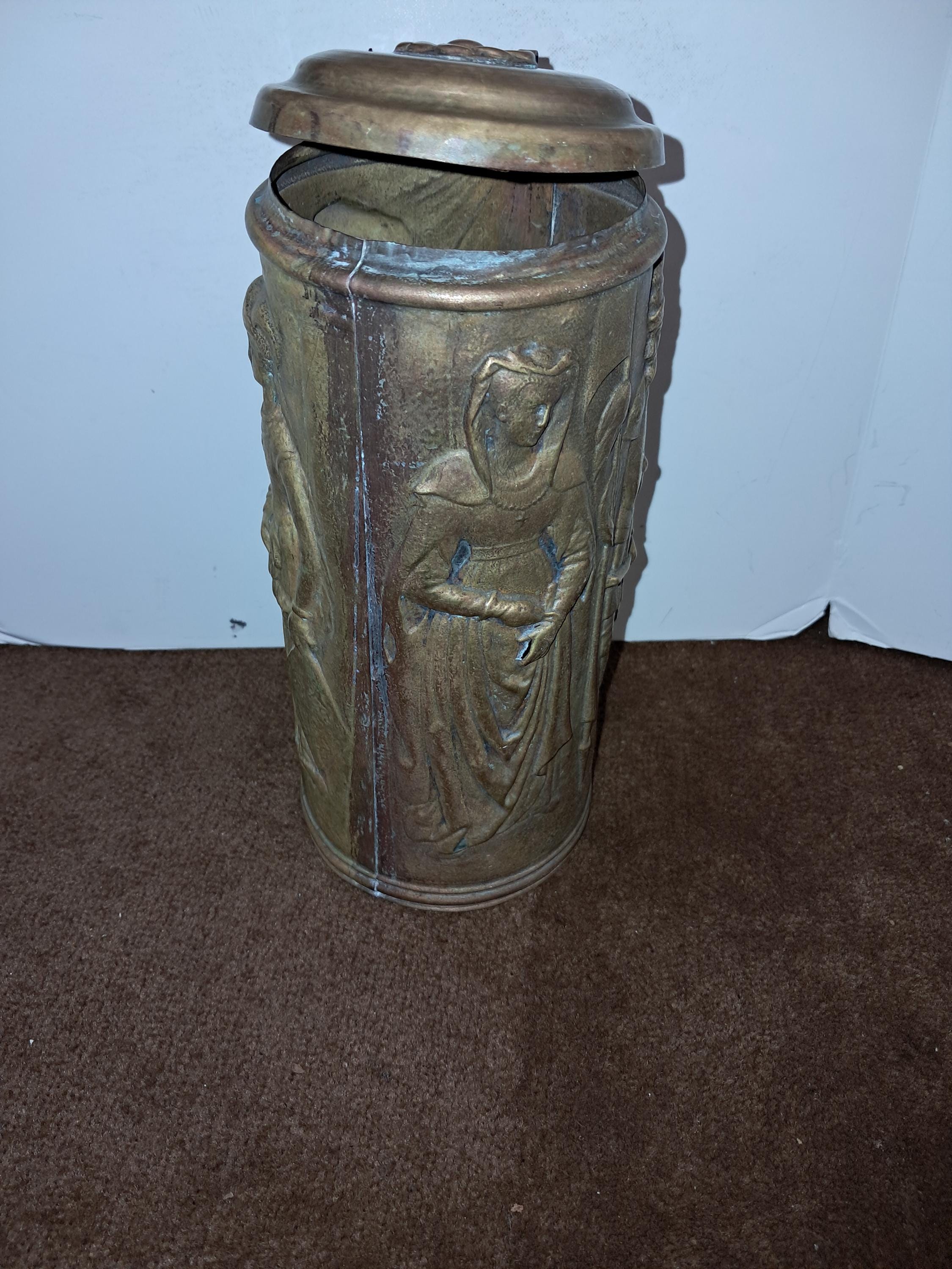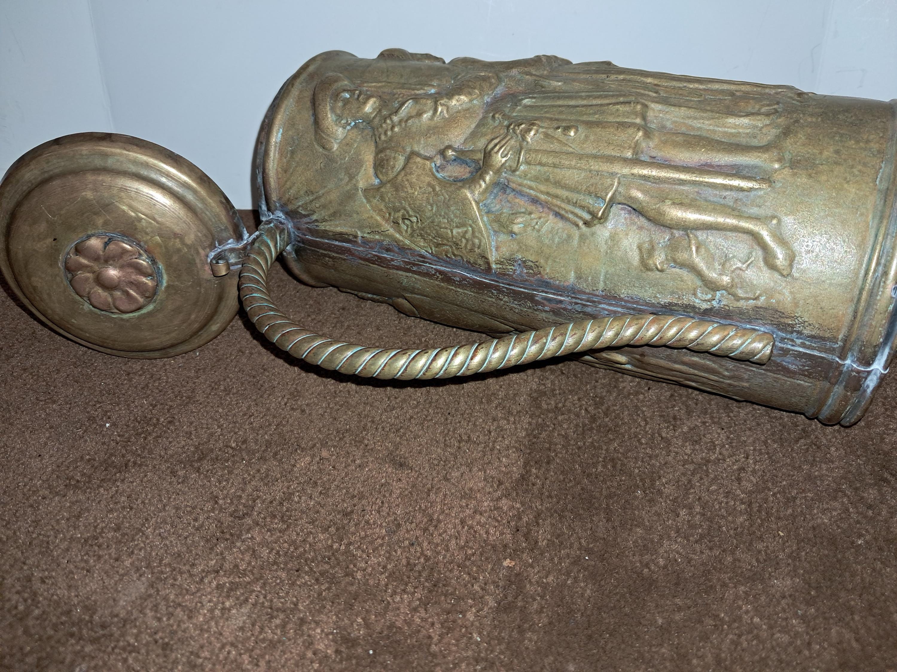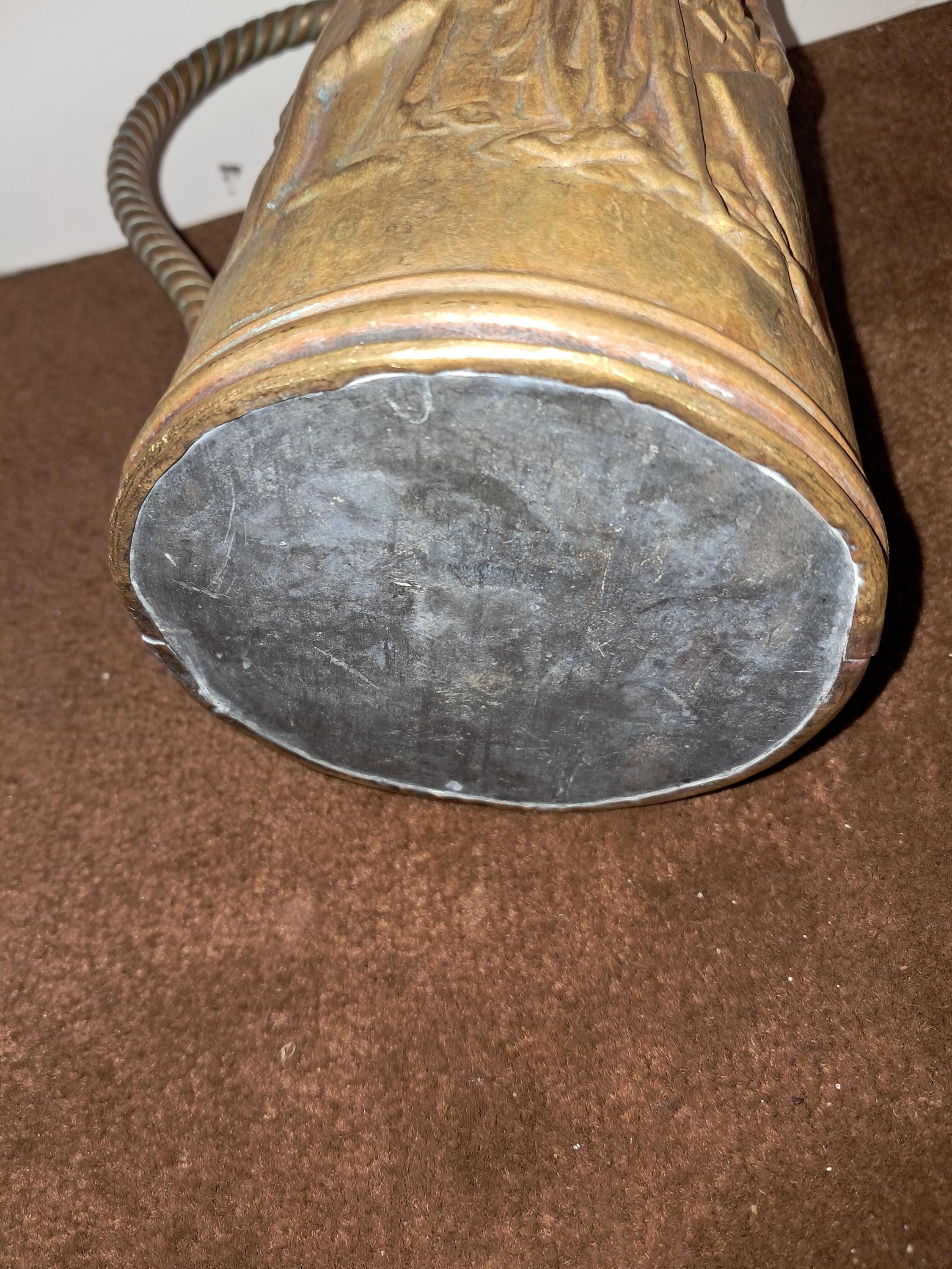 Antique Tall Embossed Brass Stein 9" tall x 6.25" wide ( with Handle) x 4" deep ( base)Very good vintage condition, No damages to Images on the Stein. Condition with age