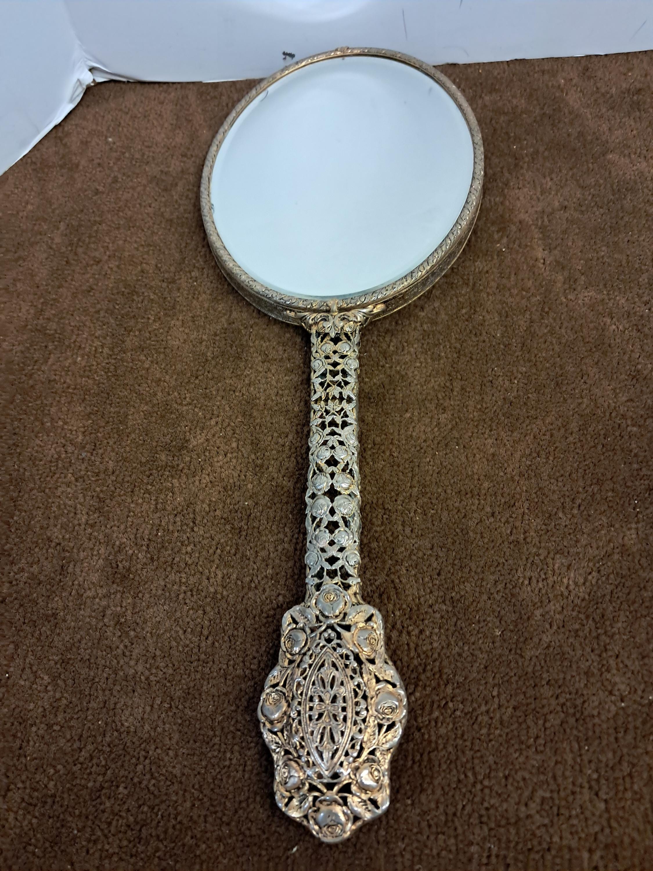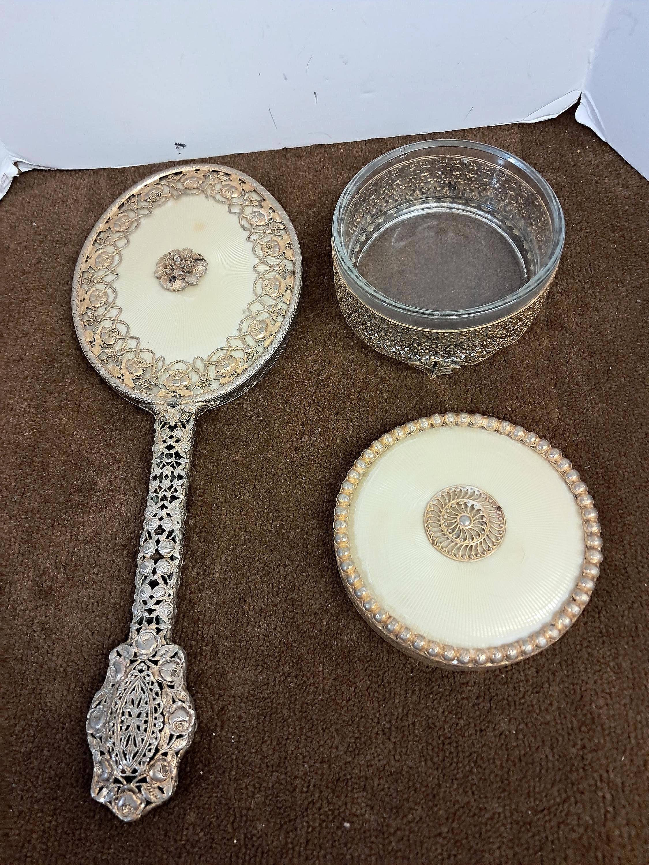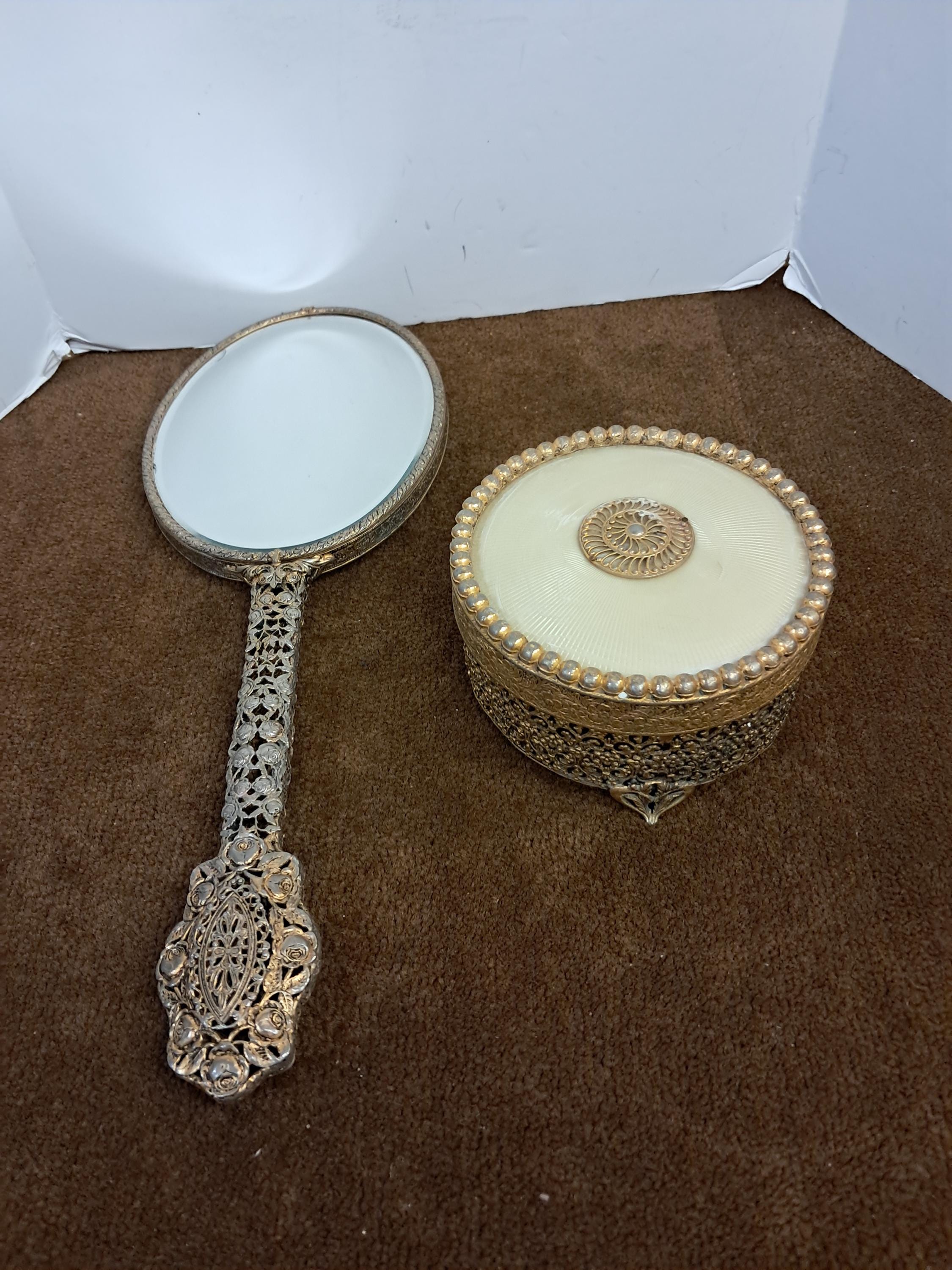 Filigree Mirror Hand Held with matching Powder Case Antique circa 1920's/Wedding Prop/Gift for her/Dressing Table Accessory