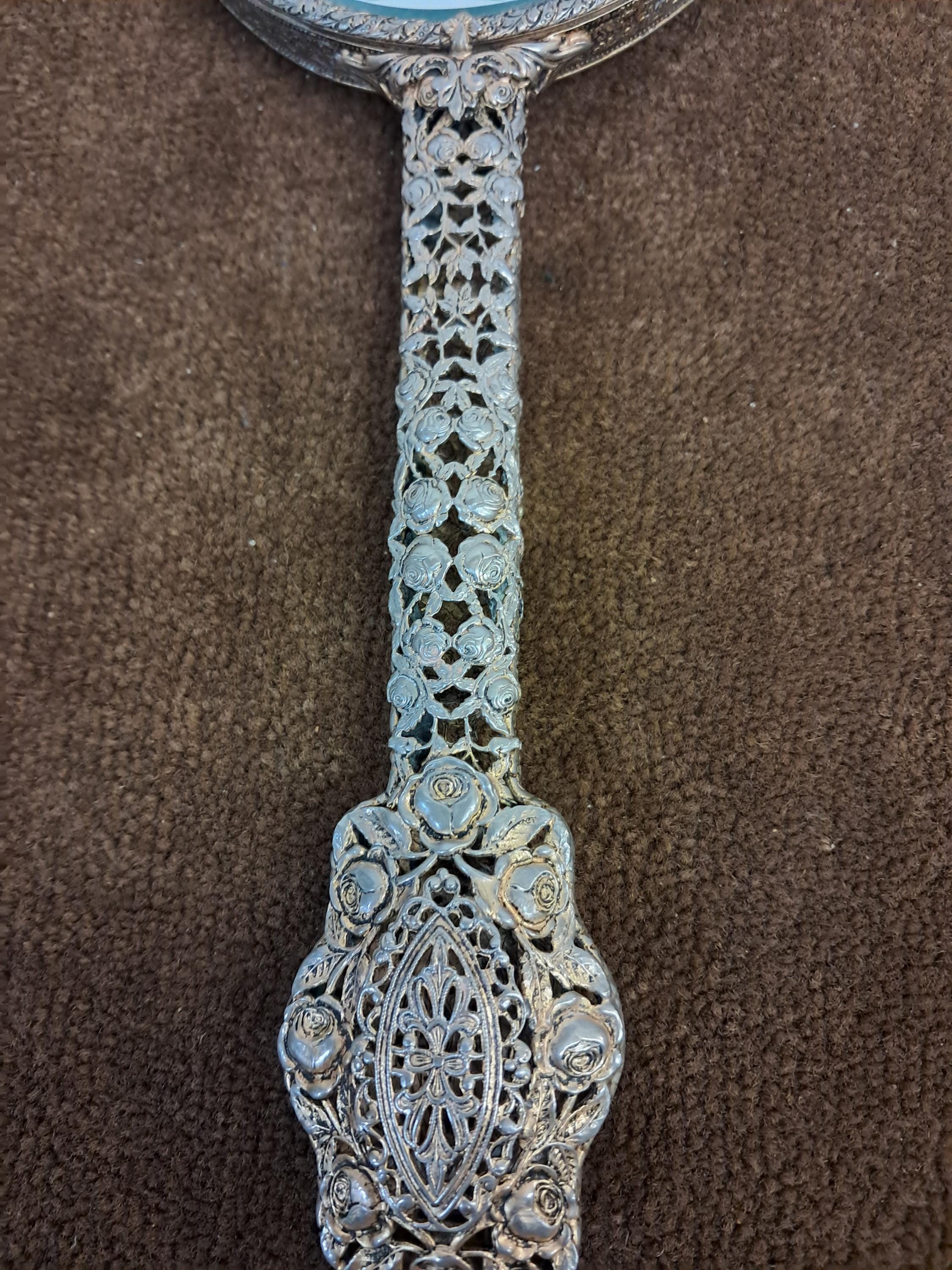 Beautiful antique round hand held Mirror with Filigree brass handle.
