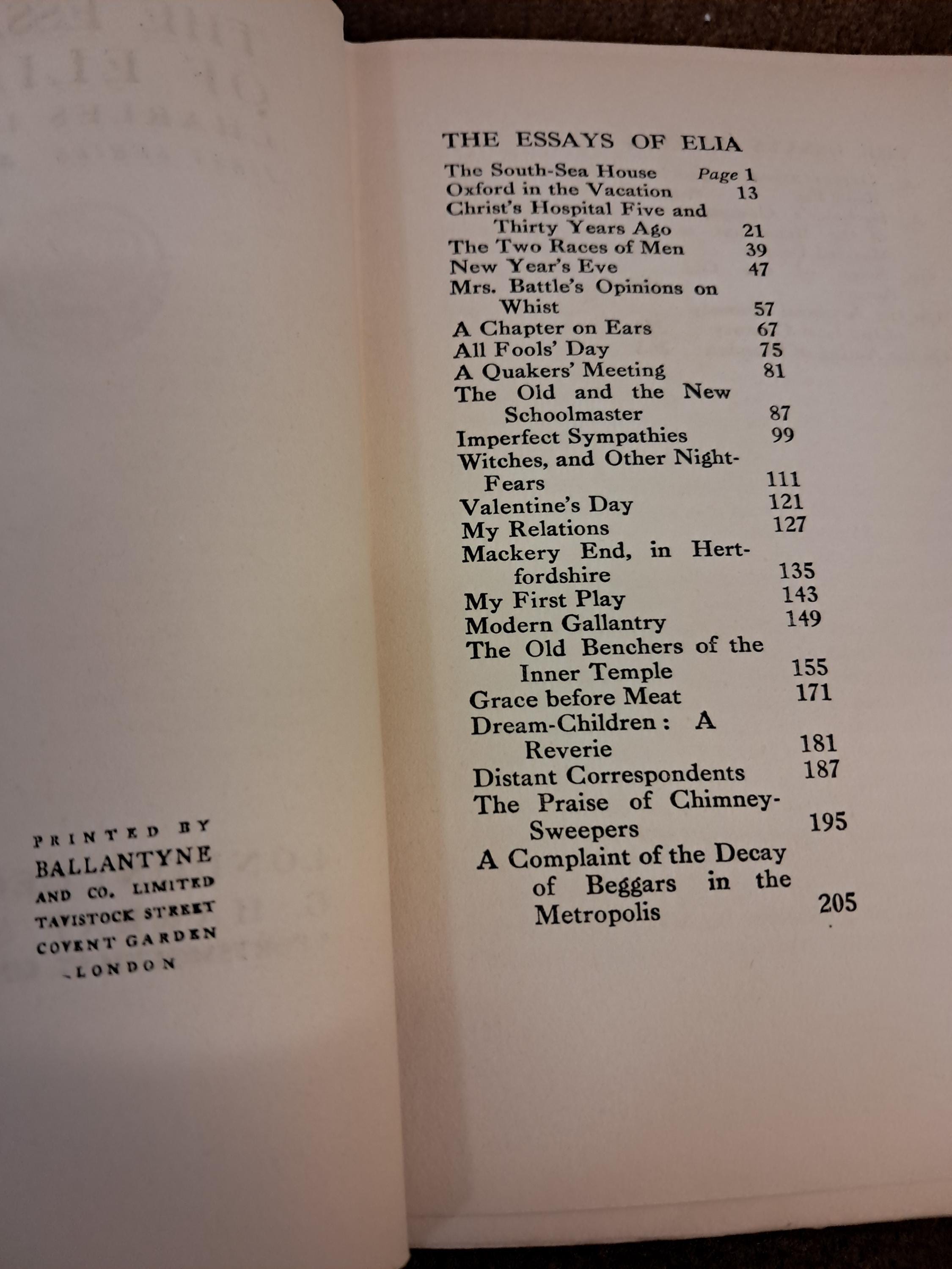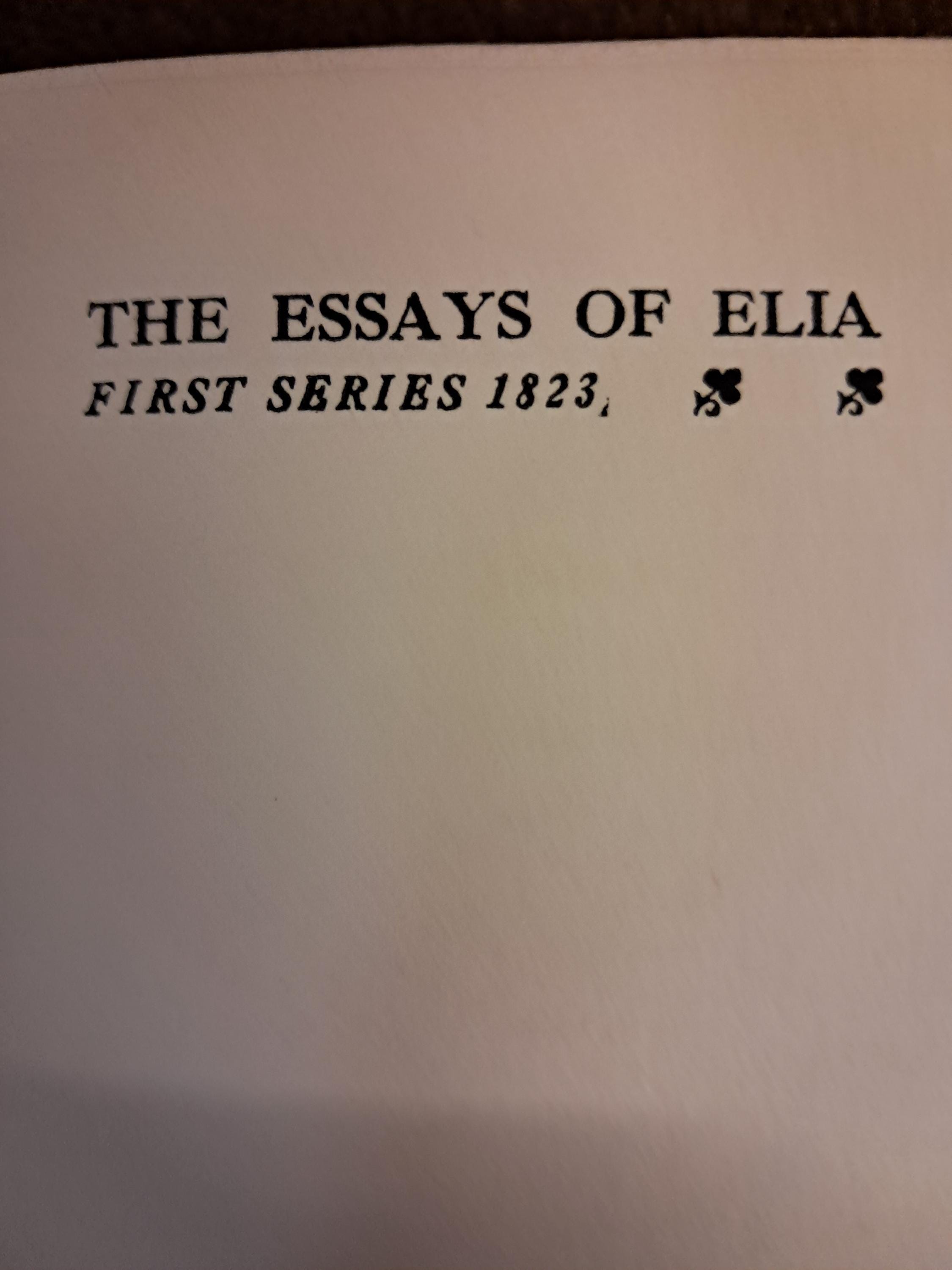 The first series of "Essays of Elia" was published in 1823, with the second volume, "Last Essays of Elia," issued in 1833. The essays were first published in The London Magazine in 1820 and continued to 1825. Charles Lamb's essays have been very popular and have been printed in many subsequent editions throughout the nineteenth century. The personal and conversational tone of the essays has charmed many readers, establishing Lamb as one of the most delightful of English essayists.