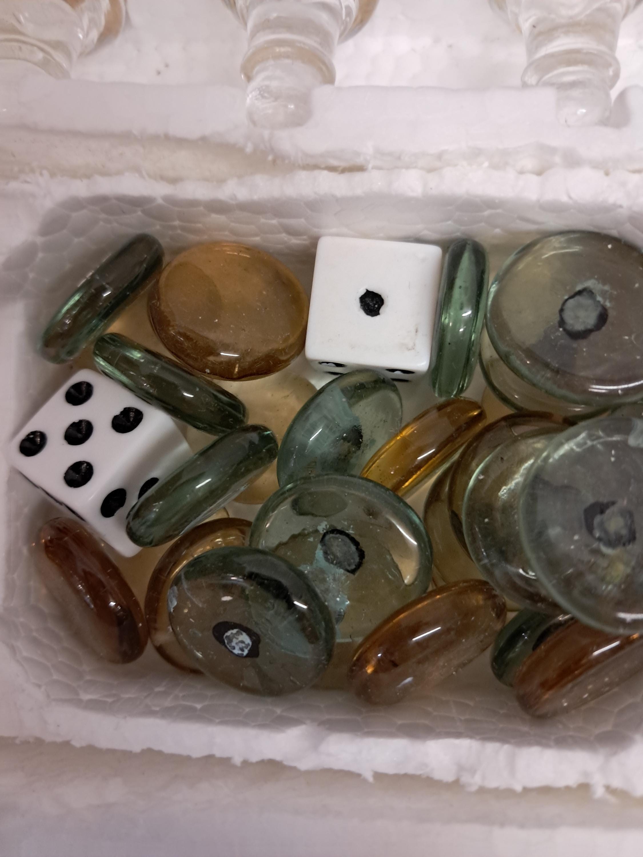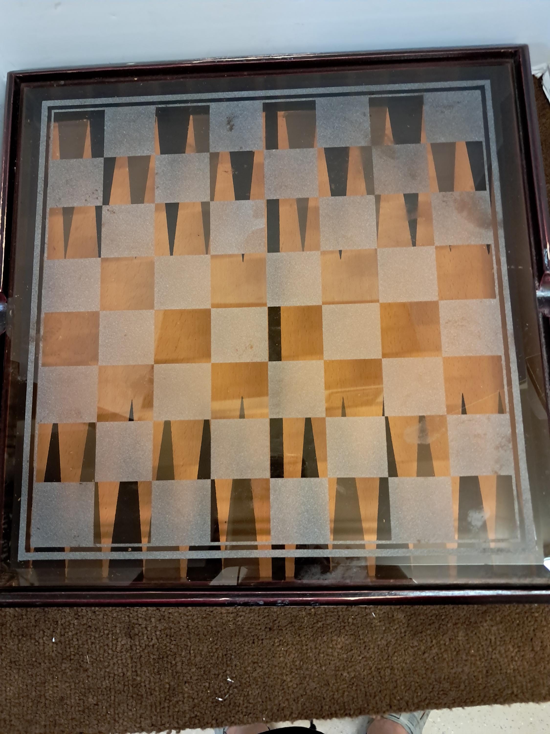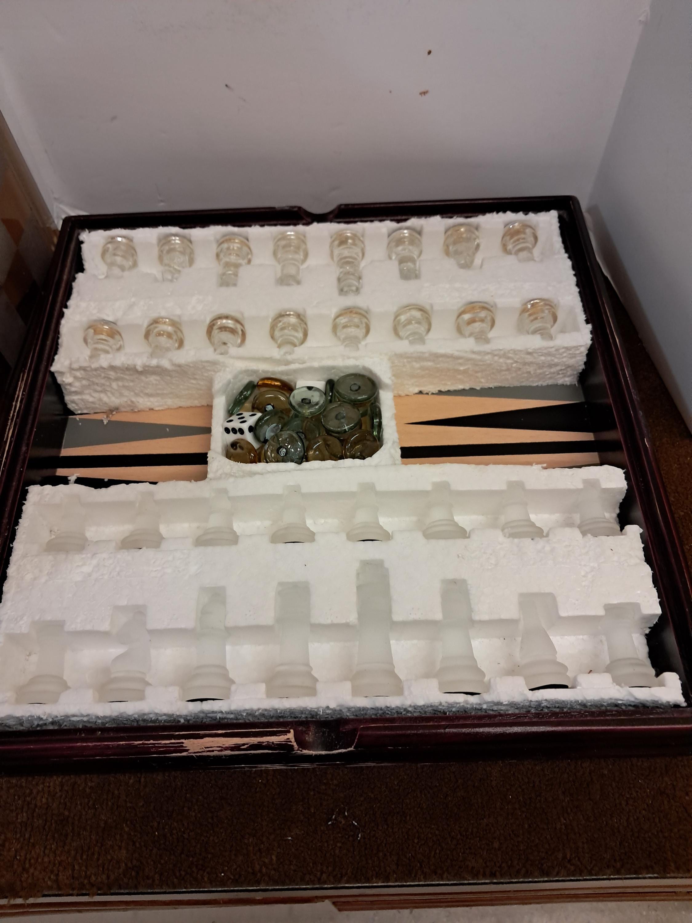 Glass Chess and Backgammon SetClear Glass VS Milky color GlassIn wooden Case measures 12 x 12 x 2 in.Good vintage condition Hadly Used Still in original containers
