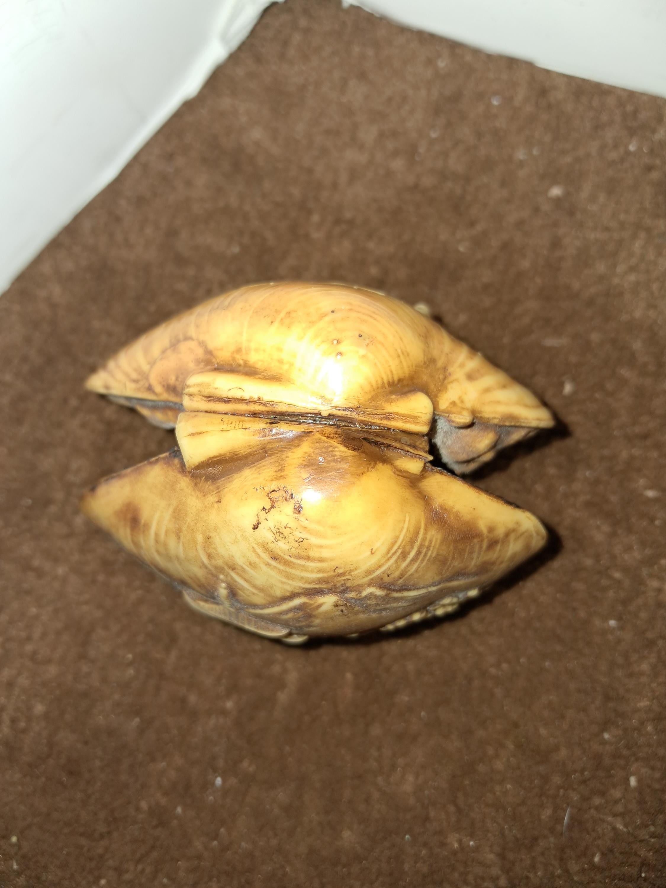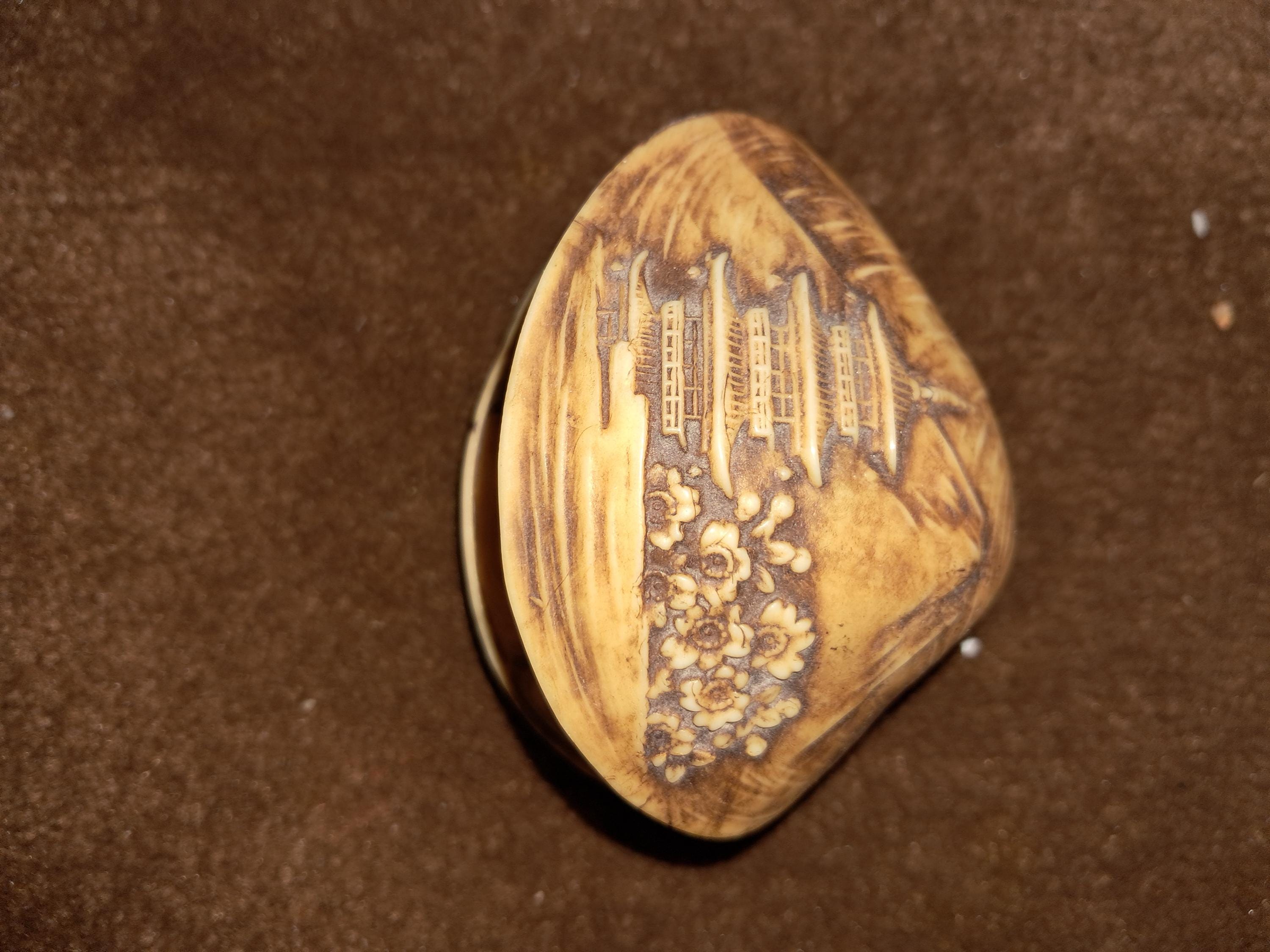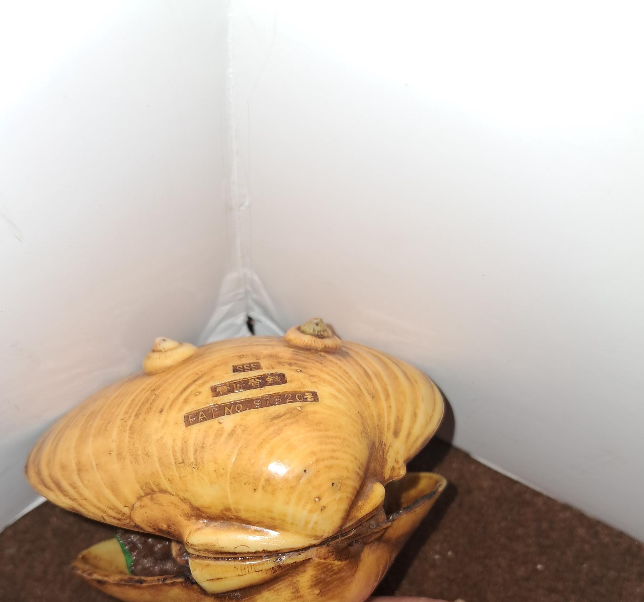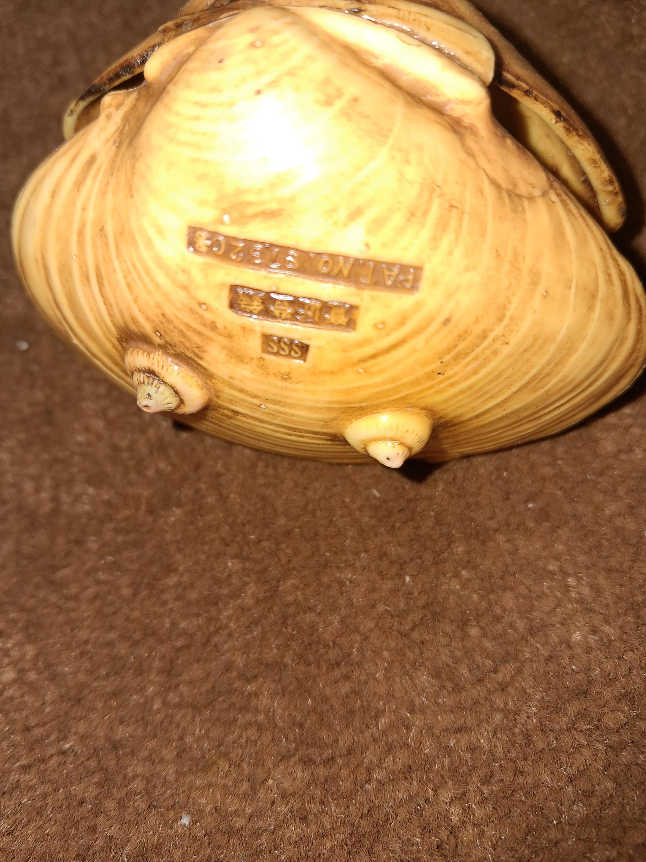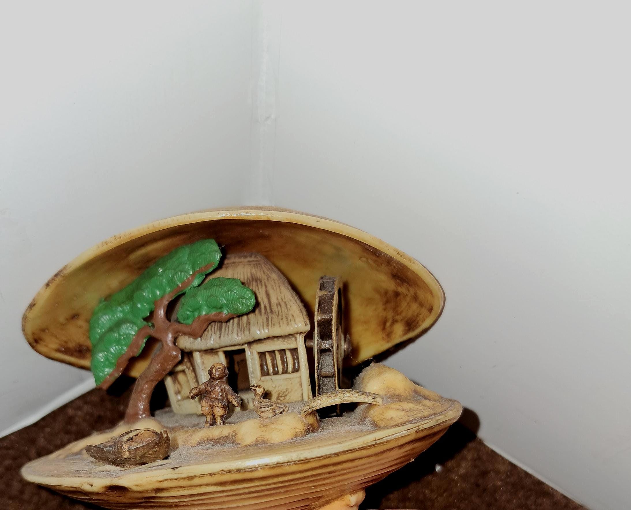 Features Miniature scene within Carved celluloid Clam shell, Depicting Traditional rural or Asian inspired setting. Celluloid is kind of plastic often used in early to mid 20th century