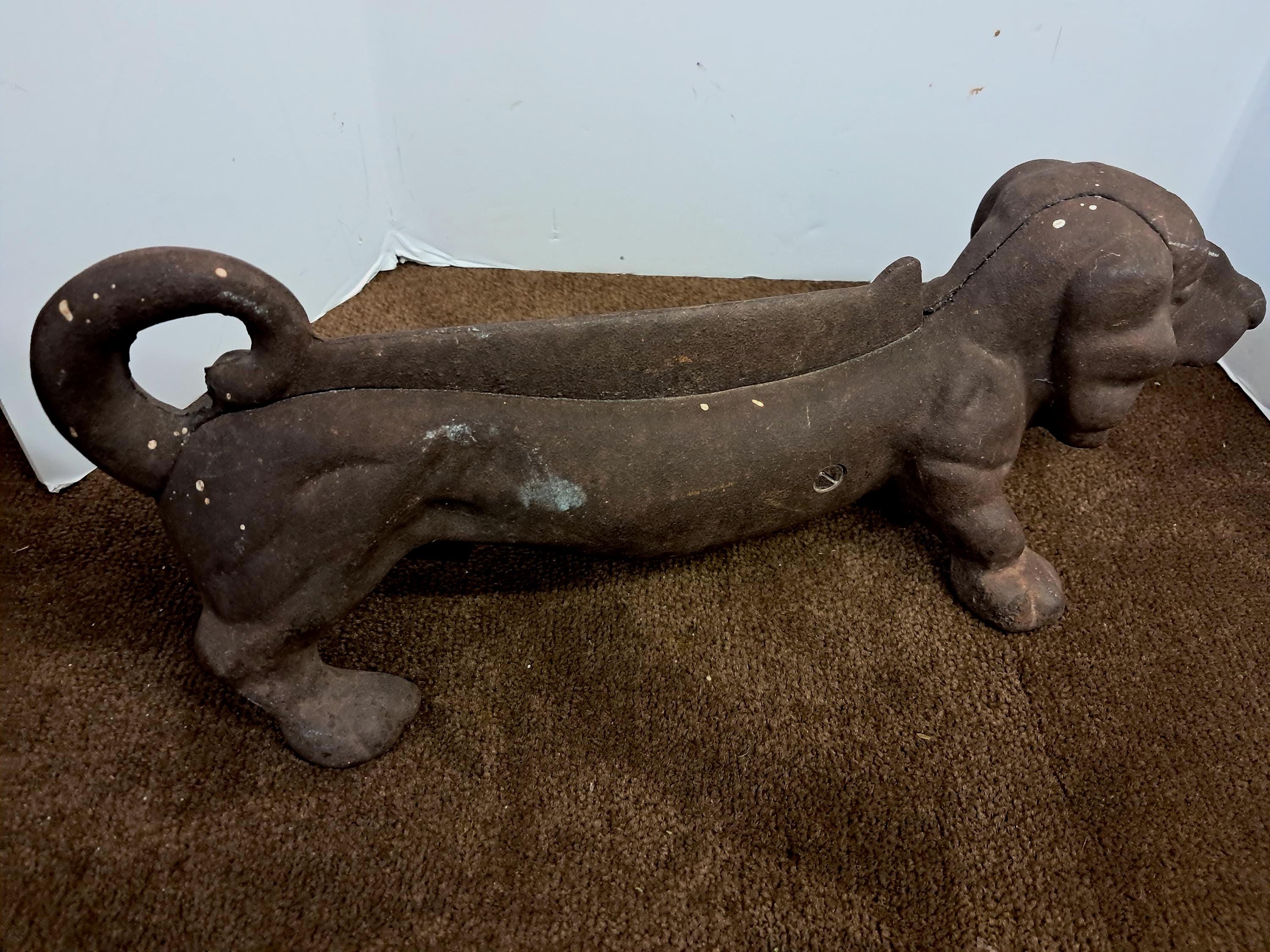 This vintage cast iron dachshund dog boot scraper/door stop is a charming addition to any home decor. Made in the United States, this heavy cast iron piece is durable and long-lasting. Measuring at 15 inches in length and weighing 9 pounds, it is perfect for scraping off dirt and debris from your floors or doors. Crafted with high-quality materials, this door stop is a great collectible item for those interested in metalware and cast iron. Its design features a cute dachshund dog boot scraper that is both functional and decorative. Whether you choose to use it as a door stop or as a decorative piece, this vintage cast iron dachshund dog boot scraper is sure to add character and charm to your home