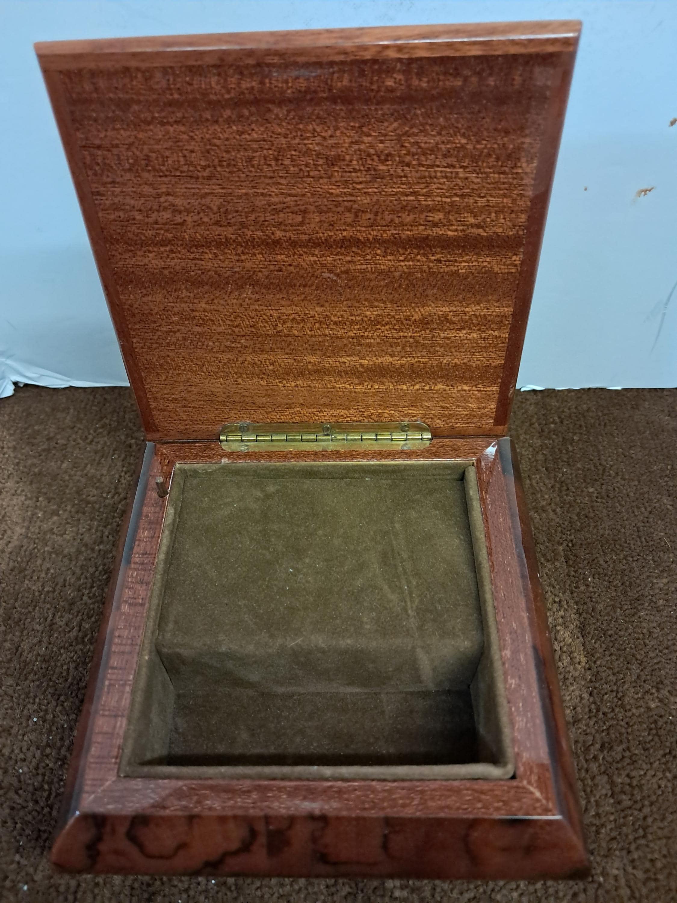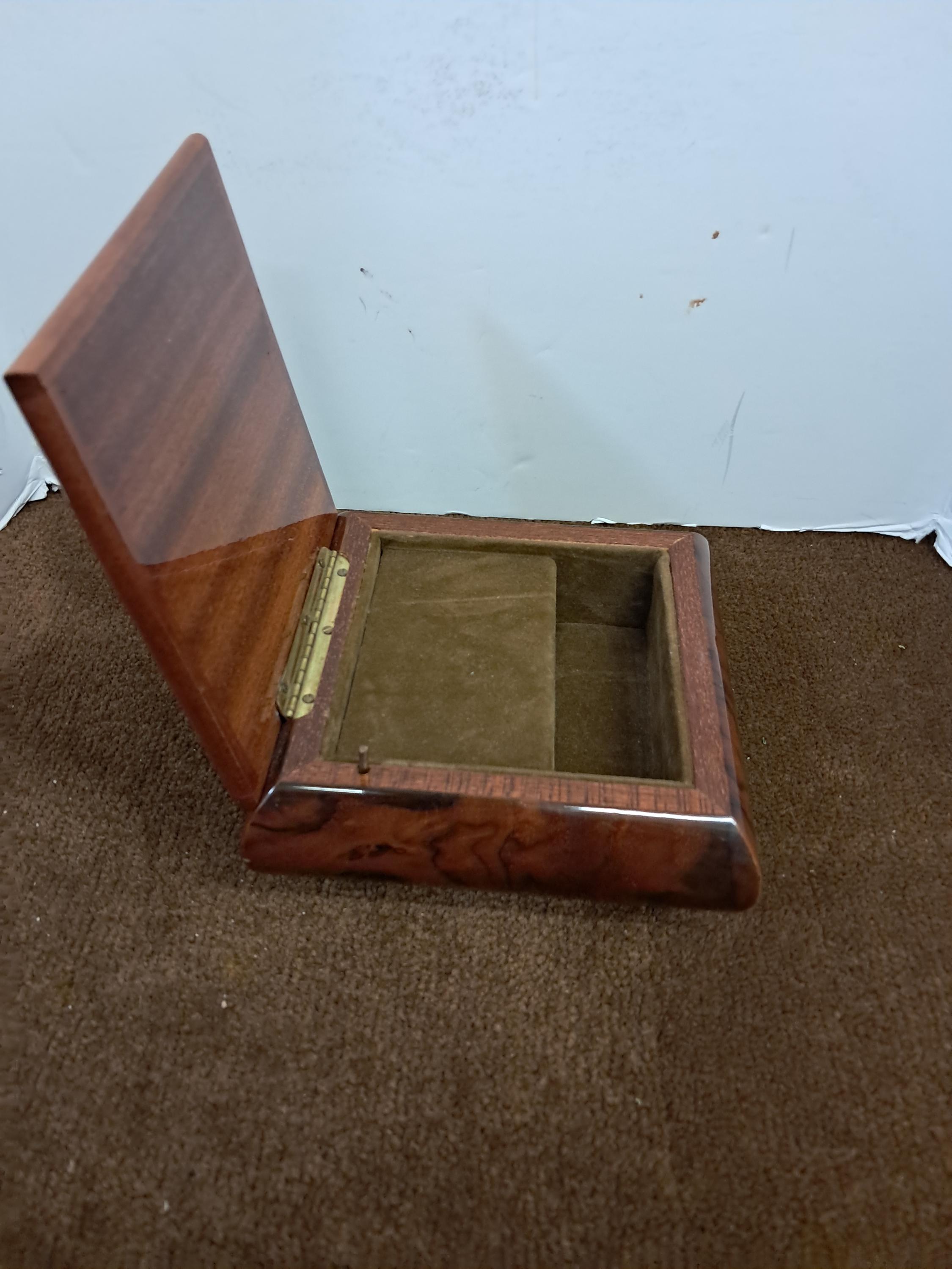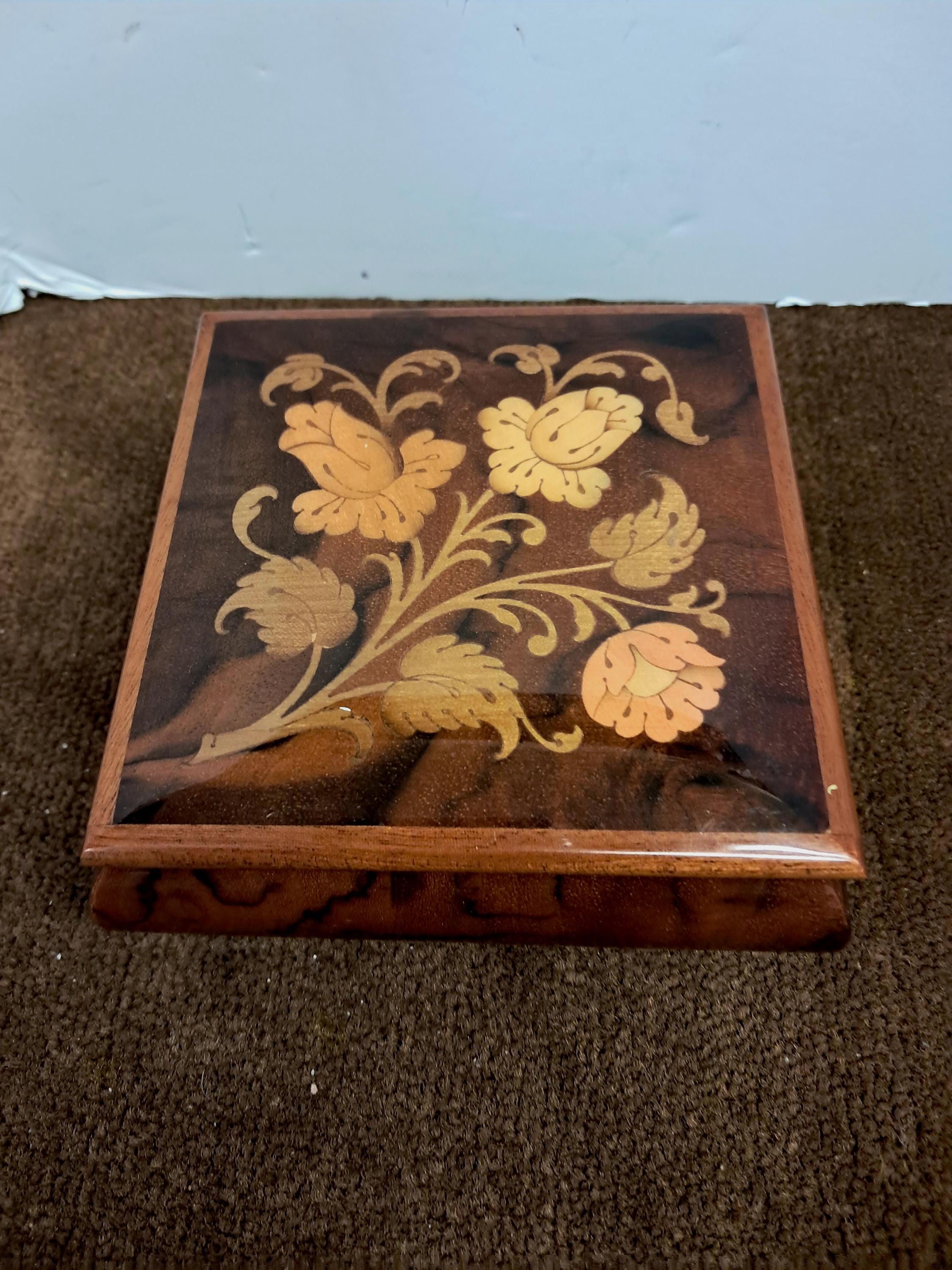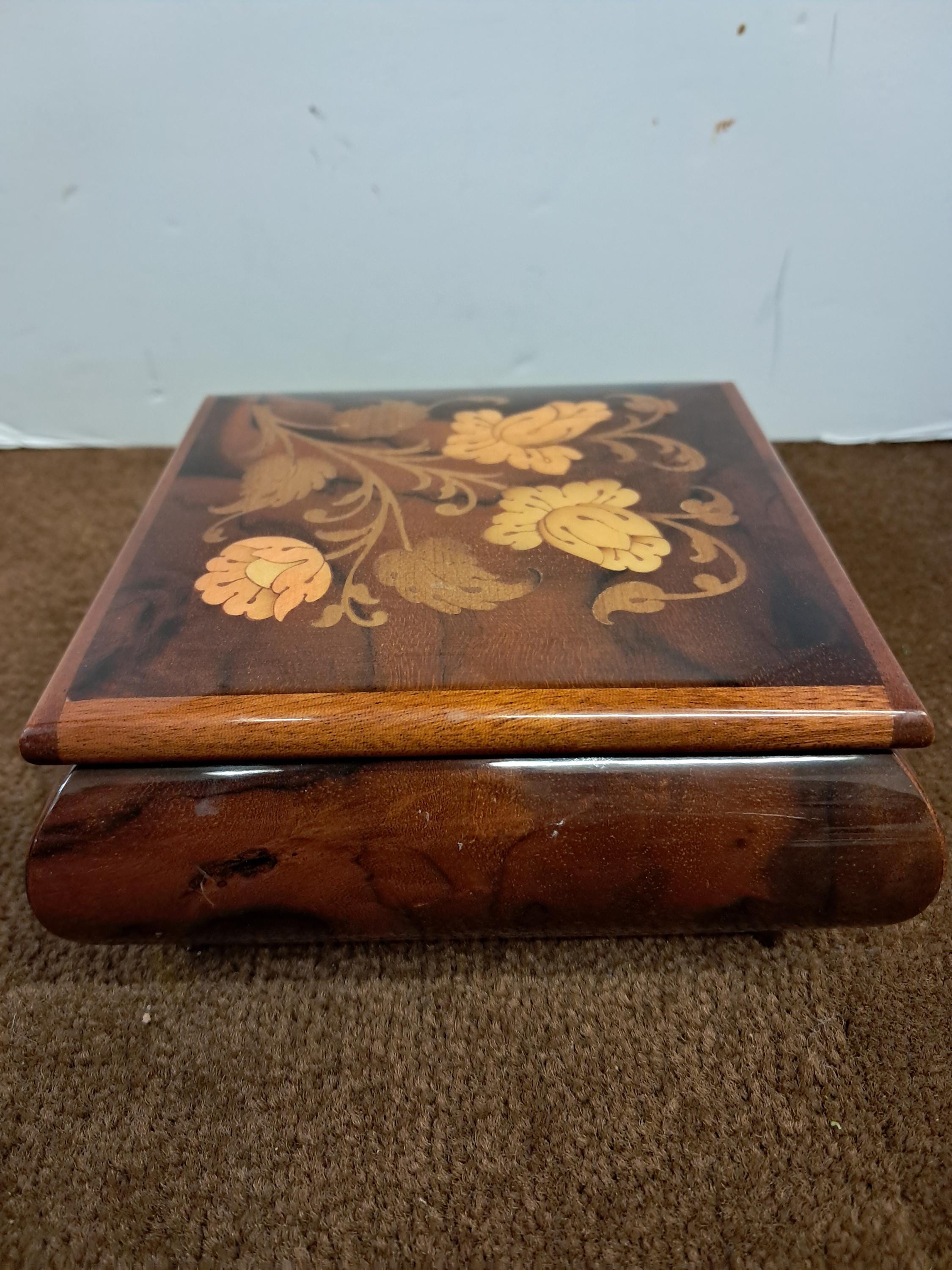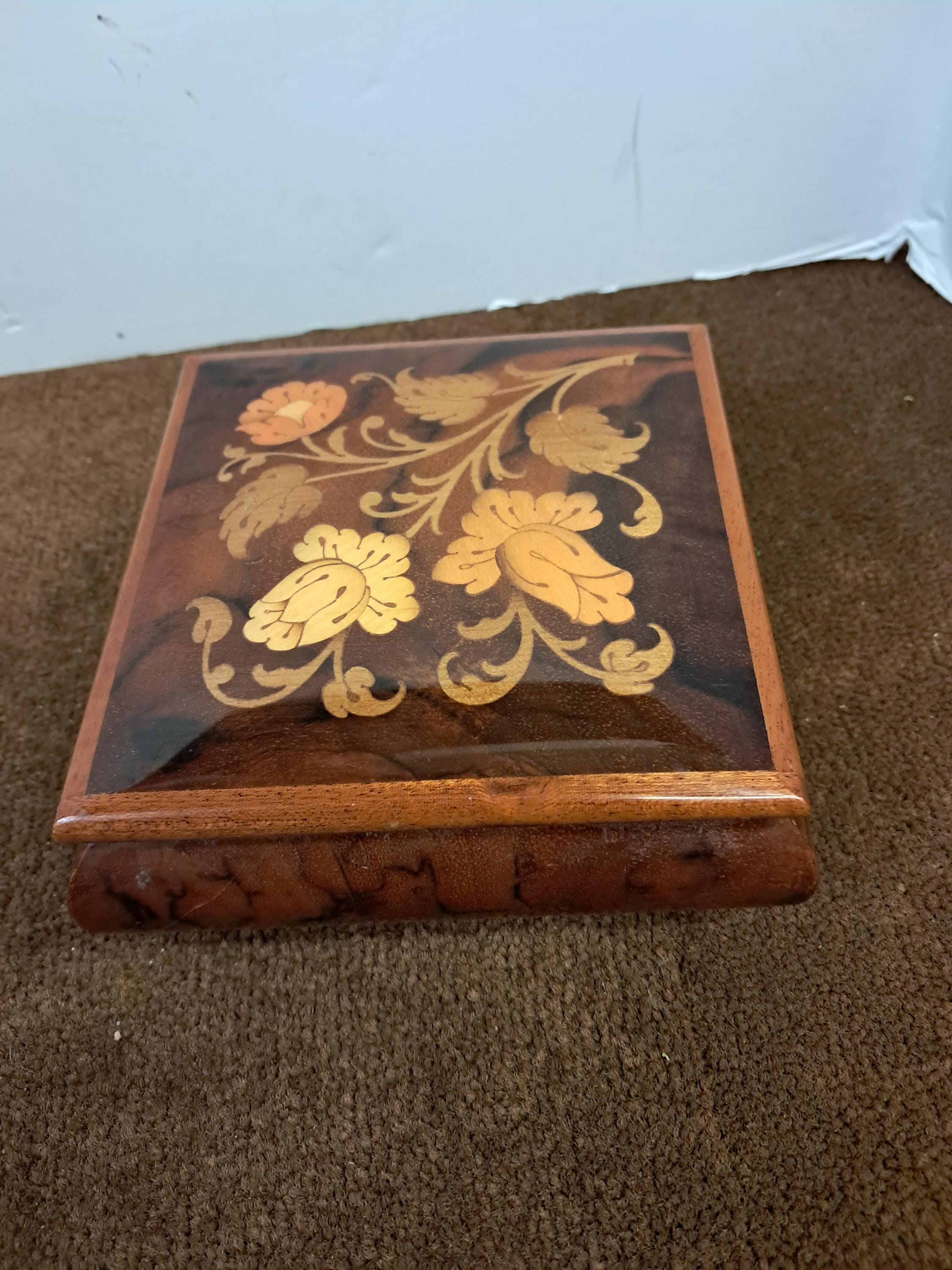 This is a beautifully crafted Italian vintage music box in burlwood and floral marquetry inlay. It rests on four feet, has a piano hinge type opening, and plays Torna A Sorriento when it is wound up and the lid is in the open position.