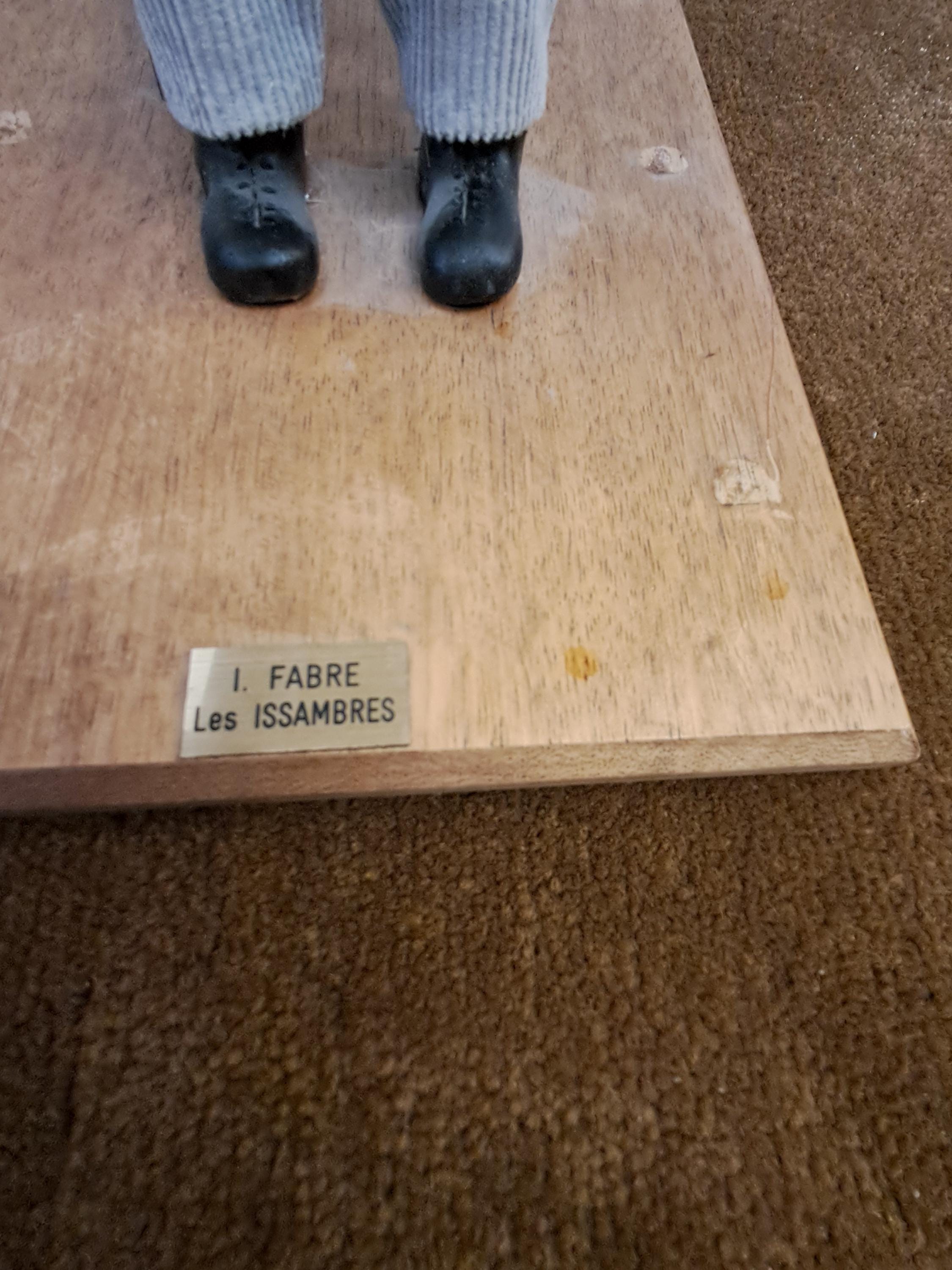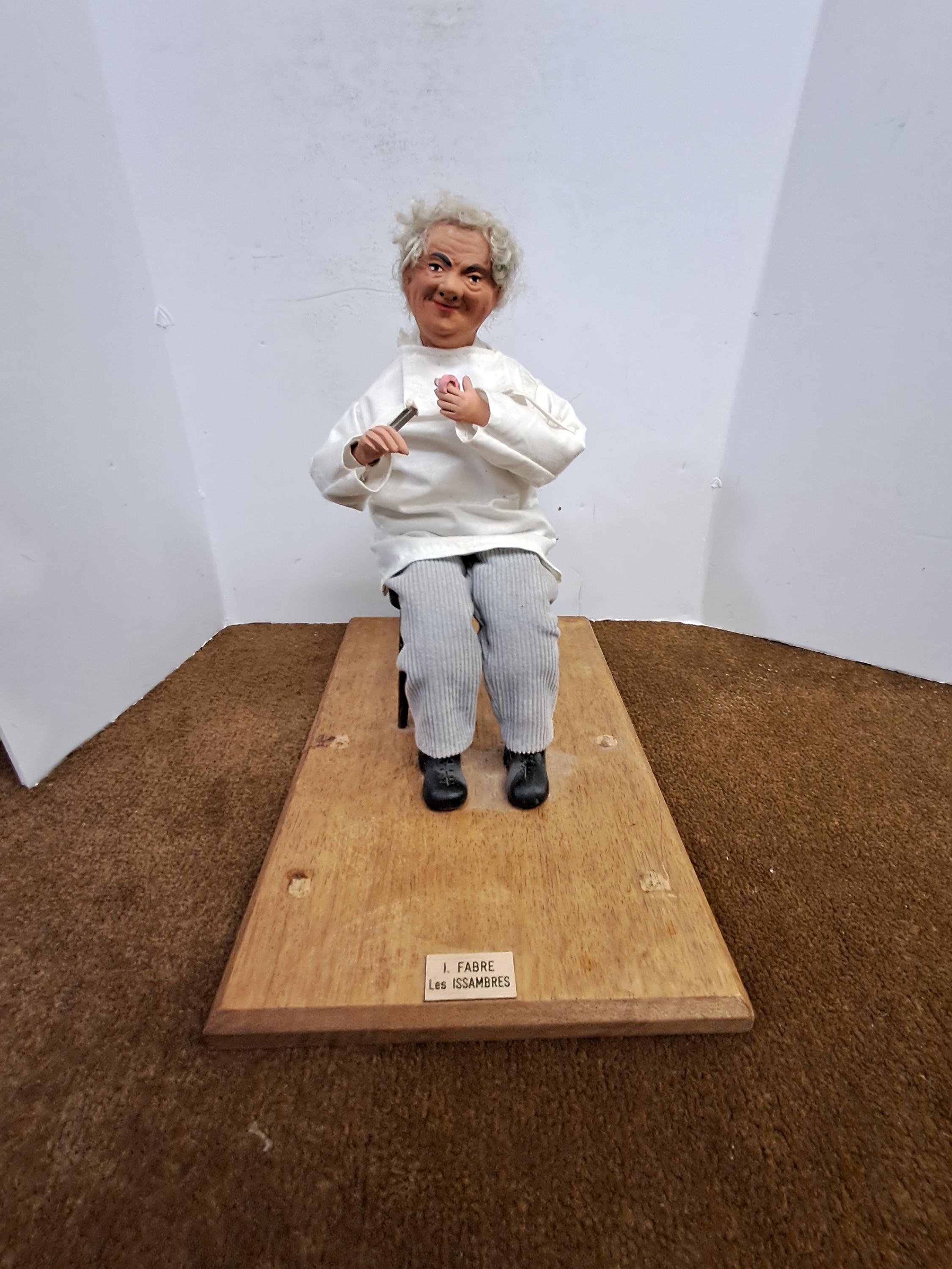 This exquisite VTG Art Isabelle Fabre 83380 Les Issambres French Clay Doll is an incredible masterpiece that will leave you in awe. The doll is beautifully handcrafted and hand-painted with intricate details to create a unique and exquisite piece of art. The Dentist is beautifully handcrafted and hand-painted with intricate details to create a unique and exquisite piece of art. It is made of high-quality clay material that gives it an antique finish, and it is a perfect addition to your sculpture and figurine collection. The doll is labeled by Isabelle Fabre, a renowned artist in France, and its design is inspired by the people and culture of Provence. The Dentist has a white shirt ,Gray Pants and Black shoes sitting on a chair, which adds to its unique and attractive appearance. This one-of-a-kind clay doll is perfect for all occasions and will make a great gift to your loved ones.