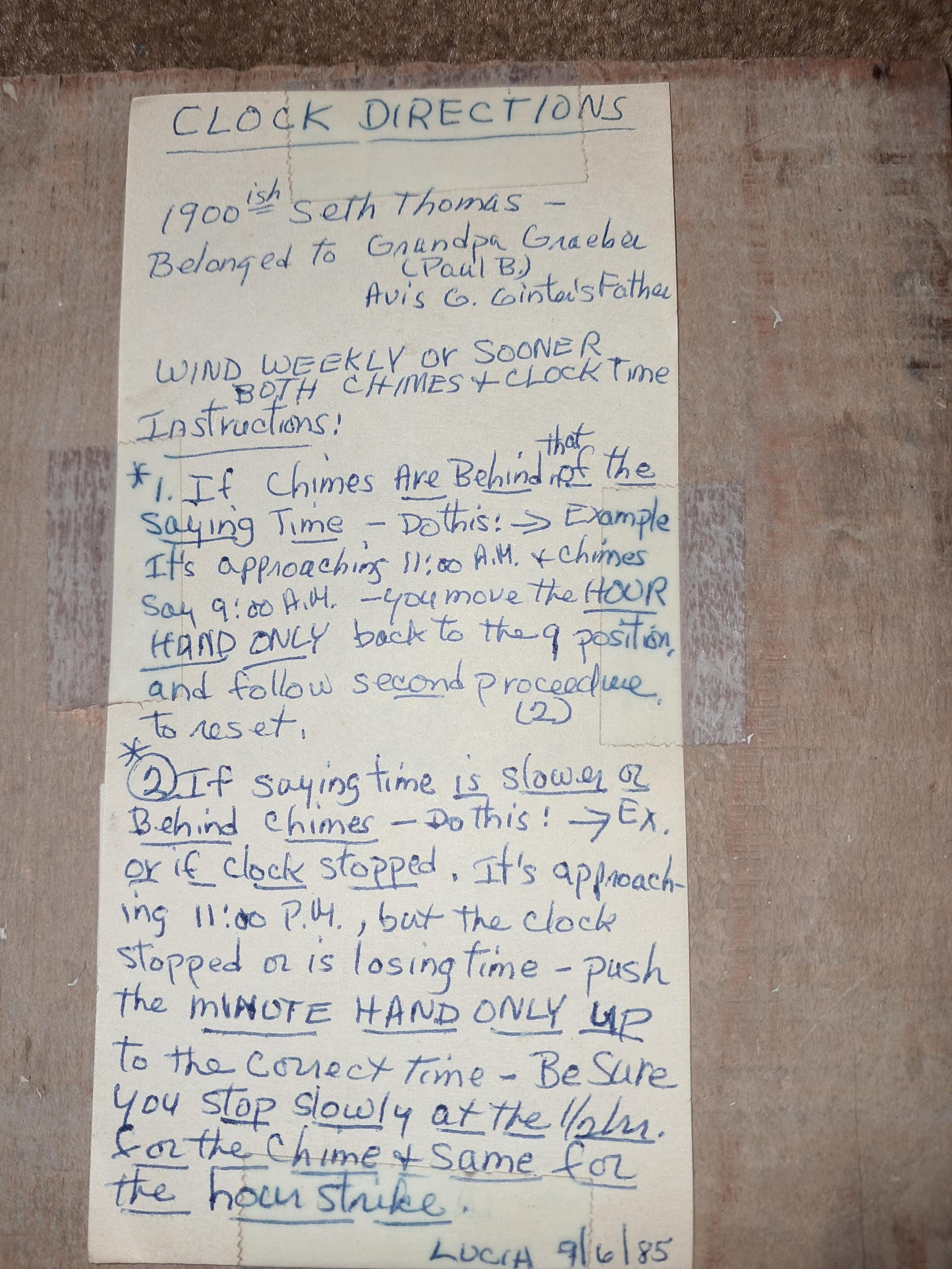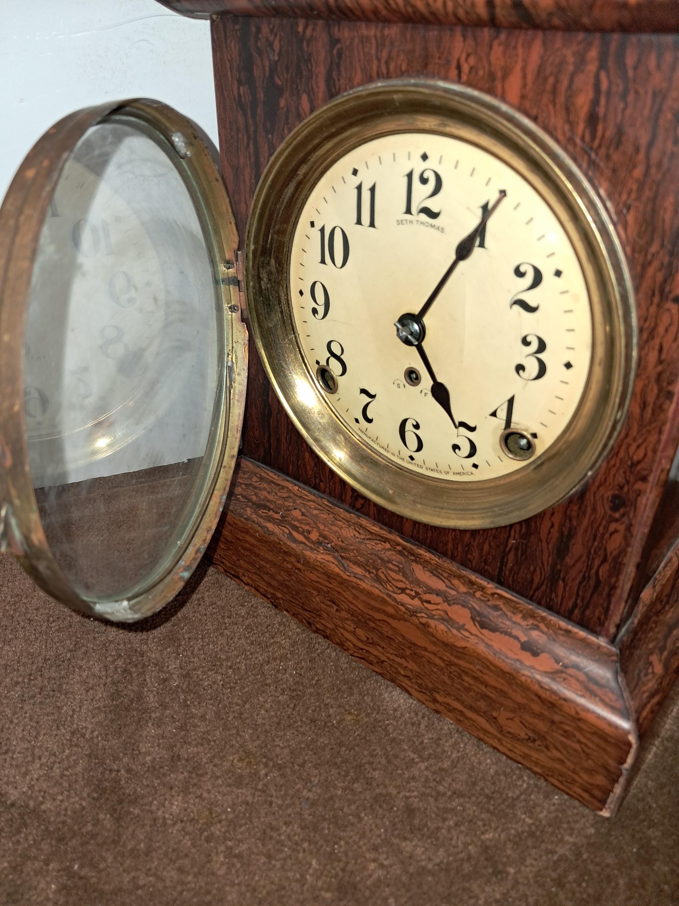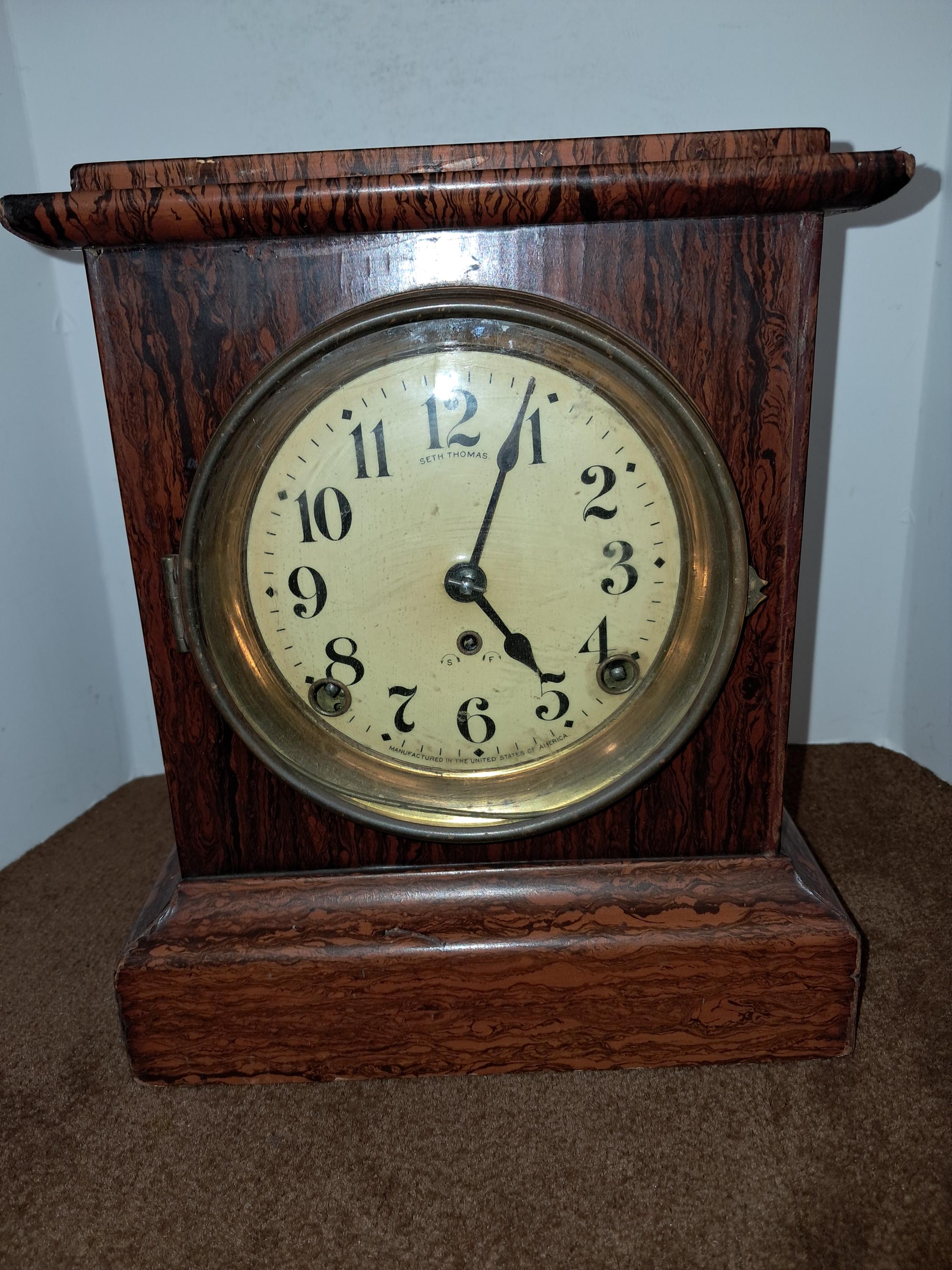Antique Seth Thomas Dana #1 Adamantine Mantel Clock. Sonoran chime. Circa 1913. Case is excellent. Original label.1 key included. Clock and chimes are working, but not sure about accuracy. Measures approximately 8-1/4” wide X 10” tall X 5-1/2” deep.
