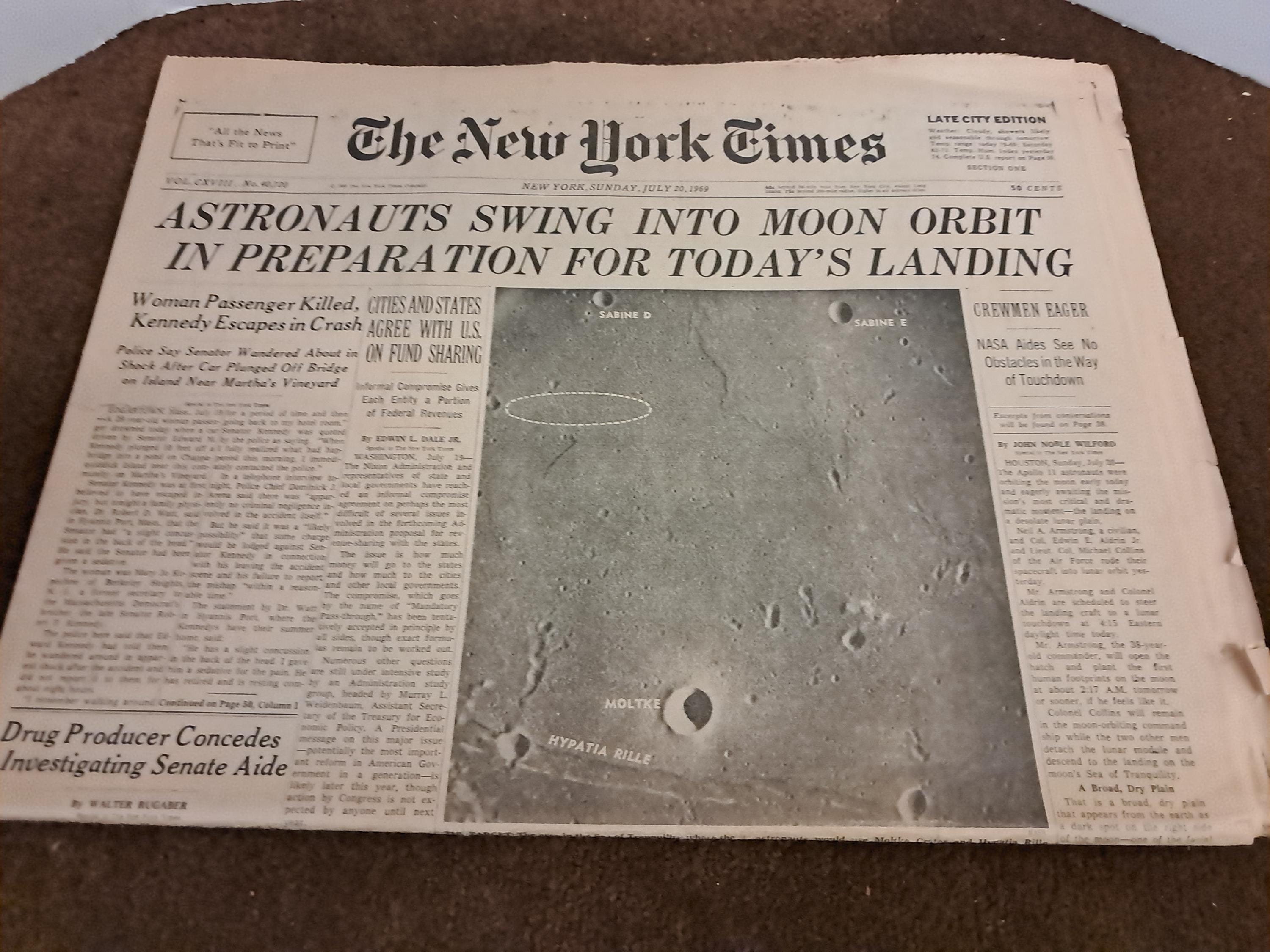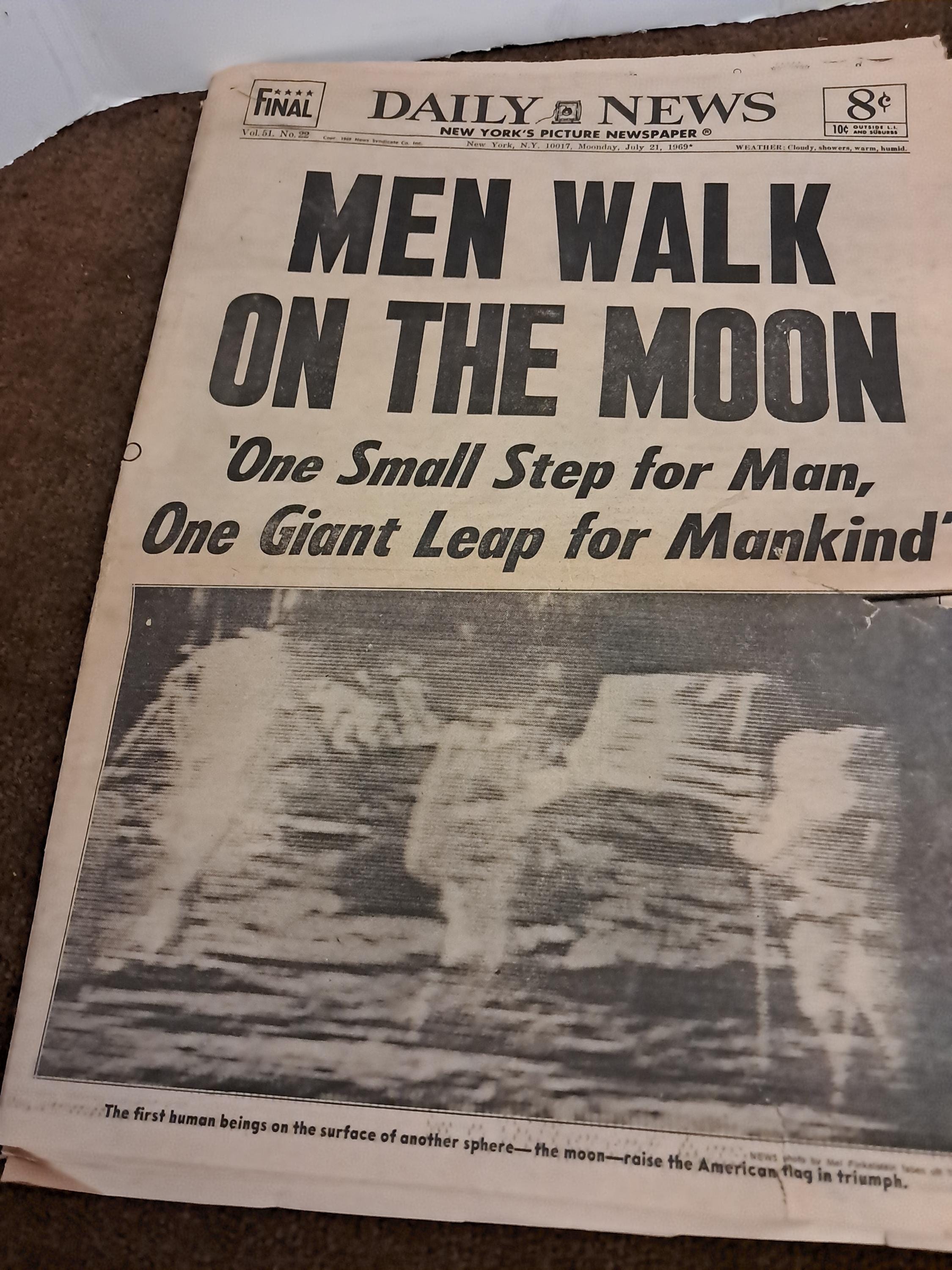Historical newspaper from “Monday” July 21, 1969. “Men Walk On The Moon – one small step for man, one giant leap for mankind.” This issue was published in the day when Apollo 11 made it to the moon carrying Neil Armstrong and Buzz Aldrin and Armstrong became the first human to ever set foot on the moon.