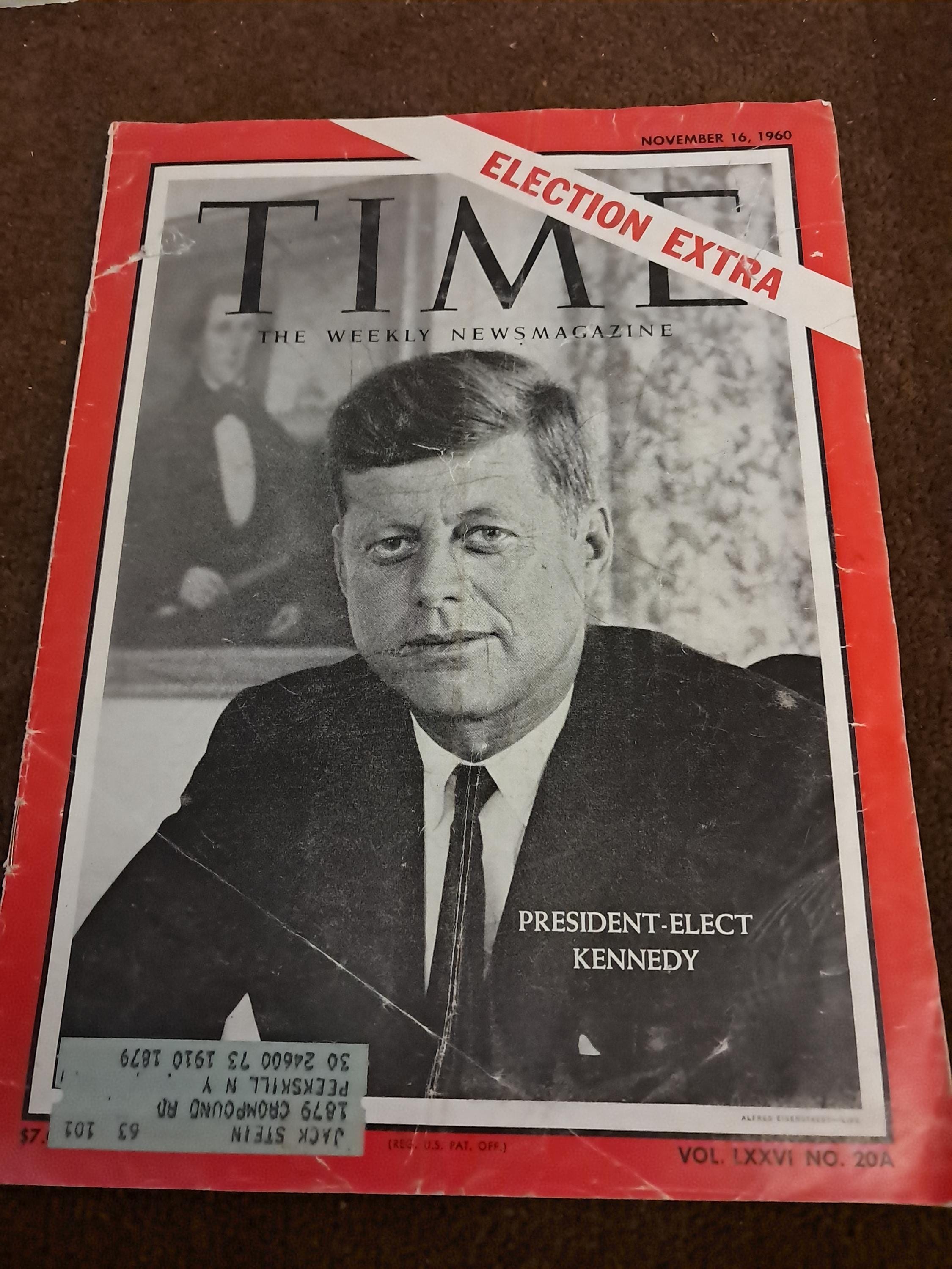 The product is a Time Magazine Election Extra issue from November 16, 1960, featuring President-Elect John F. Kennedy on the cover. It is a historical memorabilia collectible related to US politics, specifically focusing on the 1960 presidential election. Although the issue is in fair condition, it would make a great historical display piece on your coffee table, and is actually in good enough condition, in my opinion, to frame. Age has brought wear to the issue, which makes it all that much more a piece of history!