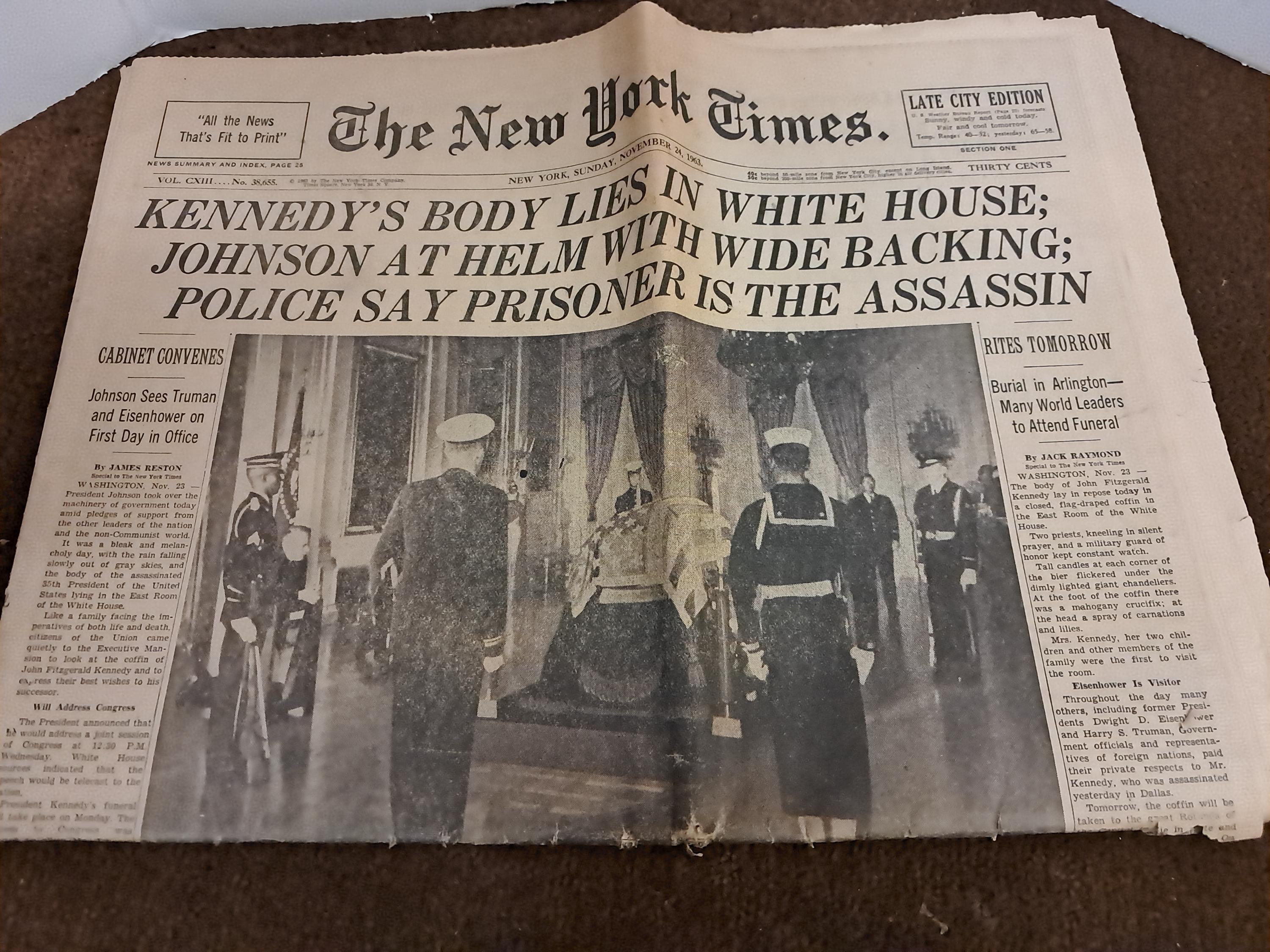 25 November 1963 edition of ''New York Daily News'' screams ''The Fatal Shot'' referring to the shooting of JFK assassin Lee Harvey Oswald by night club owner Jack Ruby. Two photos of Oswald being shot dominate the front page. Back page features an image of the Kennedy family mourning as the coffin passes by. Paper runs 48pp. Some toning, a small tear to back page and light marks to spine. Very good condition.