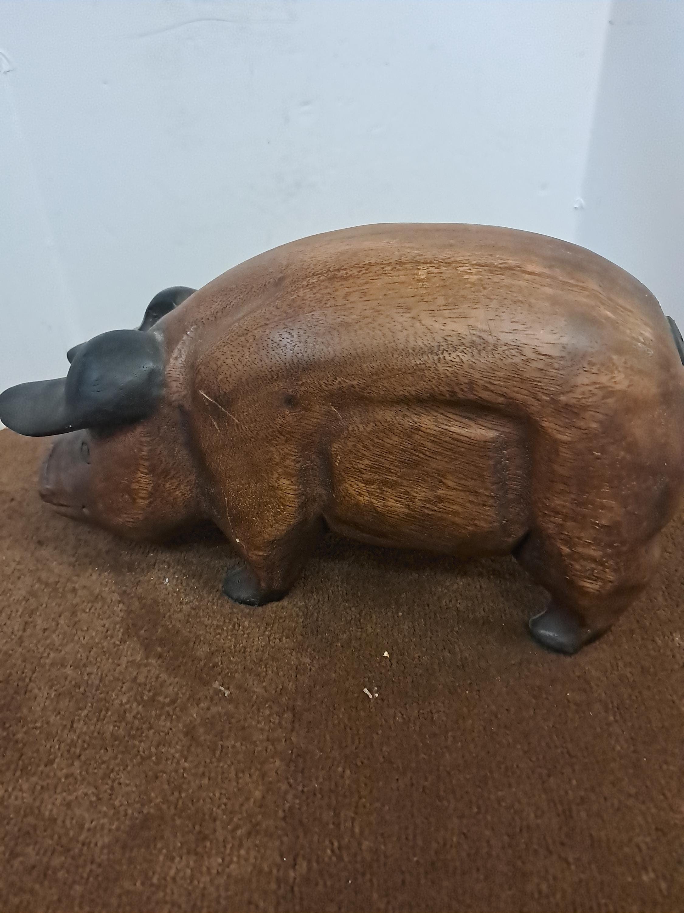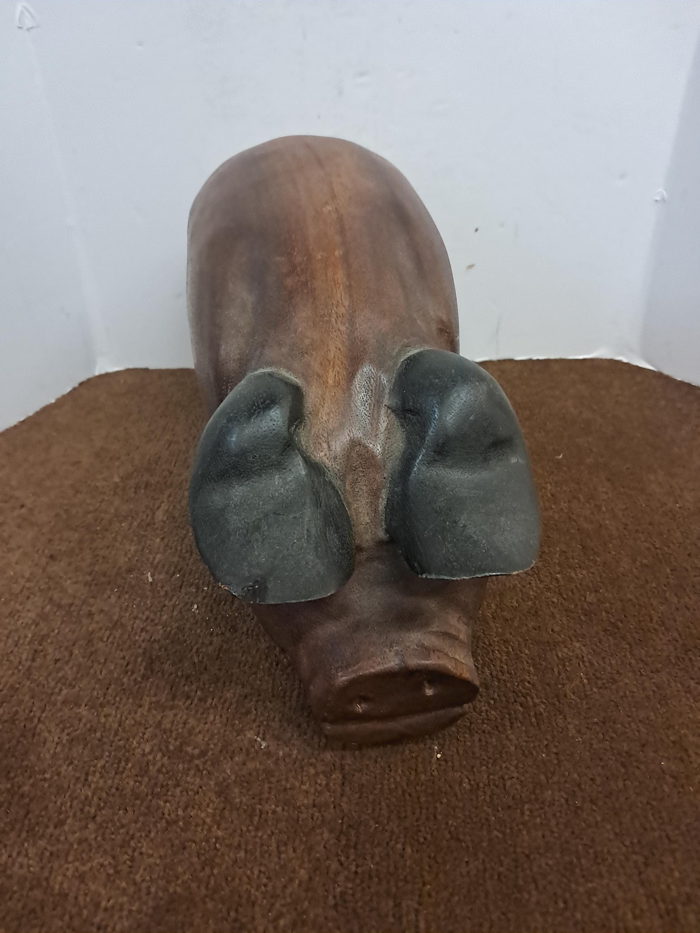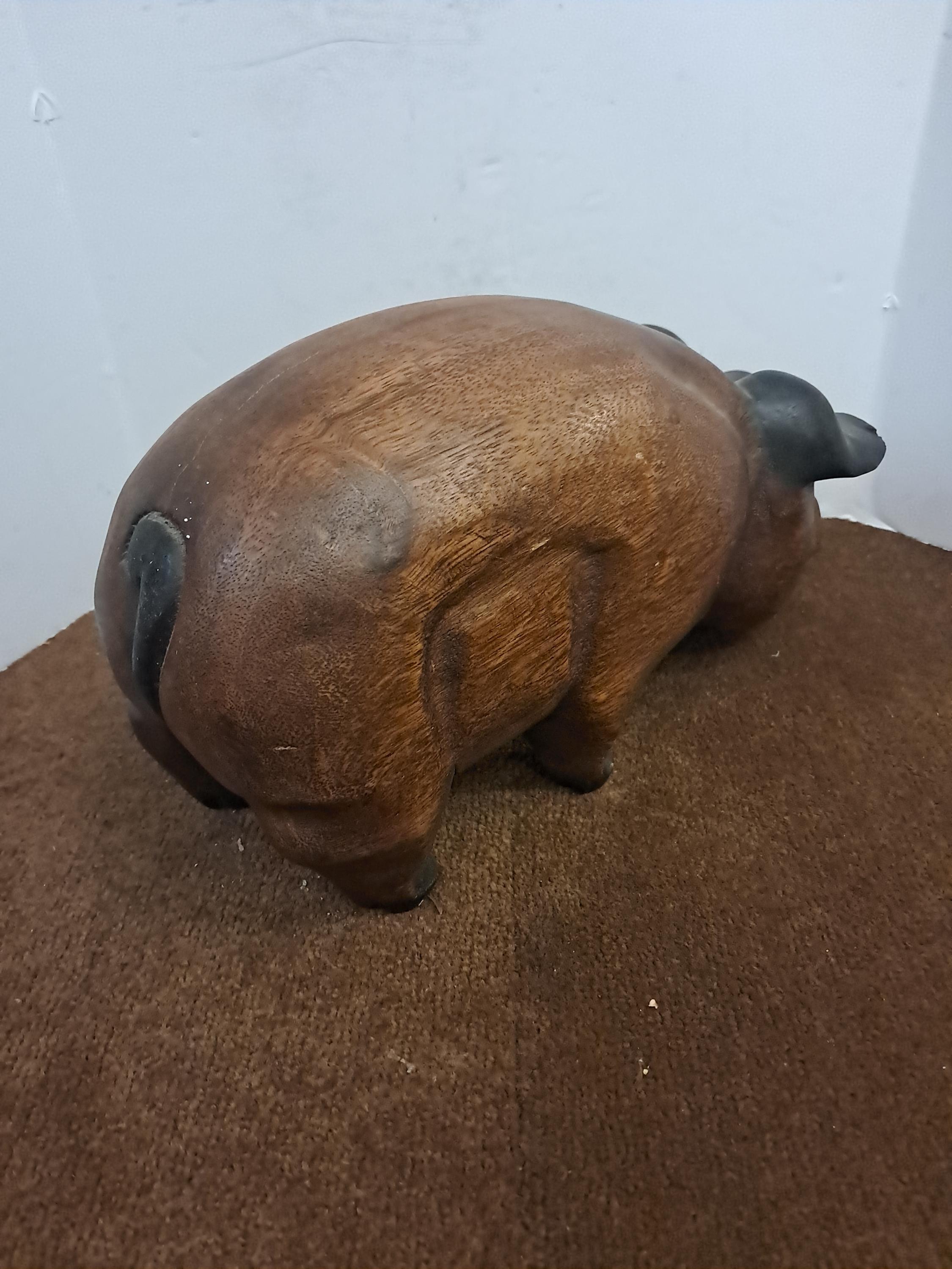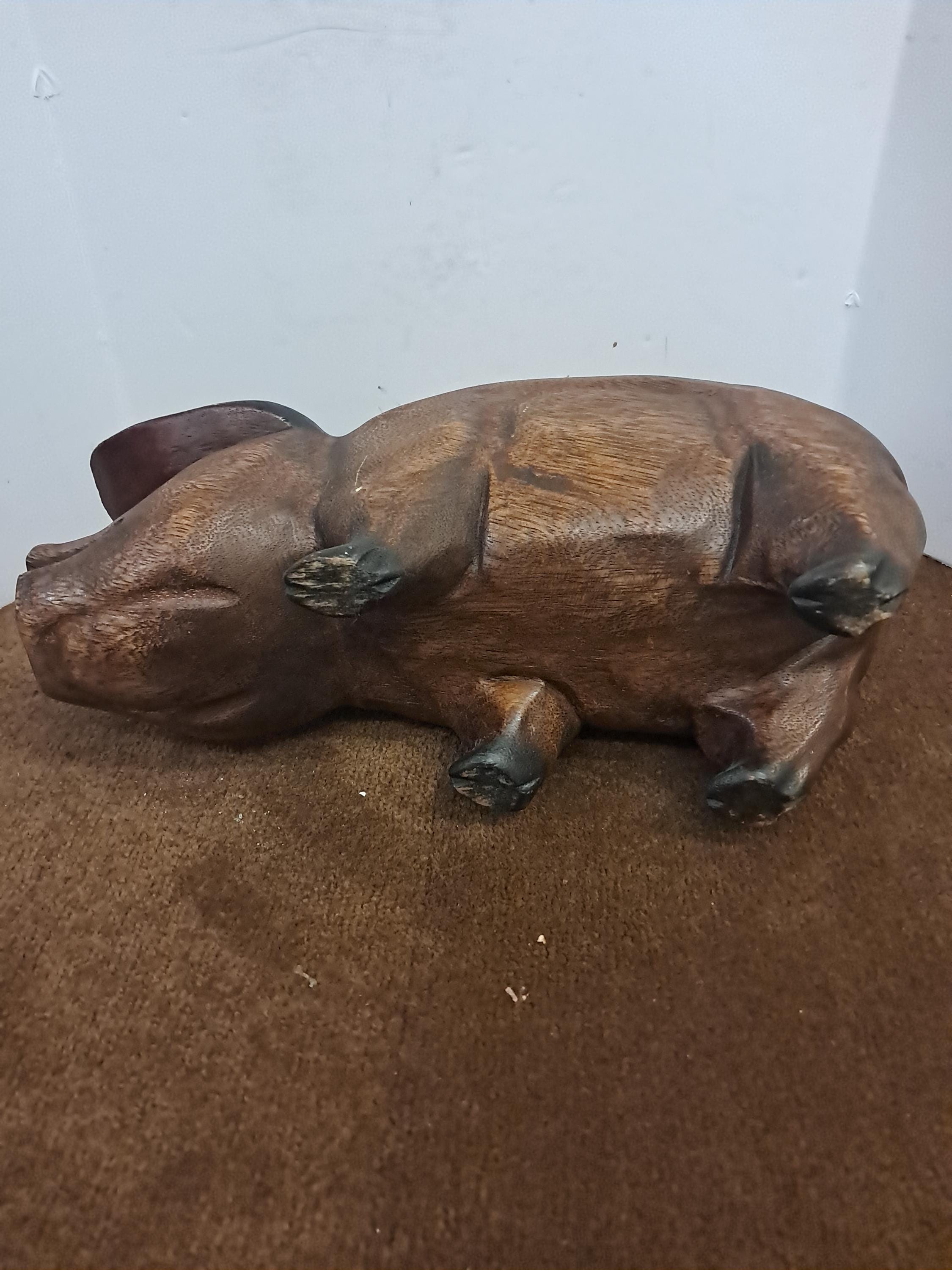 Hand Carved Wooden Pig SculptureHand Carved Wooden Pig Figure Rustic Country Decor12" wide x 5" deep x 7" tallCute rustic country hand carved wooden pig, unmarked. In good vintage conditionWeighs 3.5 lbs pre-packaging.