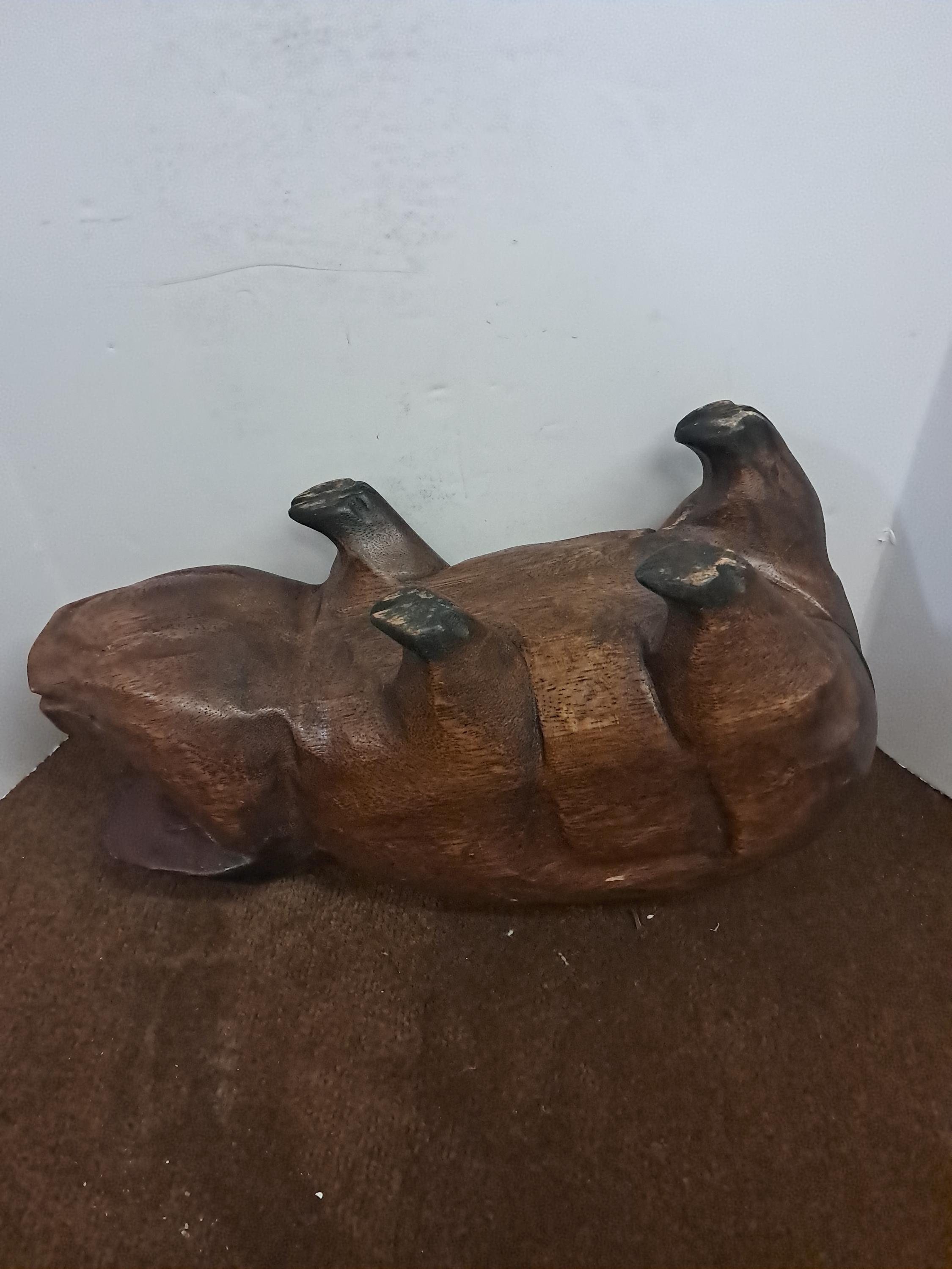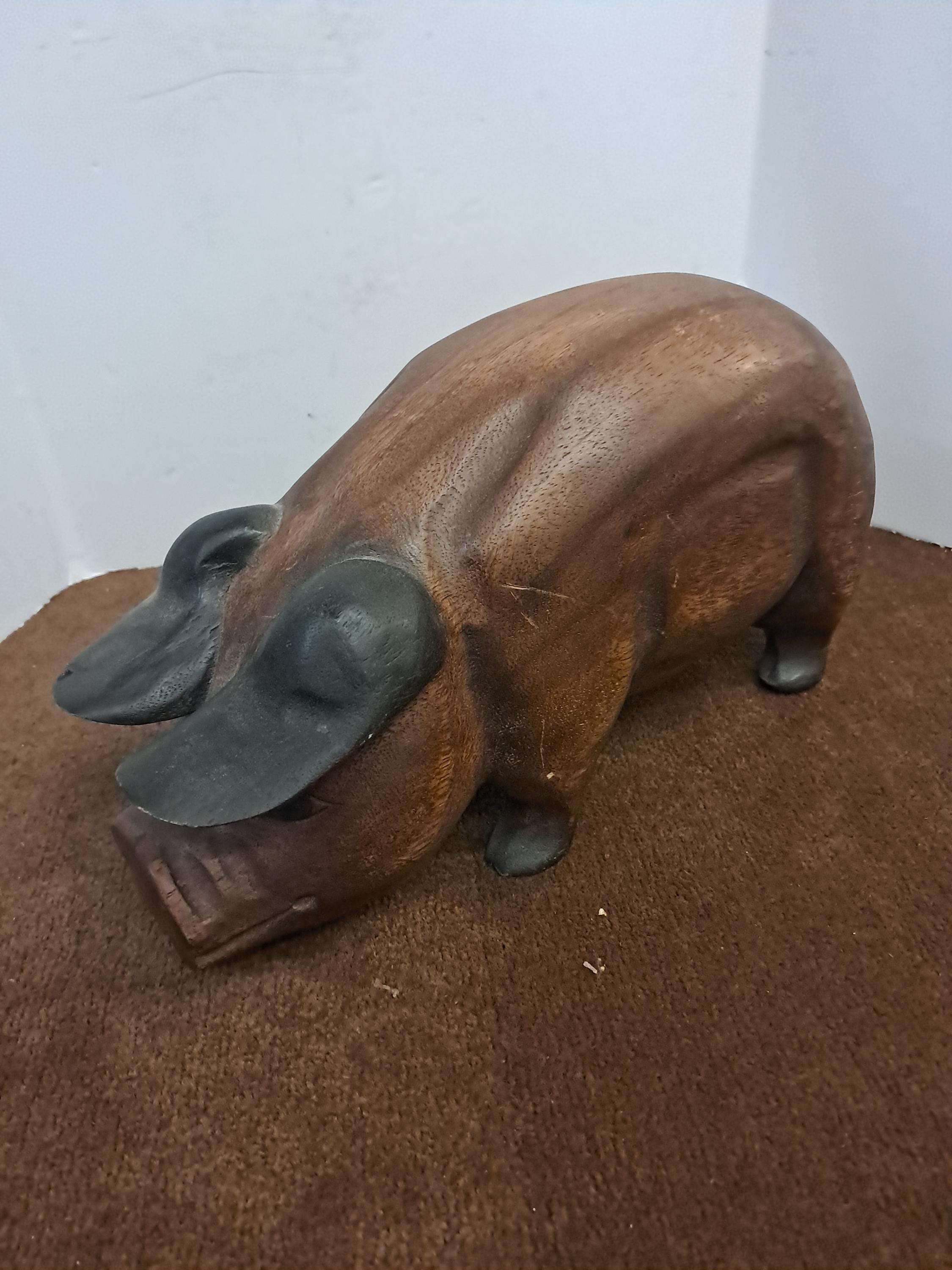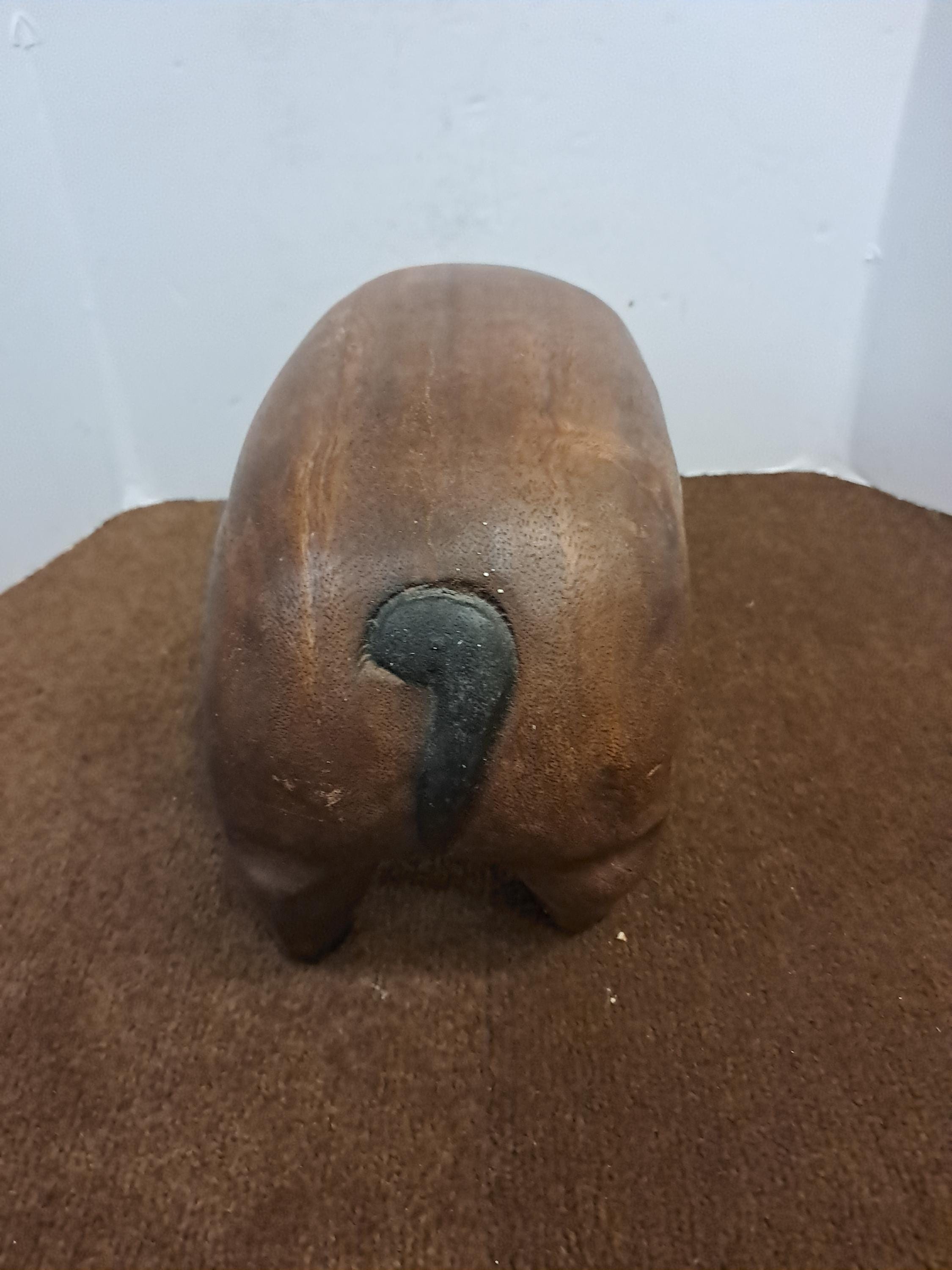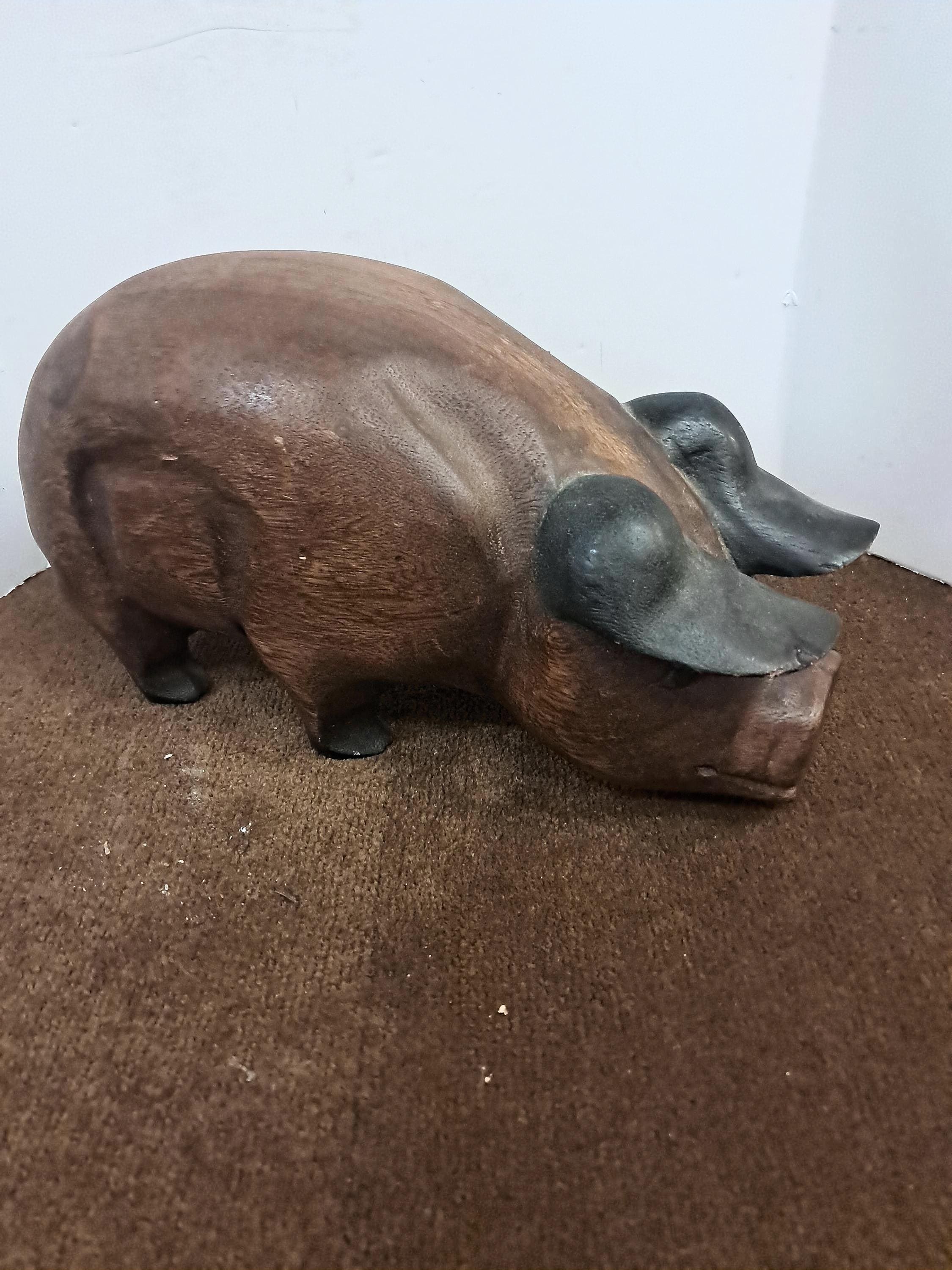 Hand Carved Wooden Pig SculptureHand Carved Wooden Pig Figure Rustic Country Decor12" wide x 5" deep x 7" tallCute rustic country hand carved wooden pig, unmarked. In good vintage conditionWeighs 3.5 lbs pre-packaging.