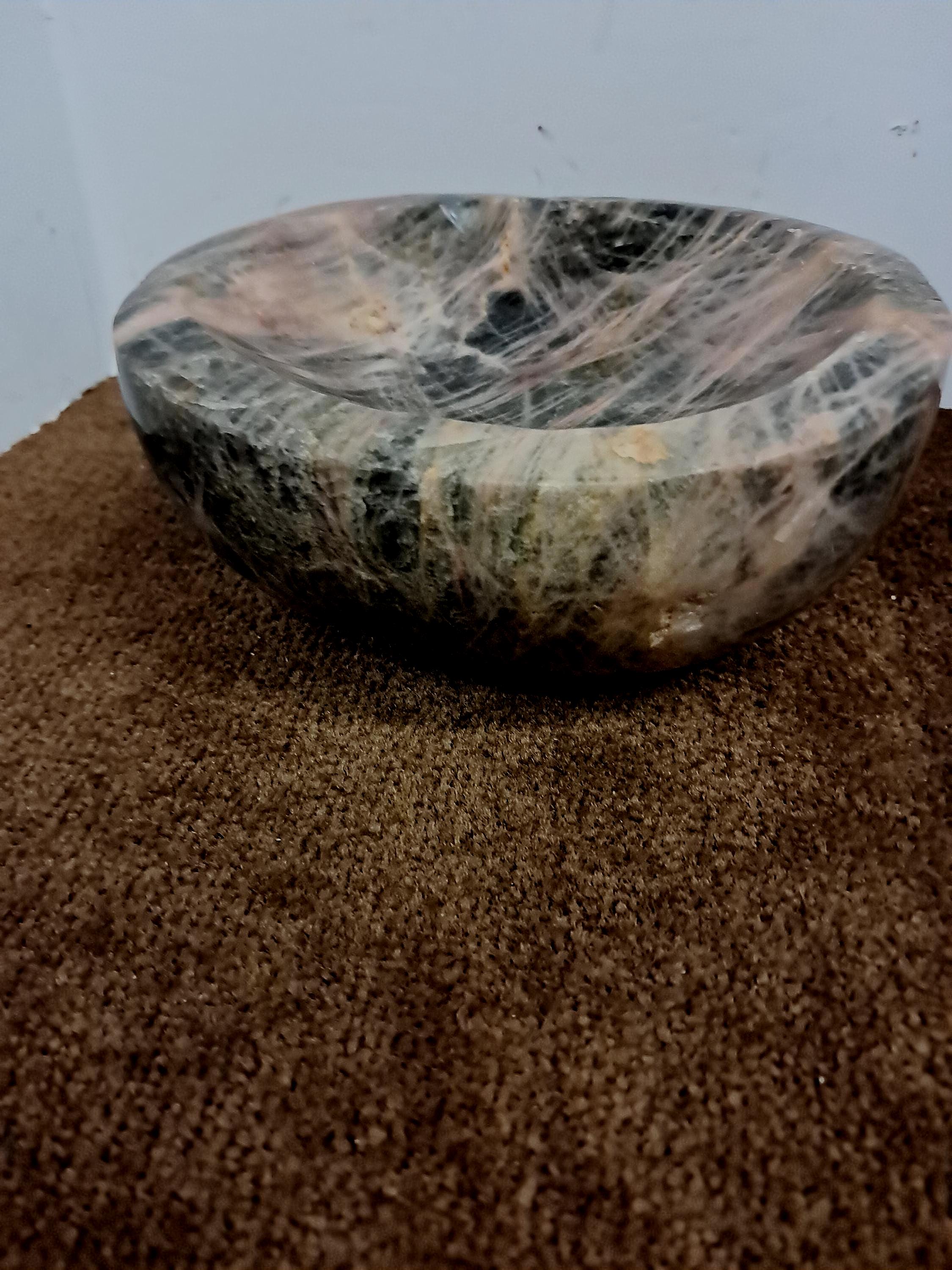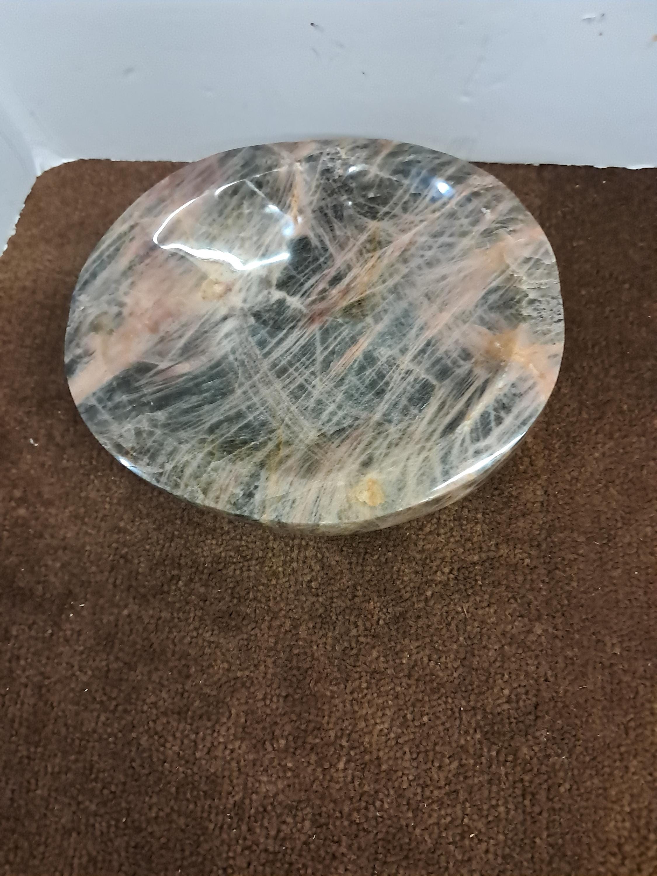This is a polished black moonstone bowl/dish, mined and crafted in Madagascar. Moonstone gets its name from a visual effect, or chatoyance, caused by light diffraction within the micro-crystalline structure. Moonstone is composed of two feldspar varieties, orthoclase and albite. The two species are intermingled. Then, as the newly formed mineral cools, the inter-growth of orthoclase and albite separates into stacked, alternating layers.