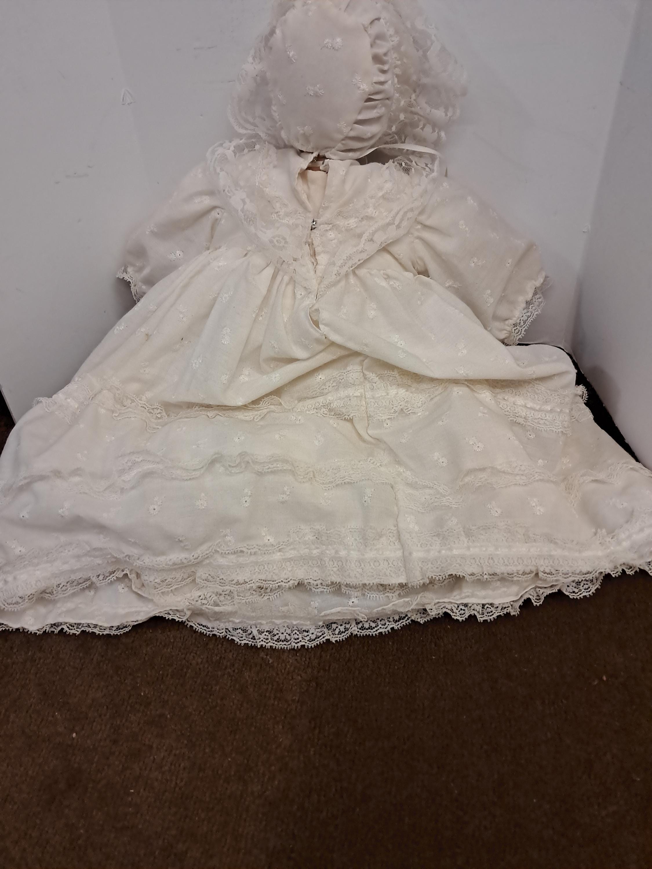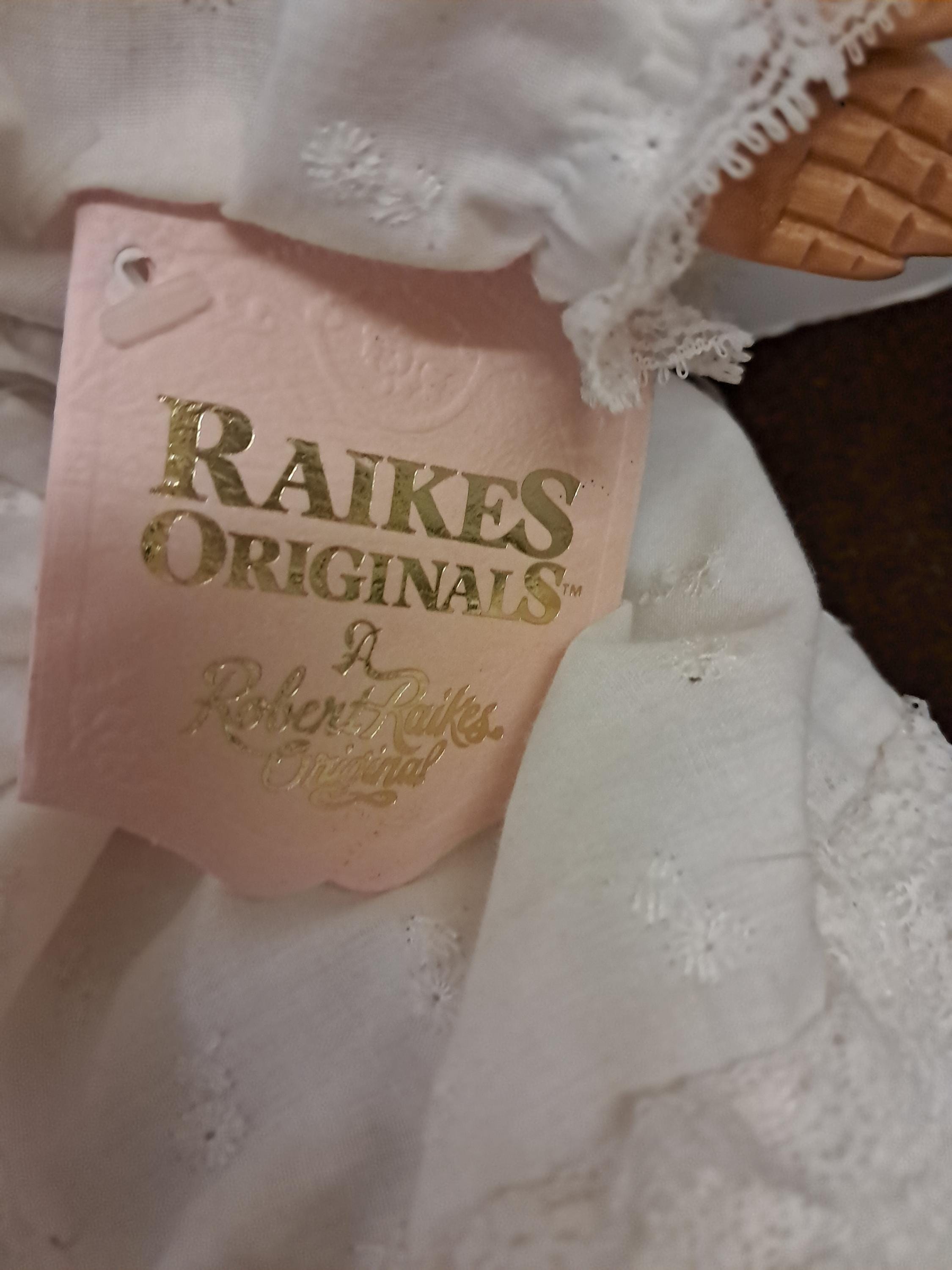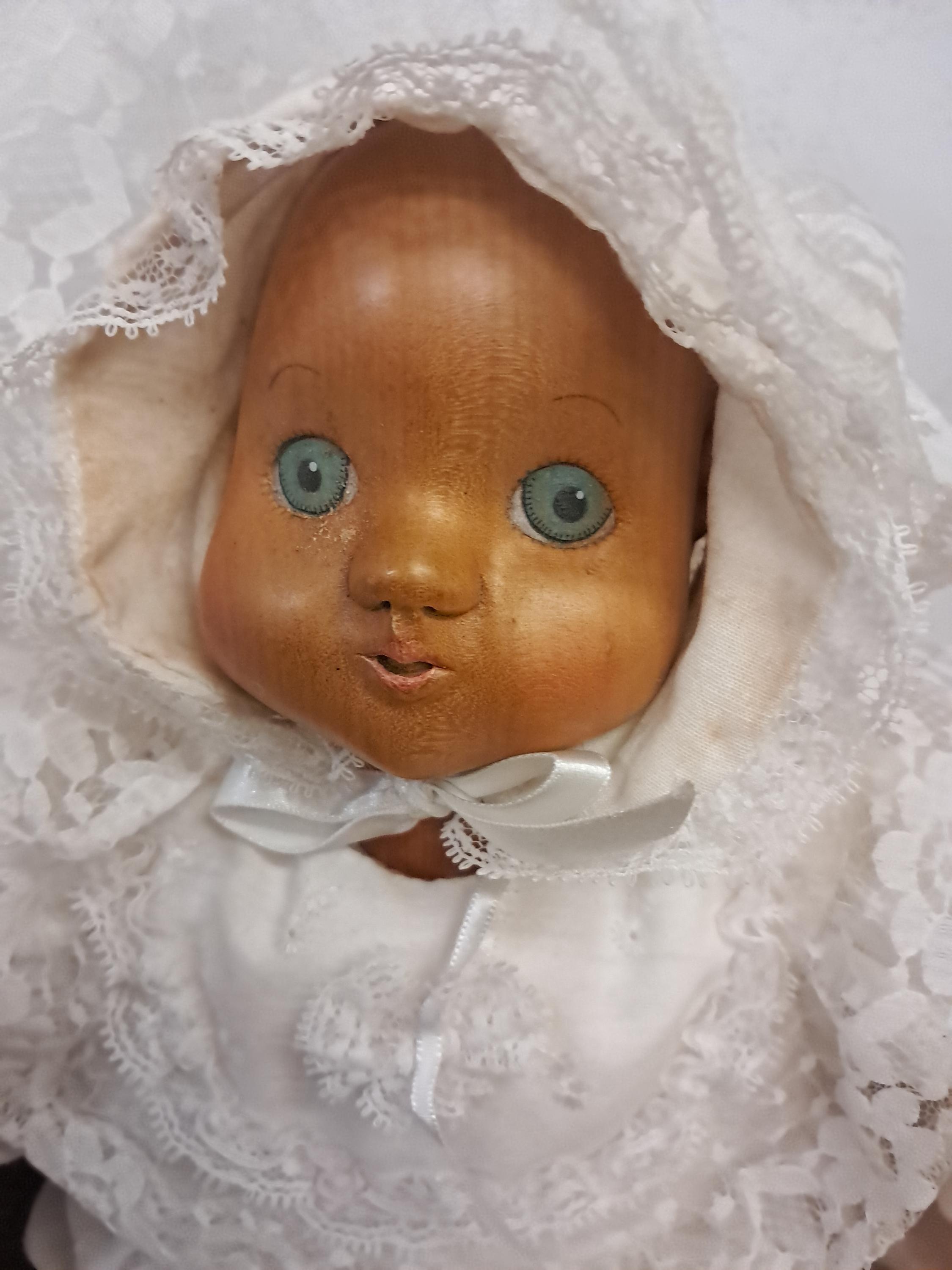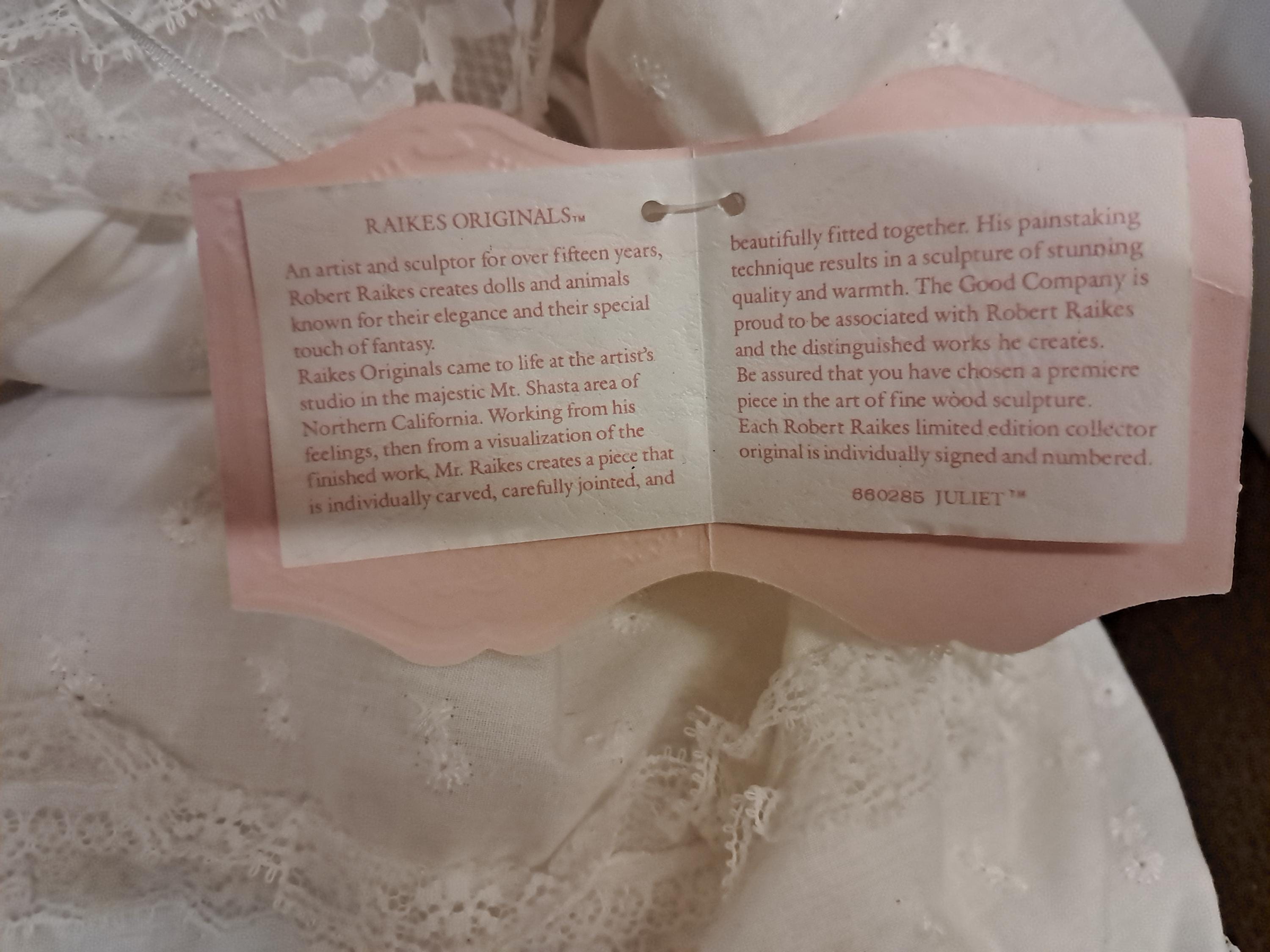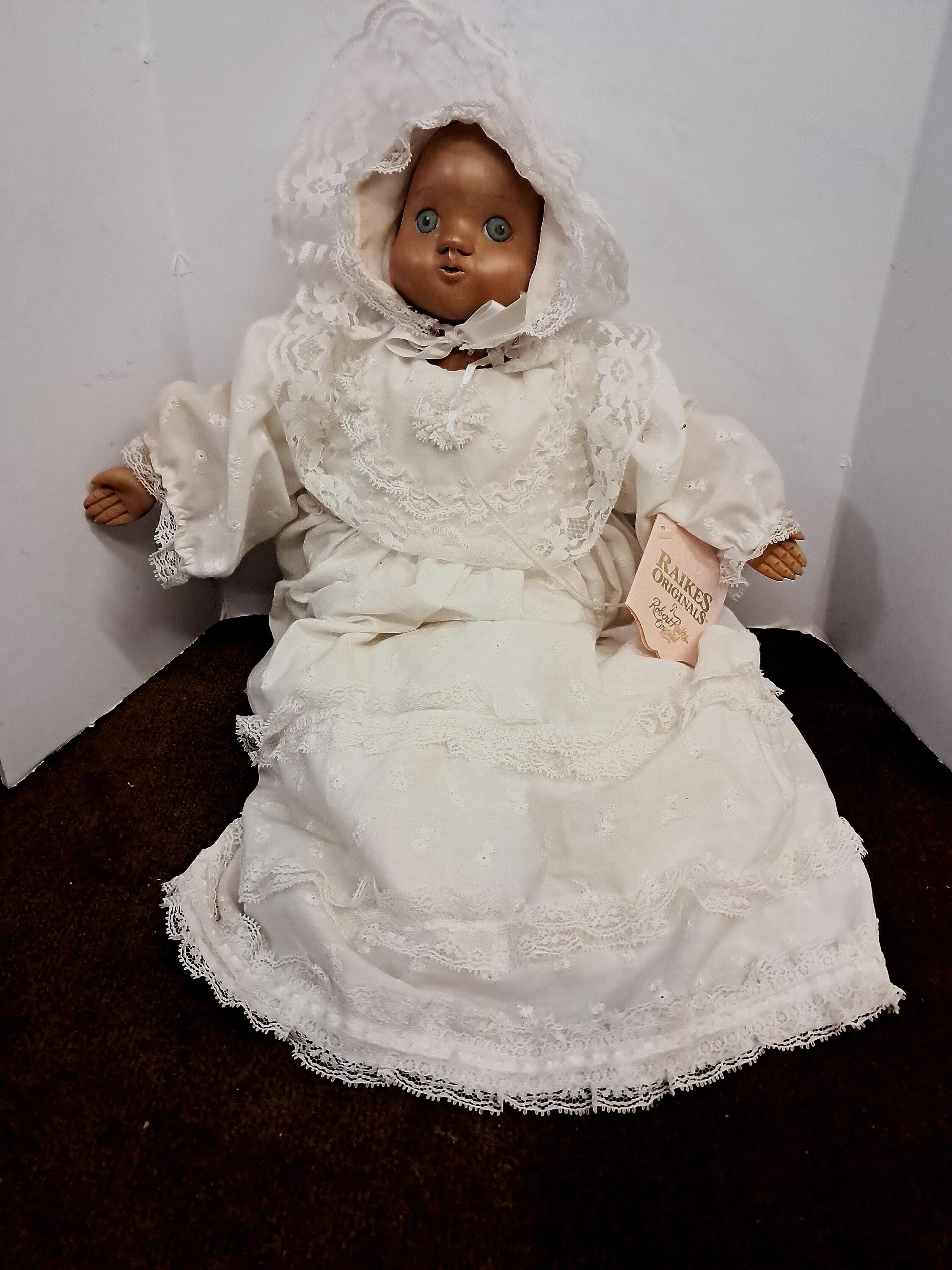 1989 ROBERT RAIKES WOOD HEAD AND HANDS BABY DOLL "JULIET" IN HER CHRISTENING OUTFIT! DOLL IS 16" LONG. GOWN IS MUCH LONGER THAN DOLL. DOLL IS #660285. "JULIET" IS IN WONDERFUL CONDITION EVEN THOUGH SHE IS USED. NICE 1980'S RAIKES COLLECTIBLE WOOD DOLL! Selling "AS IS".