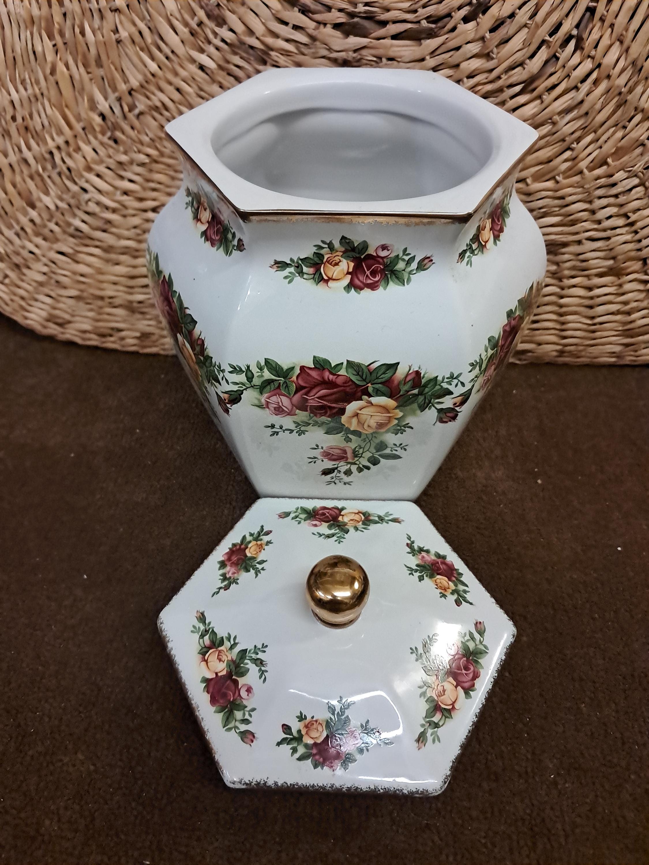 Limited Edition Biscuit Barrel ~Gorgeous Royal Albert Old Country Roses cookie/biscuit barrel. Great decorative and usable piece. 22k Gold accents Beautiful detailing Measures 7.5 " tall by 5.75 " wide . Very good vintage condition. No Damages .