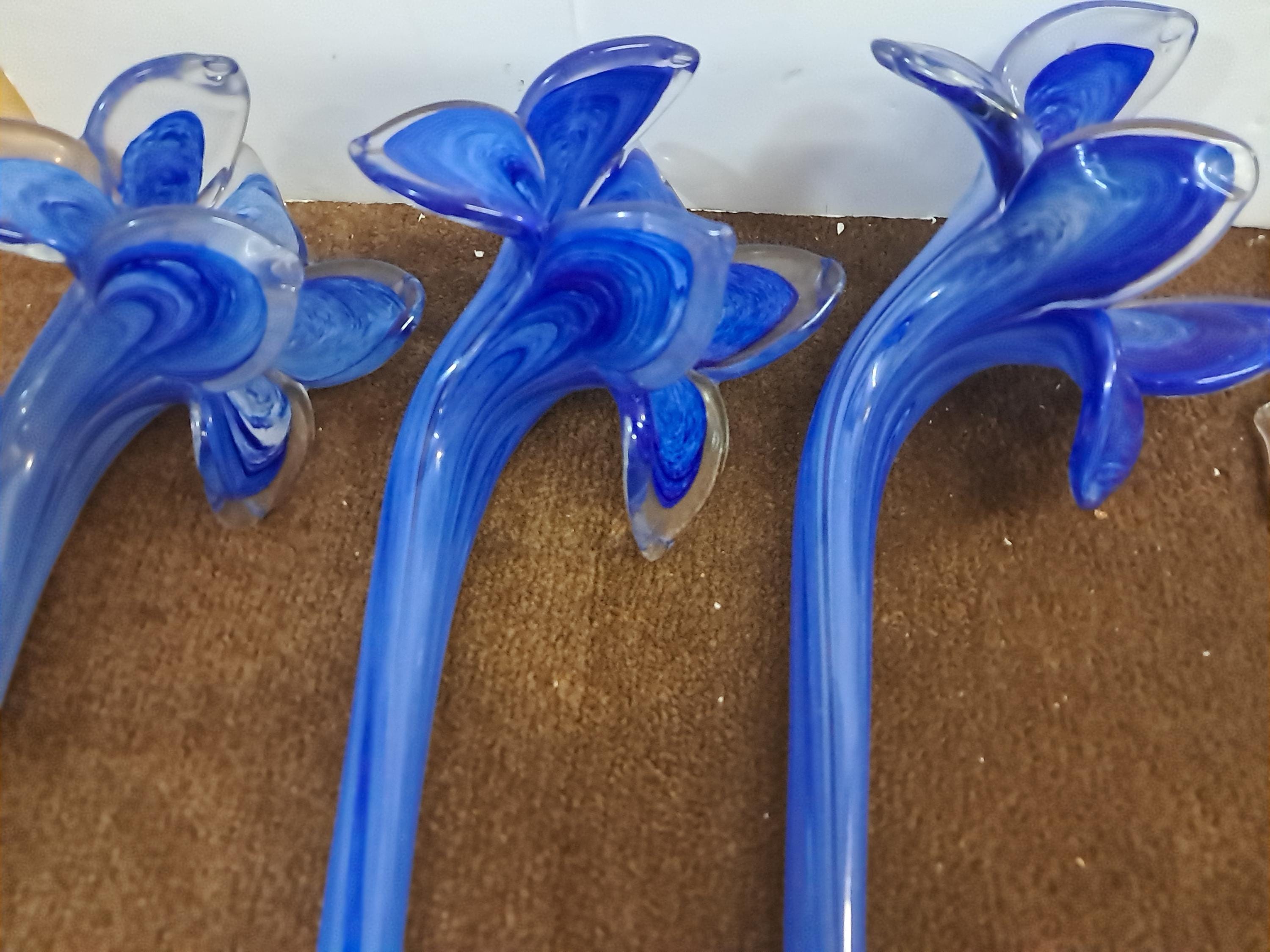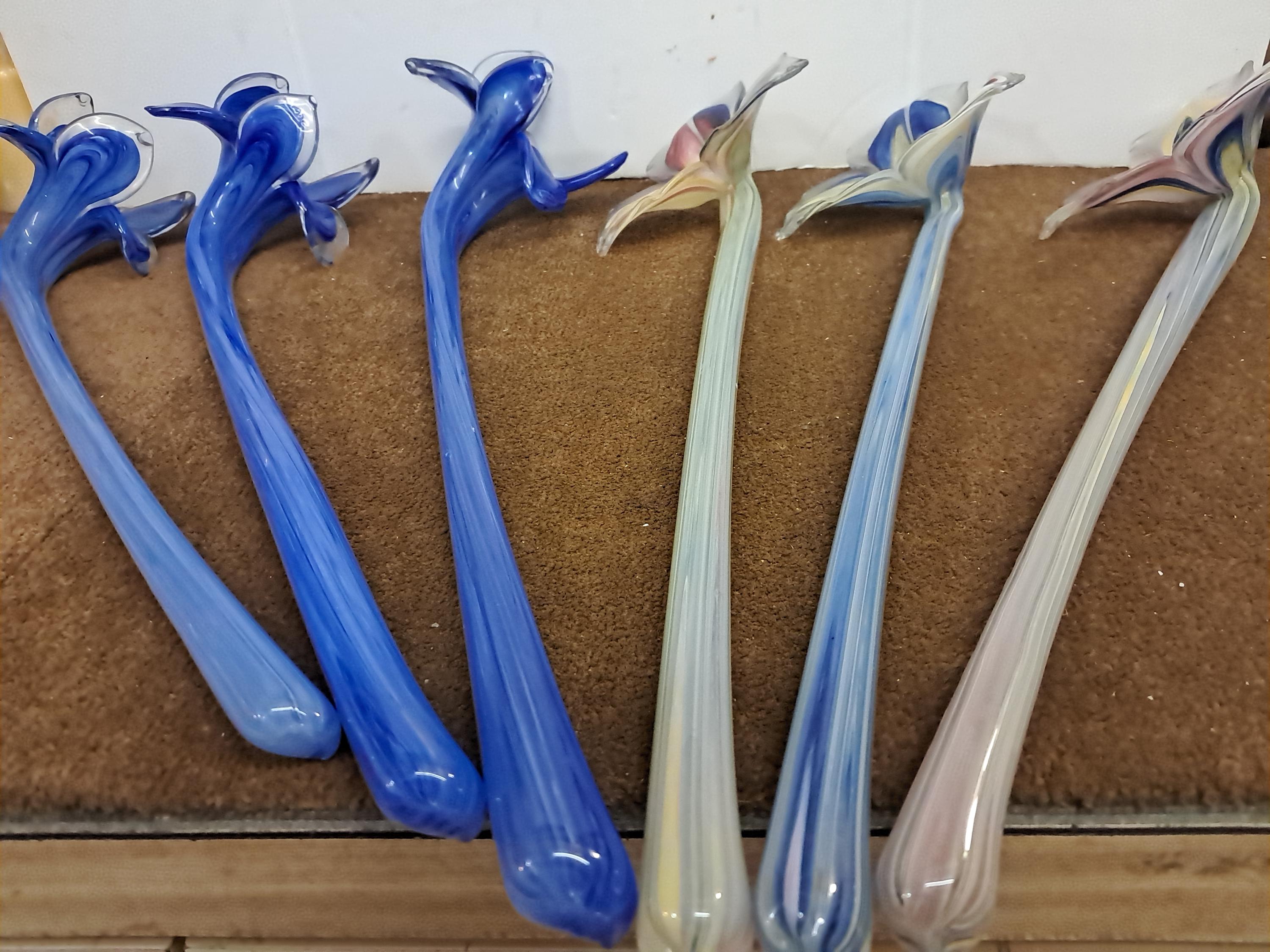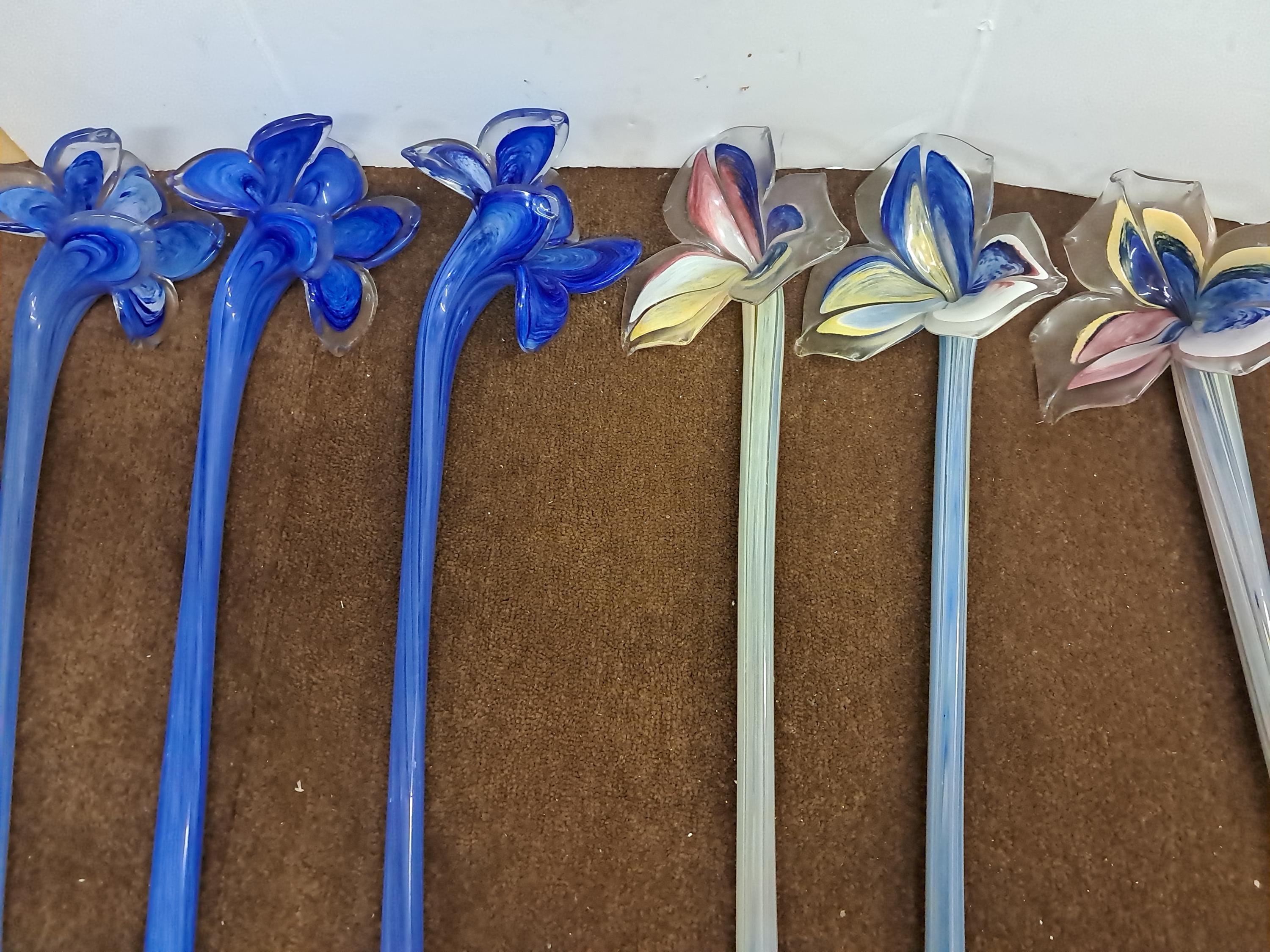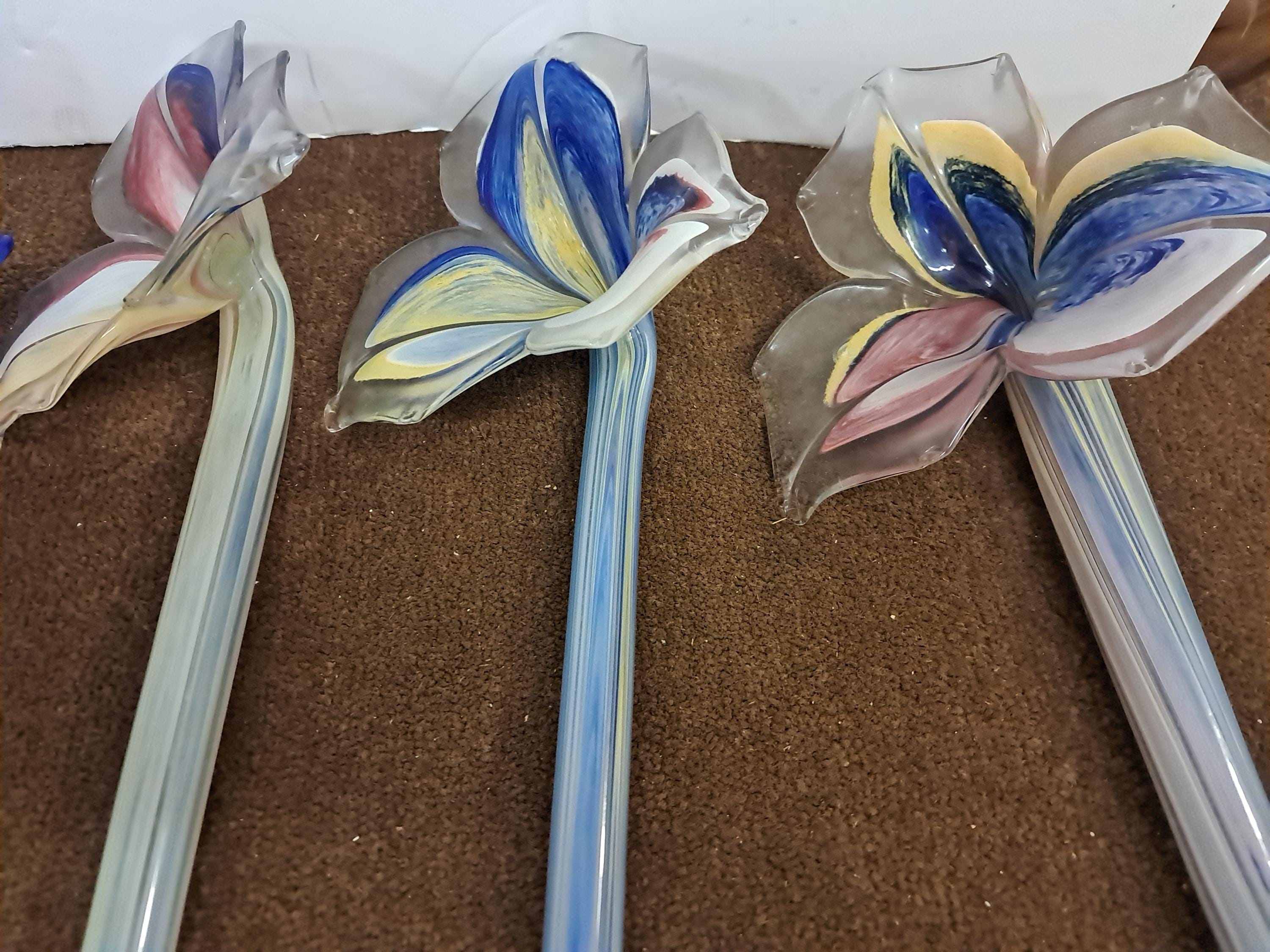 Murano Style Hand Blown Glass Lily FlowersVintage Murano Style 6 Art Glass 20 " Long Stem Flowers All 6 are in Excellent Condition with no damagesEach Measures At 20 " long and 4 " wide