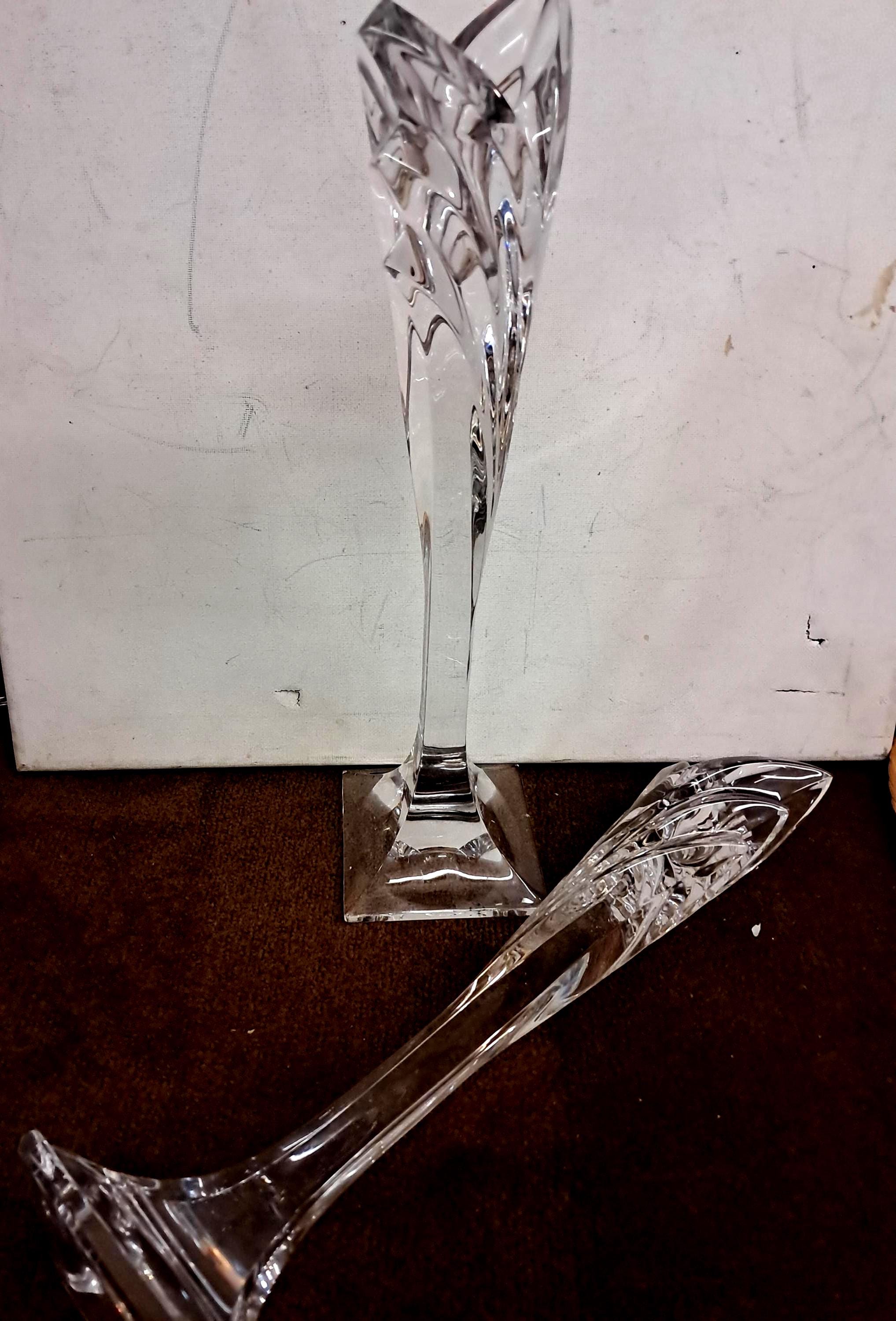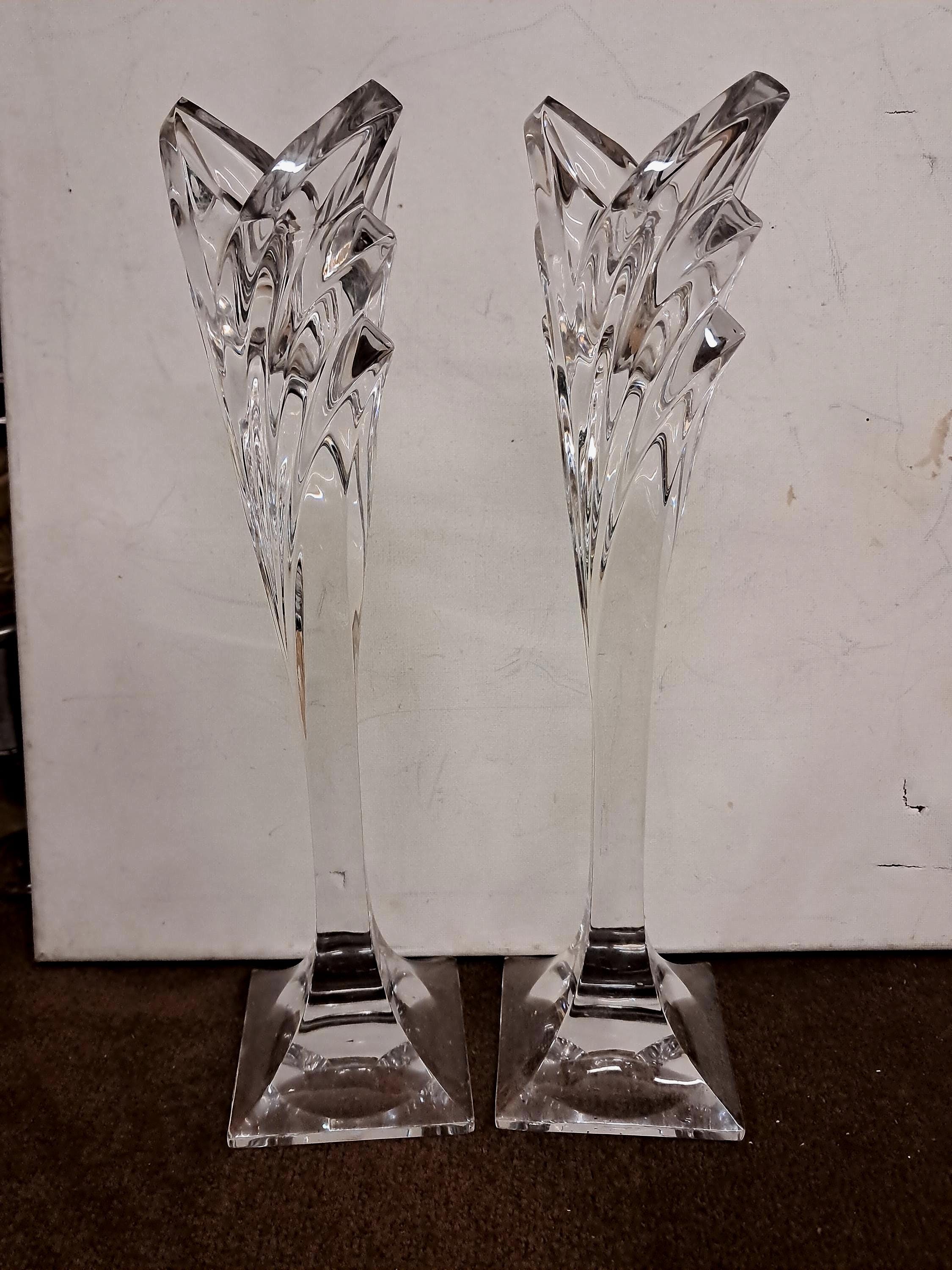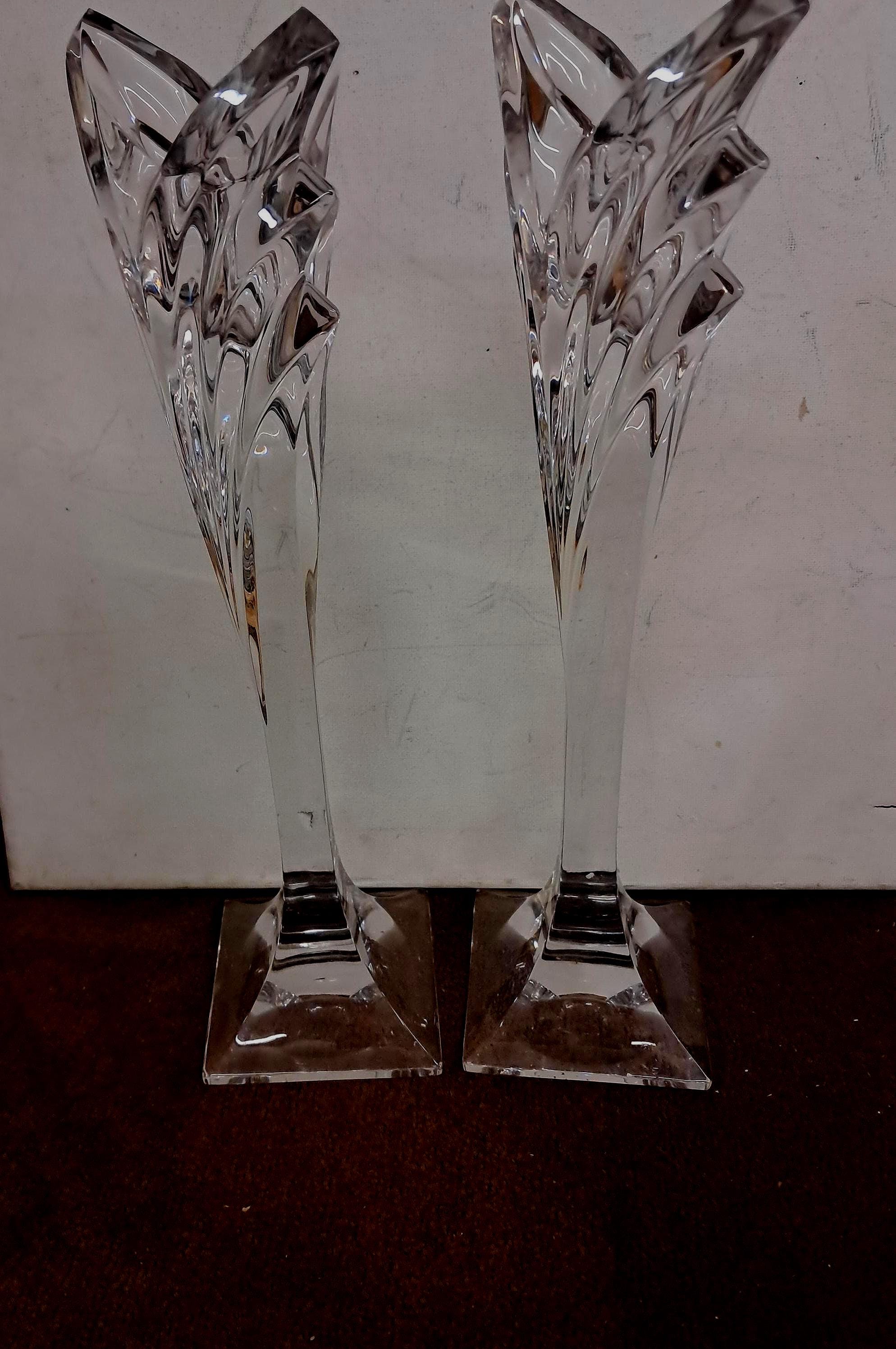 2 Mikasa 12 " Art deco Crystal Candle HoldersHeight: 12 3/8 inWidth: 3 3/8 inDiscontinued PieceCondition: Used (each item is inspected for quality and is guaranteed to be in excellent condition)