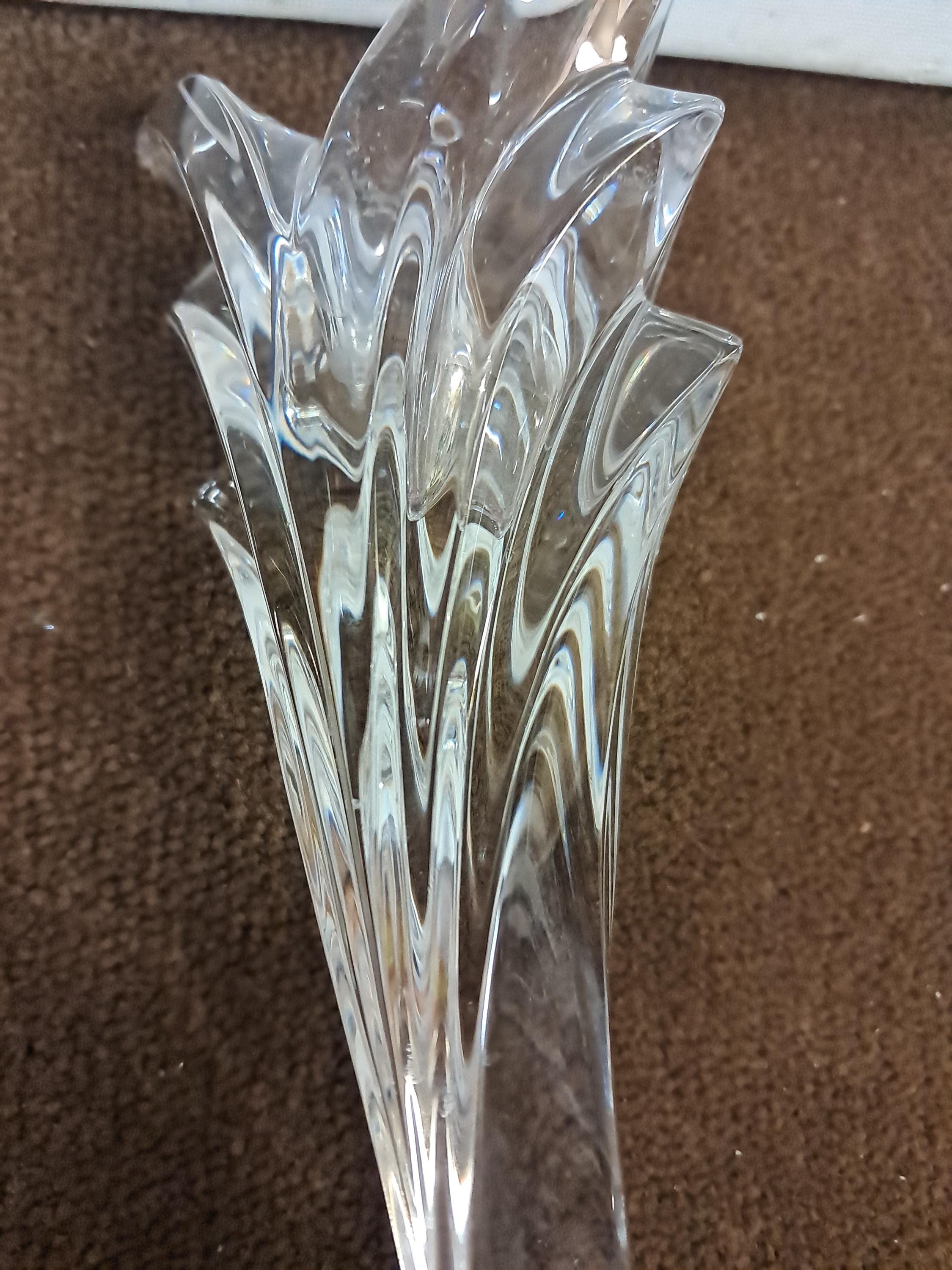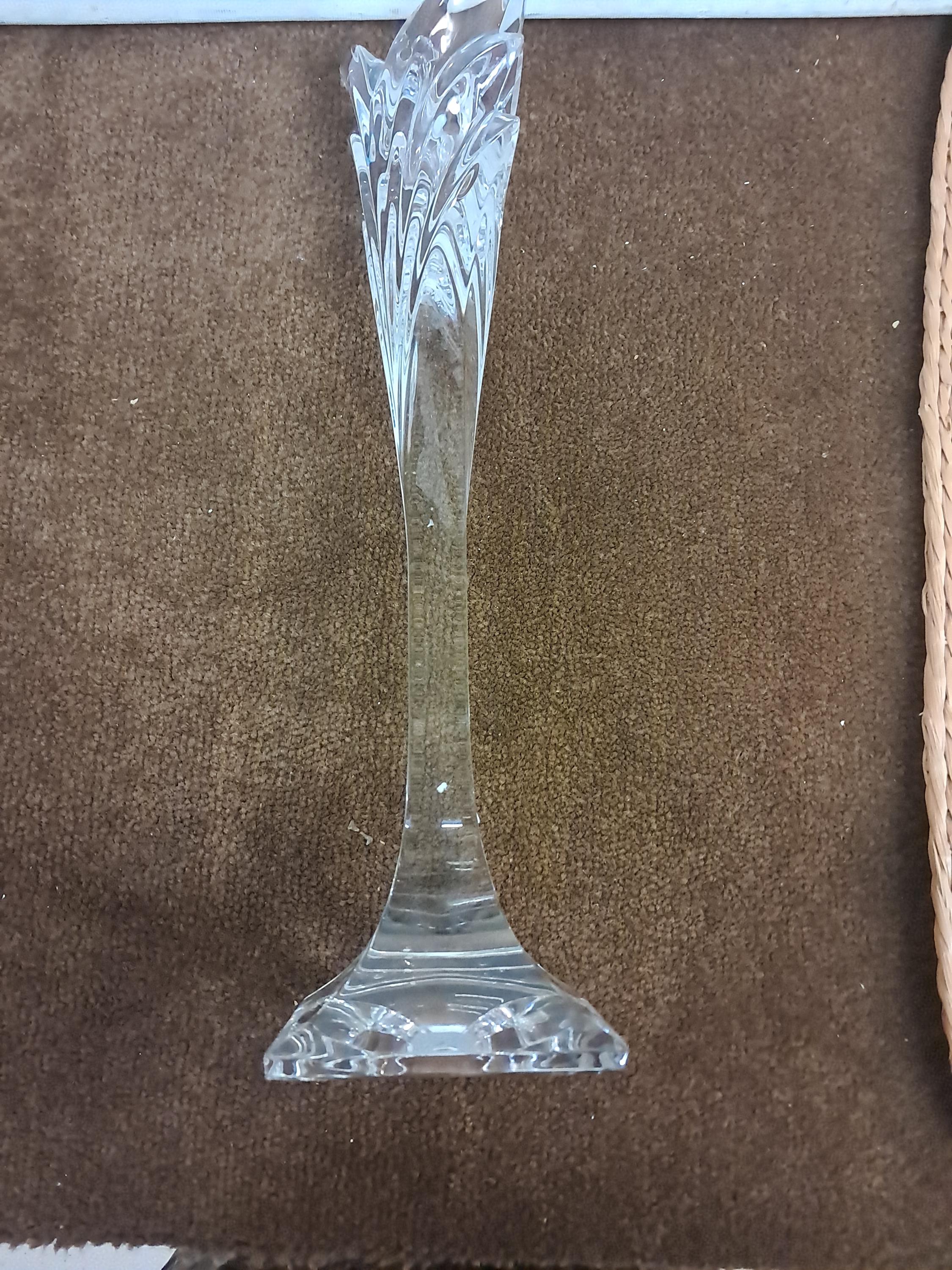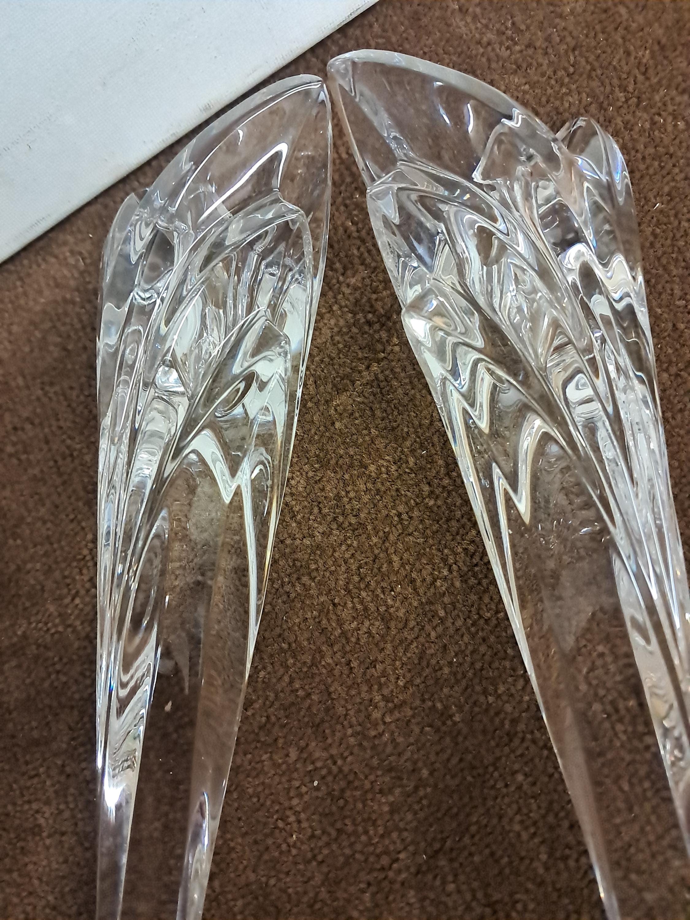 2 Mikasa 12 " Art deco Crystal Candle HoldersHeight: 12 3/8 inWidth: 3 3/8 inDiscontinued PieceCondition: Used (each item is inspected for quality and is guaranteed to be in excellent condition)
