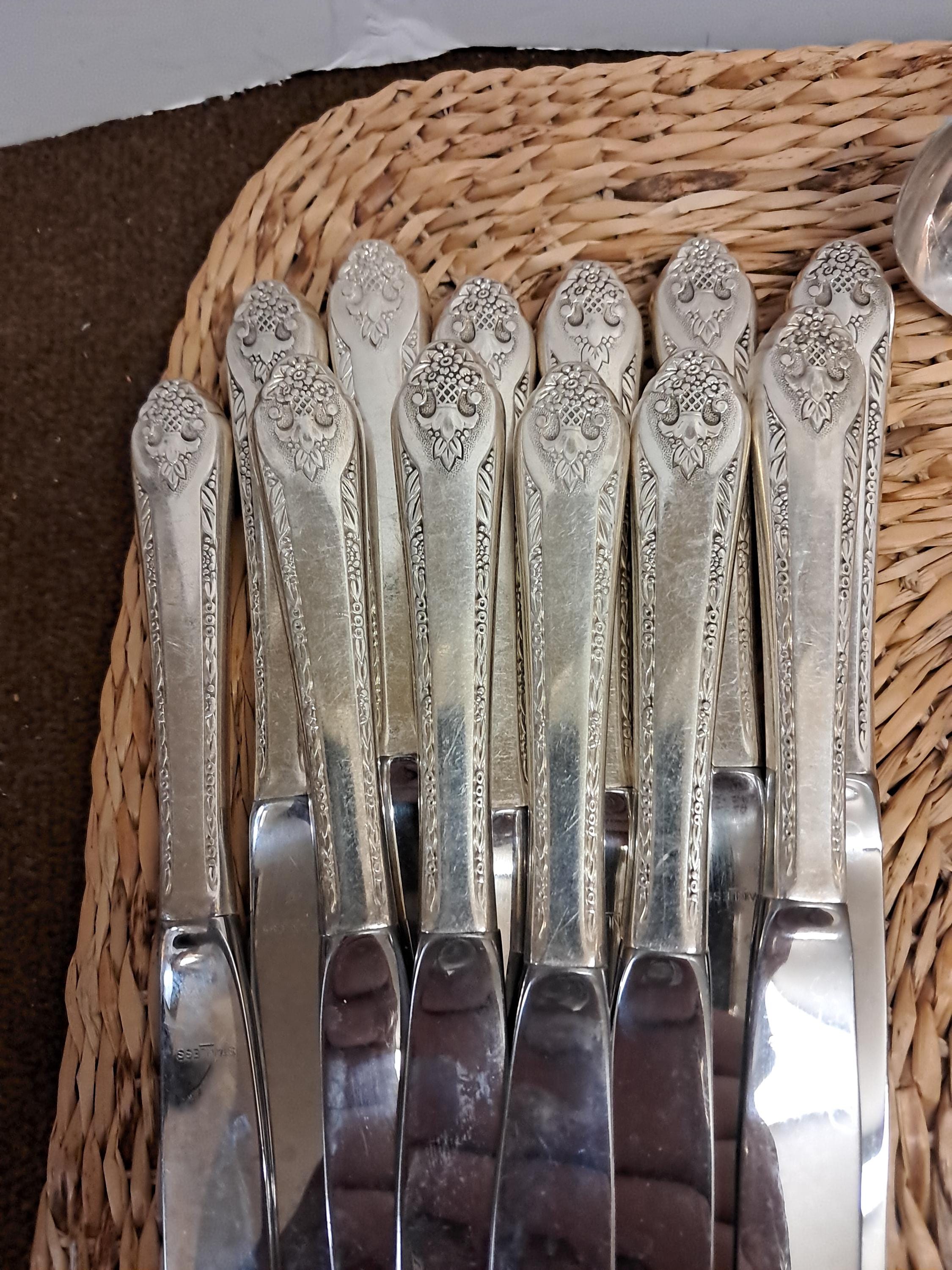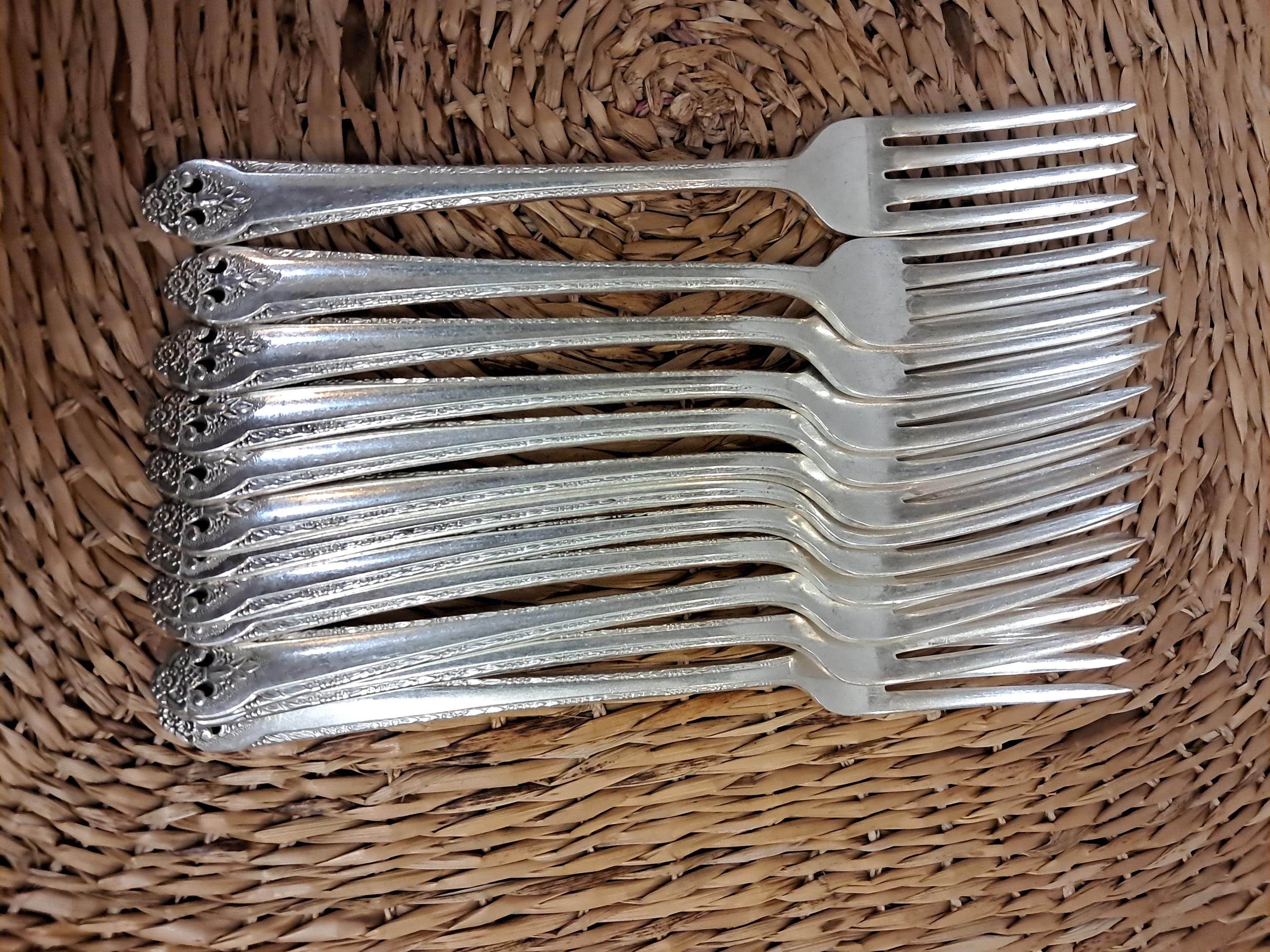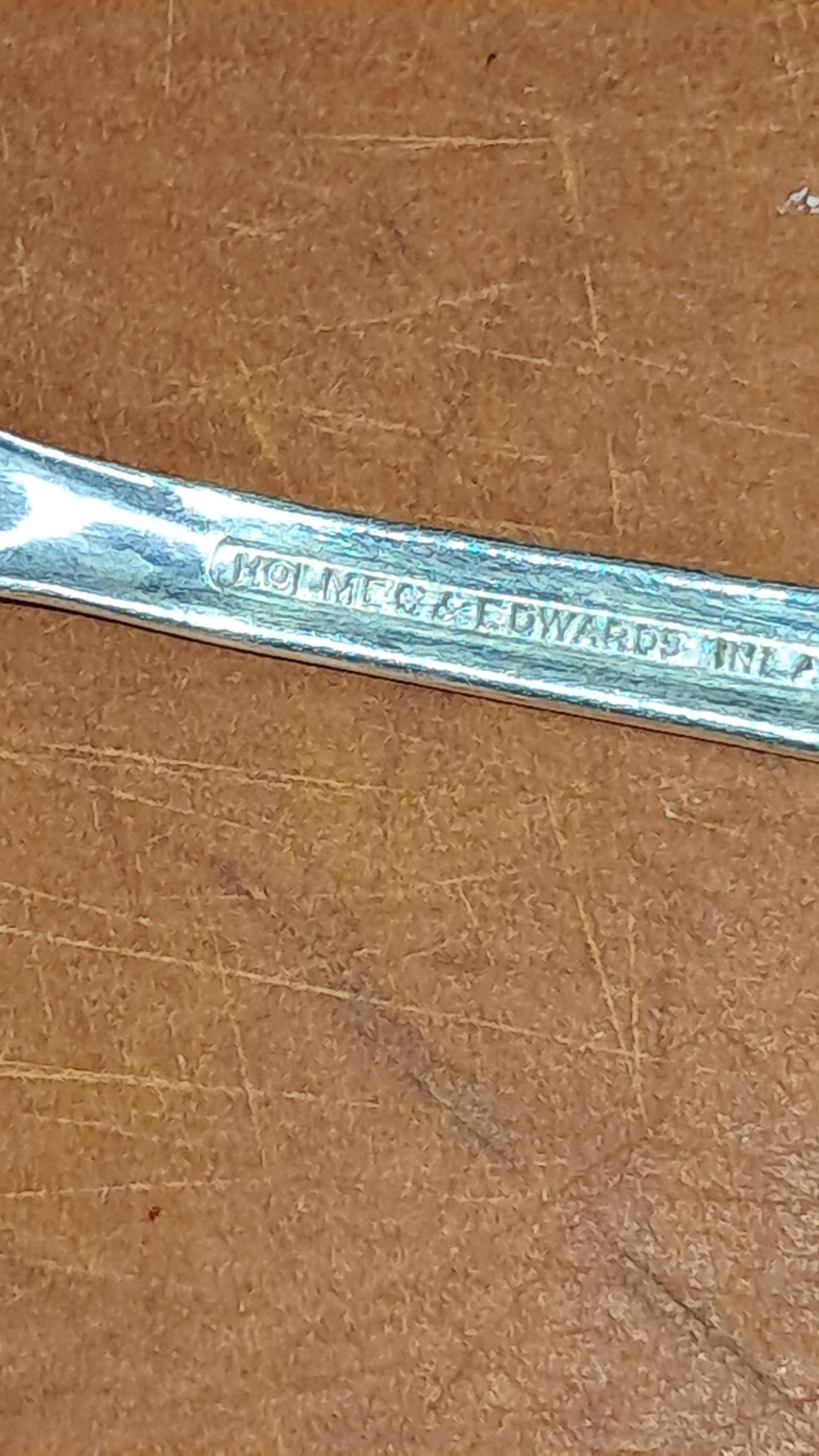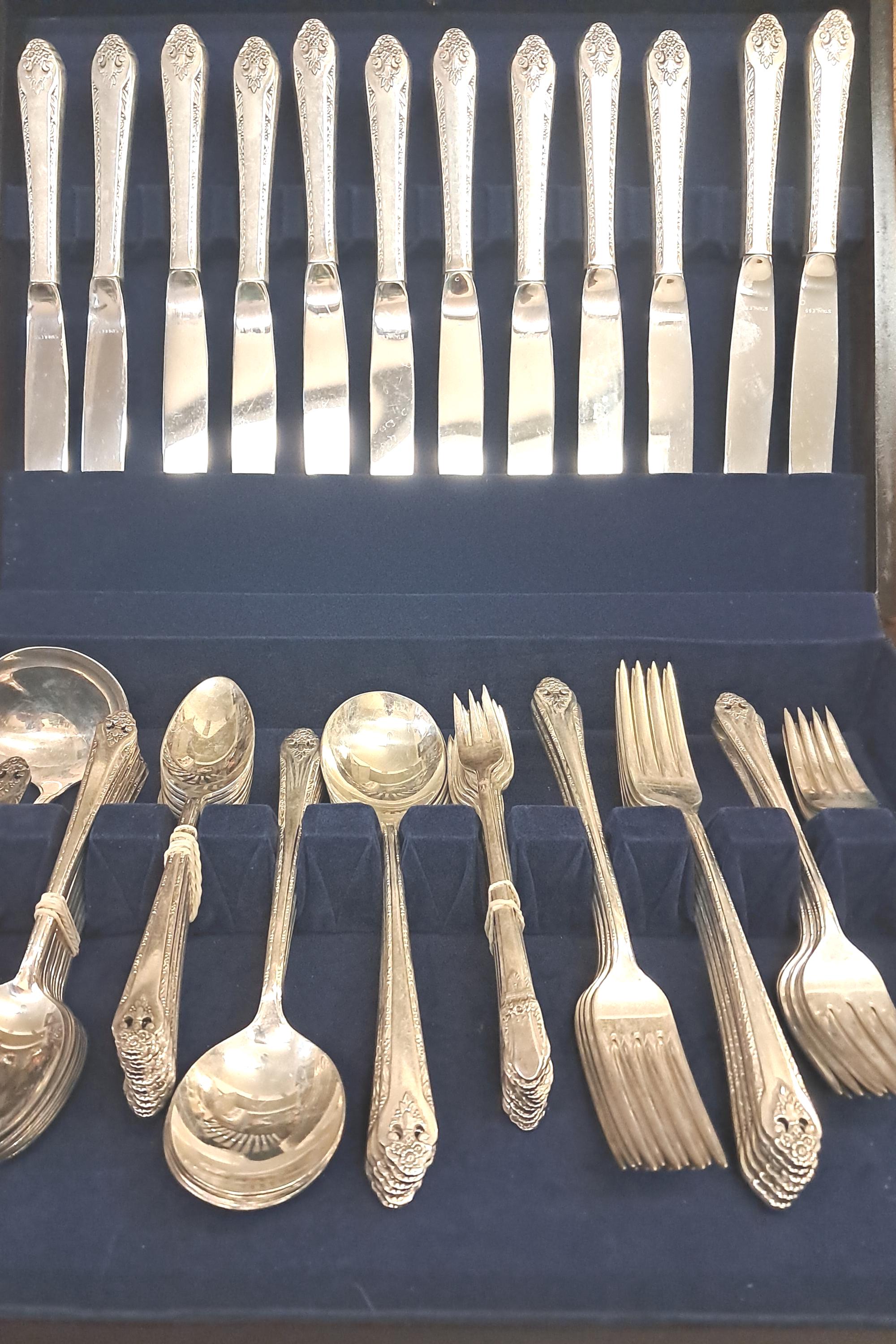 Product Description: This is not your typical silver-plate flatware set. From the World War II era, made by Holmes & Edwards, this service for 12 and is an exceptional quality. This silver-plate 74 piece set with sterling silver inlaid is made using a unique, patented technique which adds extra protection at the critical wear points. On most of the used forks and spoons, sterling silver is fused directly to the metal on the most used wear areas before heavily applying the silver-plate coating. Now the sterling silver is inlaid in those areas underneath the silver-plate, resulting in a longer-lasting, gorgeous set of flatware.