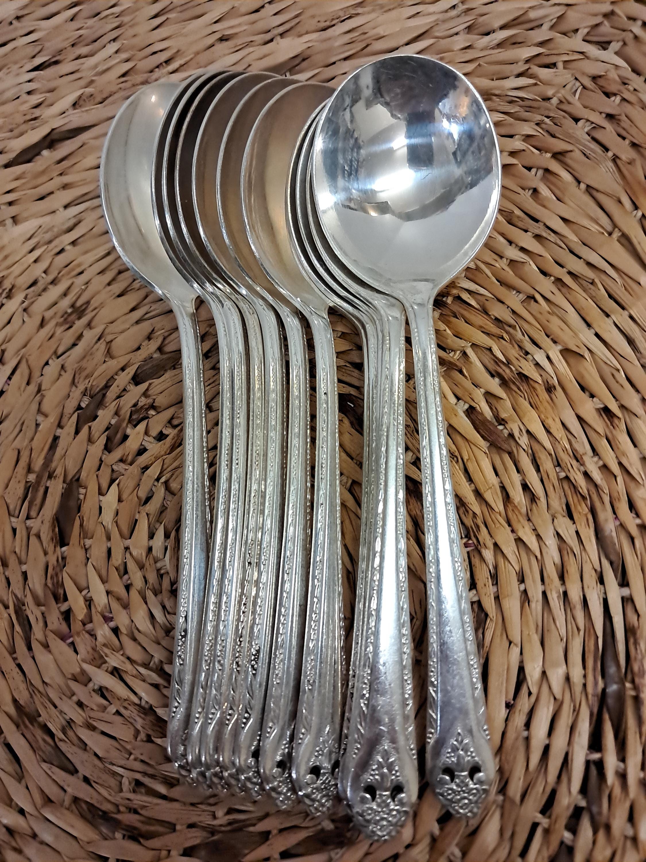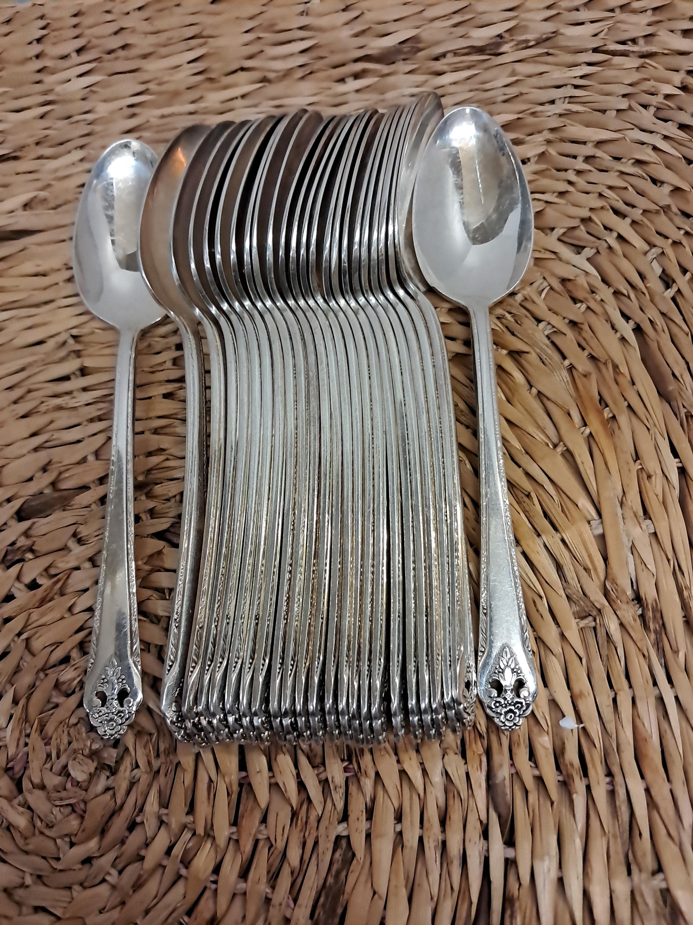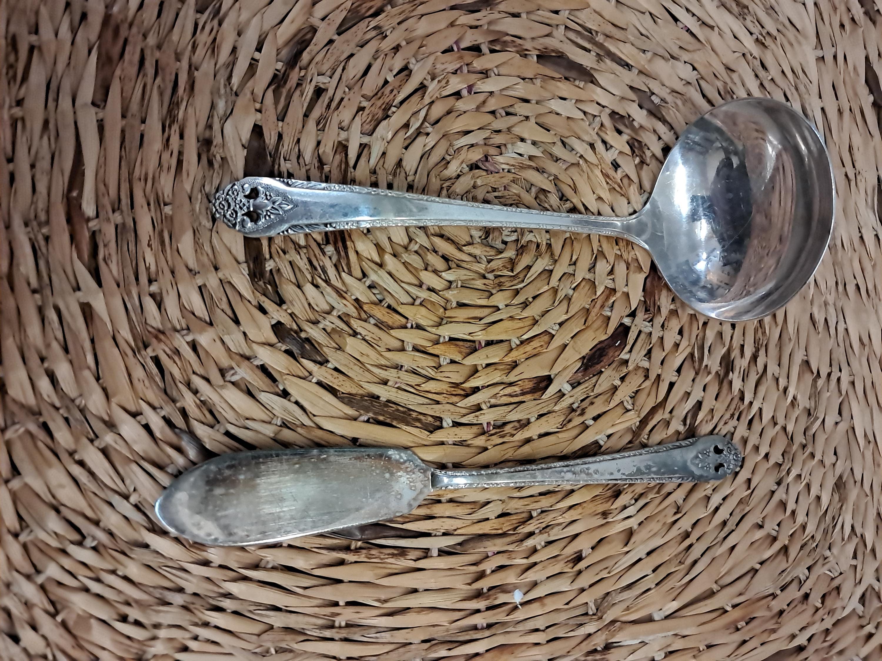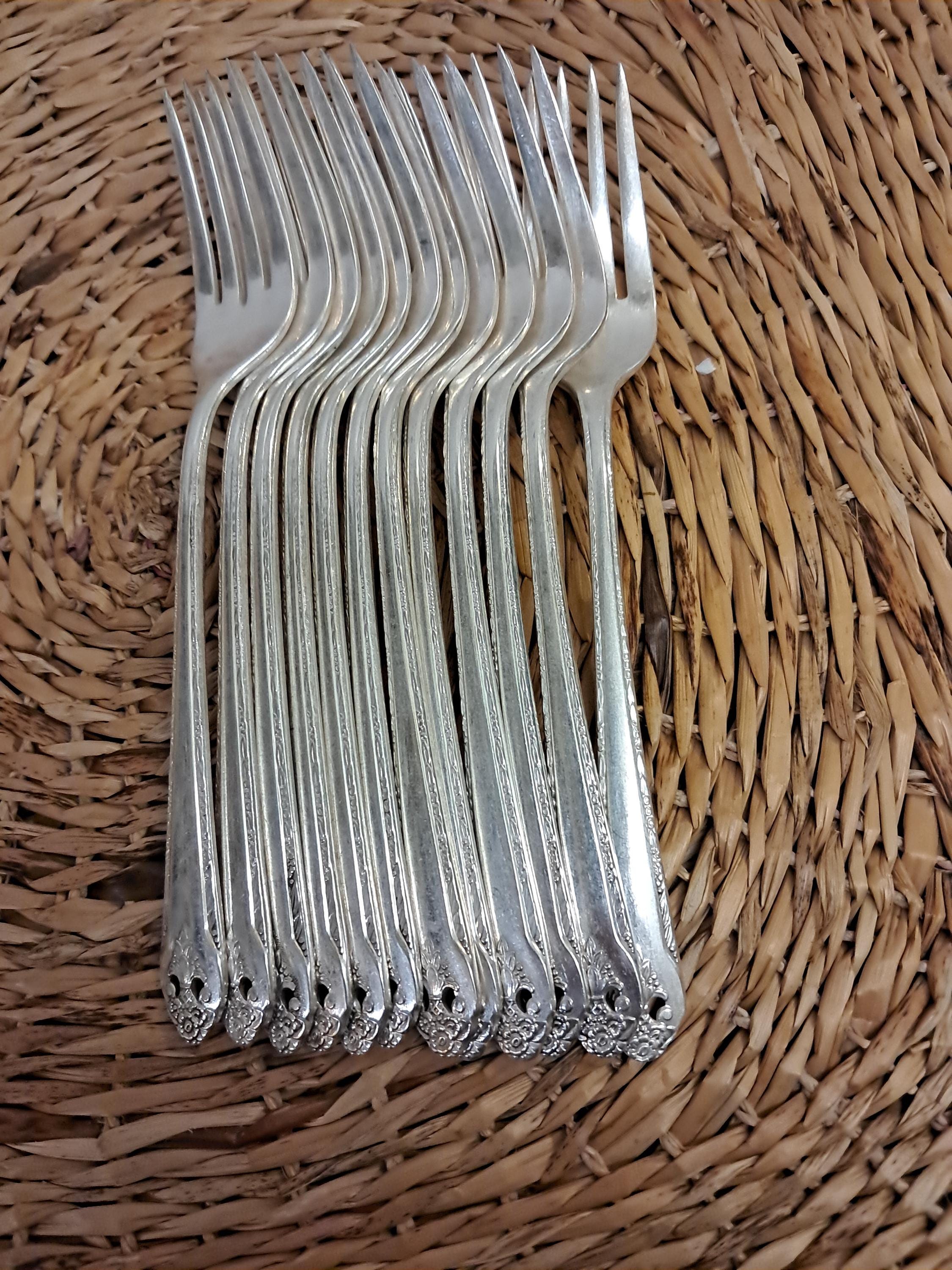 Product Description: This is not your typical silver-plate flatware set. From the World War II era, made by Holmes & Edwards, this service for 12 and is an exceptional quality. This silver-plate 74 piece set with sterling silver inlaid is made using a unique, patented technique which adds extra protection at the critical wear points. On most of the used forks and spoons, sterling silver is fused directly to the metal on the most used wear areas before heavily applying the silver-plate coating. Now the sterling silver is inlaid in those areas underneath the silver-plate, resulting in a longer-lasting, gorgeous set of flatware.