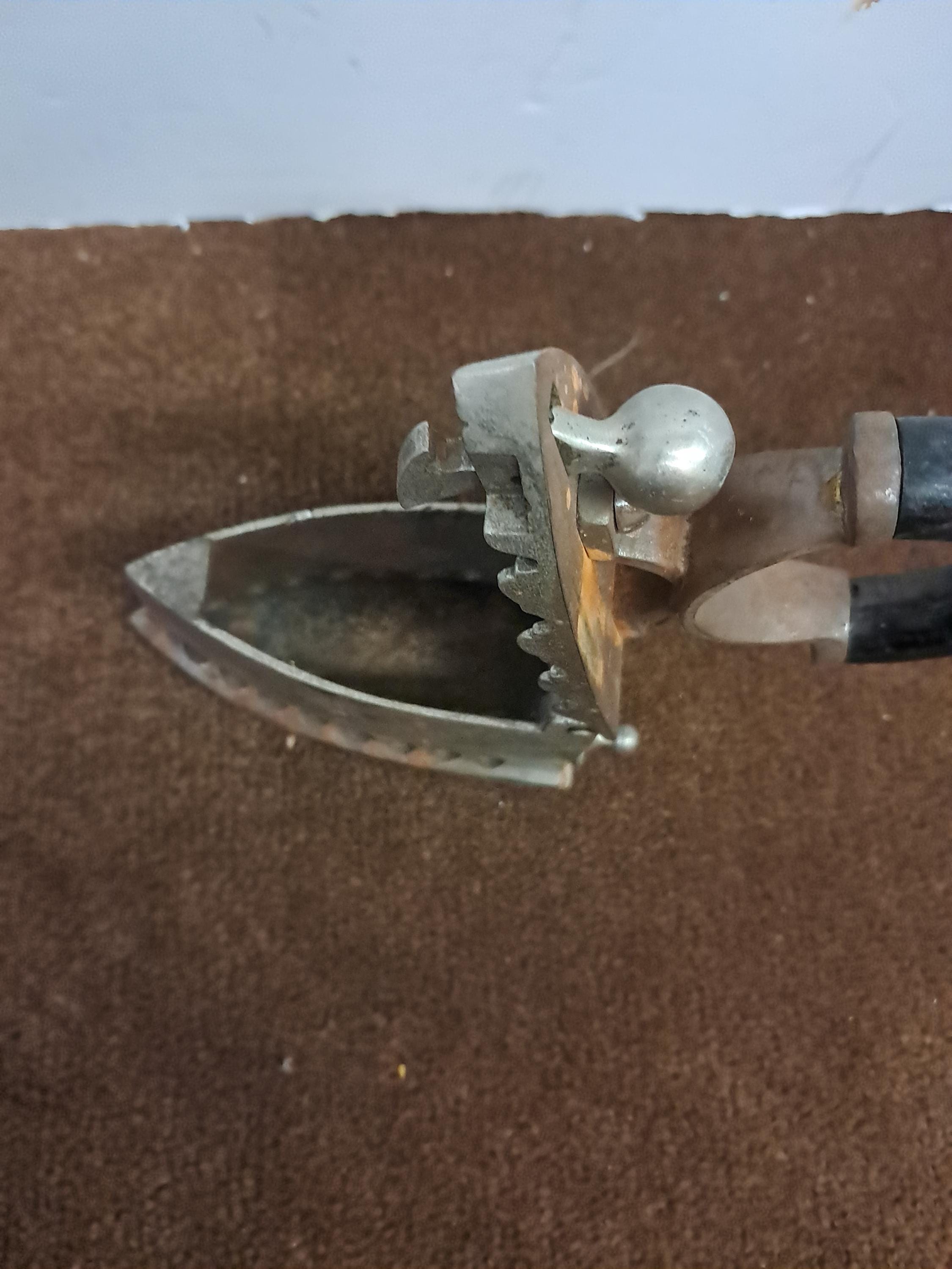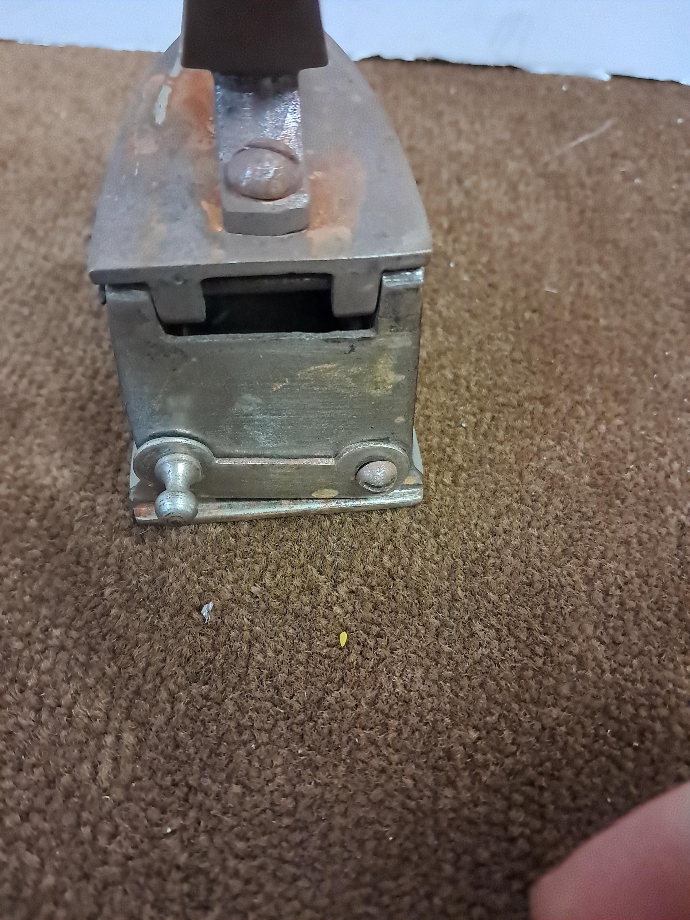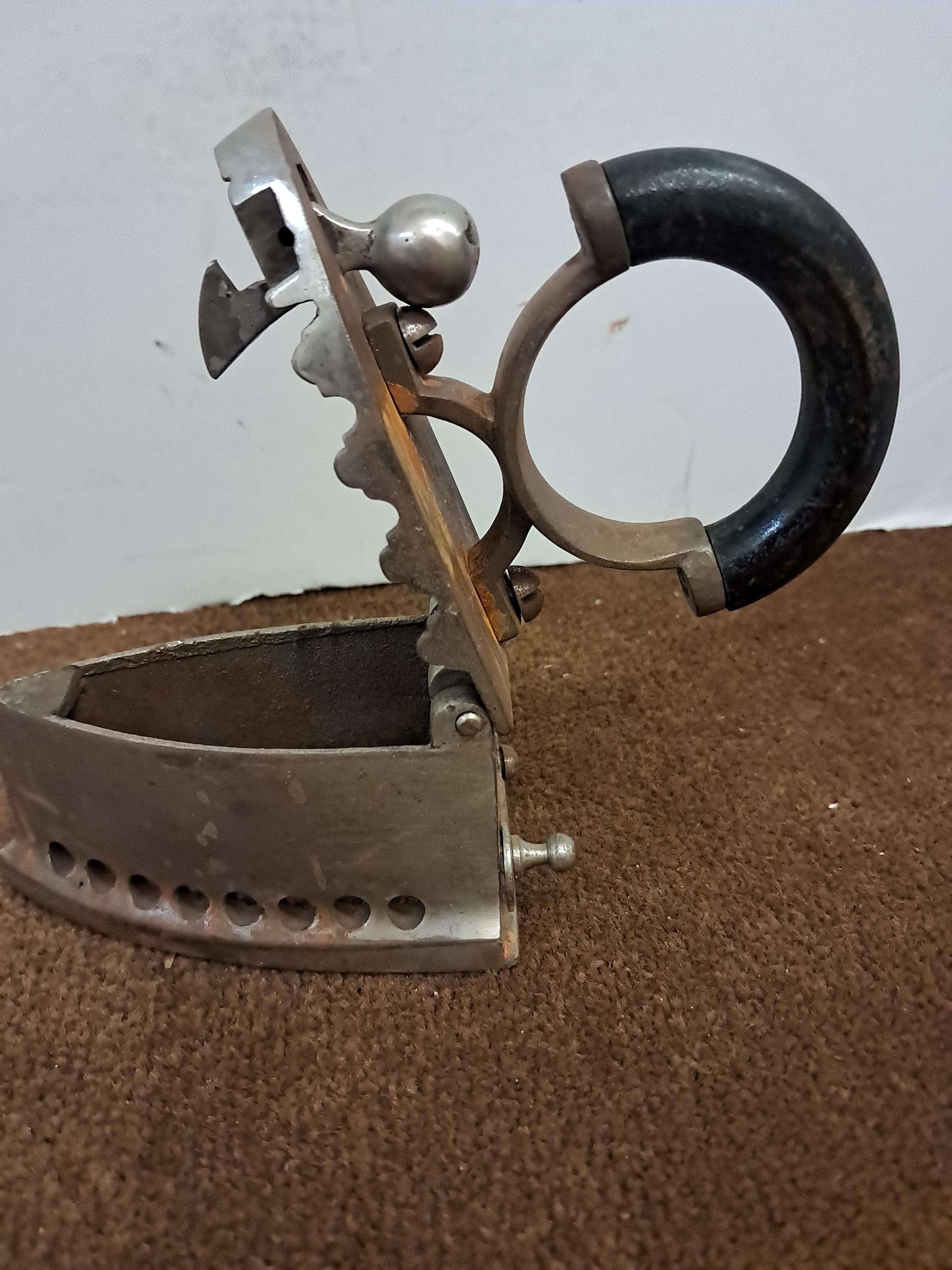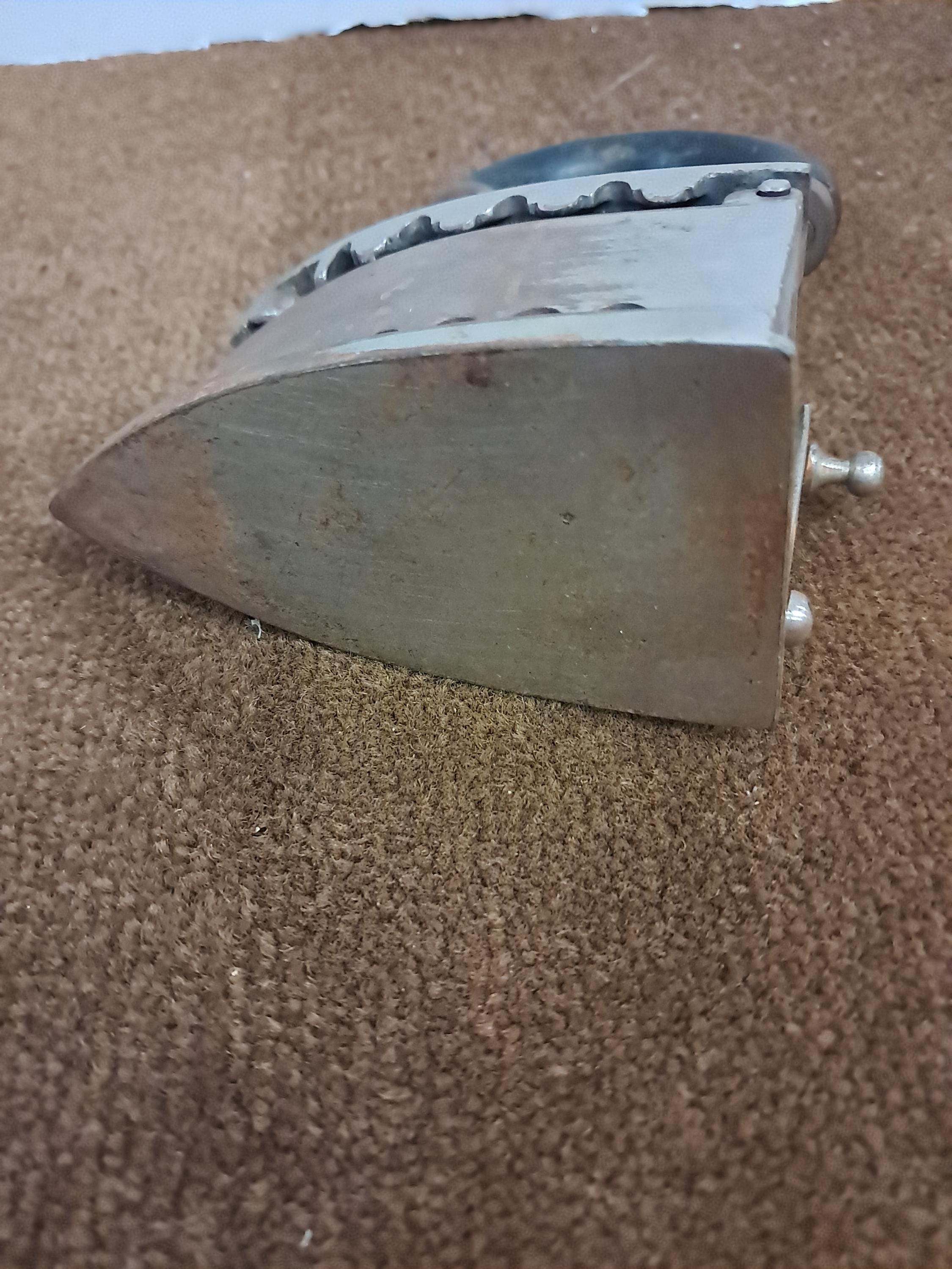 Antique Clothes Iron, 20th Century Coal Iron France, Iron with wood Handel5" tall x 4" w x 2' dA bit Rusty but can be cleanedUsually called Salesman Sample. Good Vintage Condition