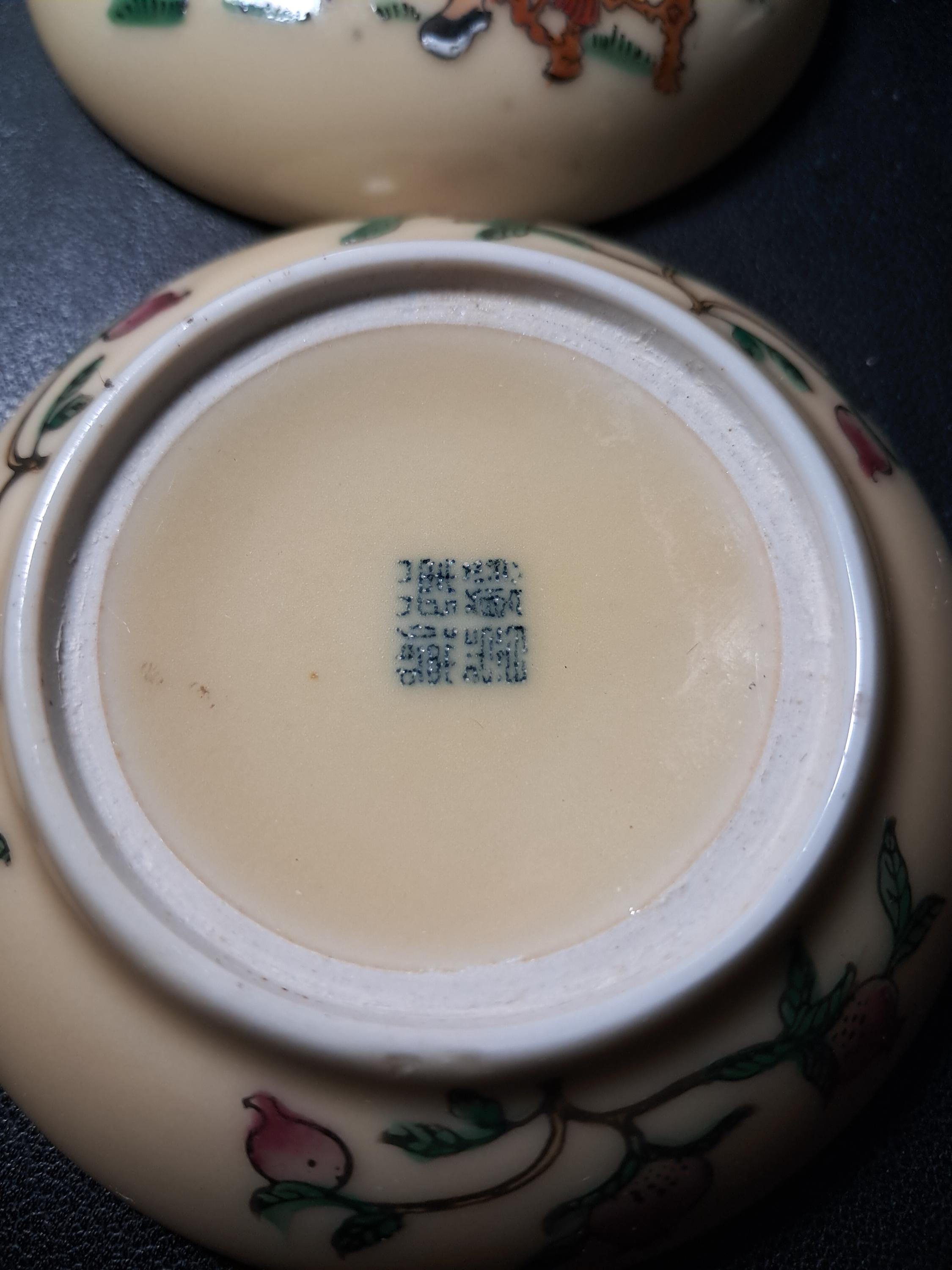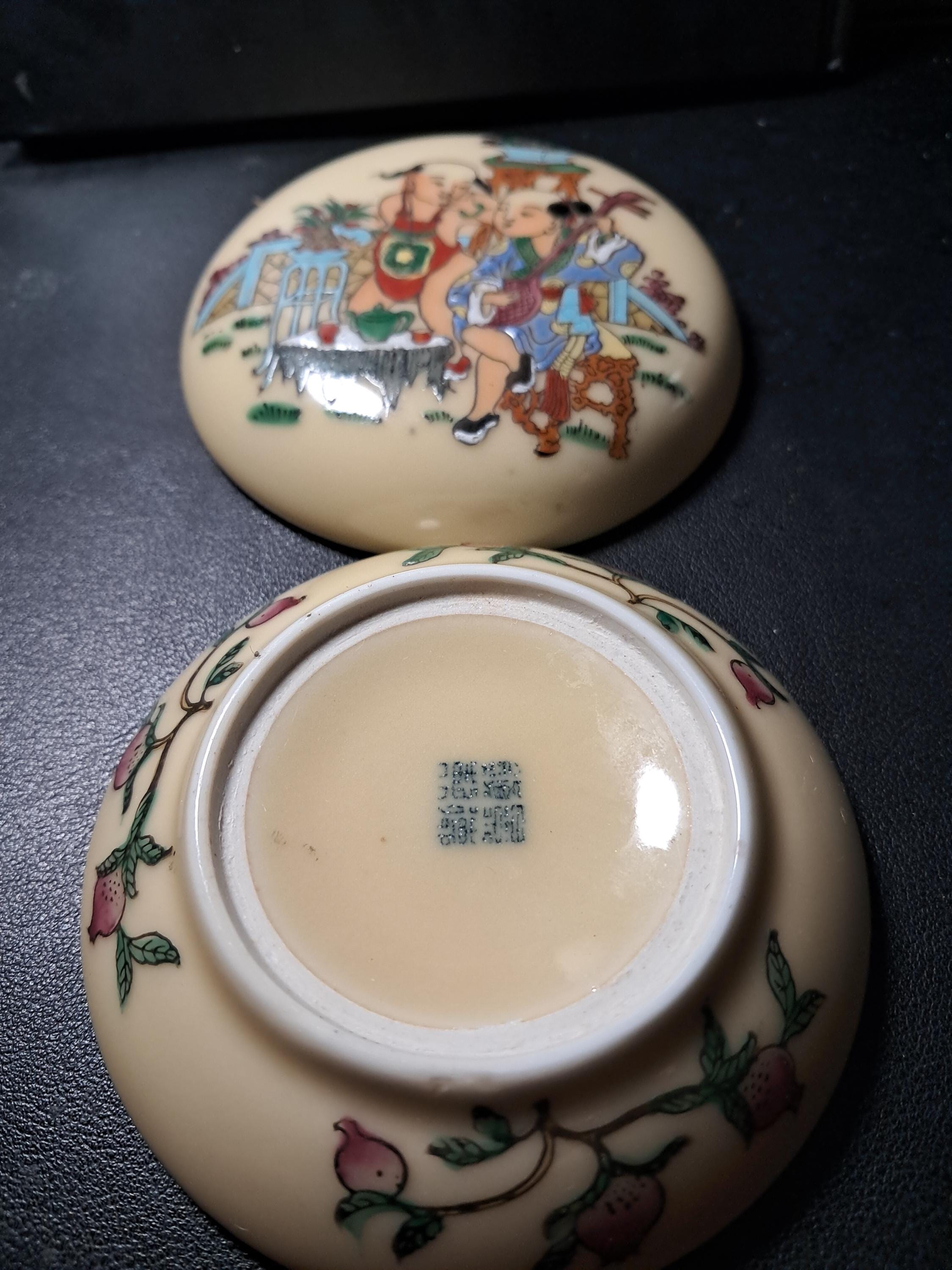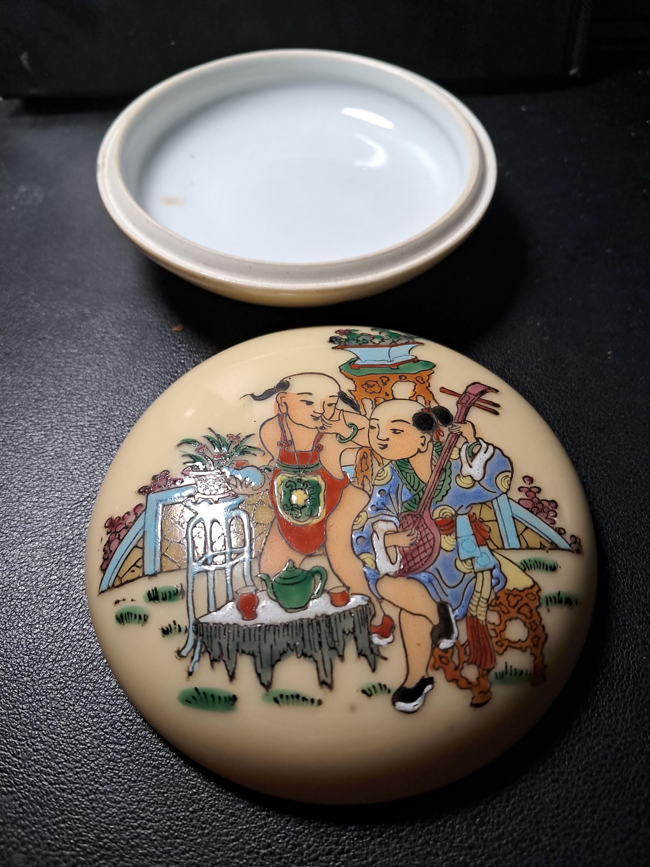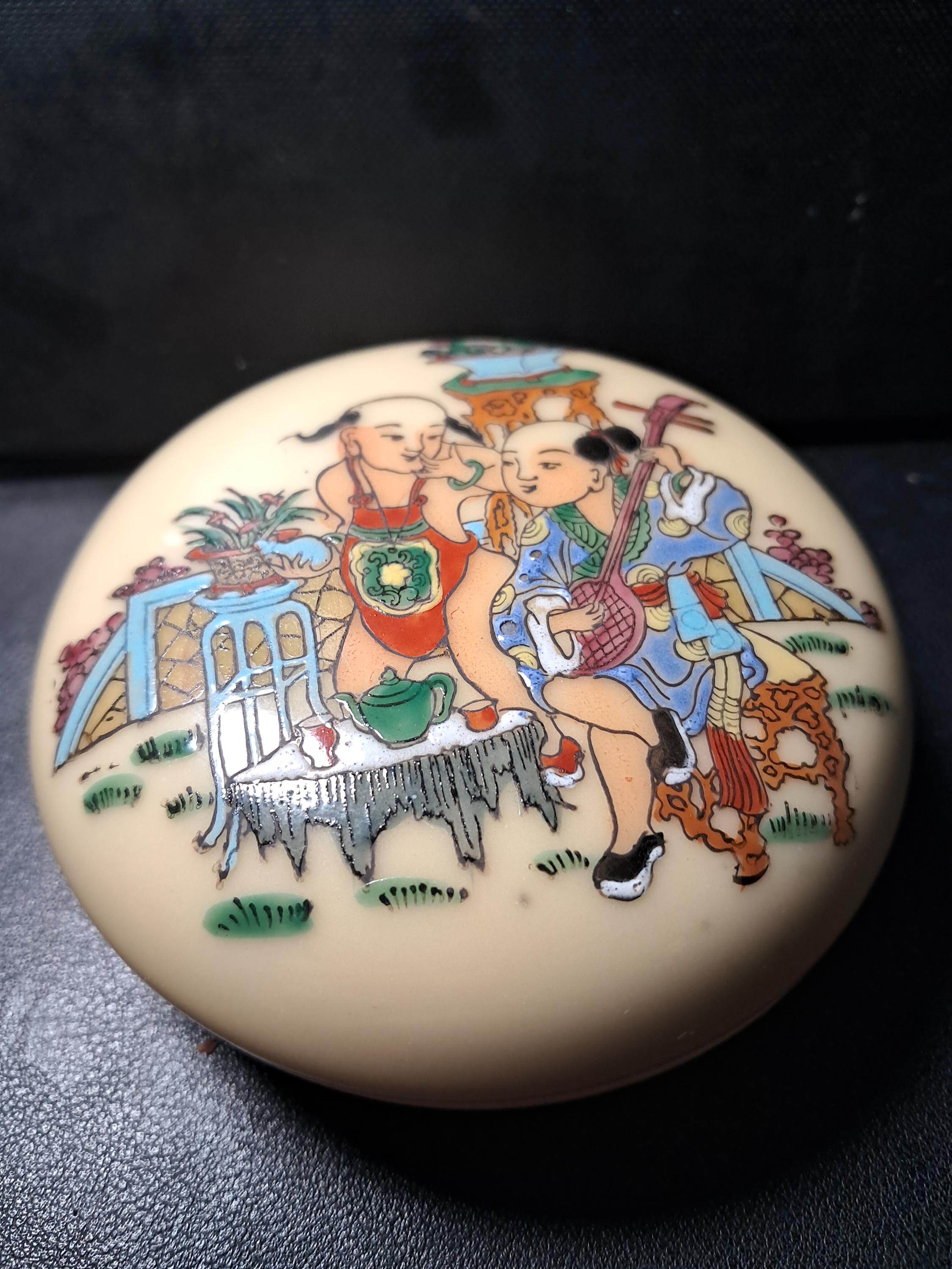 Chinese Famille Verte Seal Paste Box 3 3/4" Boy Play Banjo 50's Qing Style