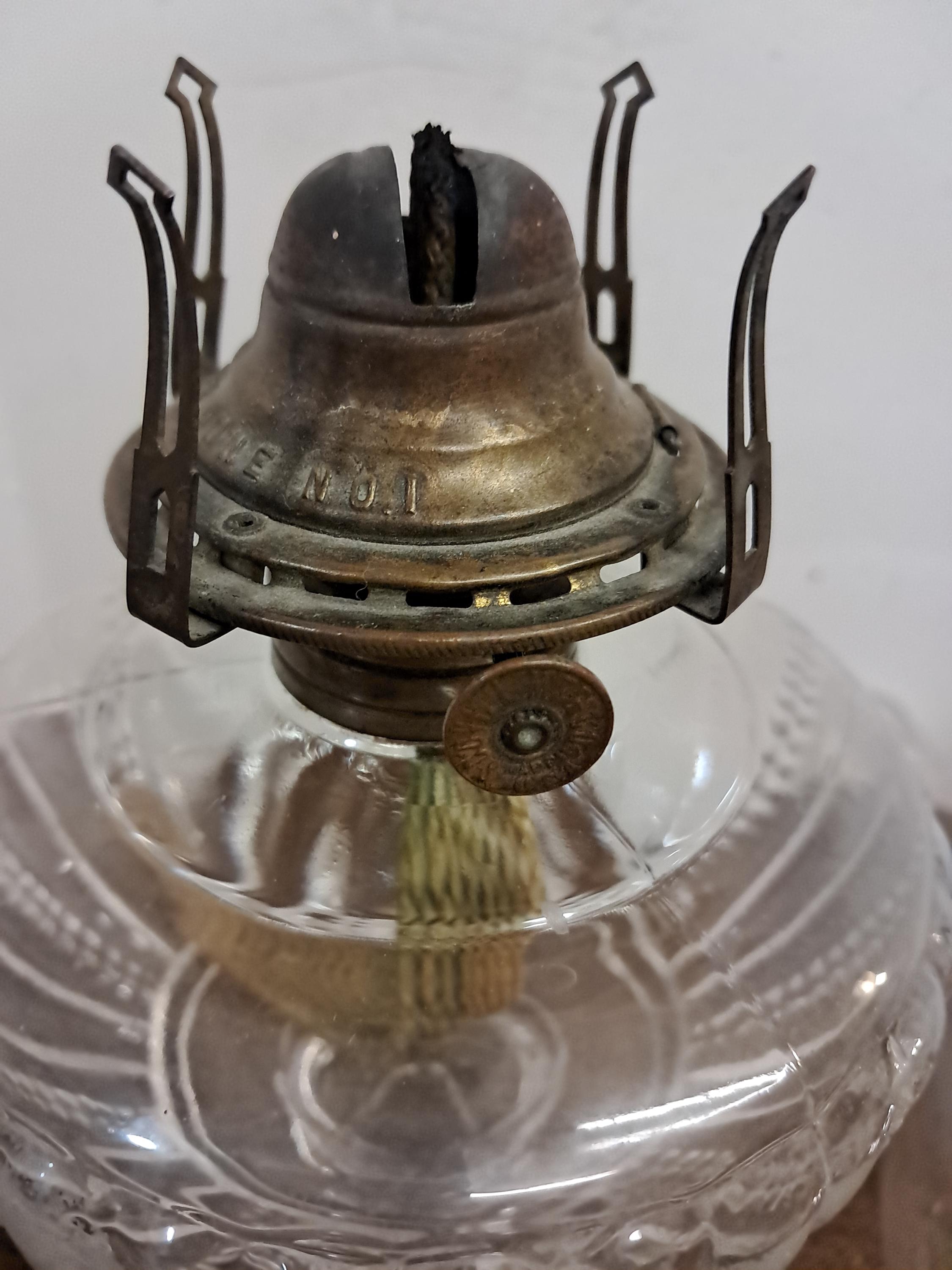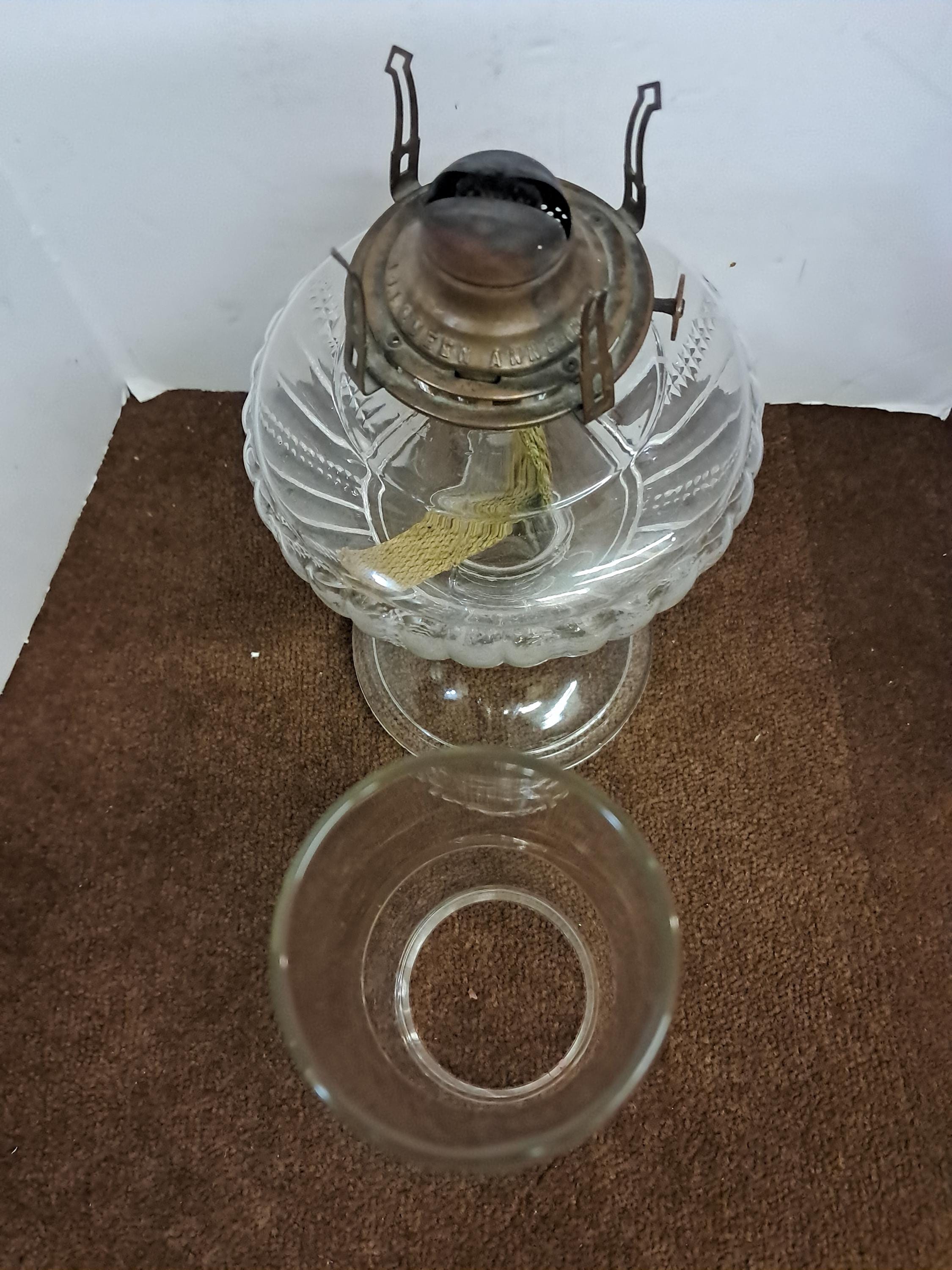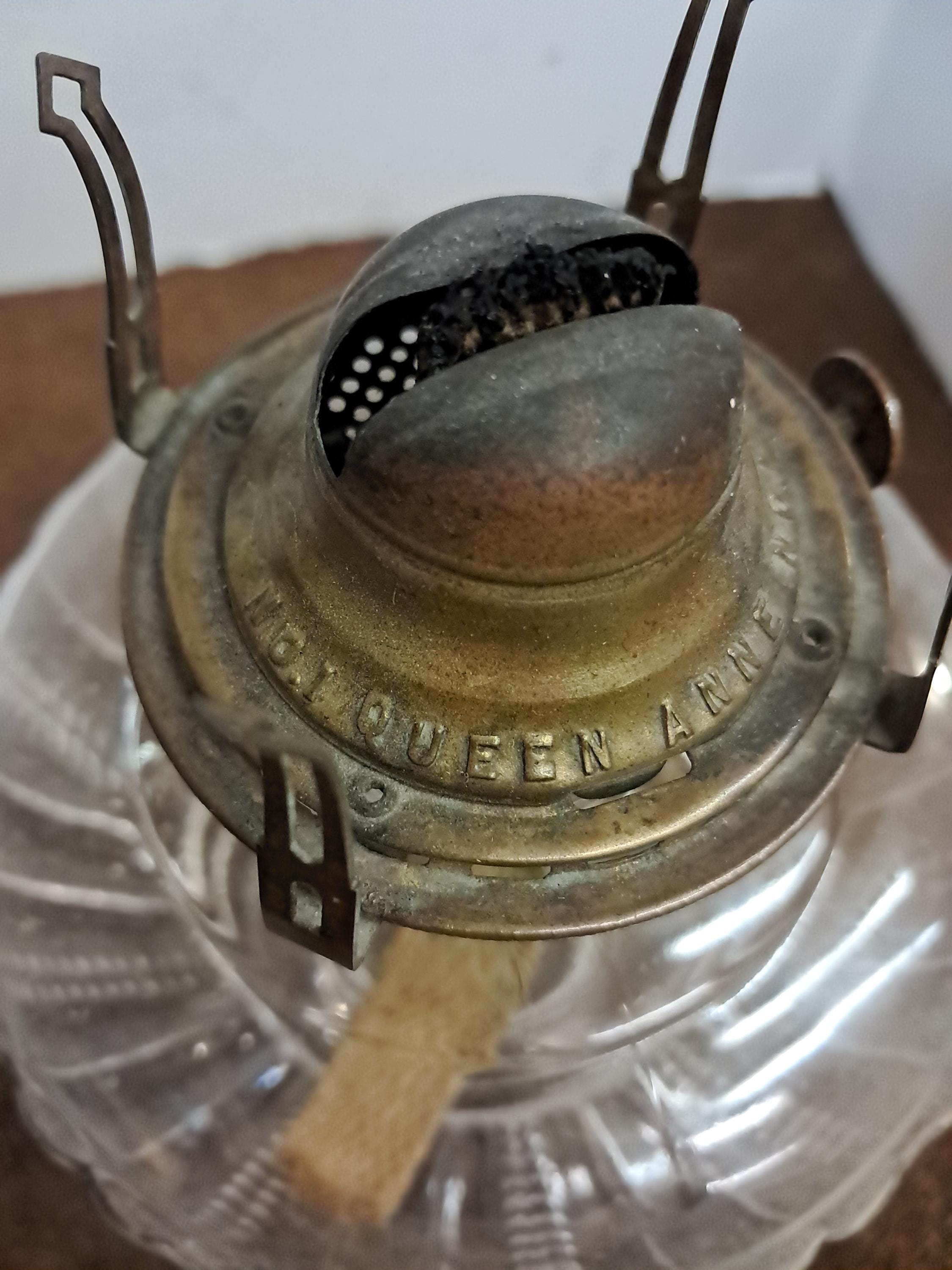 No. 1 Queen Anne No. 1 marked on burner with the number .1 just above the burner hinge. This vintage glass kerosene base need s NO tender loving care and a good cleaning, Just Kerosine to light it up .There are no chips or cracks and there is no lamp oil residue on the inside that will need to be removed for this lamp to truly shine. Measures 18.25 inches tall and is 5.5 inches across . Wick turns easily up and down...will need some assistance and cleaning to get the burner top to move up and down via the hinge.it will need some liquid wrench or something like that. As I said this will require little attention to bring it to its former glory.