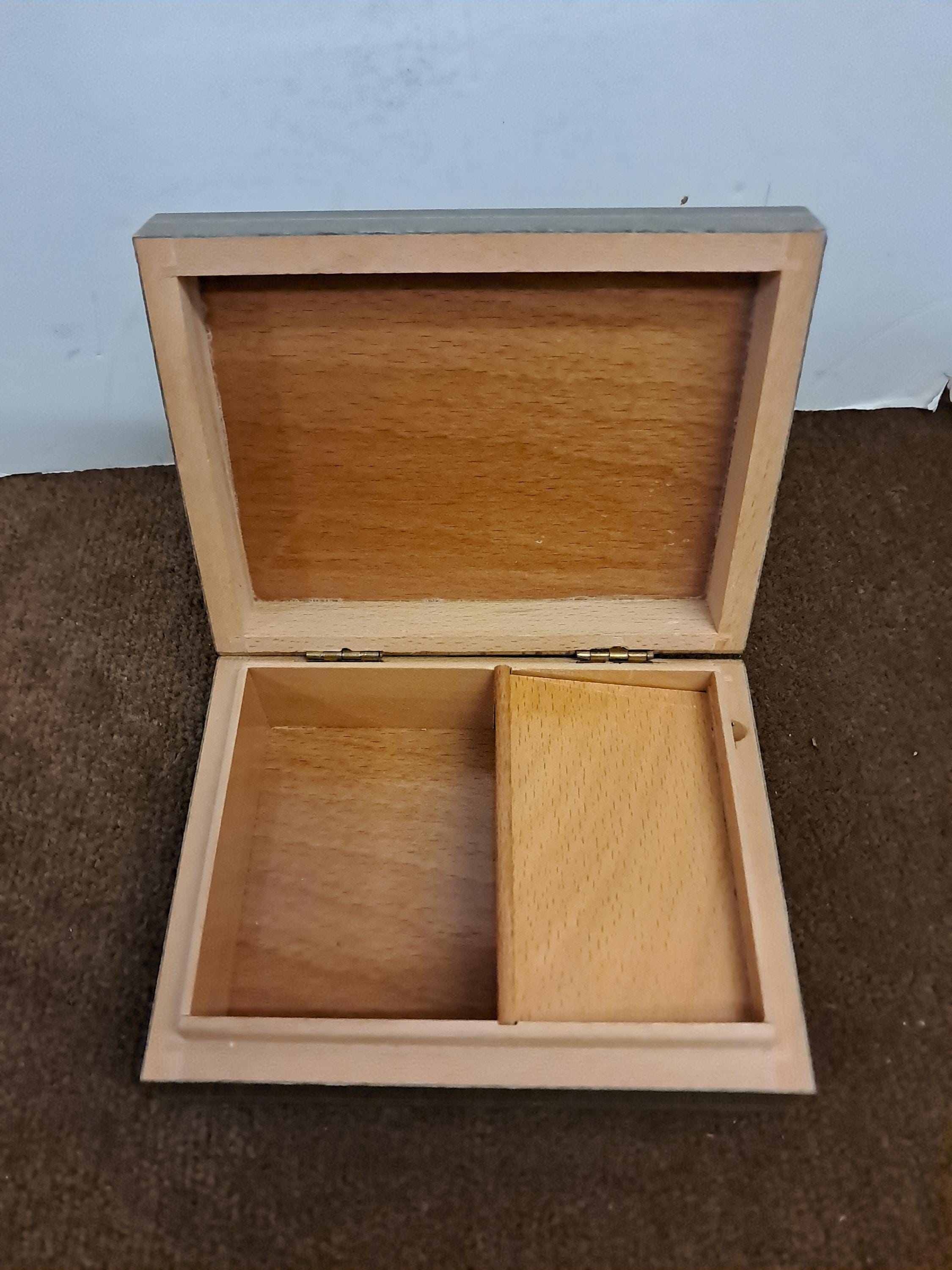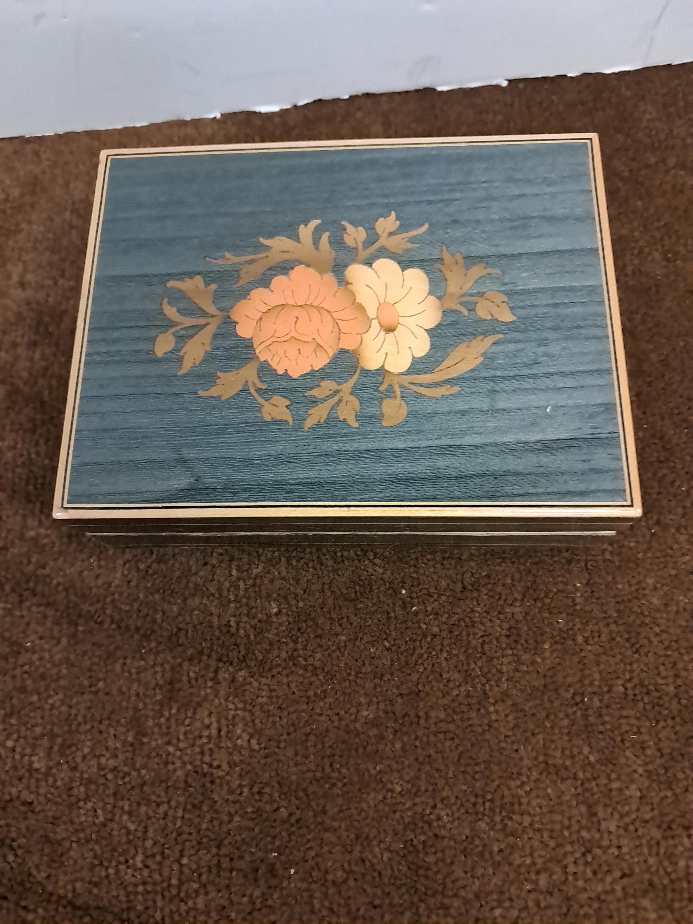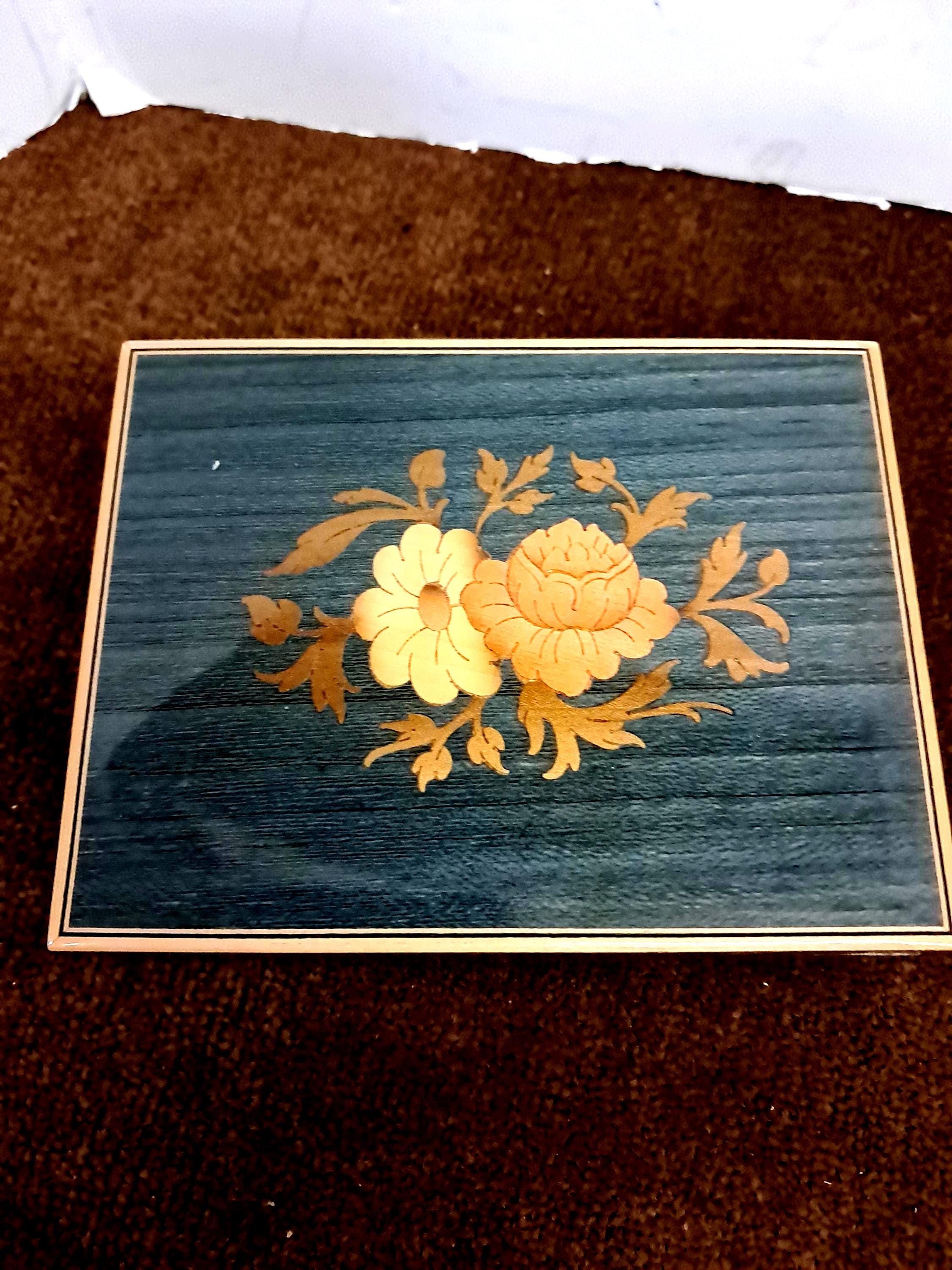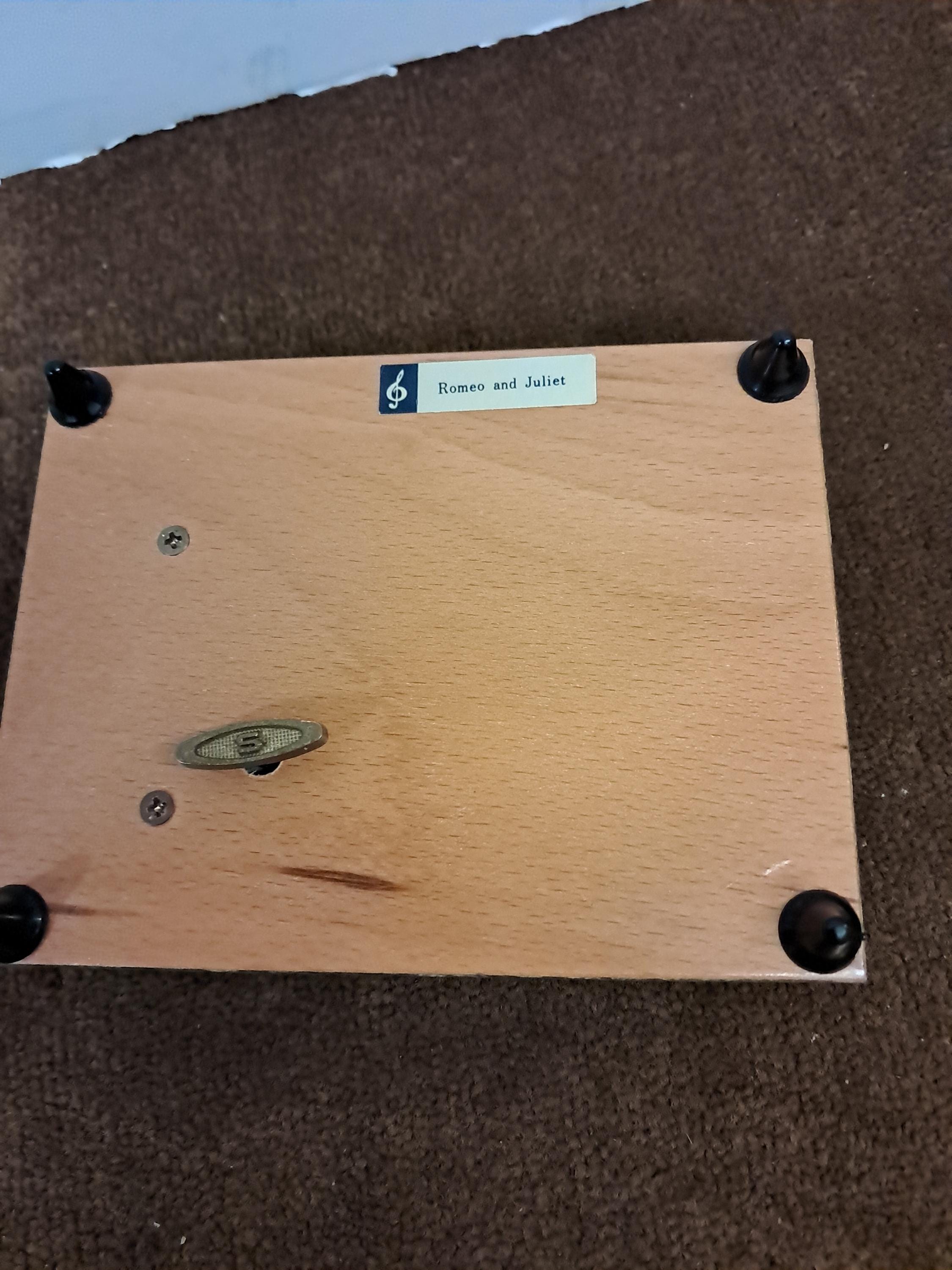 Italian Sorrento Inlaid wood Lacquered Music /Jewelry Box Very Good Vintage condition. Plays Romeo and JulietWell maintained5.75" wide x 4.5" tall x 2.25" deep Rouge Swiss Movement. Missing Rouge label