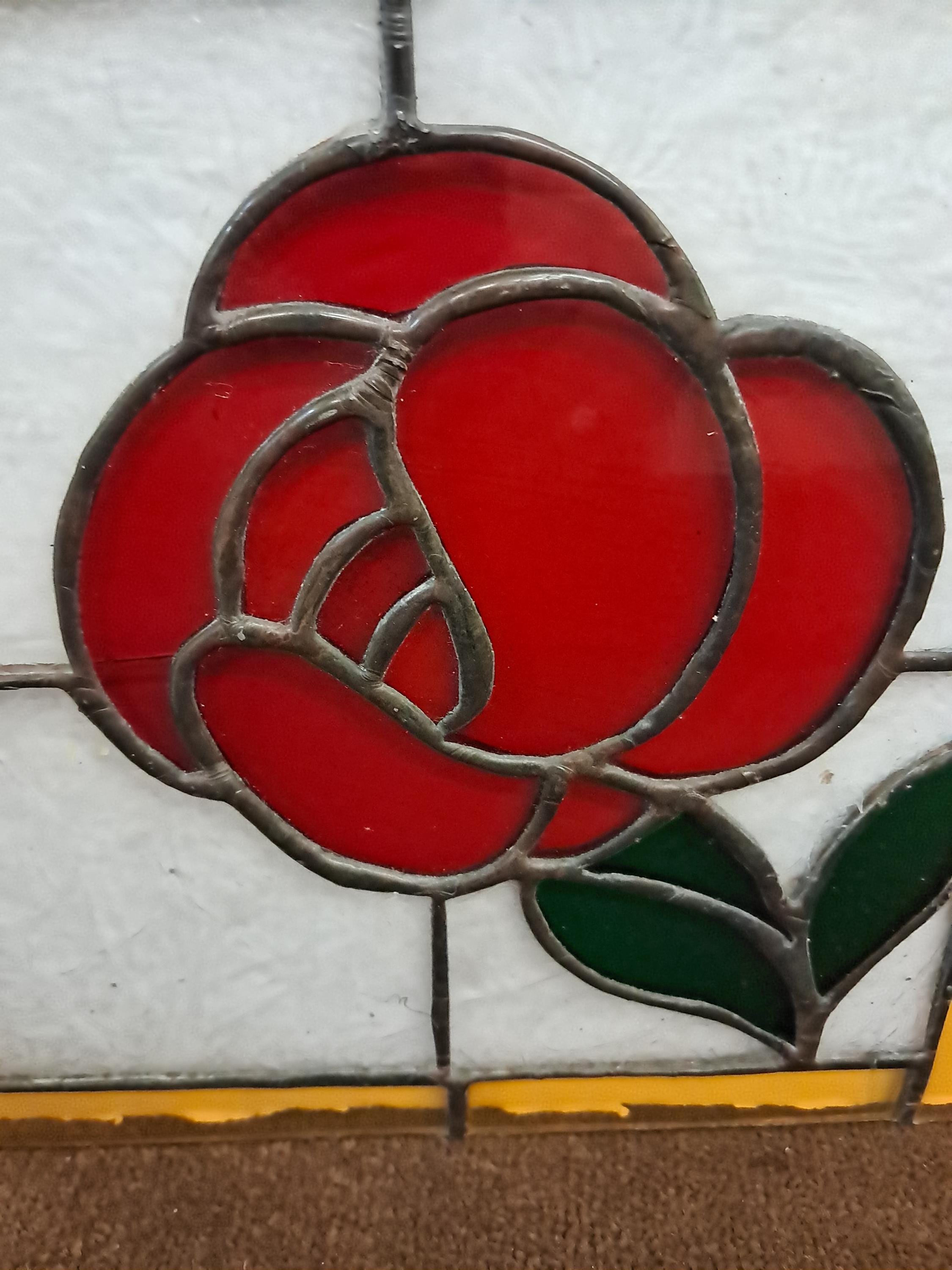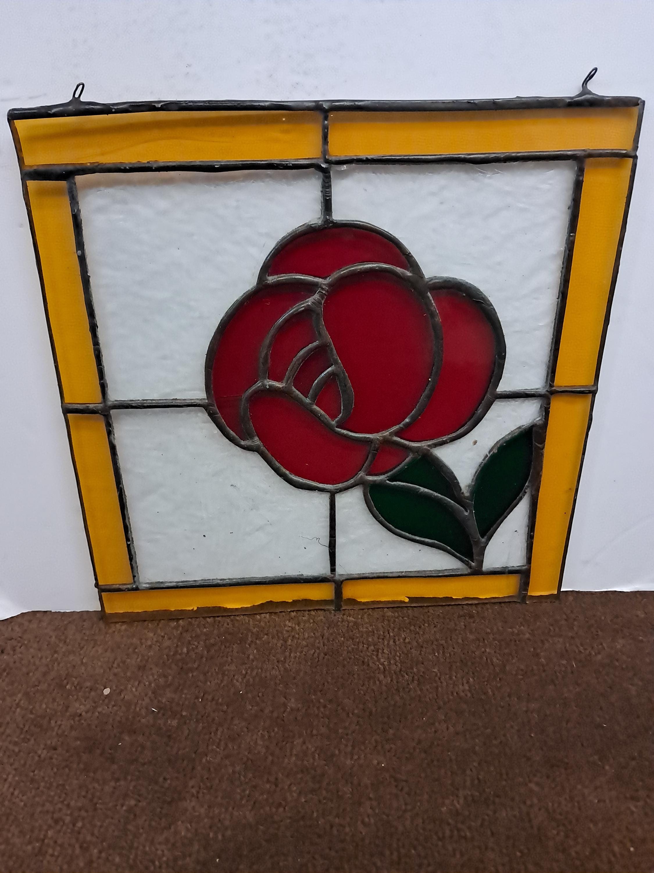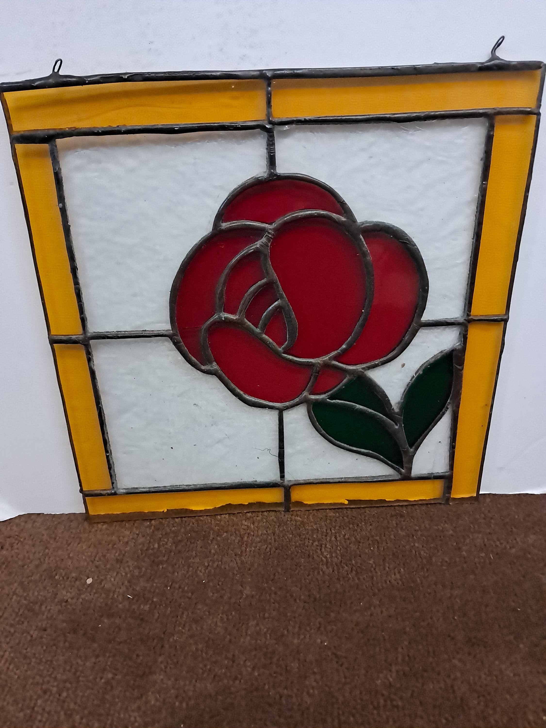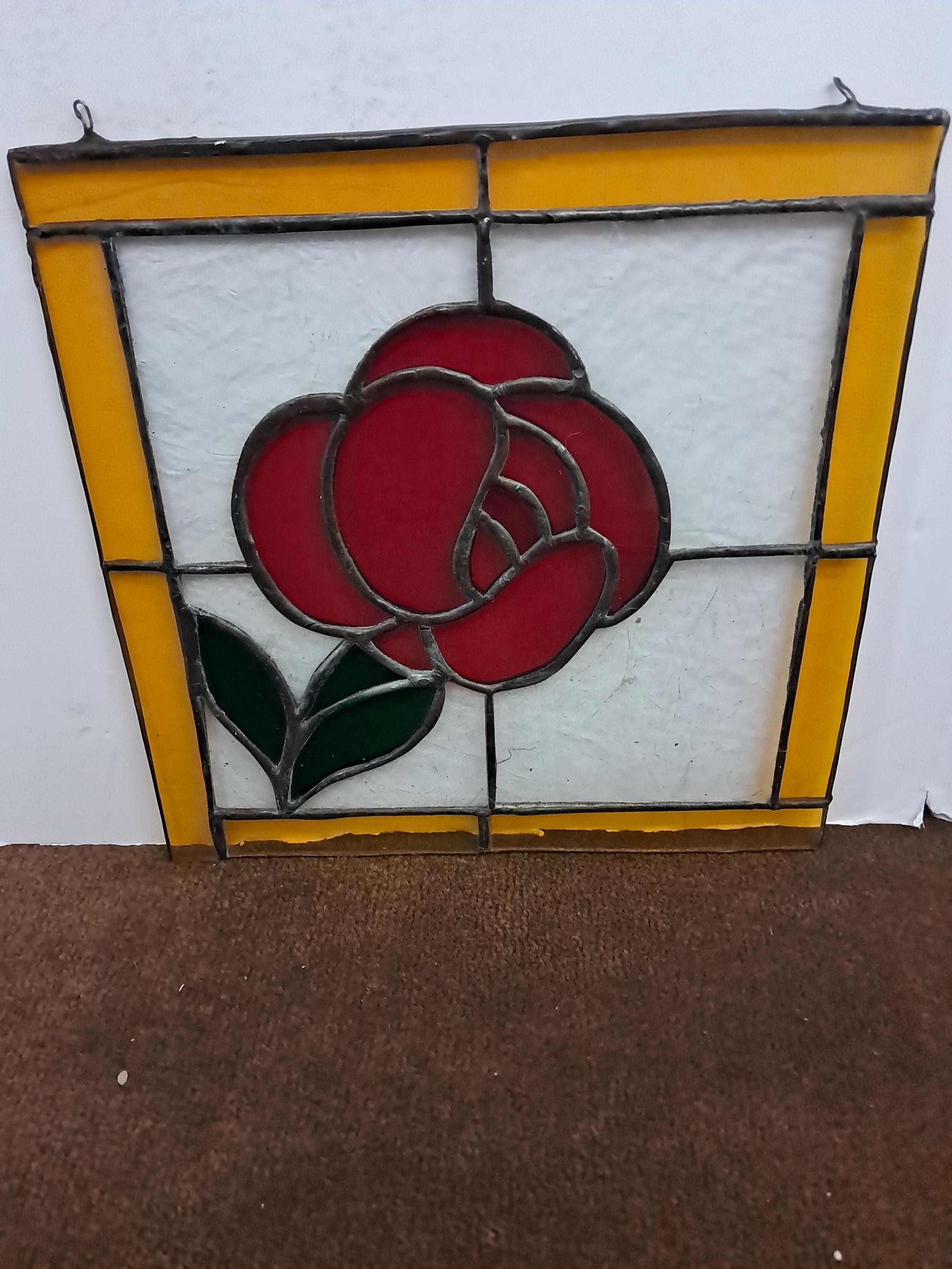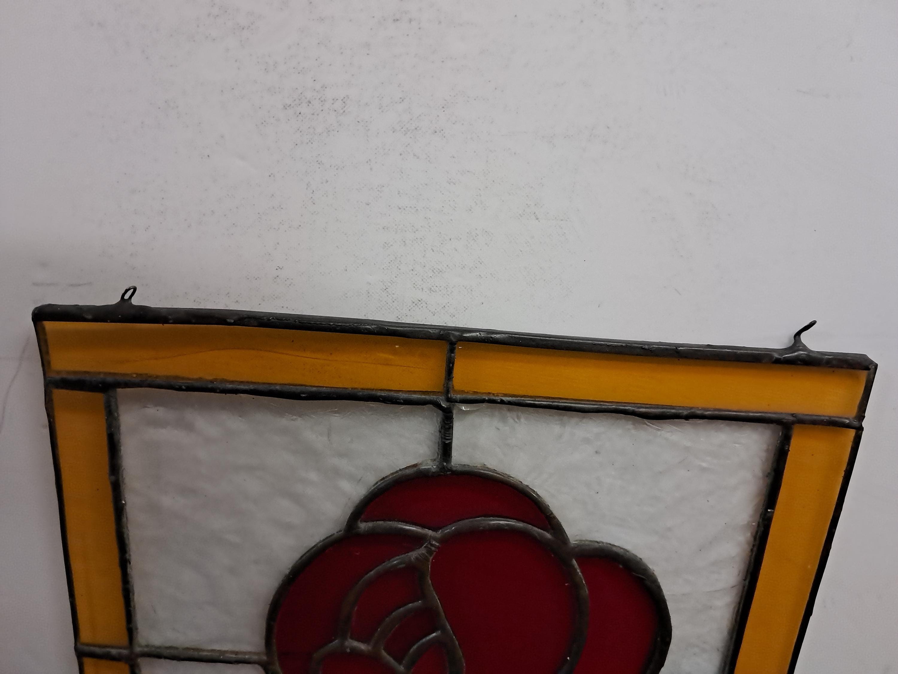 vintage Tiffany Style handmade Sun catcher Glass and metal are used to create this beautifully made collectible itemgreat condition with no damage just use string to hang itmeasure s. 8 x8 x .125 in.