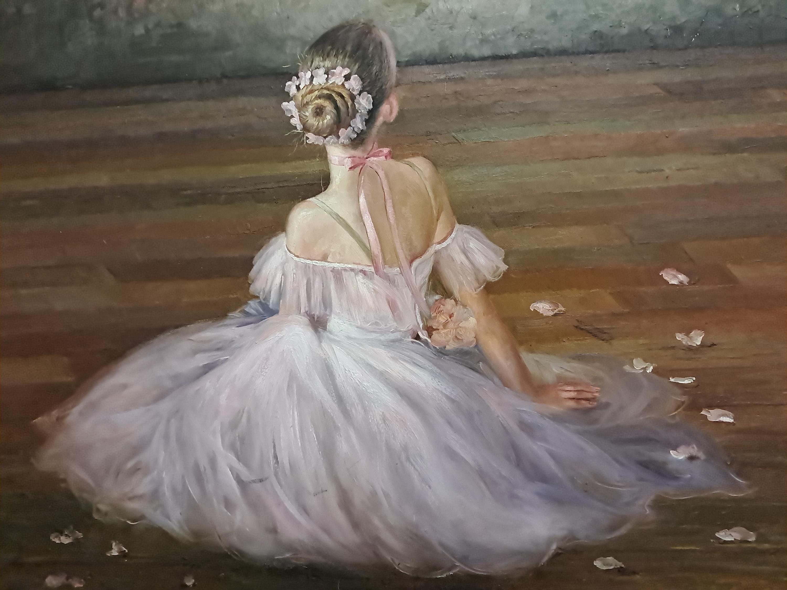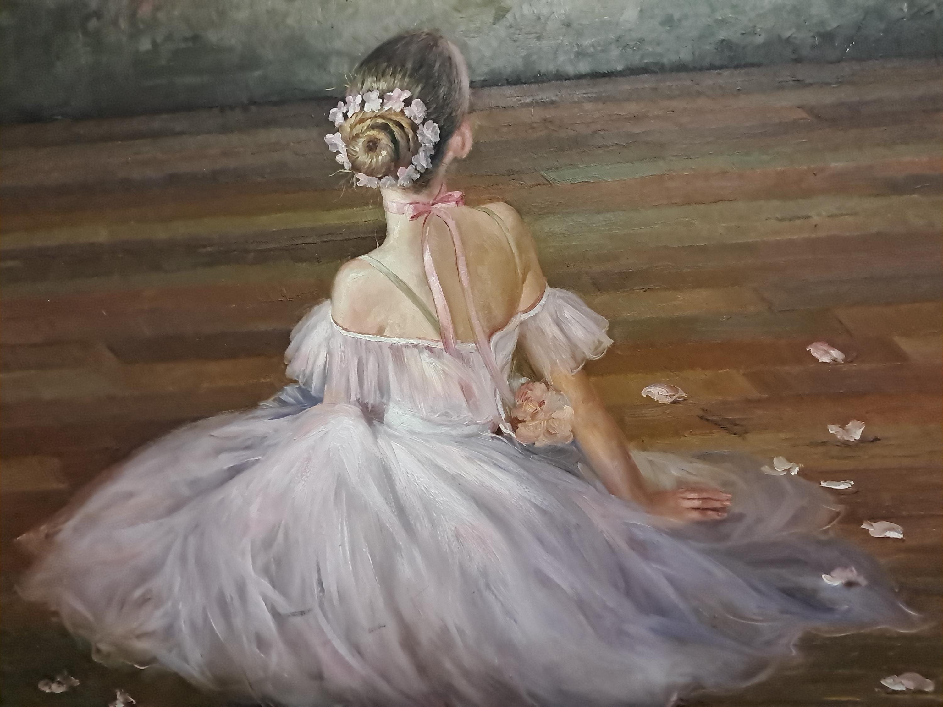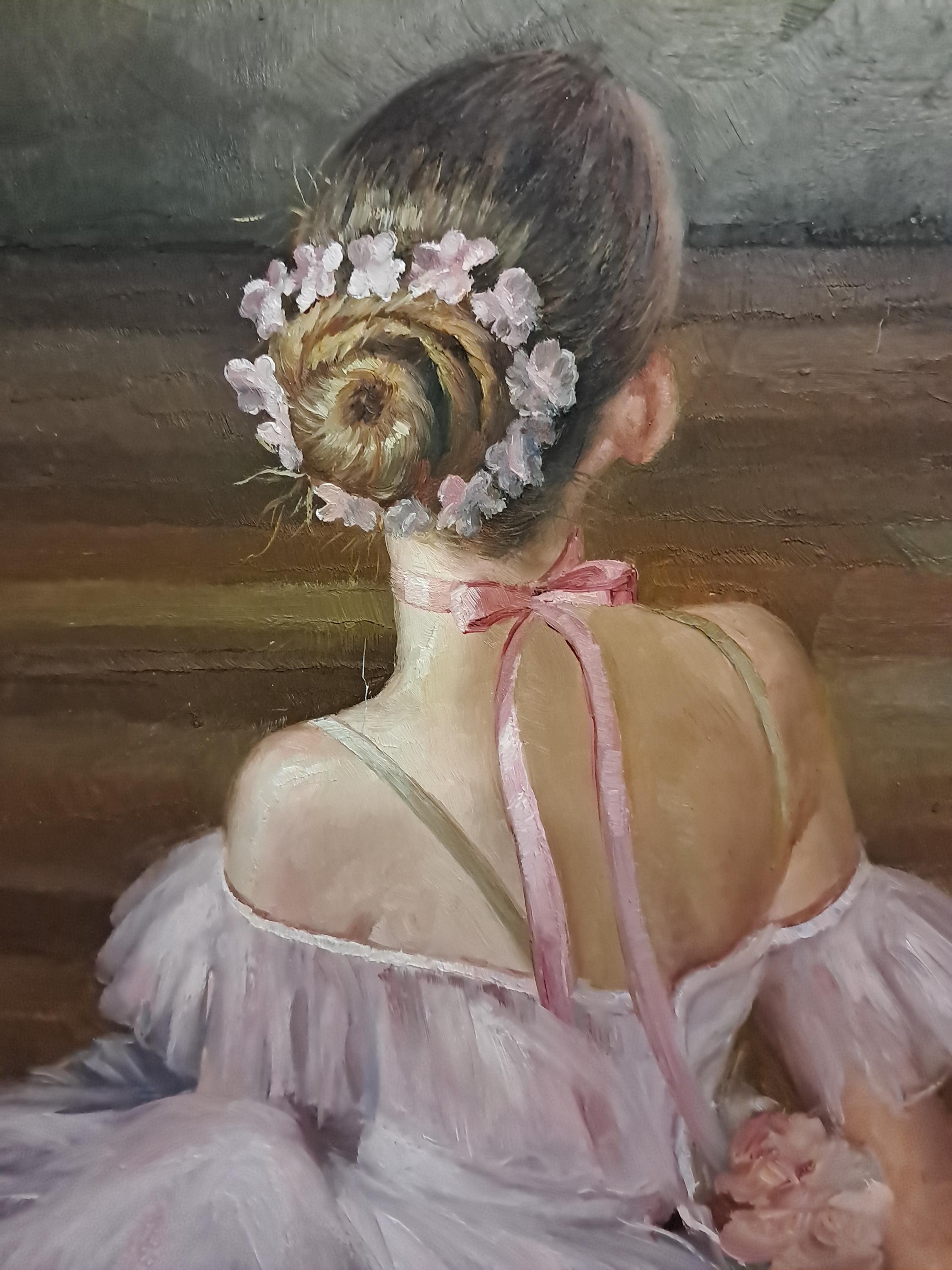 A young ballerina Siting on the floor with her back showing. Her elegant posture quietly maintains the potential strength for a moment out there. Perhaps the painter was deeply moved by this moment, and depicting an unfamiliar beauty by this angle, and left so much imaginations.