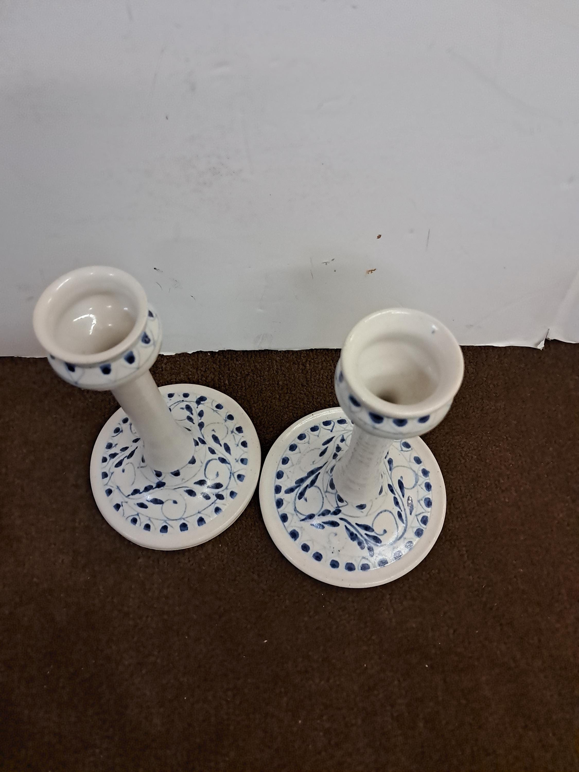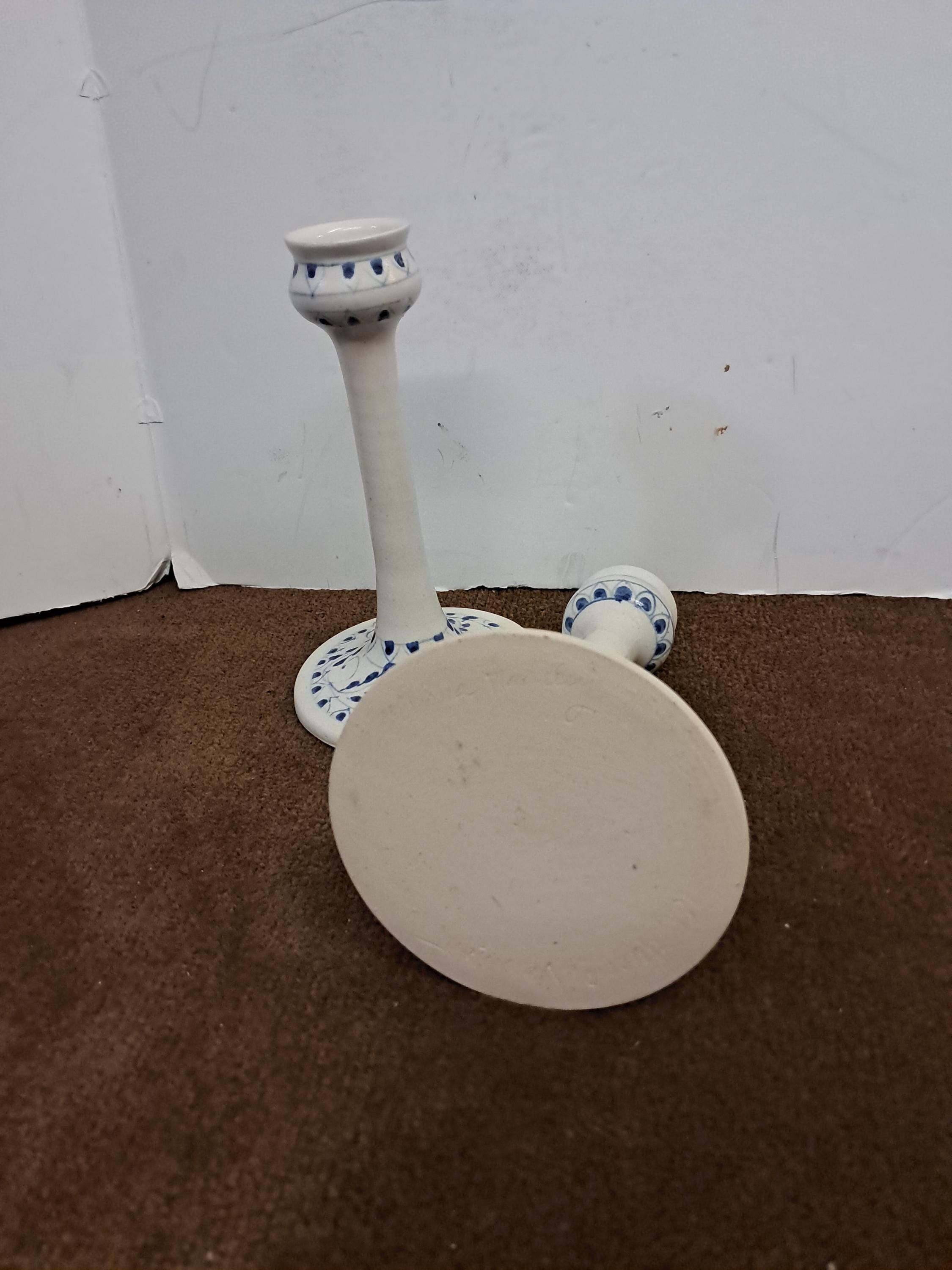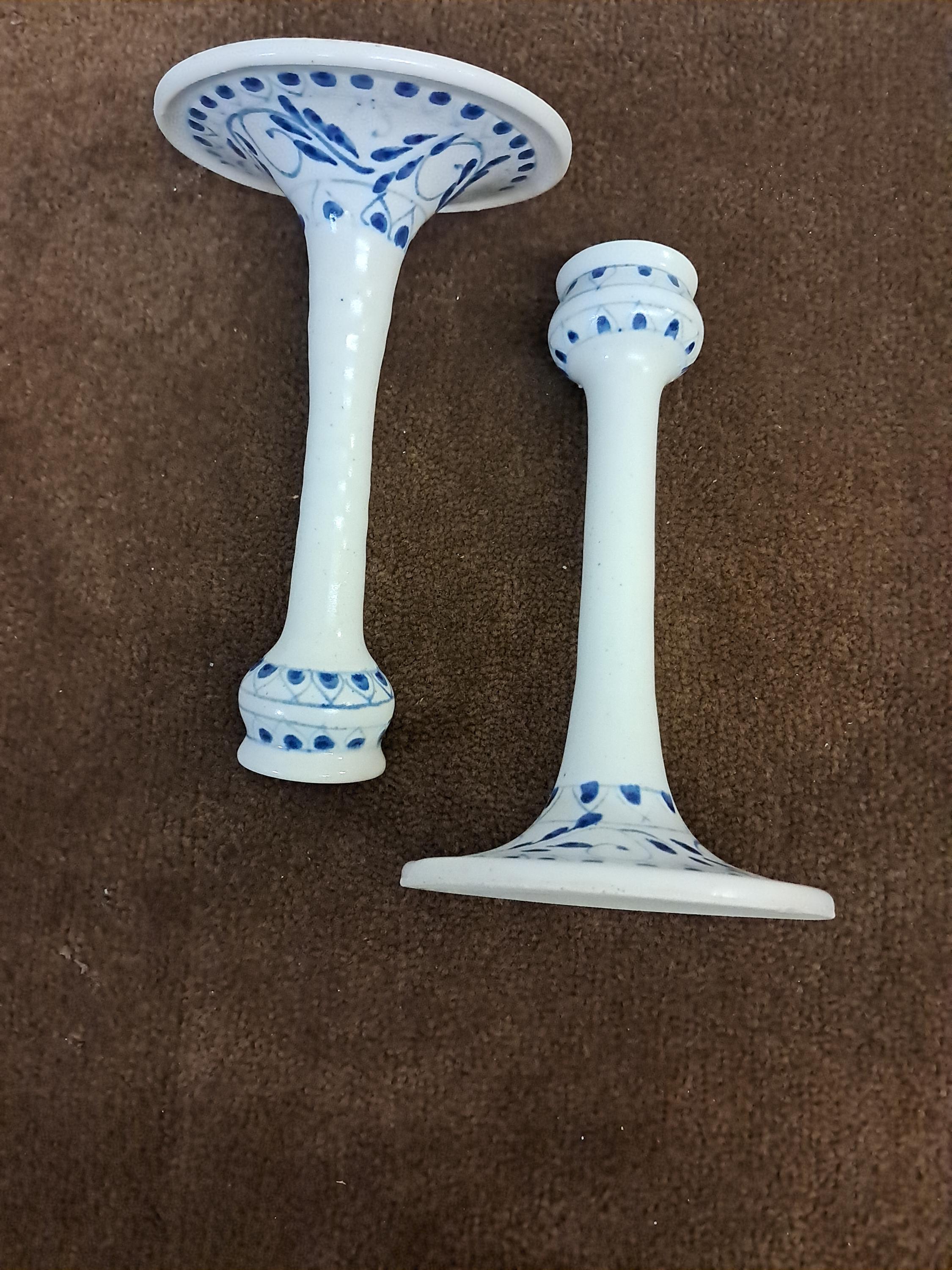 Blue white ceramic candlestick vintage ceramic Anna Fedeley Brattleboro Vt made candlesticks