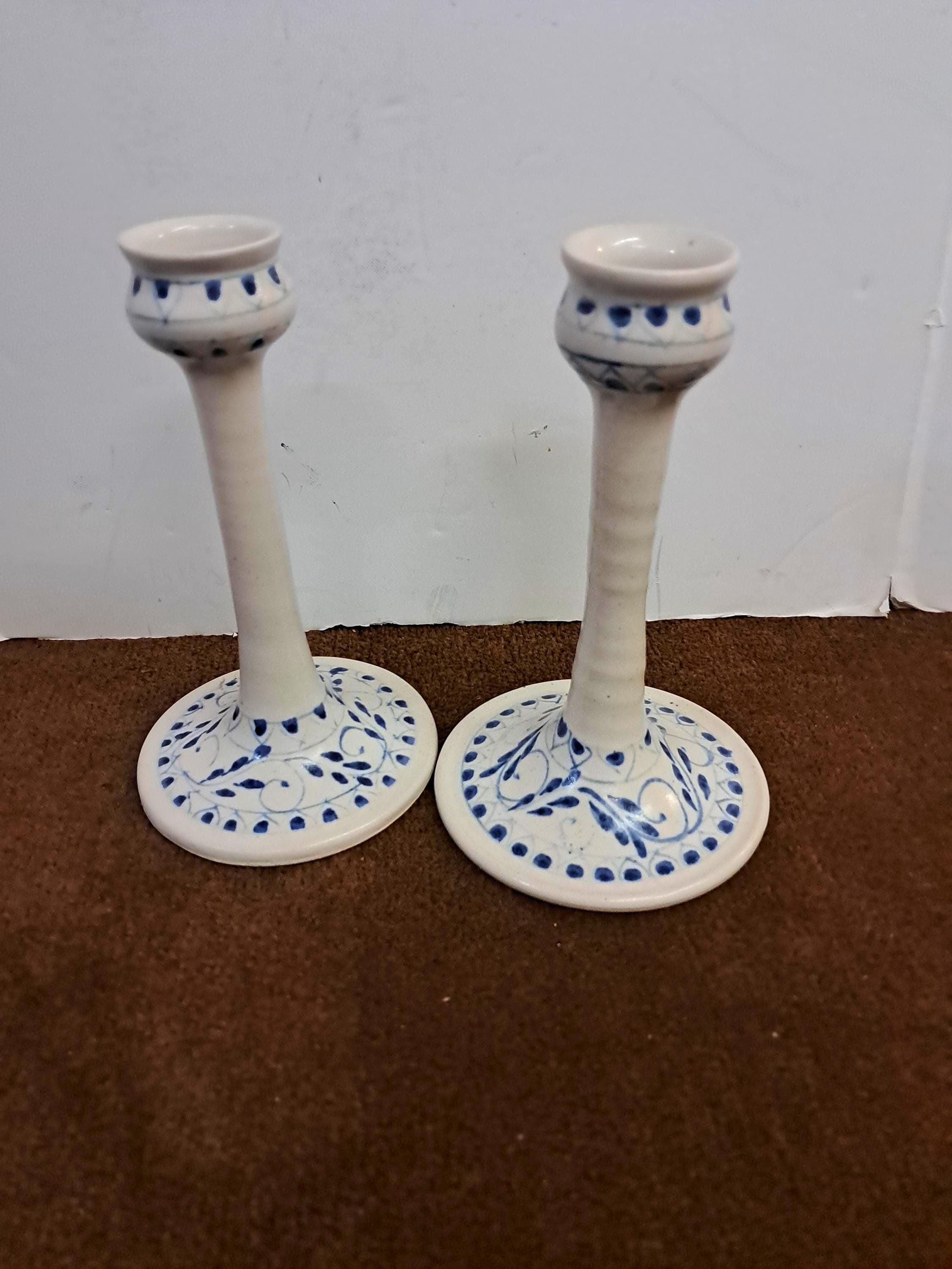 This is for 2~Anna Fadeley Pottery Stoneware Candlestick Candle Holders Brattleboro Vermont colored in Blue on White in very good condition showing only a small nick at the bottom.