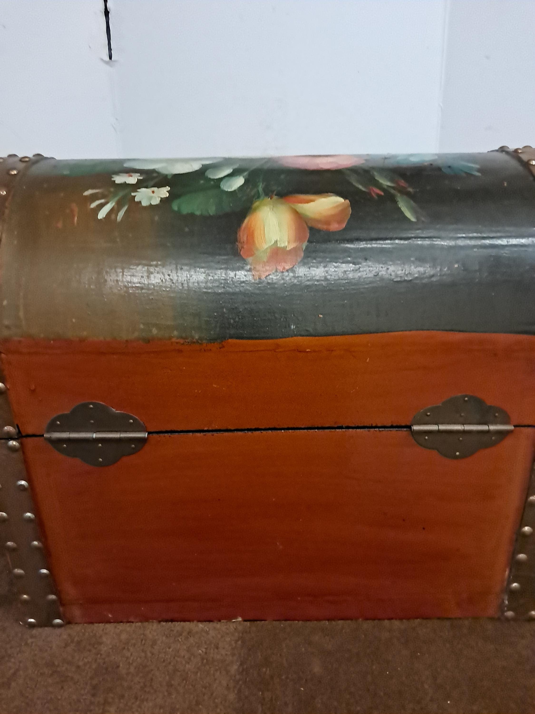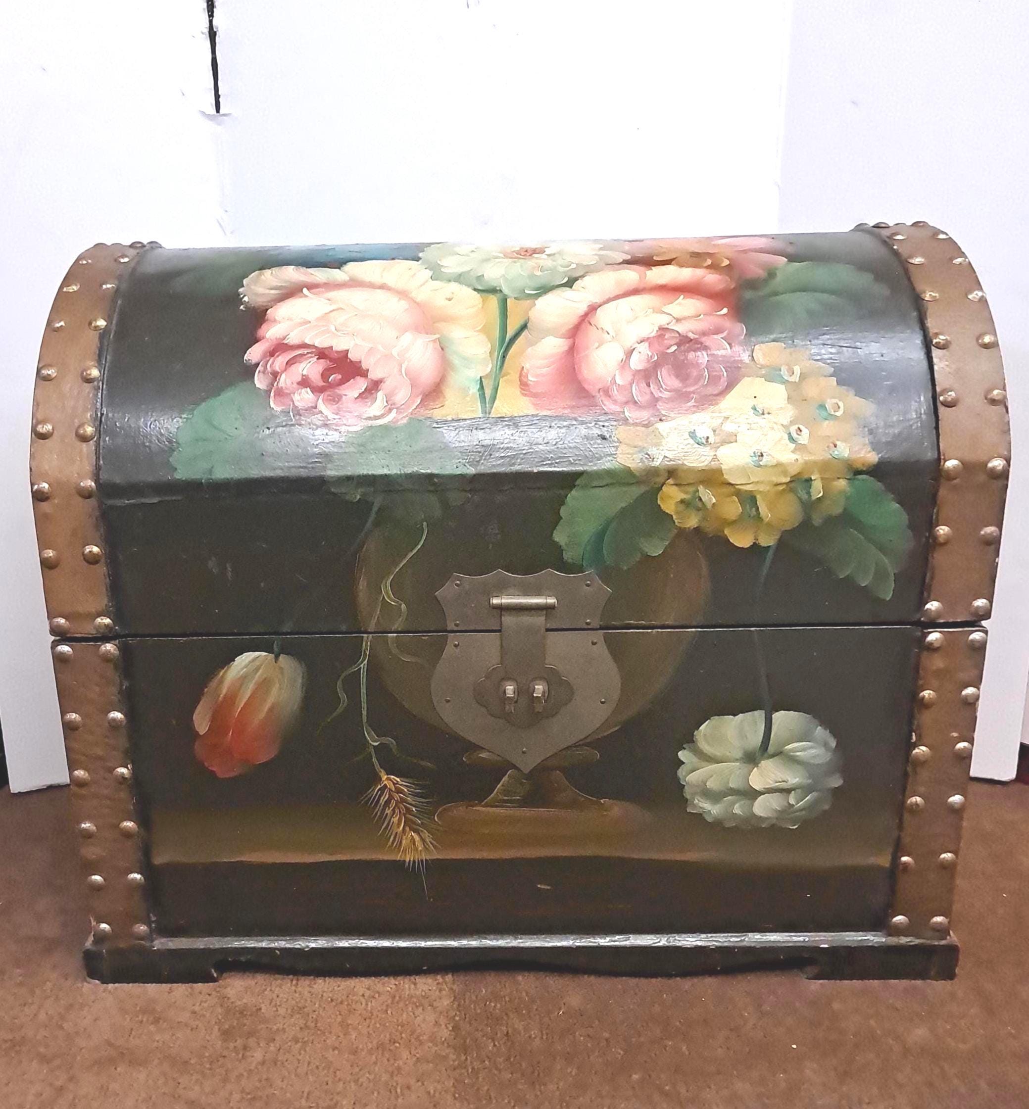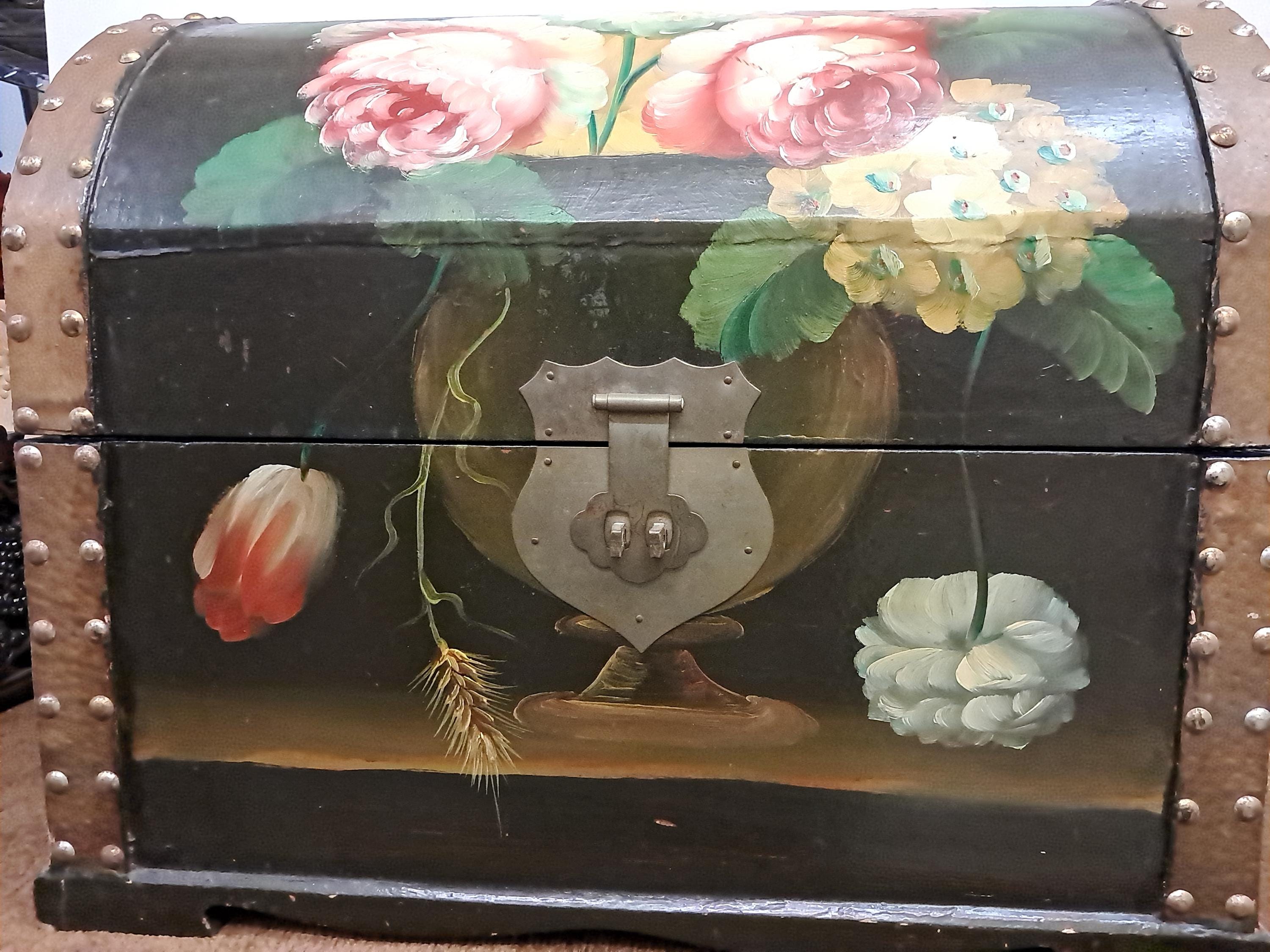 Wonderful vintage hand painted wooden fruits hope treasure chest storage box. Love this piece! Wooden treasure chest hand painted with a beautiful fruit design. Very ornate studded accents on all sides. Handles and original lock on front.