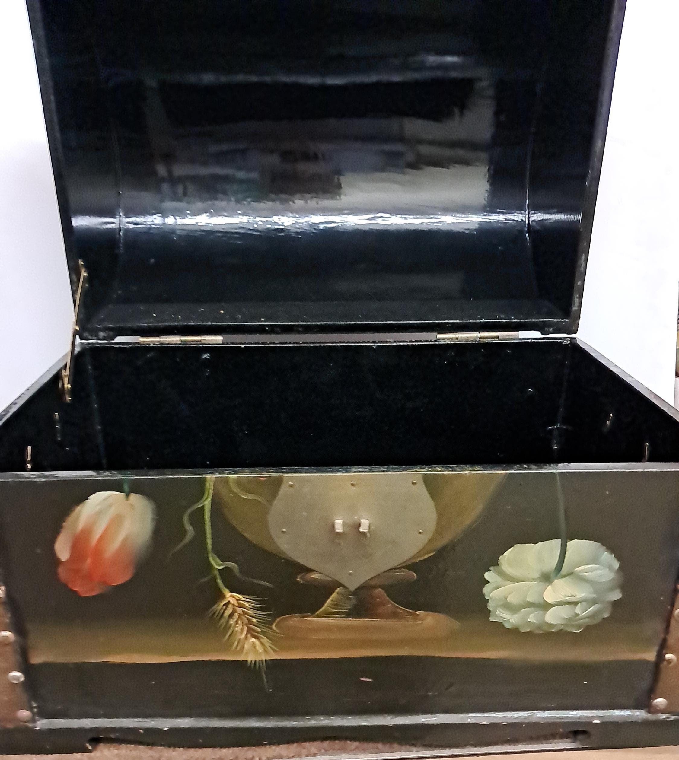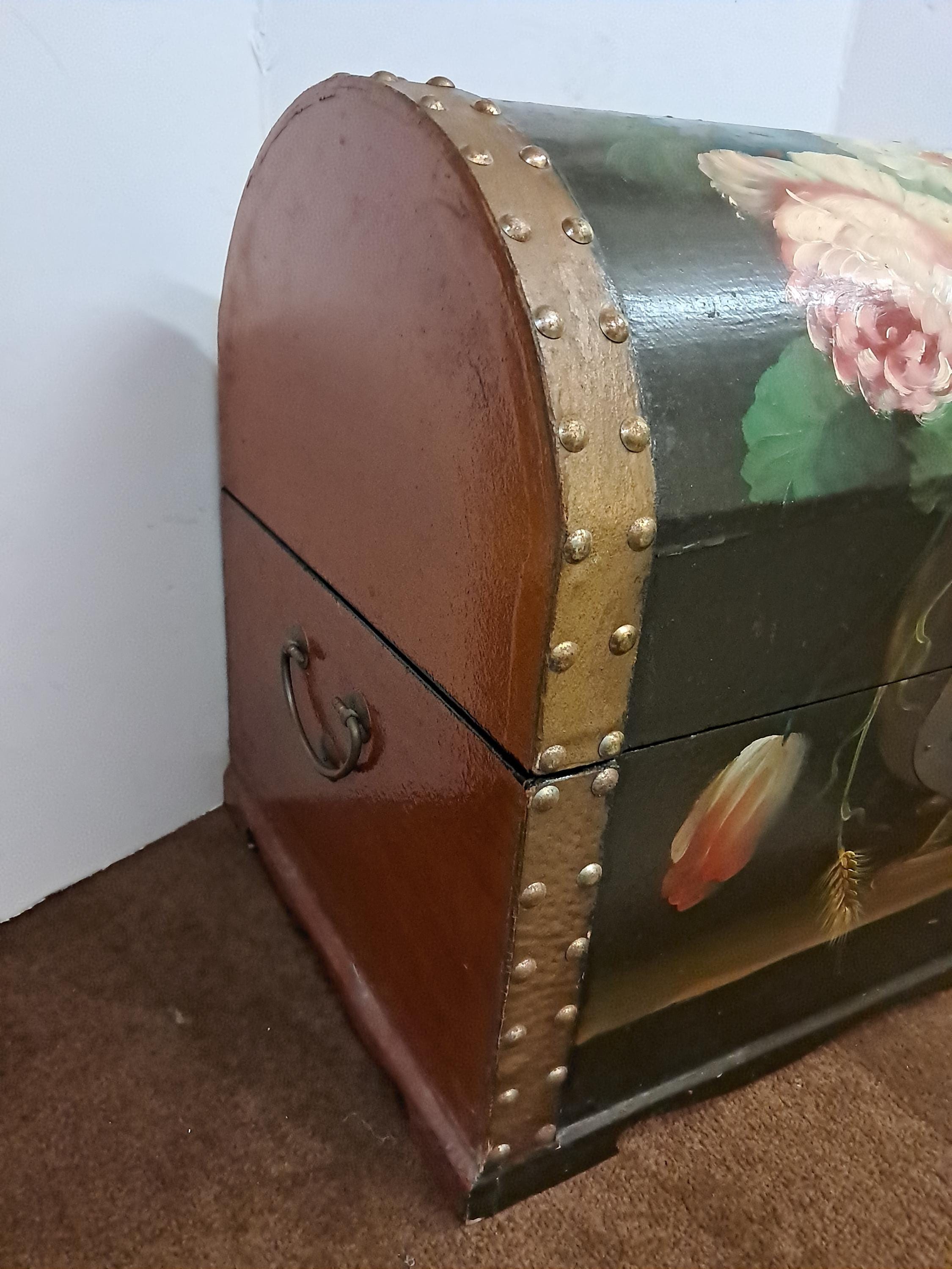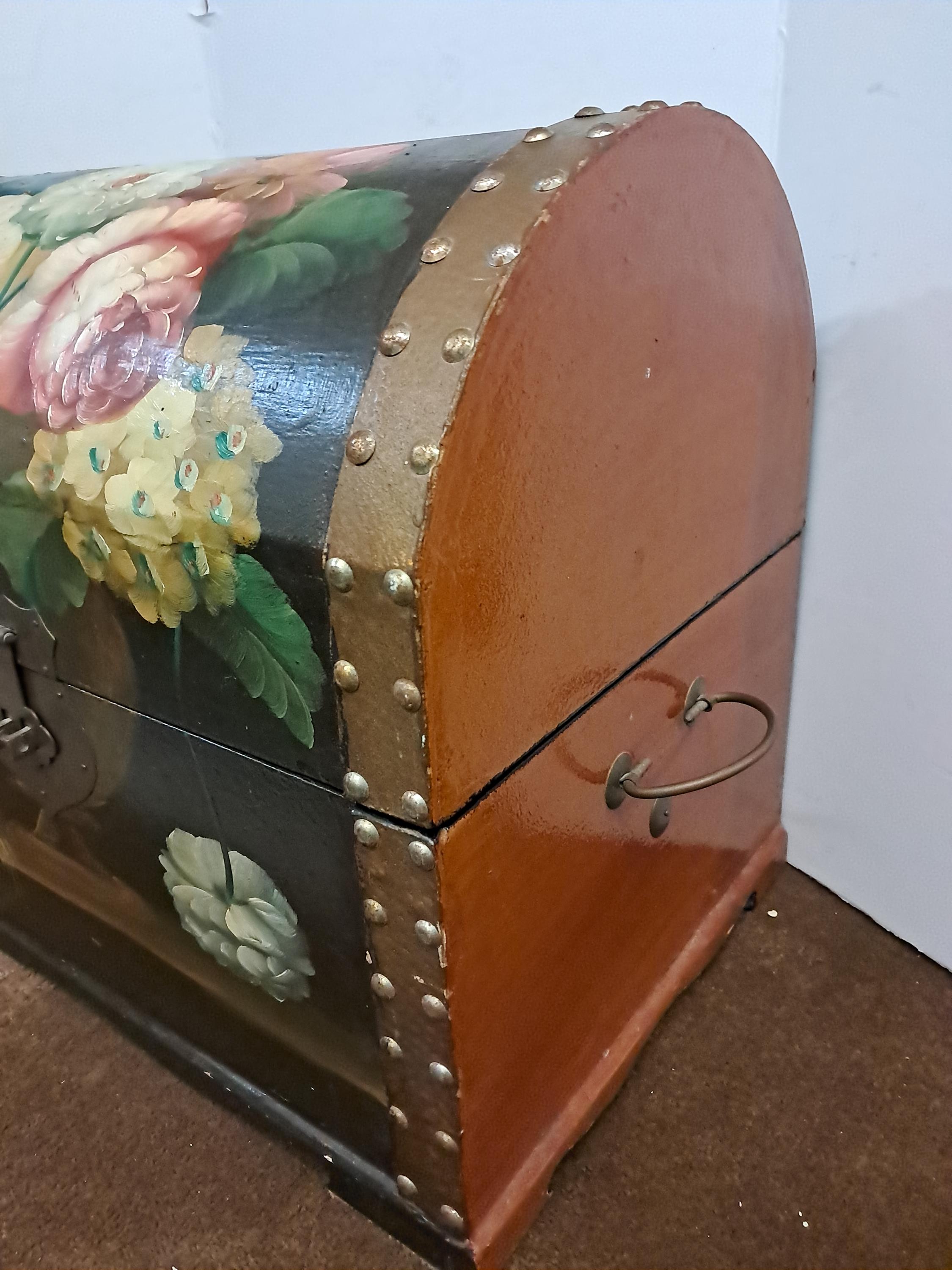 Wonderful vintage hand painted wooden fruits hope treasure chest storage box. Love this piece! Wooden treasure chest hand painted with a beautiful fruit design. Very ornate studded accents on all sides. Handles and original lock on front.