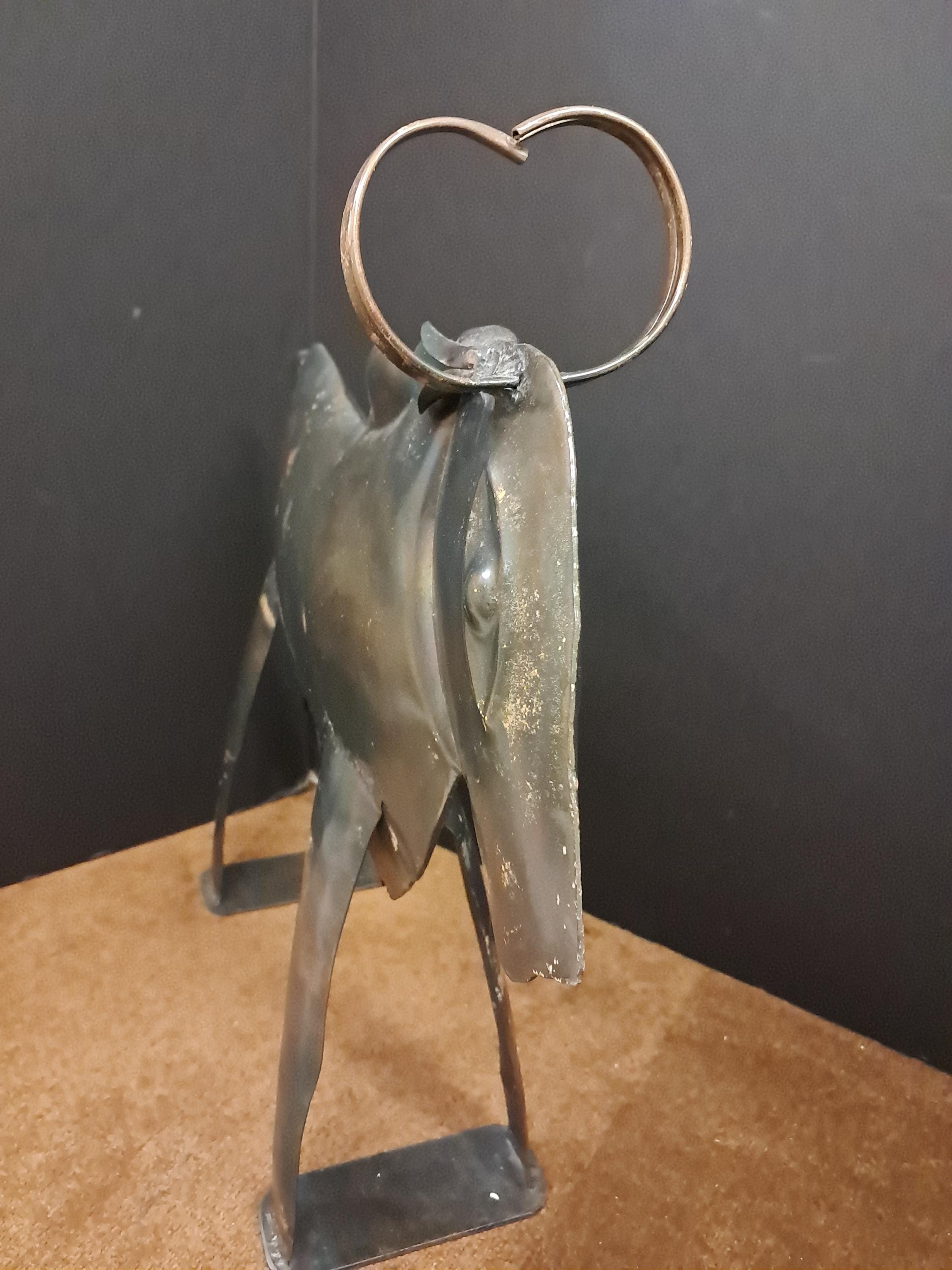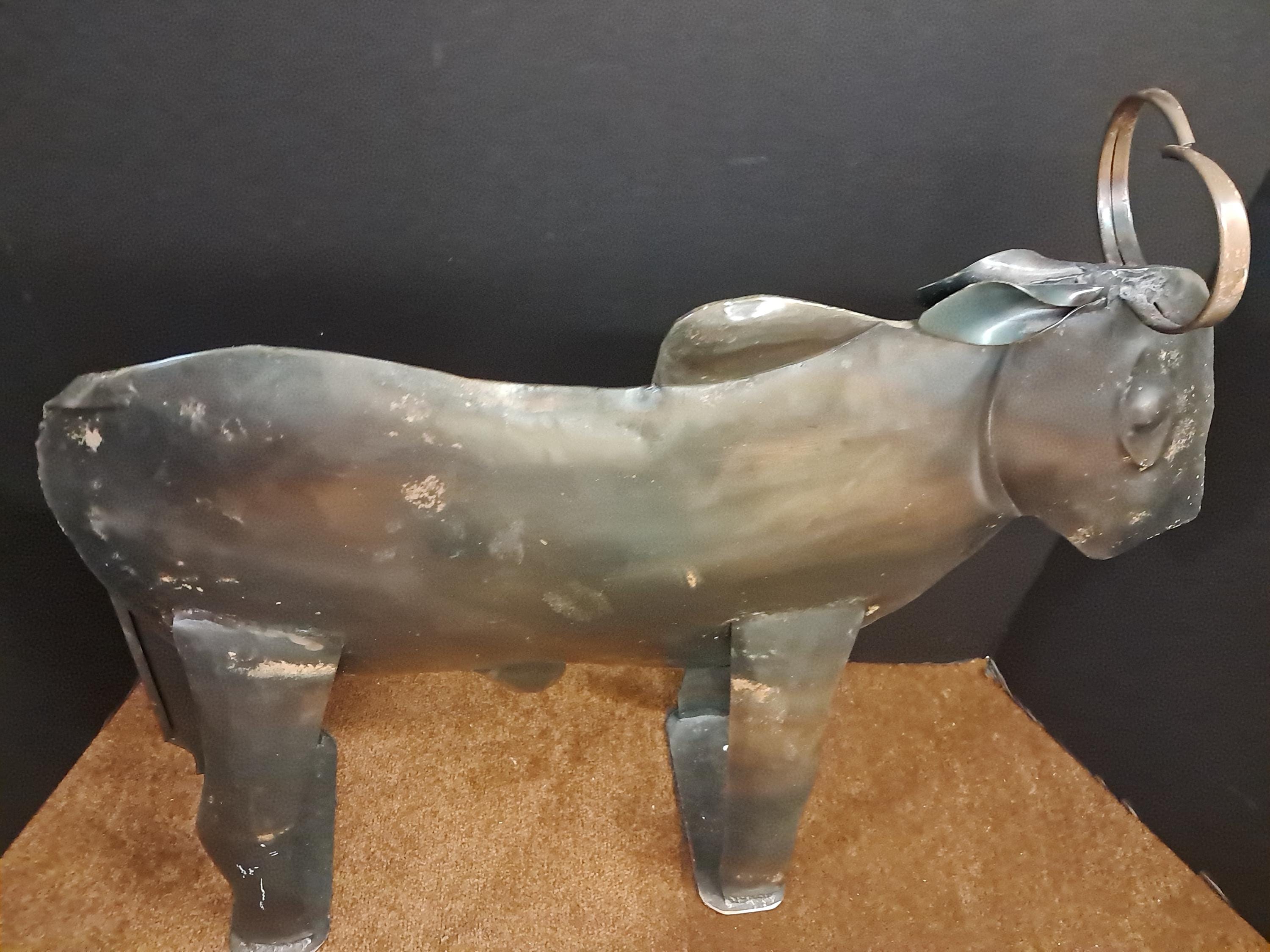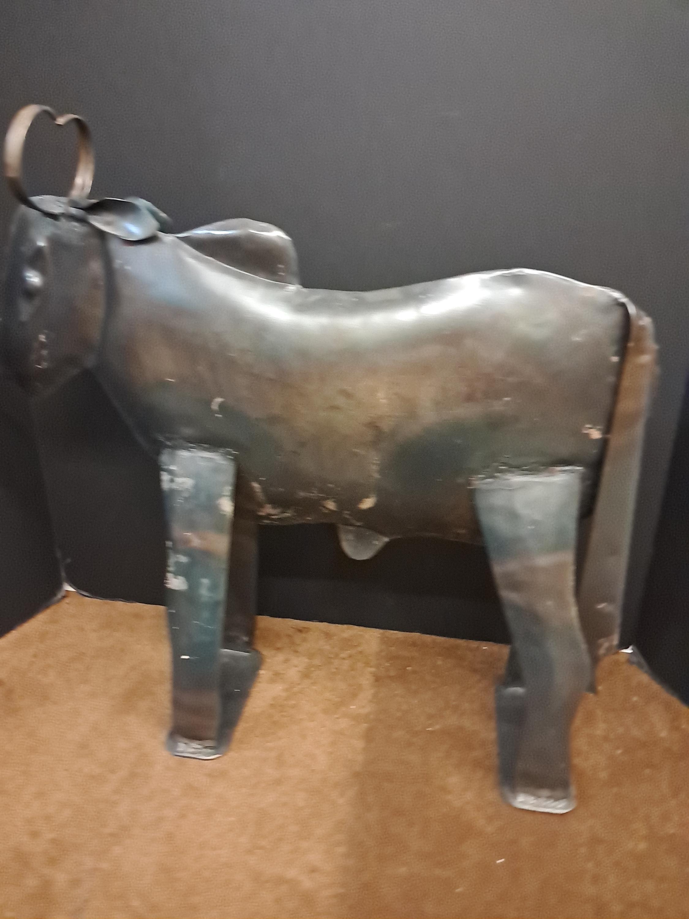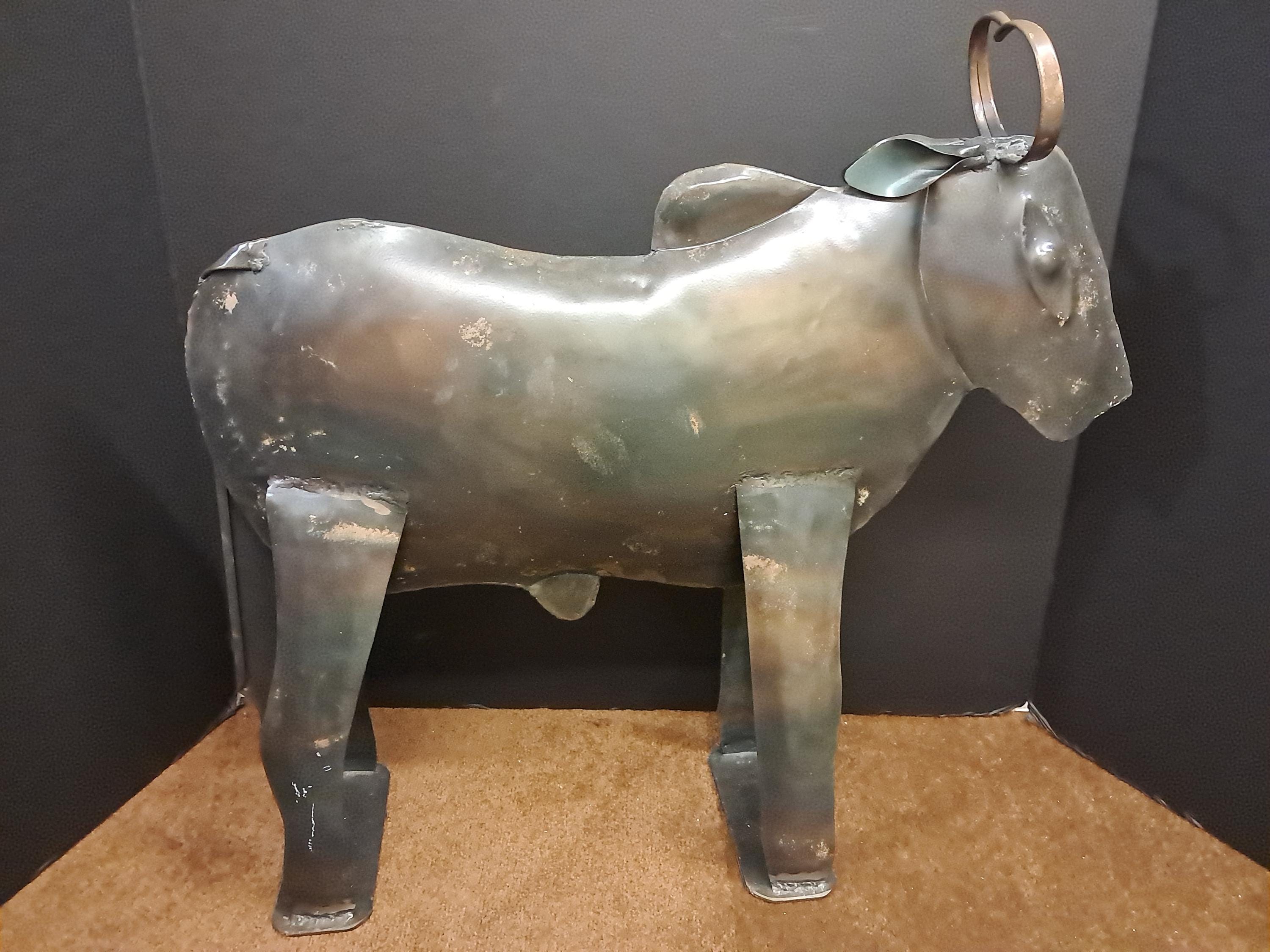 Brutalist Style / Mid Mod Decor /Vintage Folk Art Metal Cow SculptureHandmadeOrigin : UnknownMeasurment : 21 " tall x 21" wide x 6" deepExcellent Condition Some wear signs due to ageSECTION B