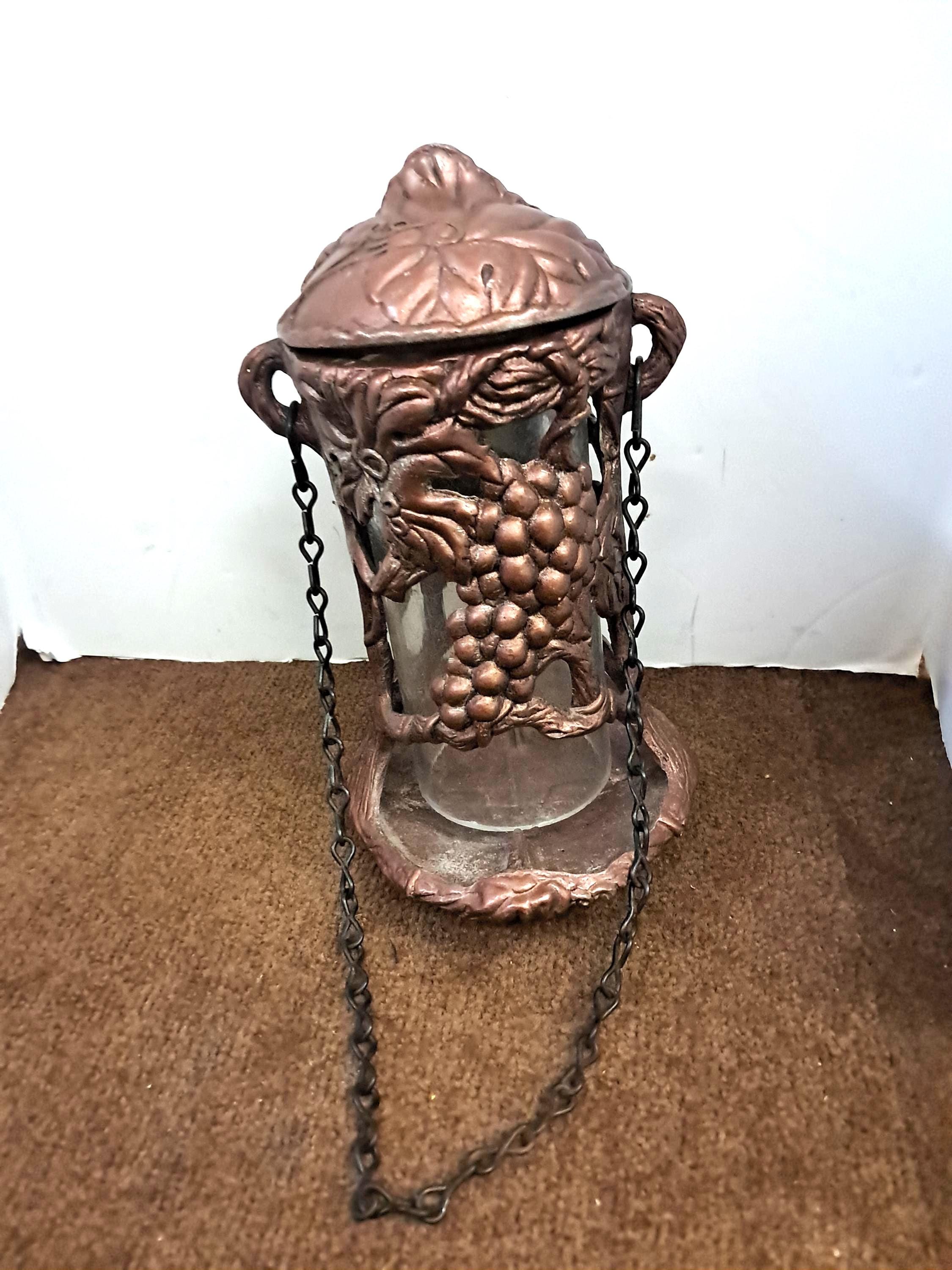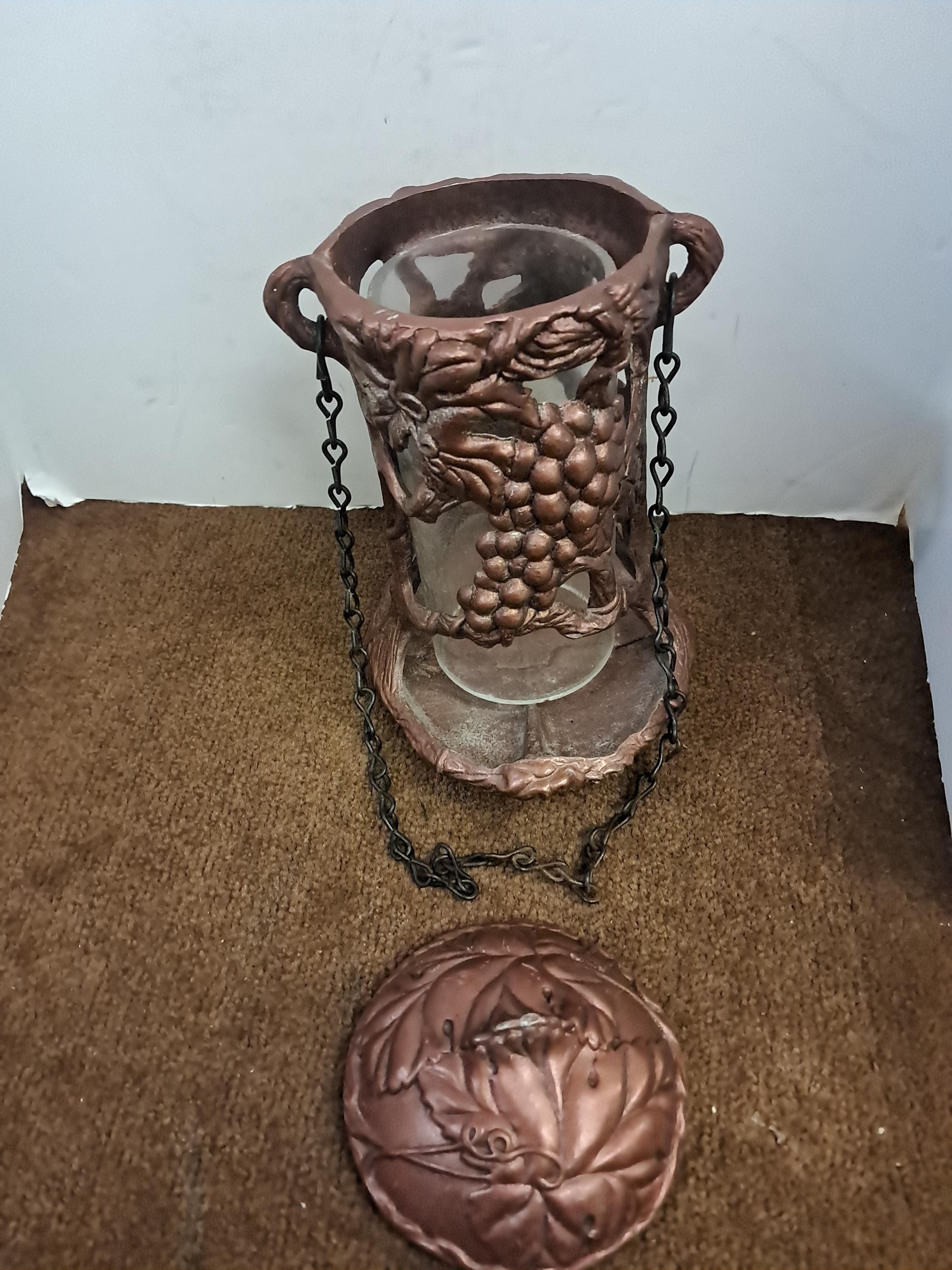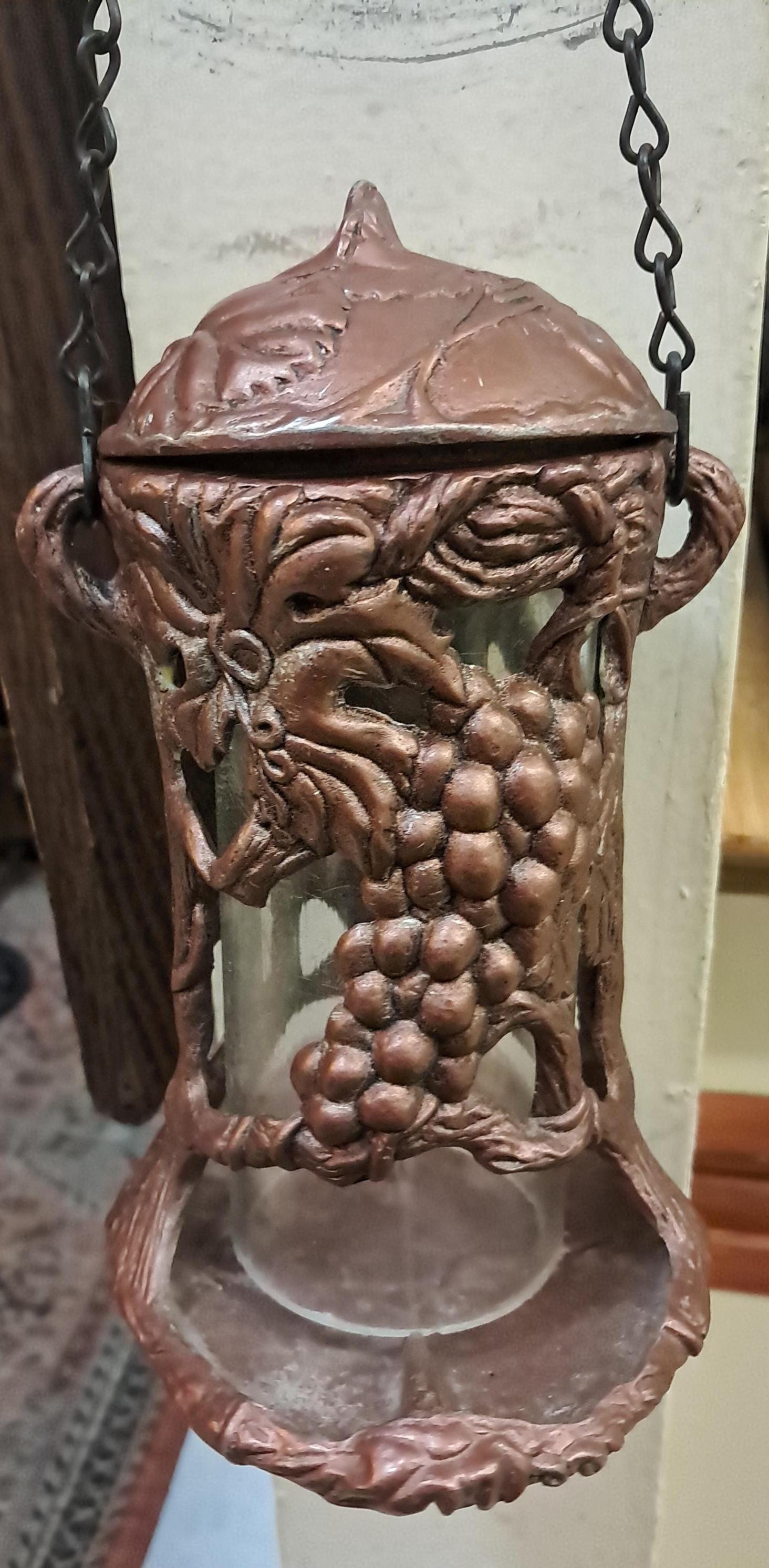 Handmade Vintage Bronze Hanging Candle HolderCan be used as Incense burner too.. Made of Bronze , Grape and leaves designMetal 8 " chain attached for hanging Good vintage condition