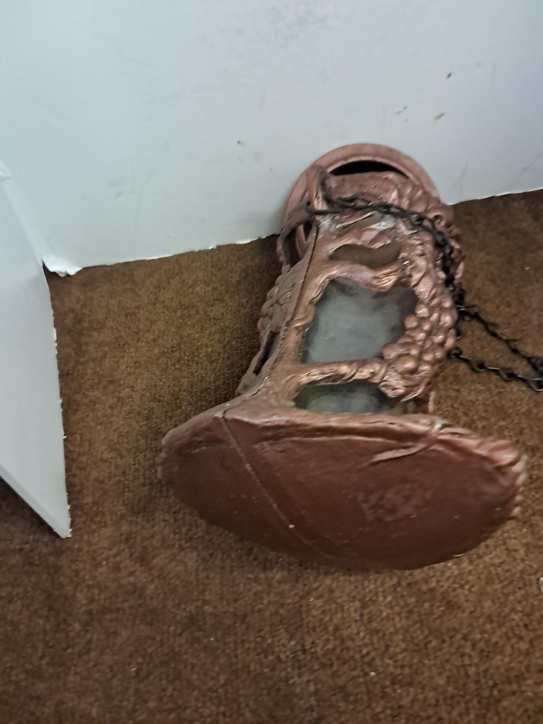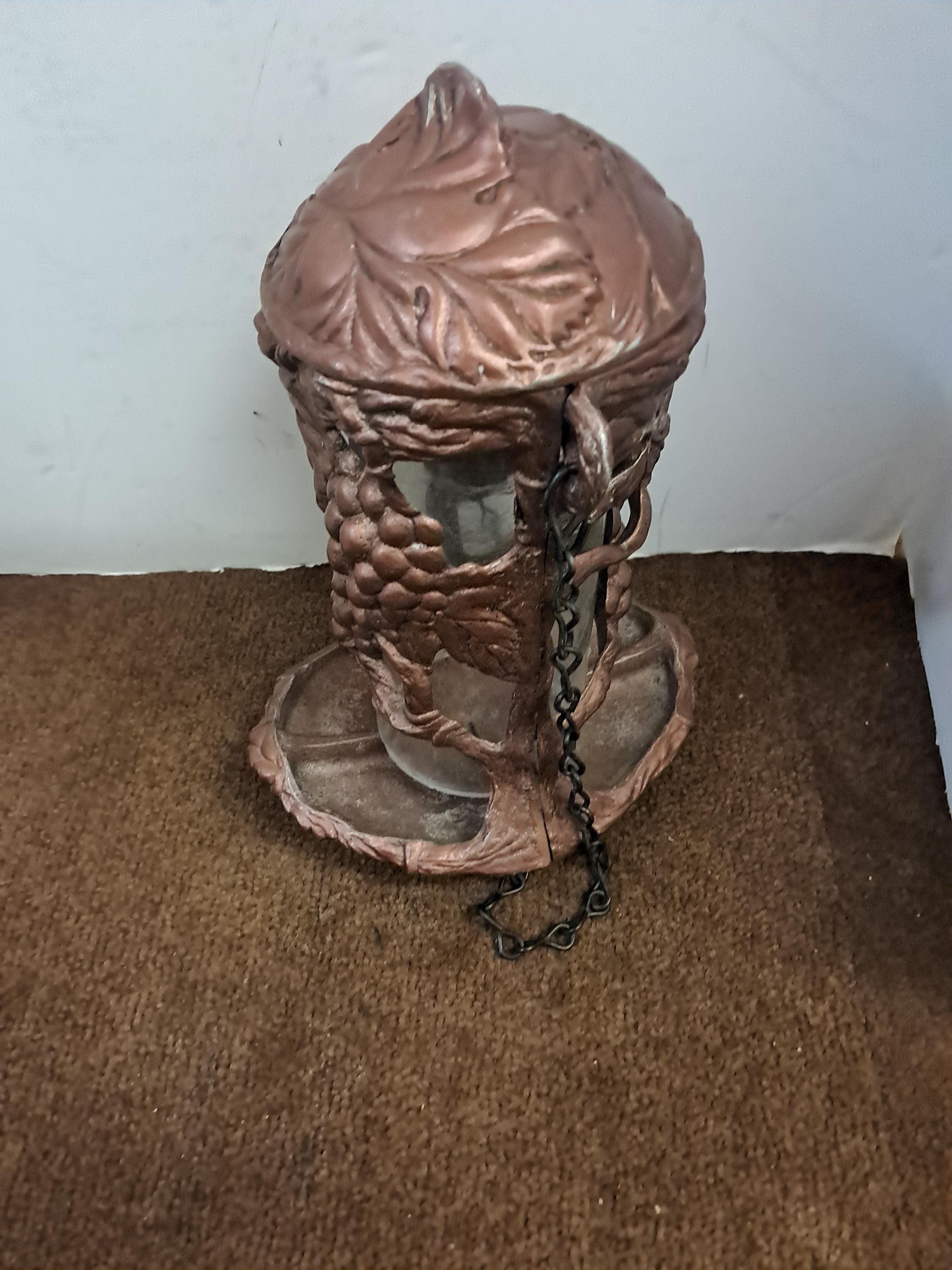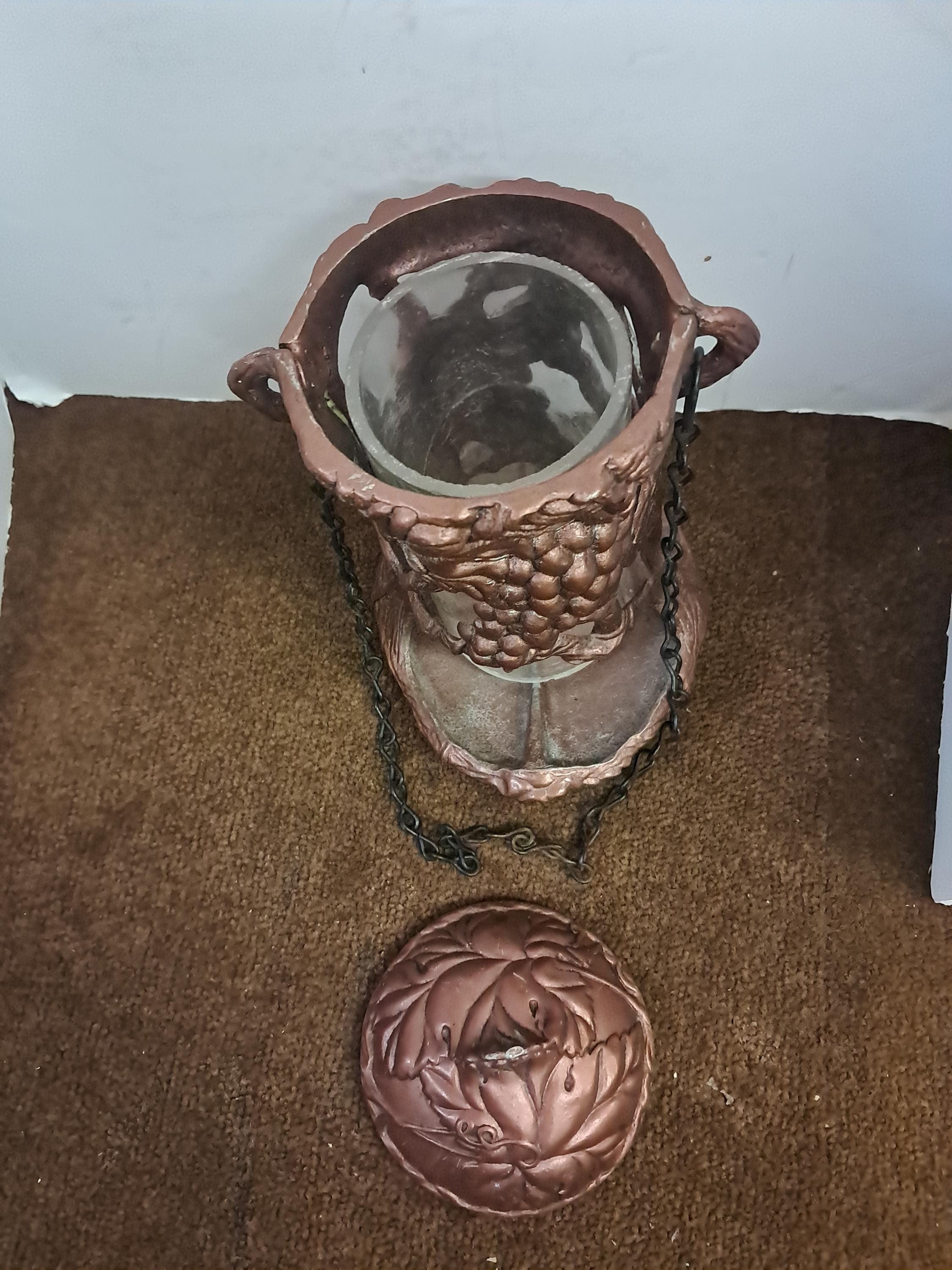 Handmade Vintage Bronze Hanging Candle HolderCan be used as Incense burner too.. Made of Bronze , Grape and leaves designMetal 8 " chain attached for hanging Good vintage condition