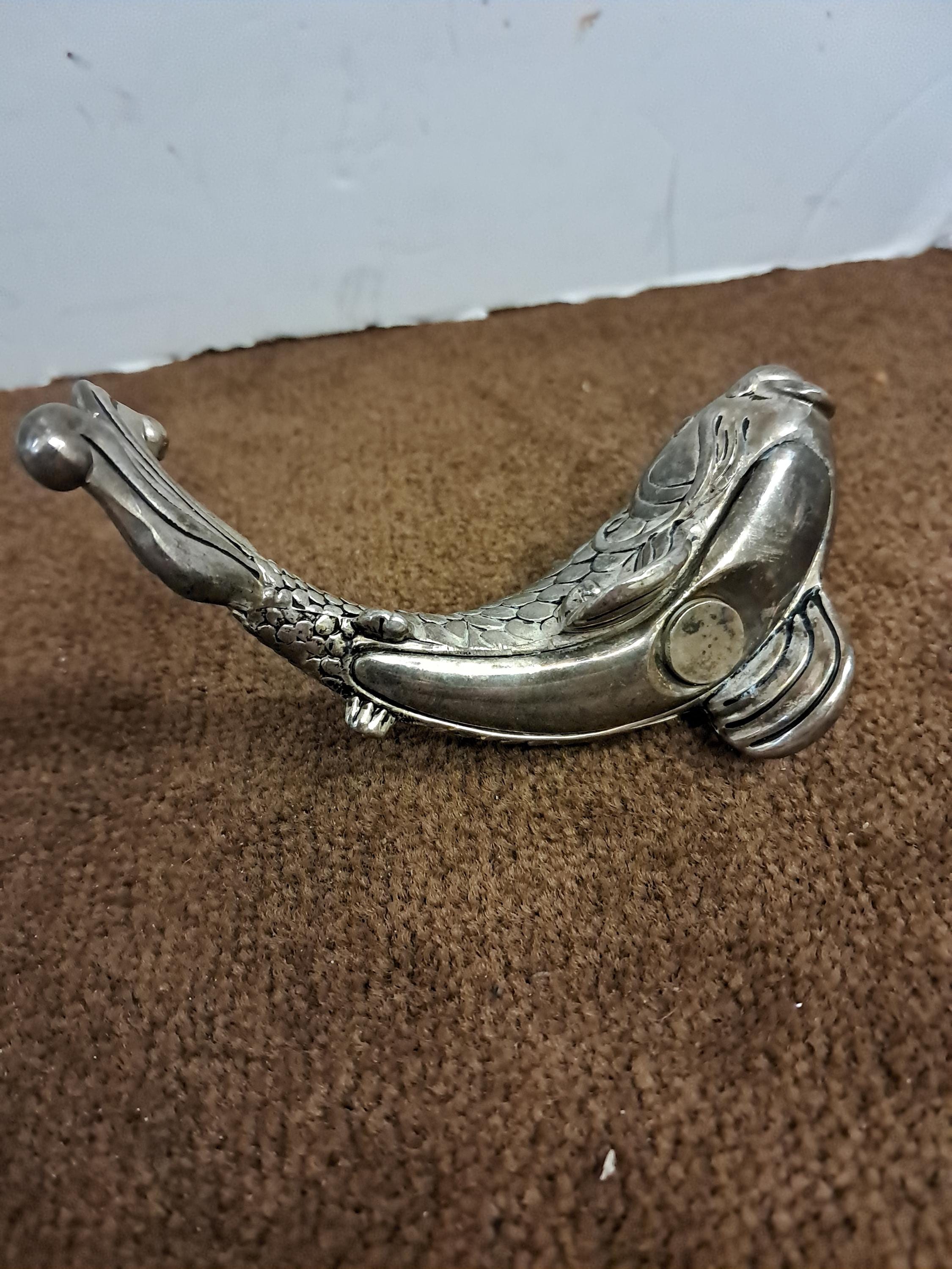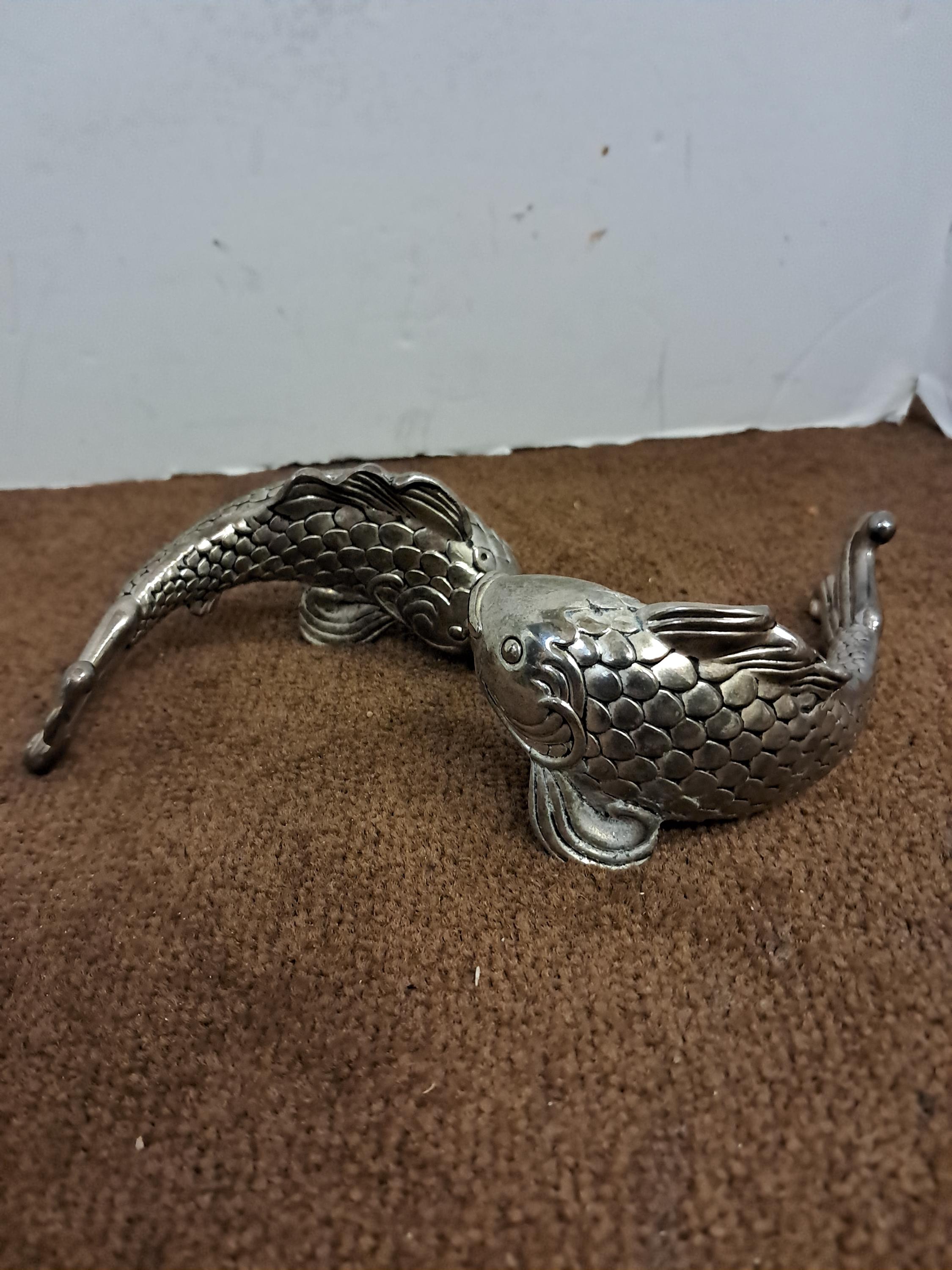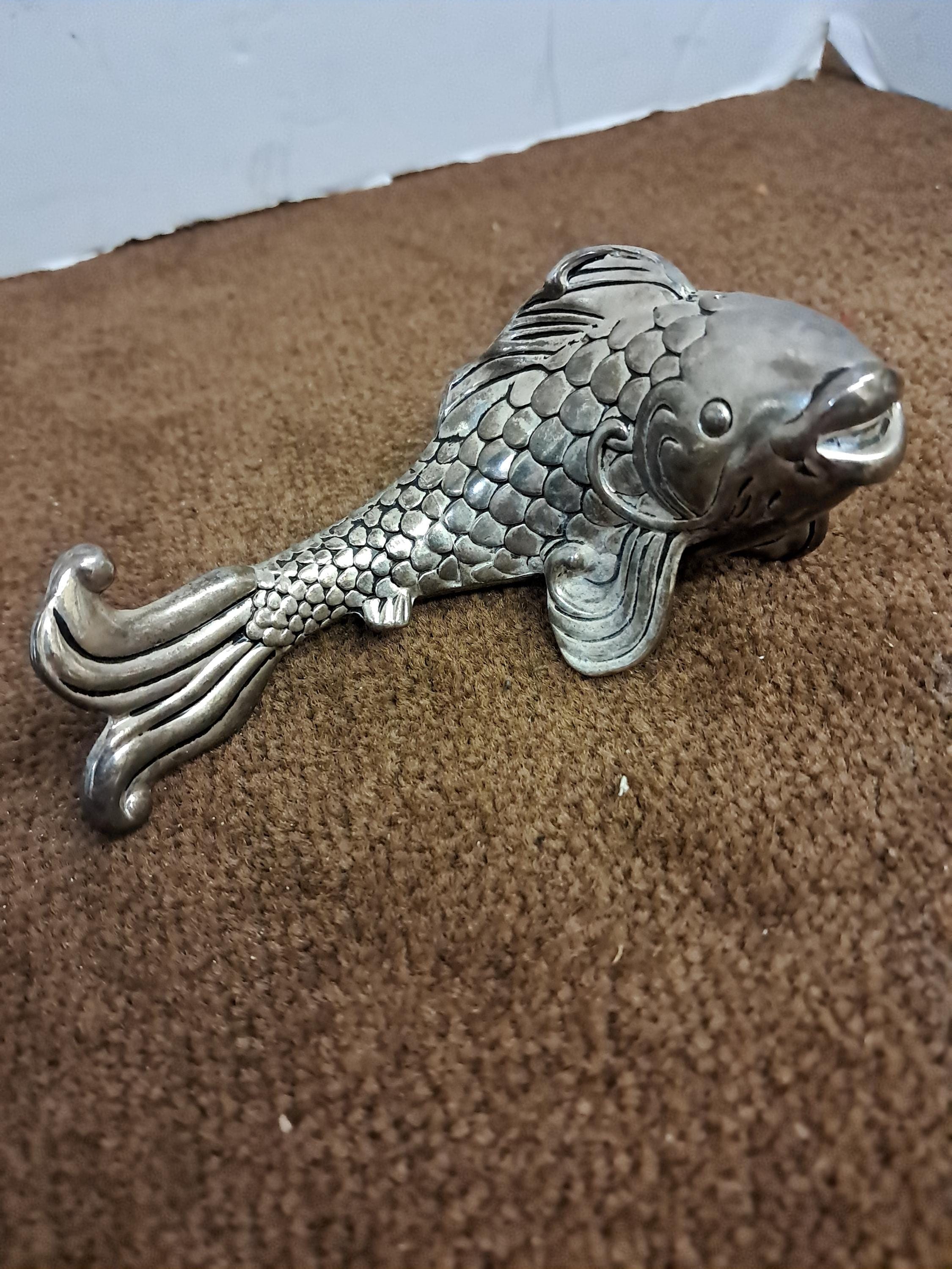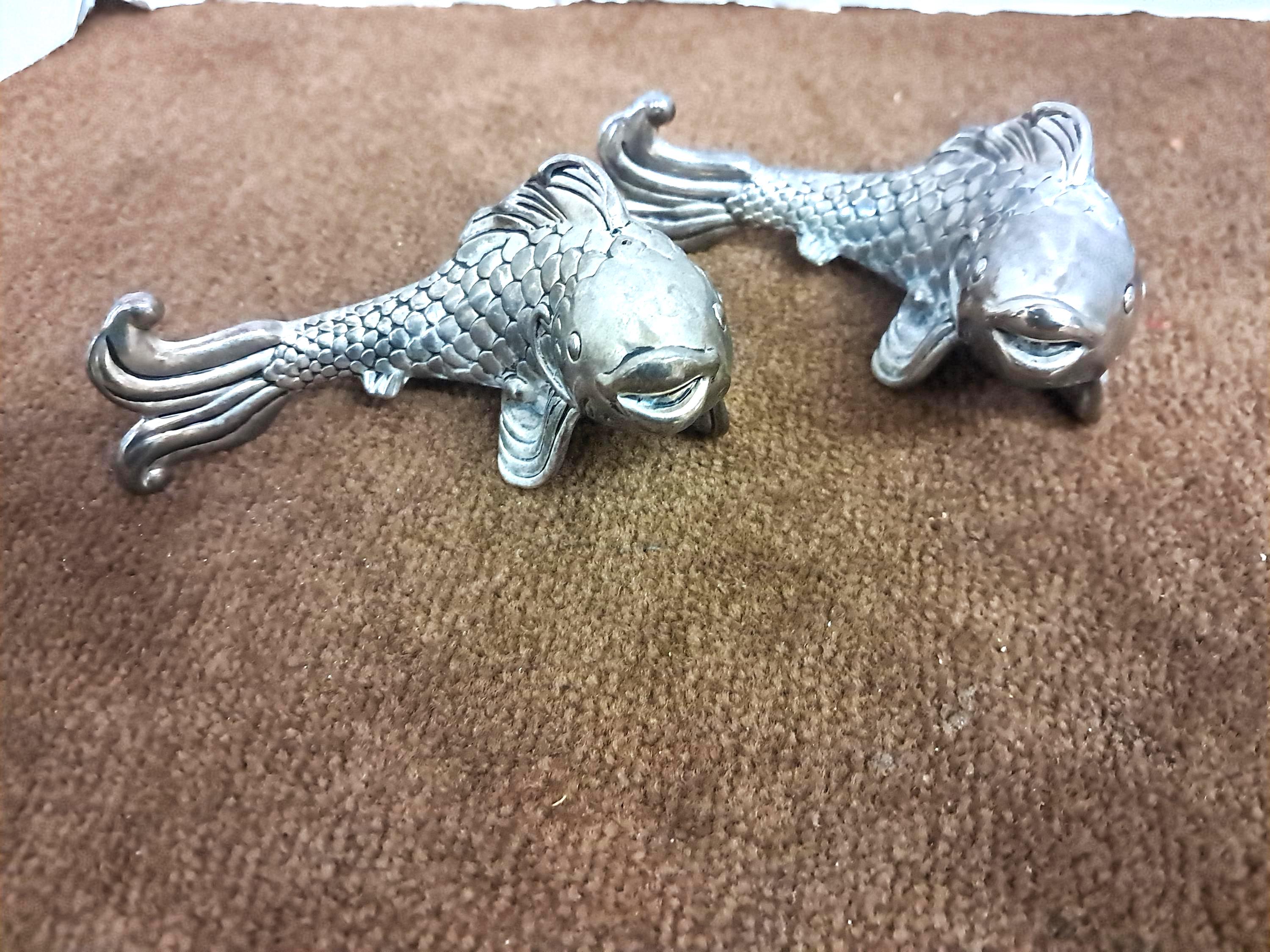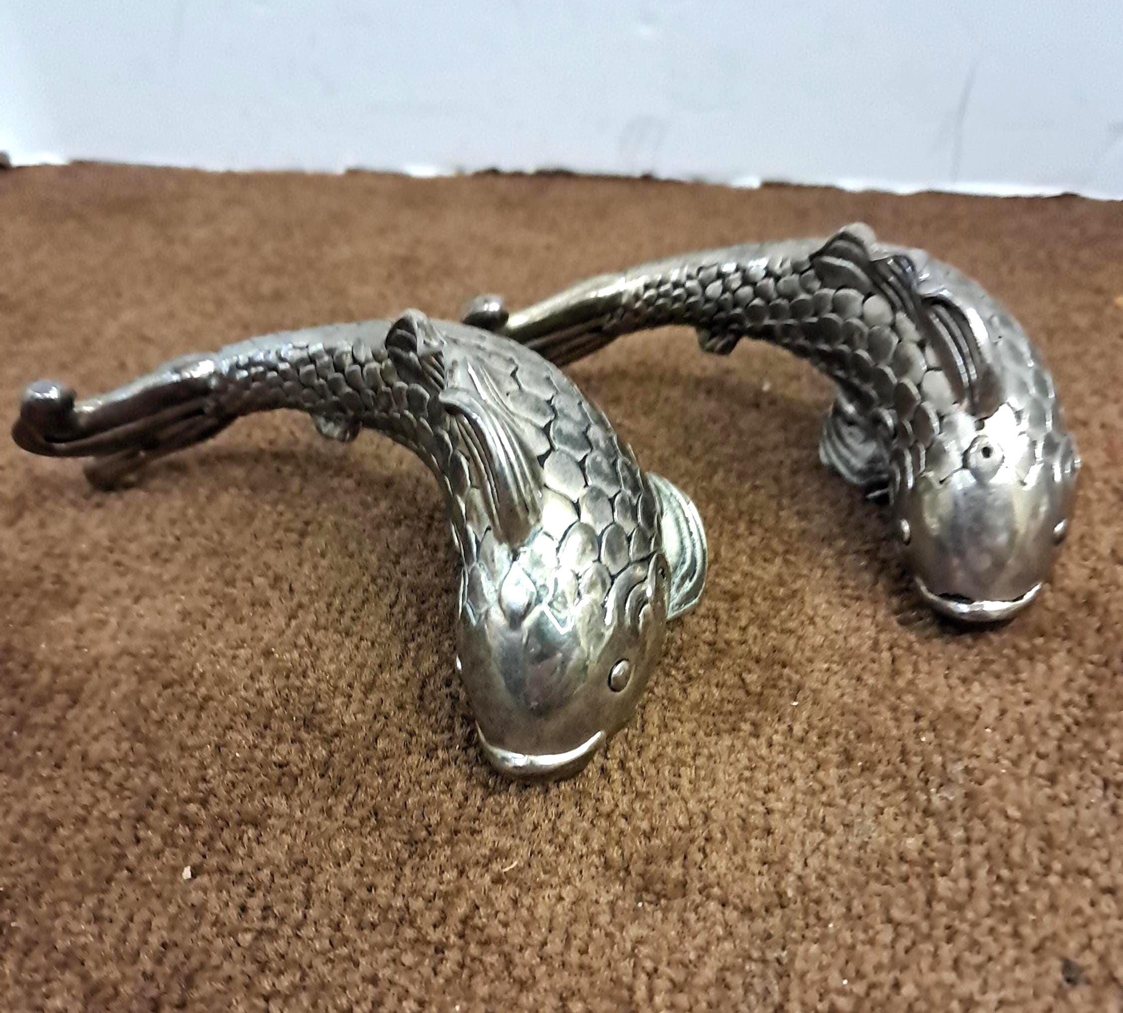 Metal Koi fish designed salt & Pepper shakers.4 1/2 inches in length, 2 inches high. Polished silver finish.For usage as Salt & Pepper shakers, they Need a good cleaning, Best used for display as figurines