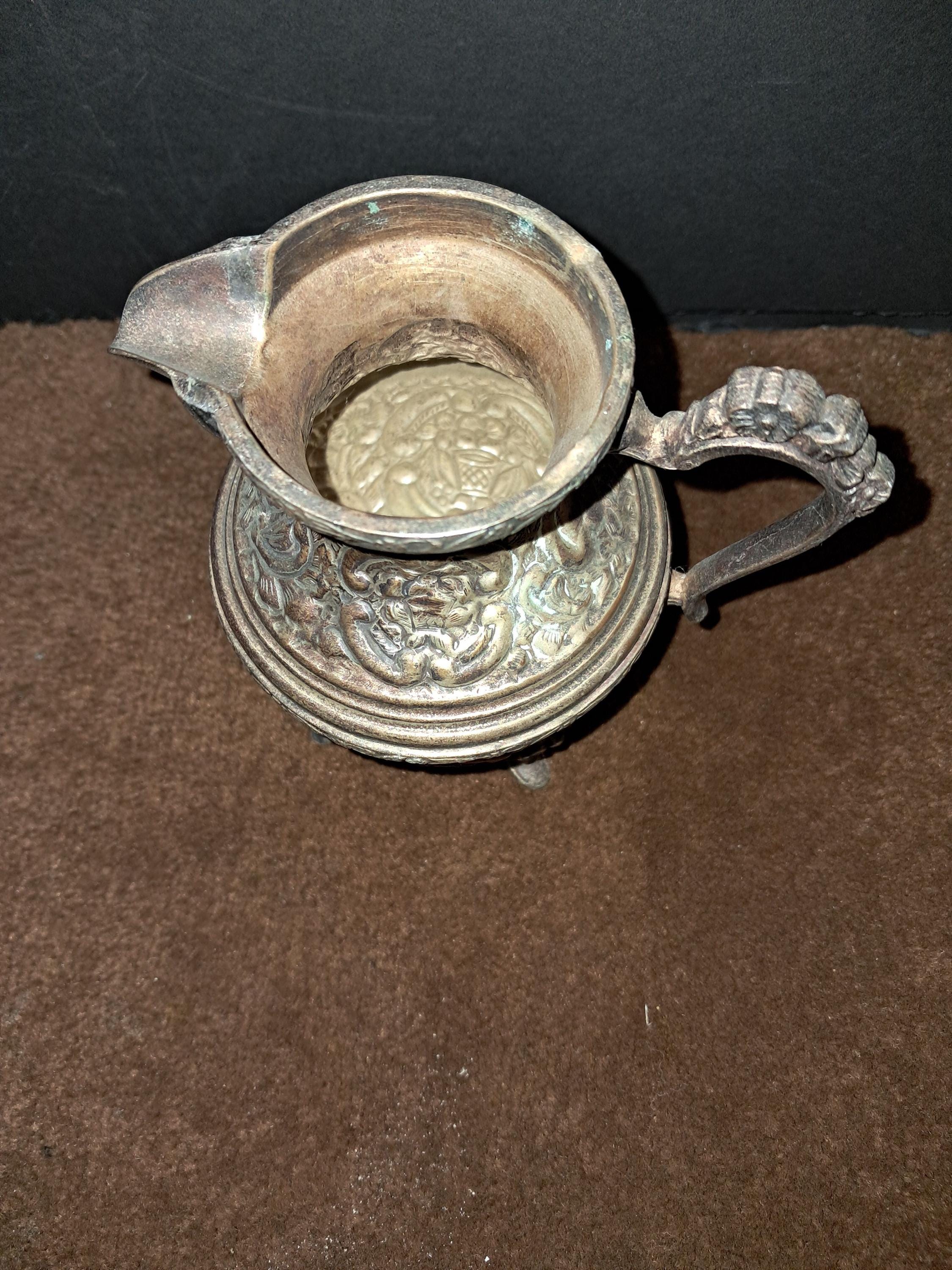The milk pot, mirroring the design language of its counterparts, features a seamless integration of floral and geometric carvings. The handle is carefully shaped for both ergonomic use and aesthetic appeal, adorned with smaller engraved details that complement the overall design.