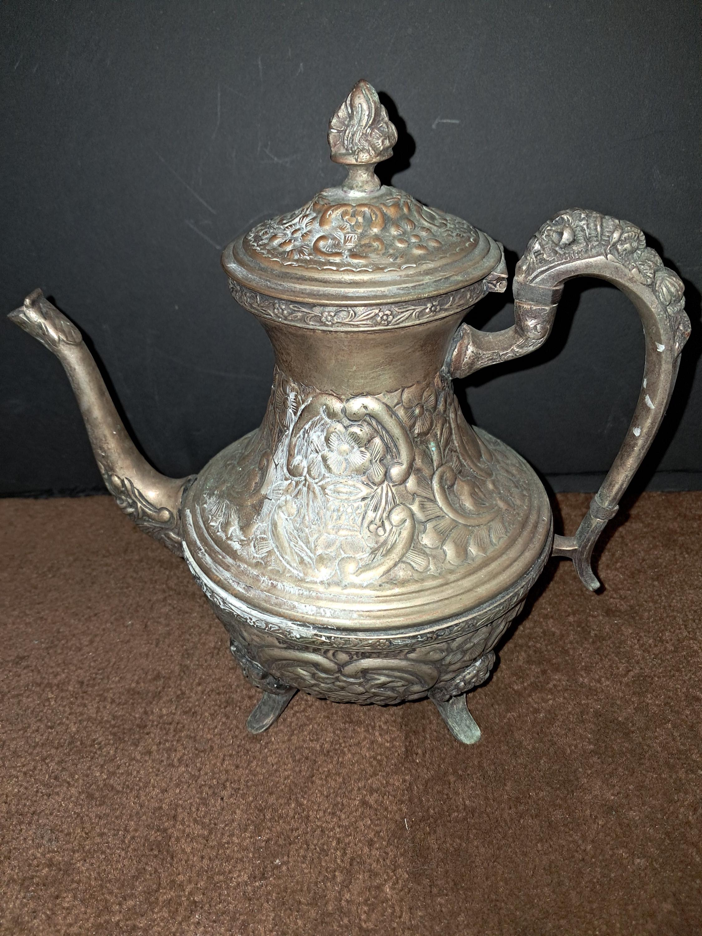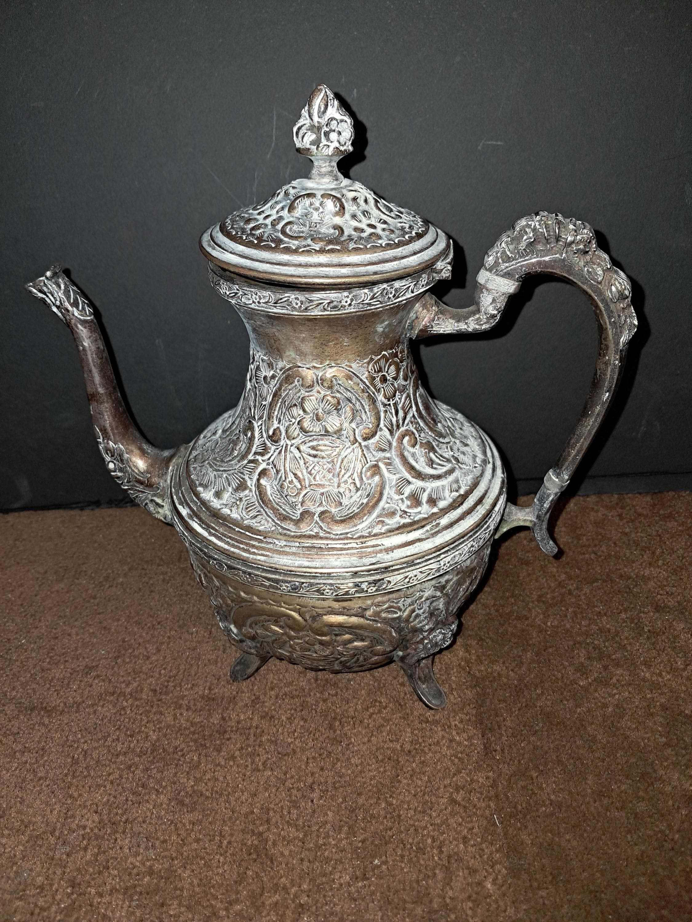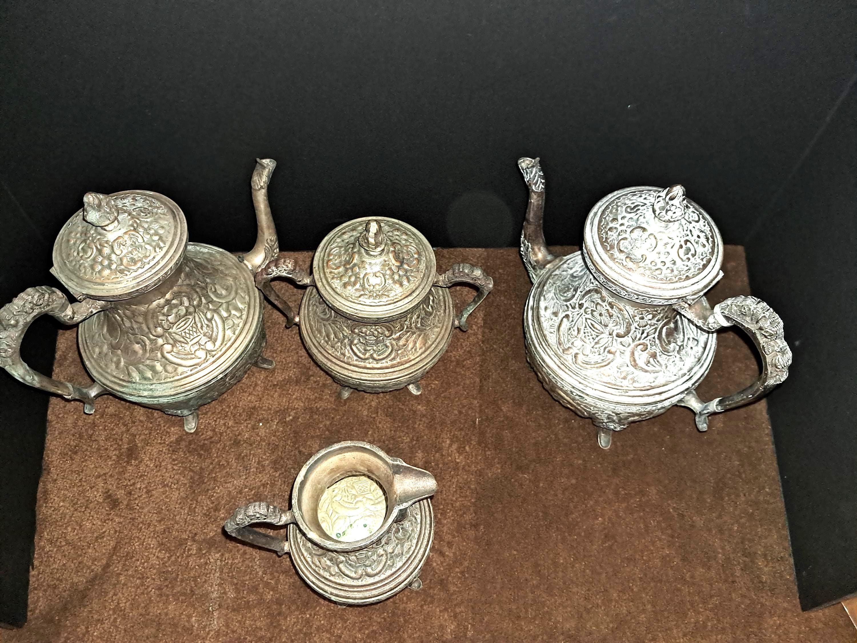 This 19th-century Kashmiri Mughal copper tea set, consisting of , Tea Pot. Hot Water Pot, sugar pot with Lid , and Creamer / milk pot, is a magnificent representation of the region's rich artistic heritage and the influence of Mughal aesthetics.