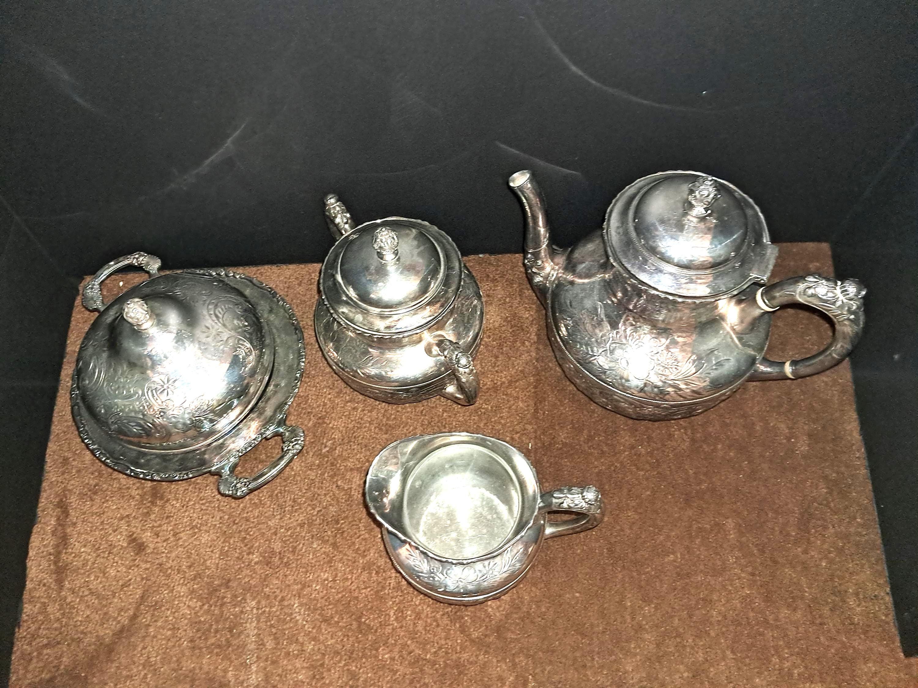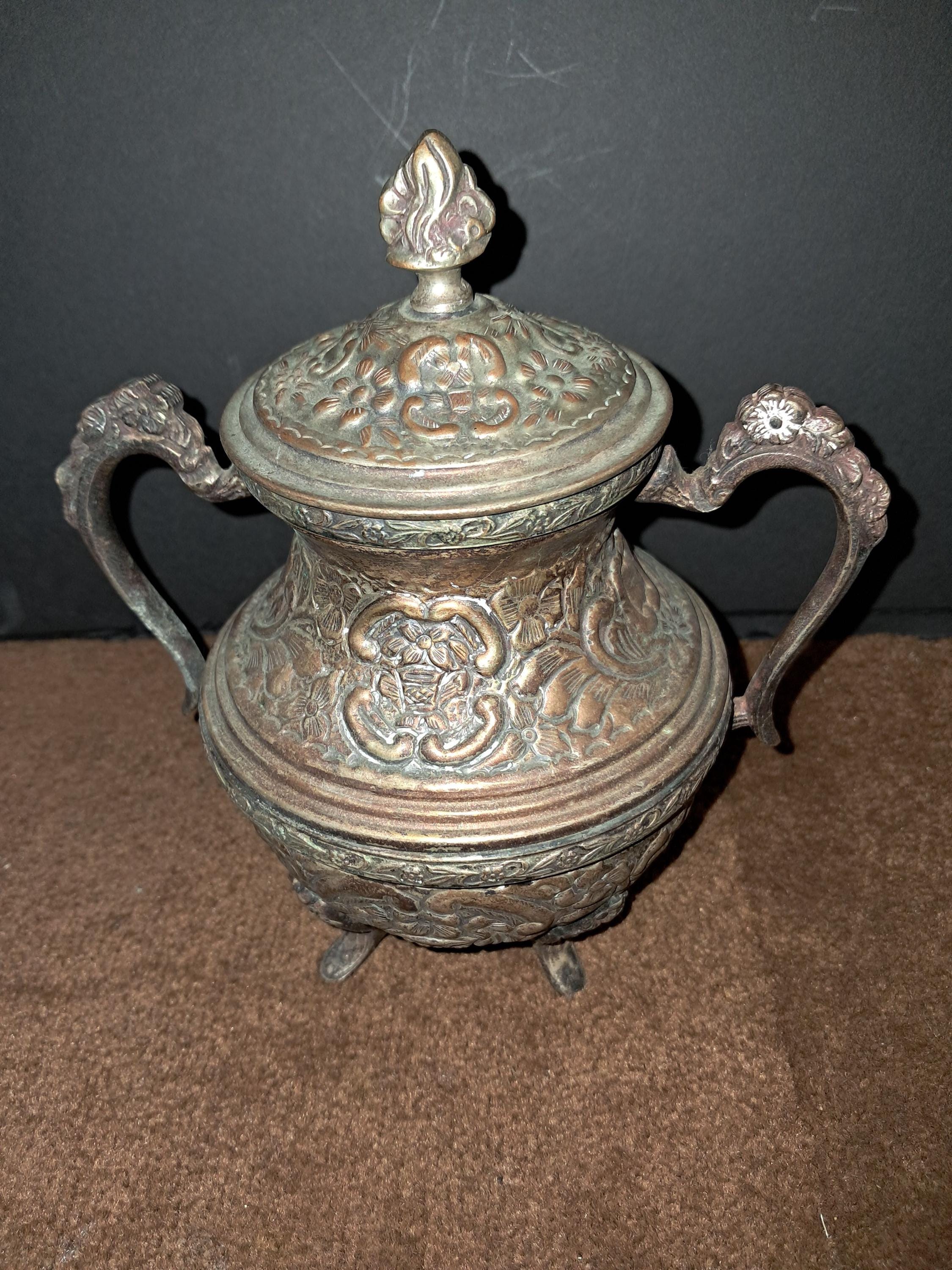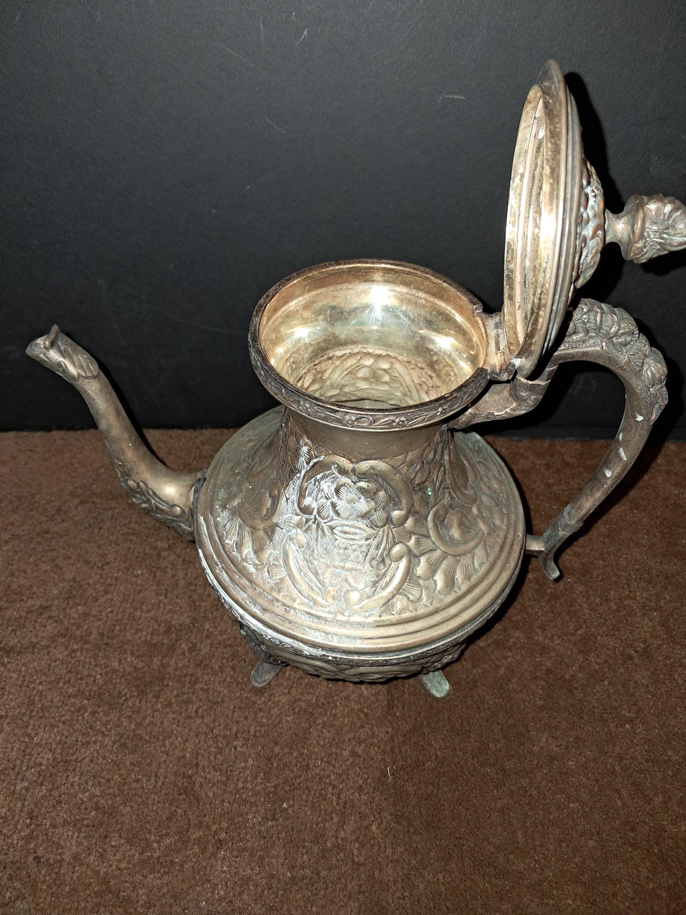 This 19th-century Kashmiri Mughal copper tea set, consisting of , Tea Pot. Hot Water Pot, sugar pot with Lid , and Creamer / milk pot, is a magnificent representation of the region's rich artistic heritage and the influence of Mughal aesthetics.