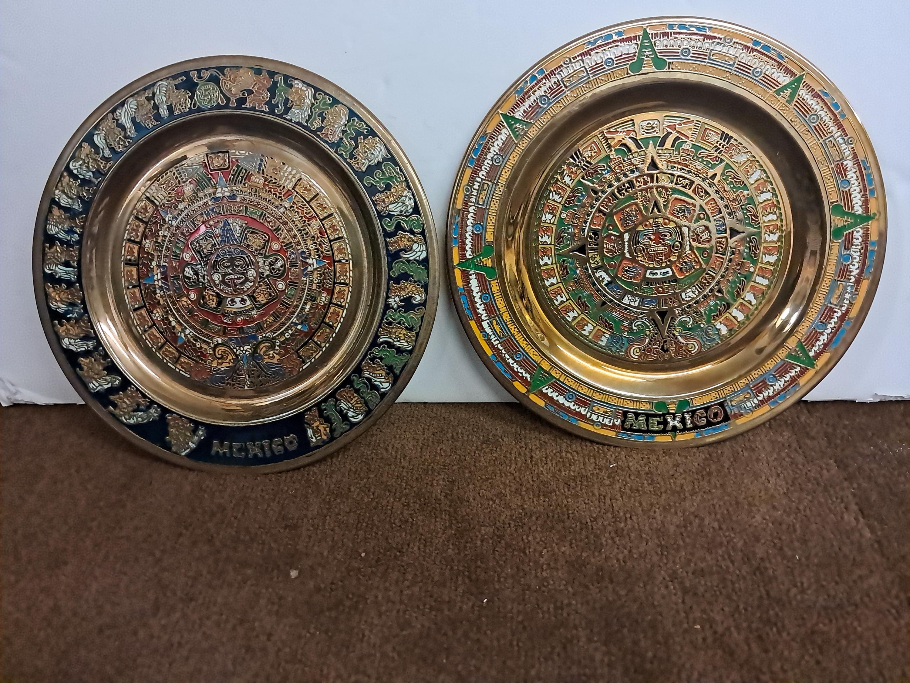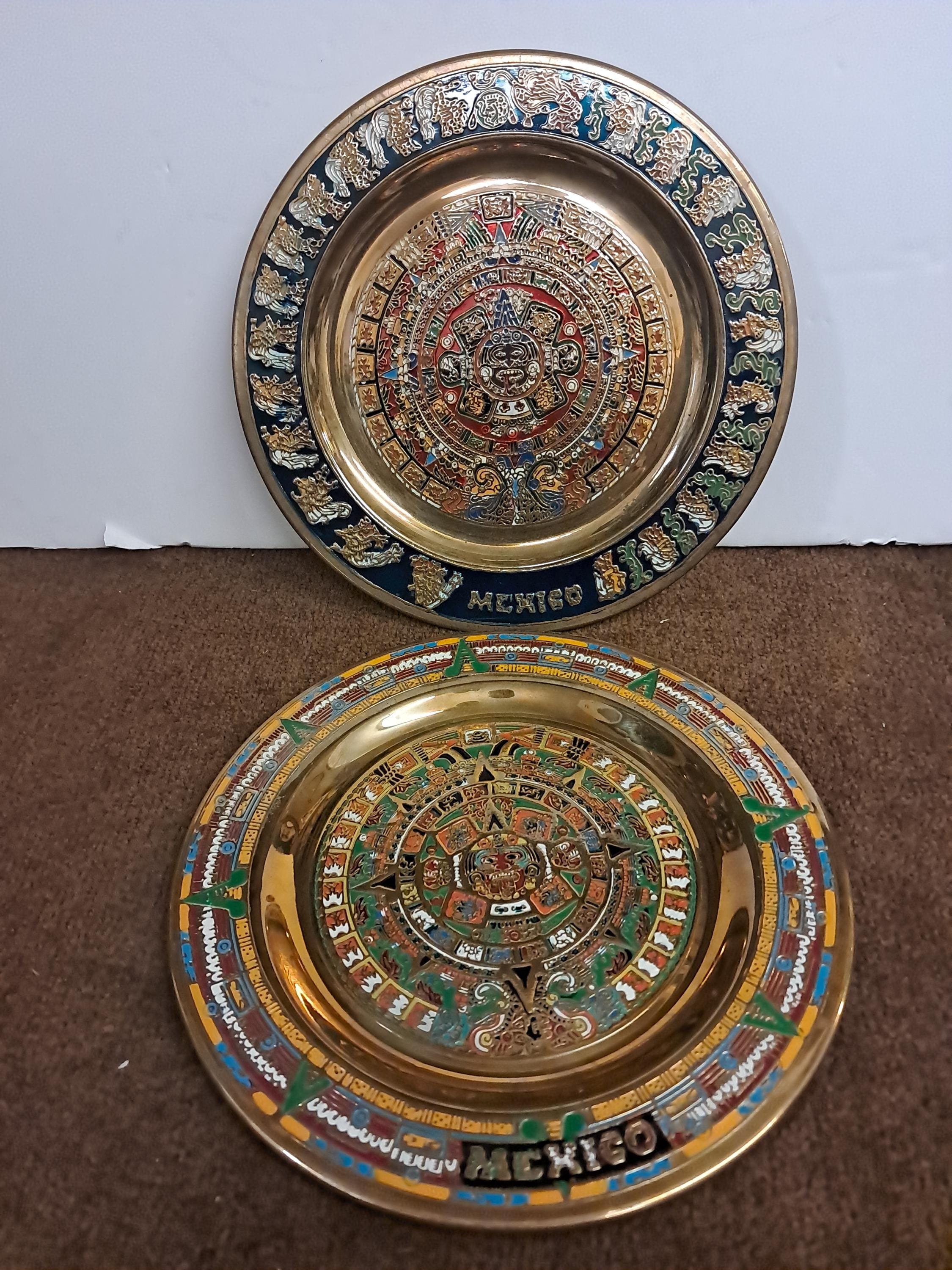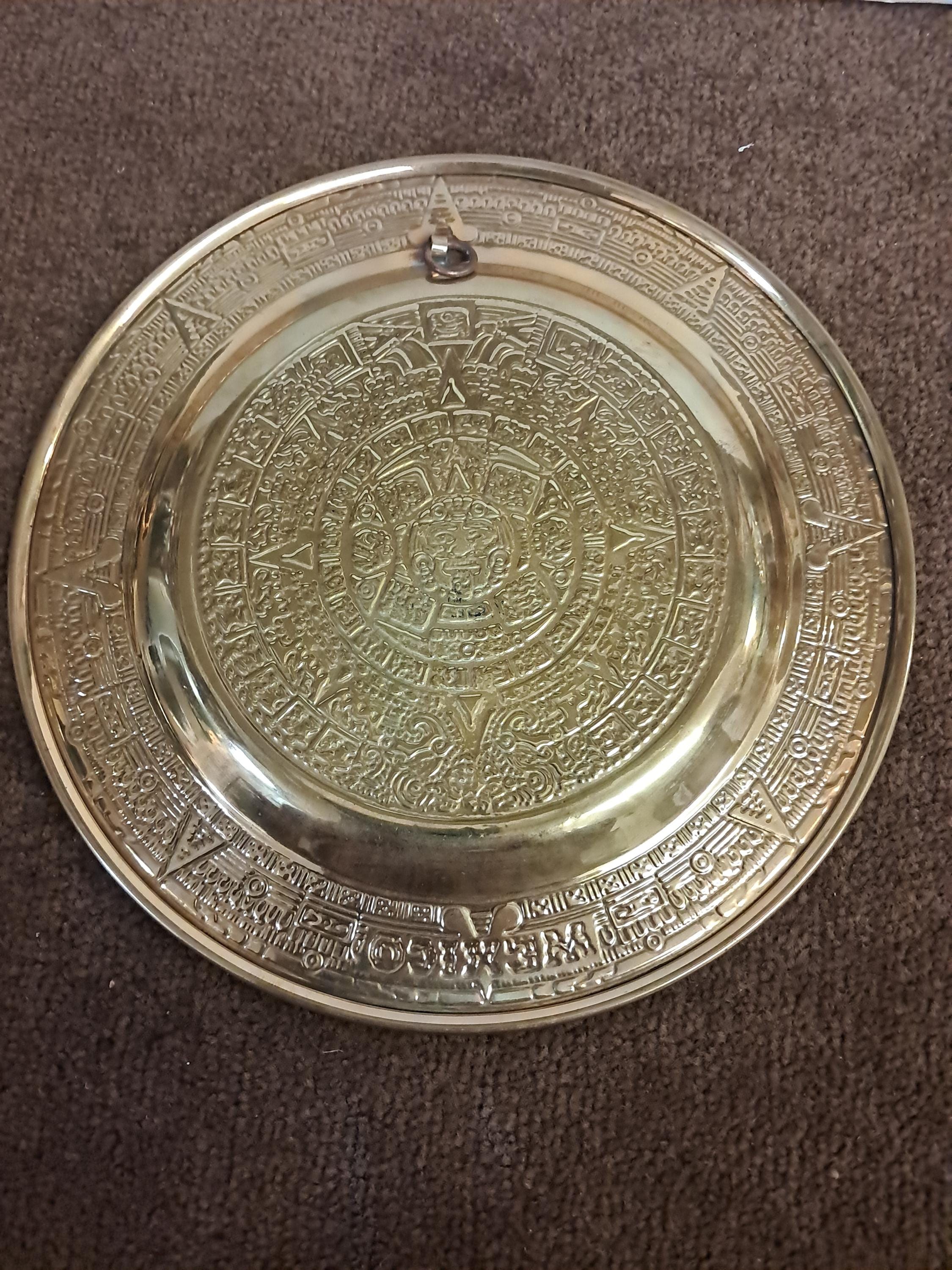 Two Aztec Sun Aztec Calendar , Piedra Del Sol 8" in diameter x 5" deep Excellent condition Made In MexicoMaterial : Brass Wall Plates