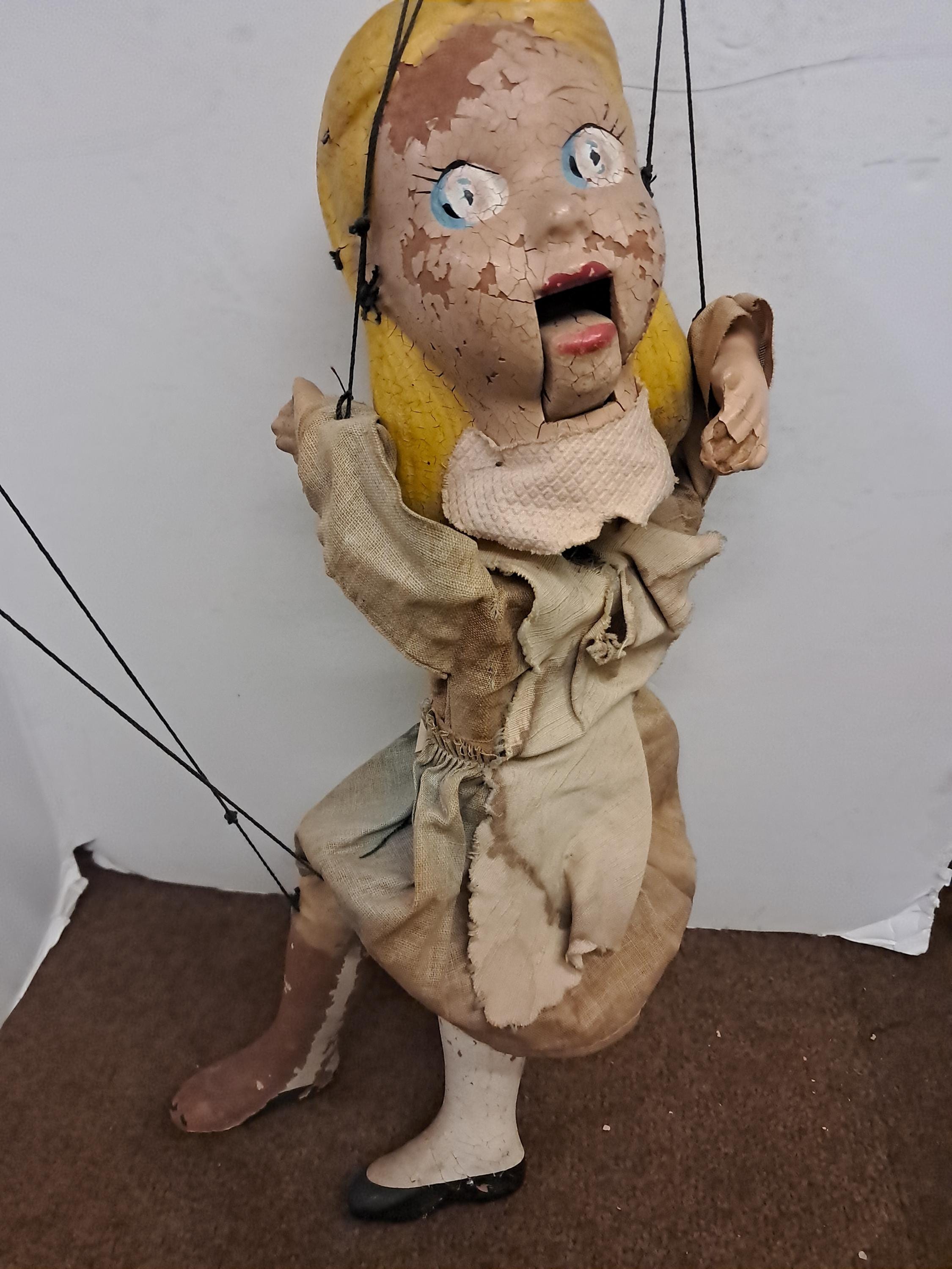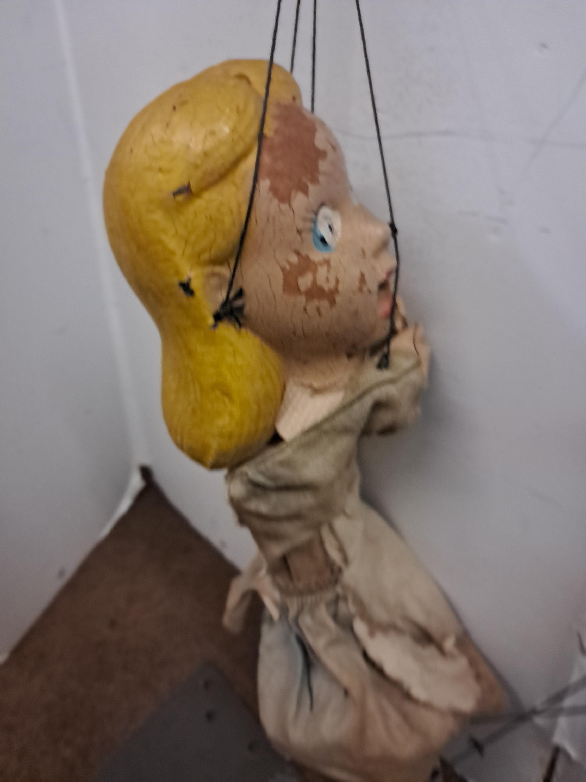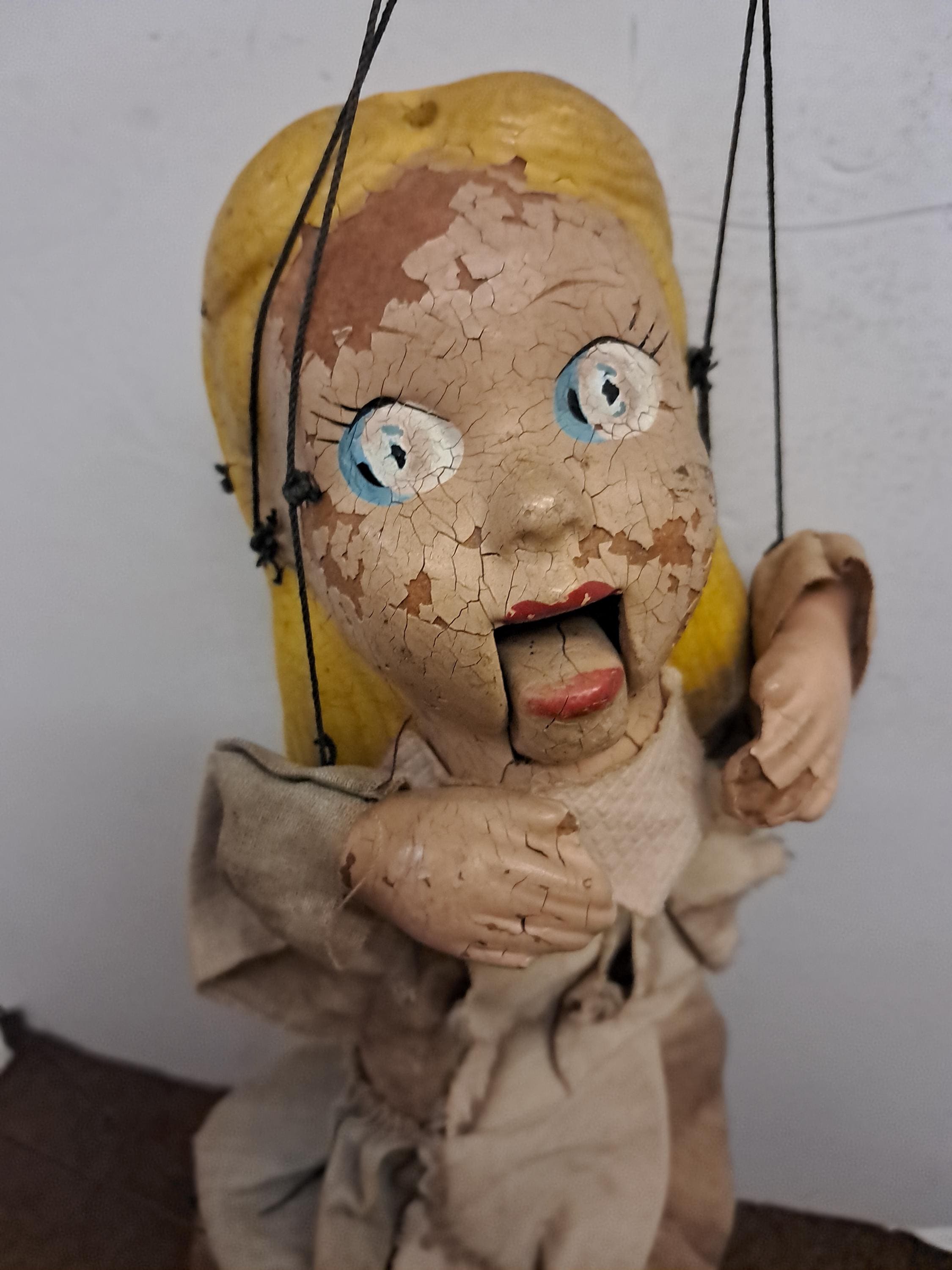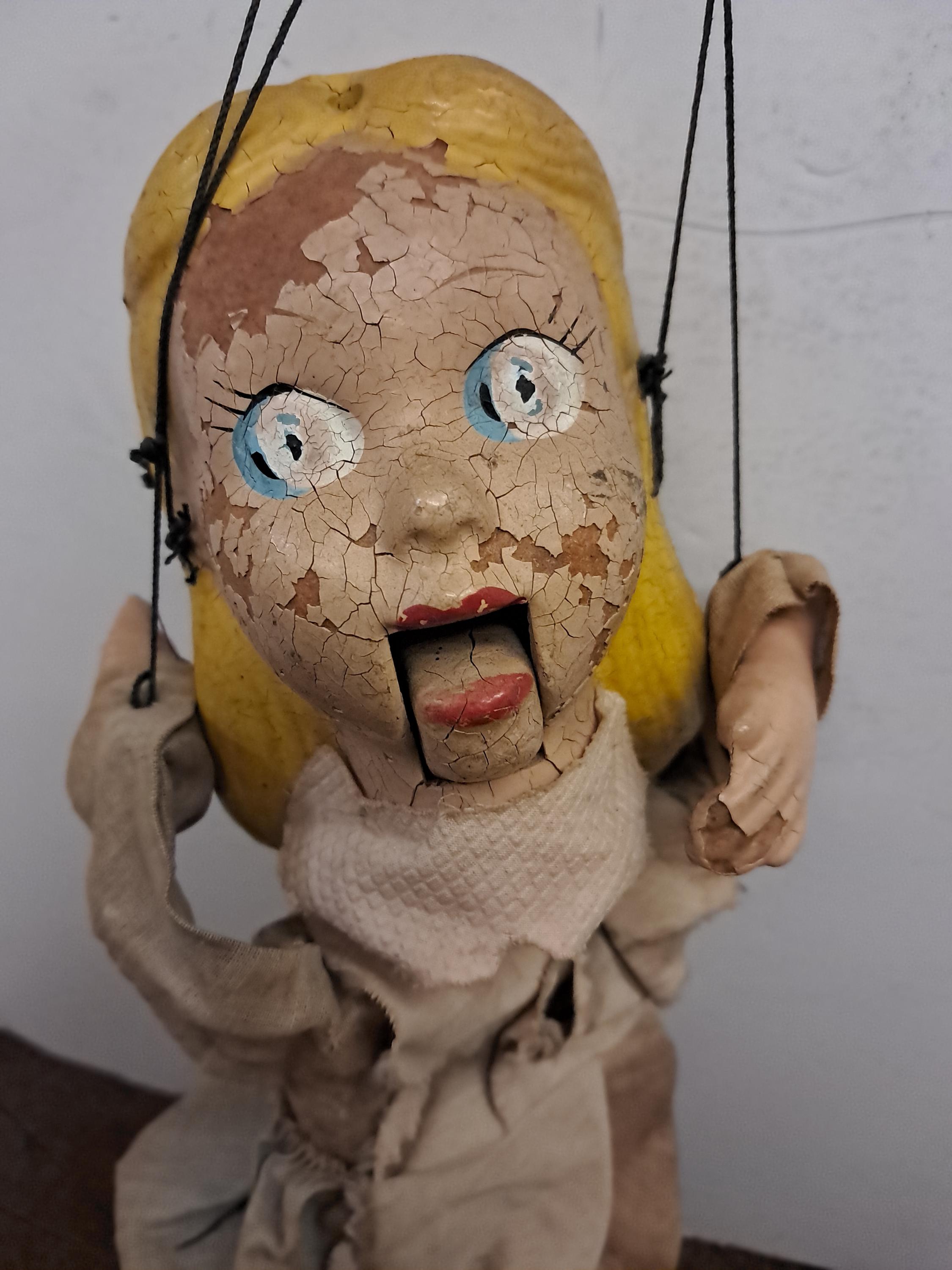 An intriguing example of a fully articulated circus puppet marionette, in the form of a girl. This figure is fully articulated with iron strings supports and supported by strings . Her face is full of expression and effortlessly takes you to a playful world.