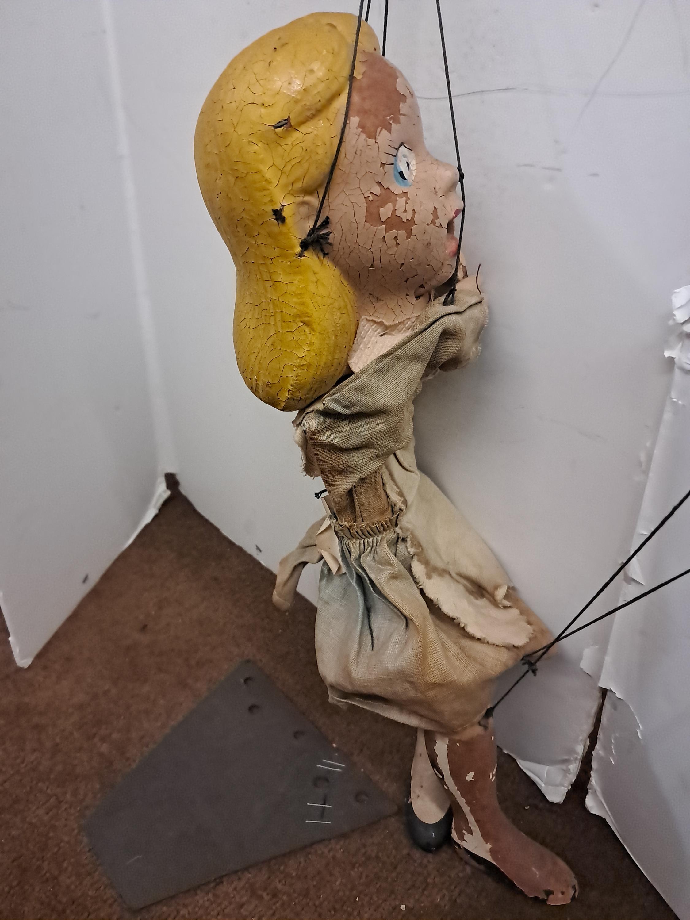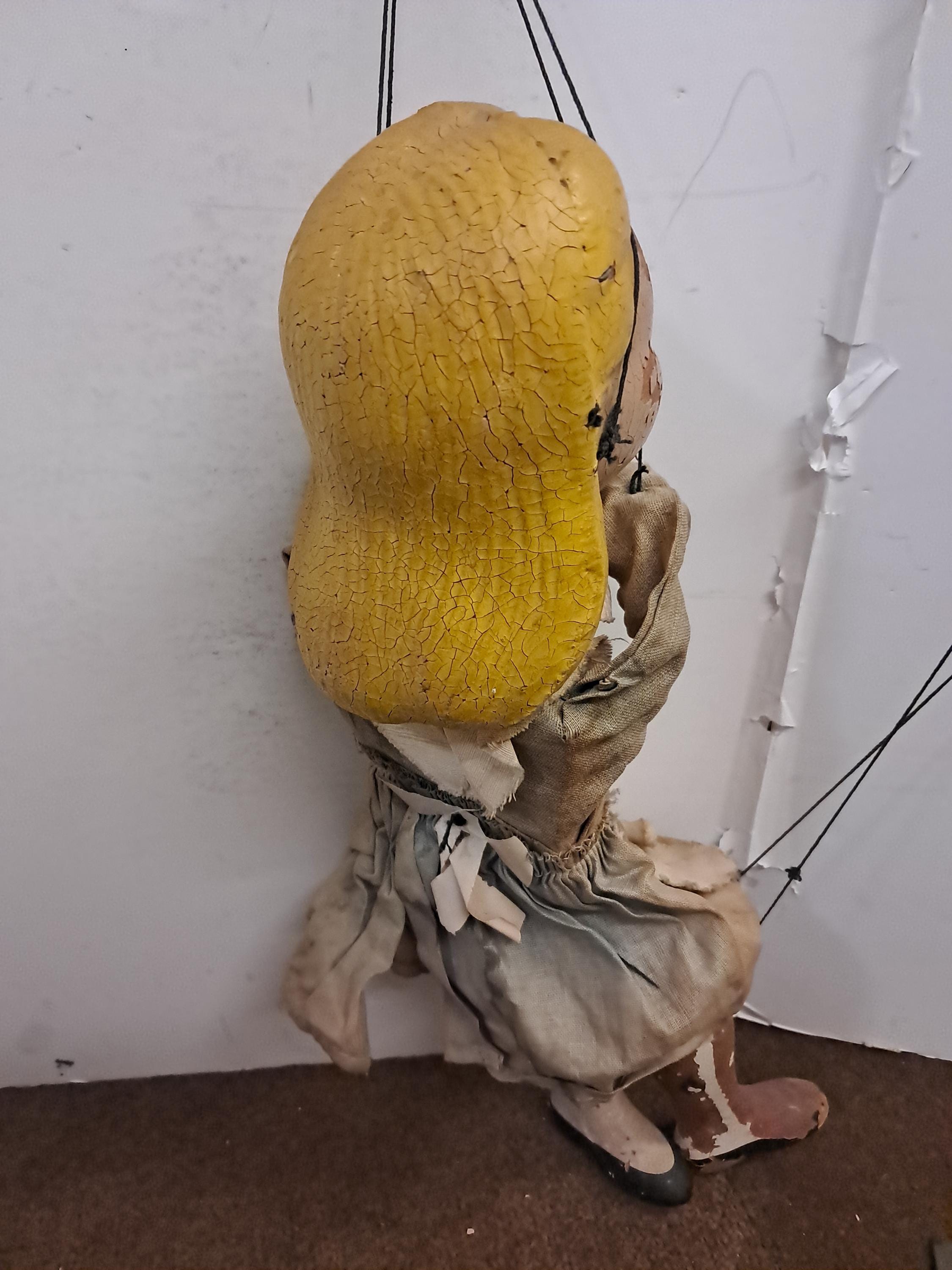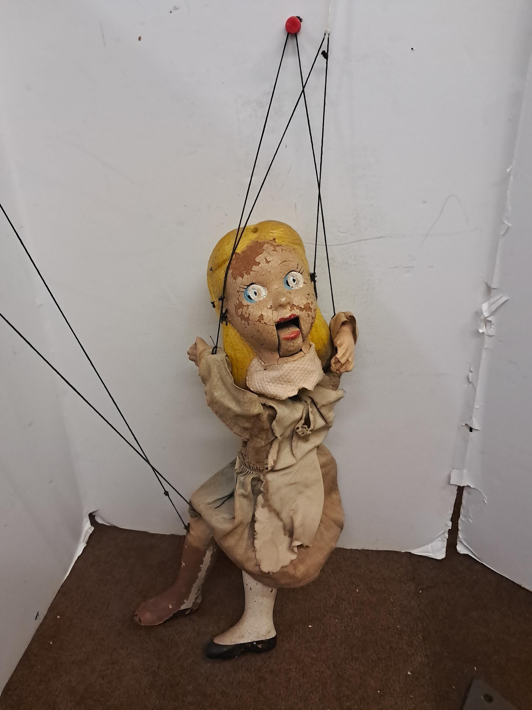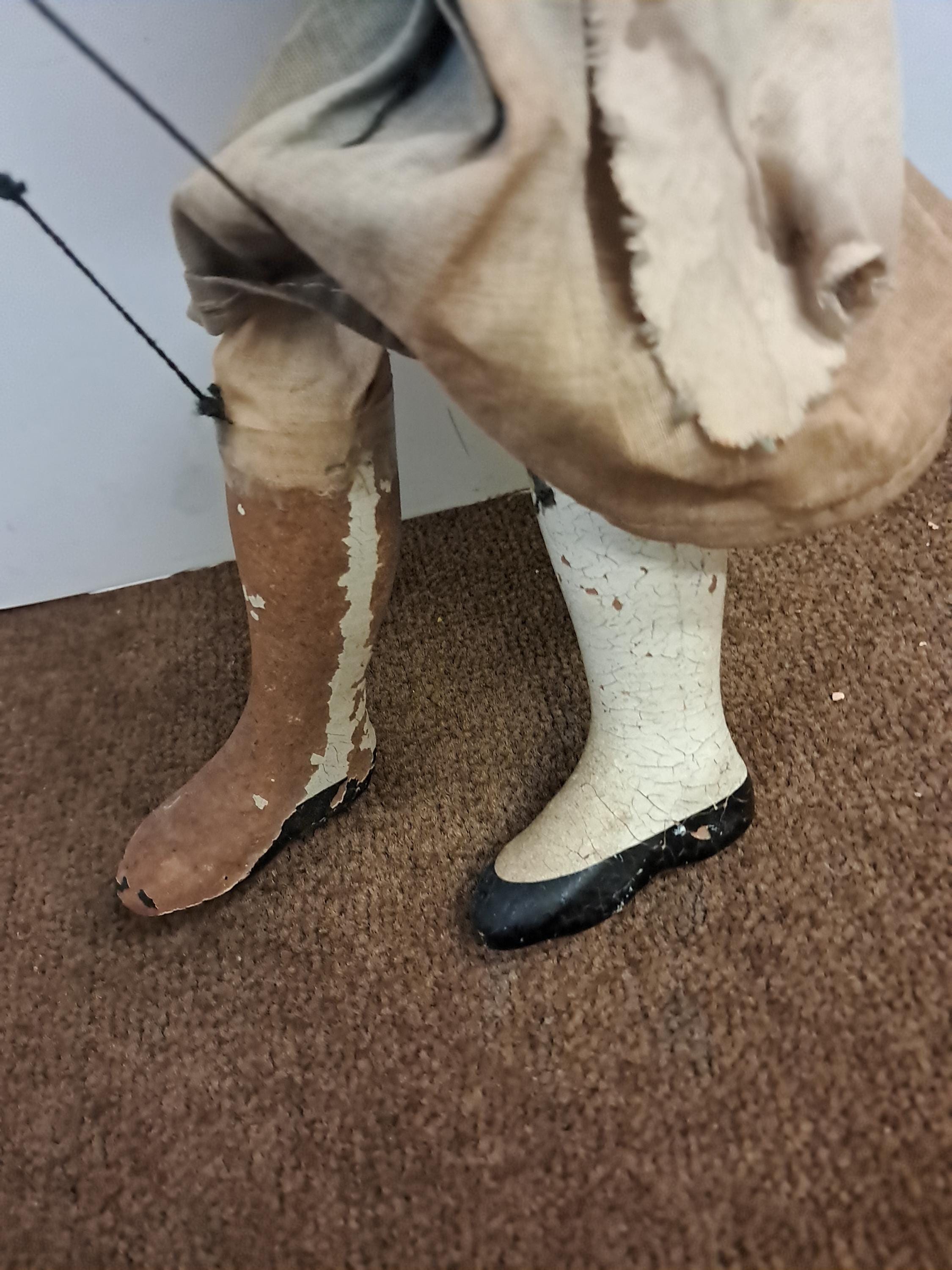 An intriguing example of a fully articulated circus puppet marionette, in the form of a girl. This figure is fully articulated with iron strings supports and supported by strings . Her face is full of expression and effortlessly takes you to a playful world.