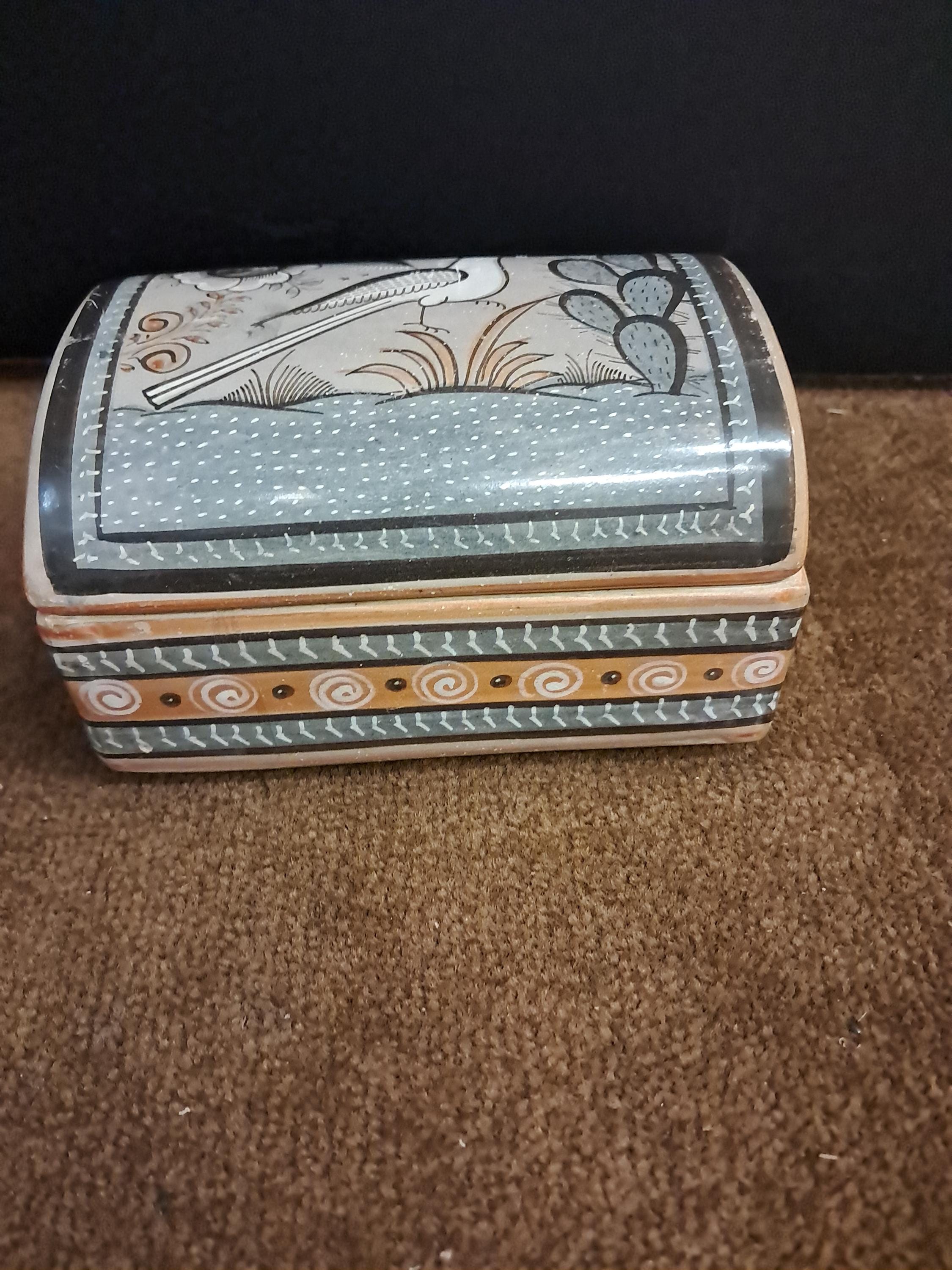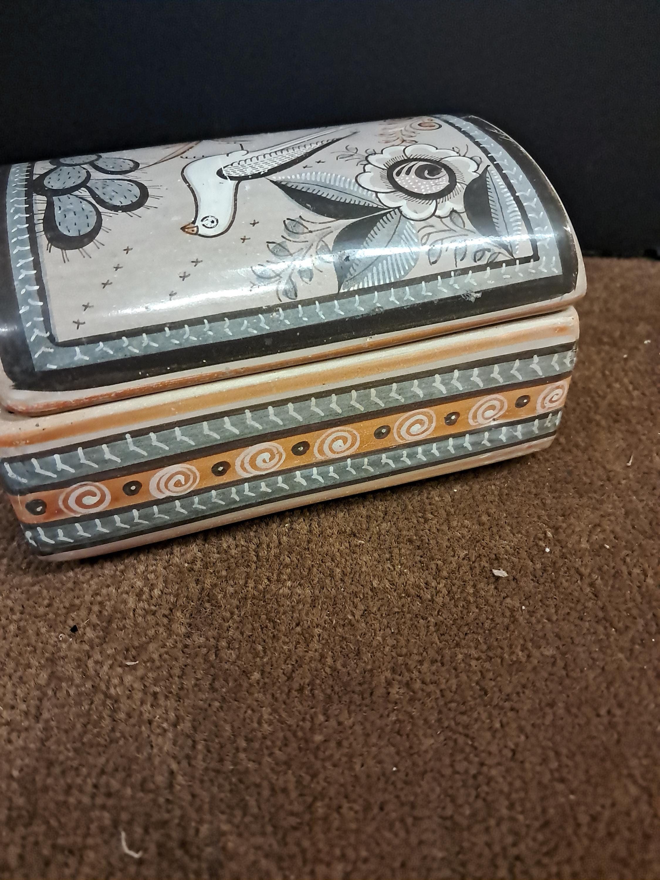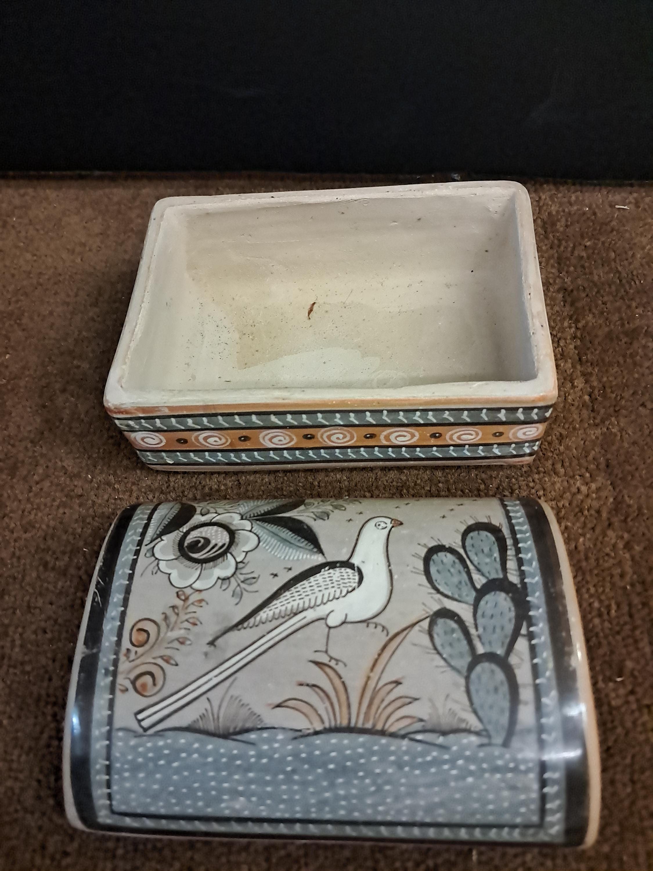 Mexican Tonala Jimon Pottery Trinket BoxFolk Art Paloma Bird Hamd madeBurnished Clay Hand Painted folk art5.5" w x 3.75" t x 3" dExcellent Condition with no damages