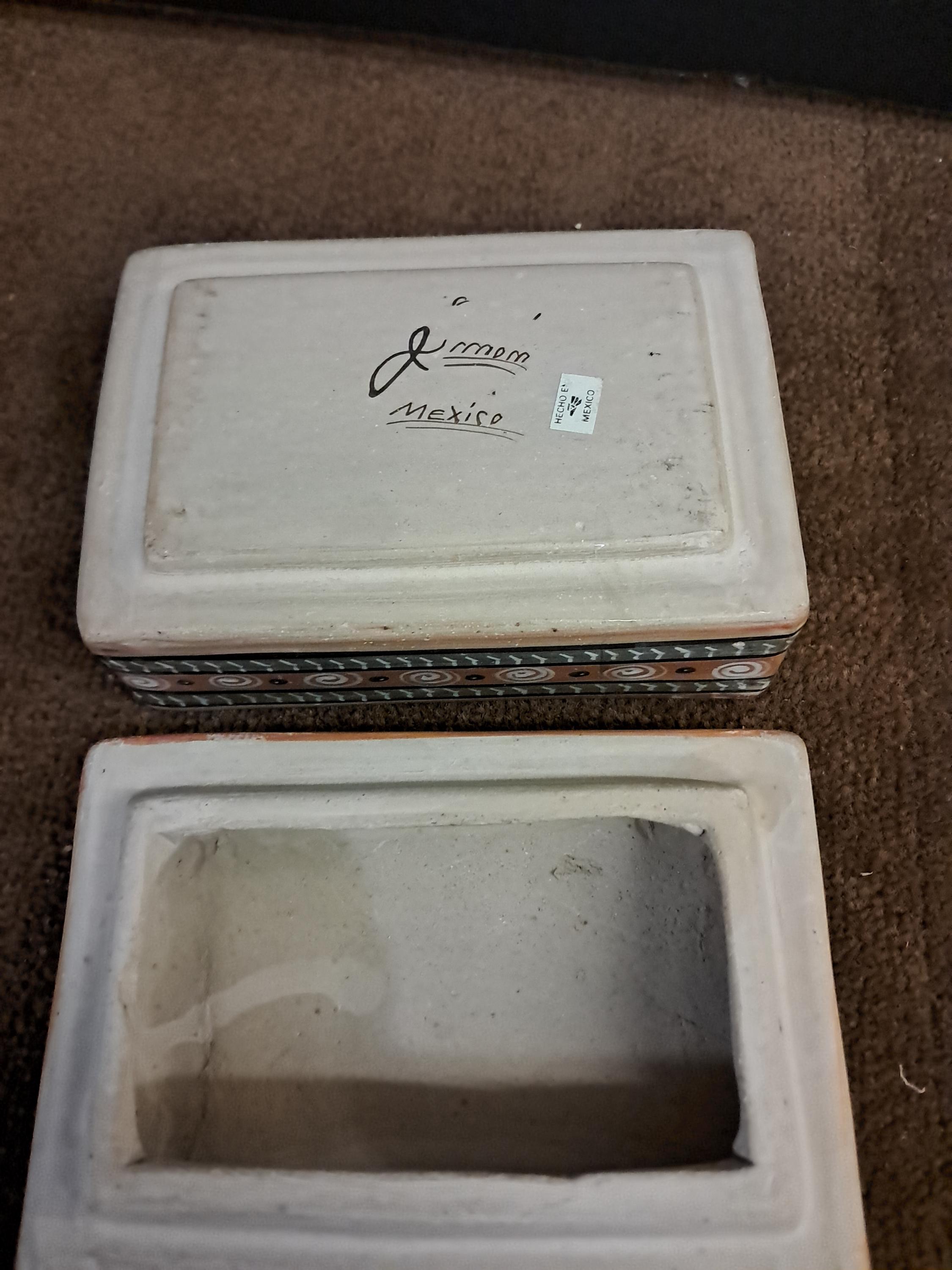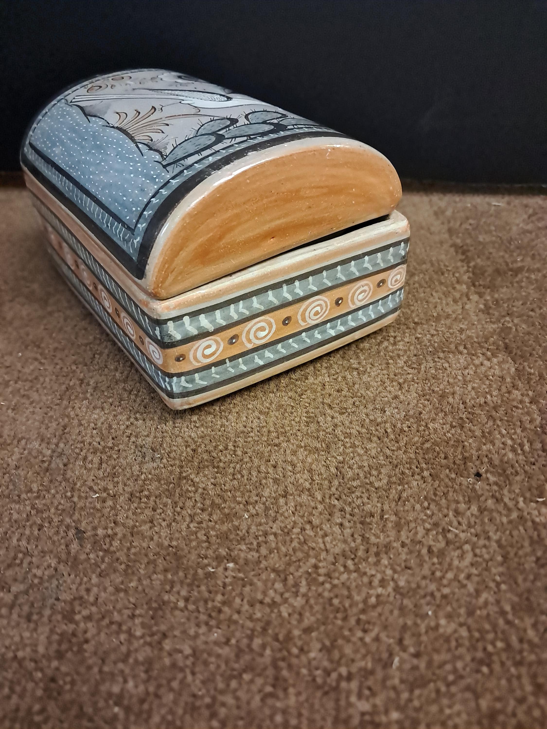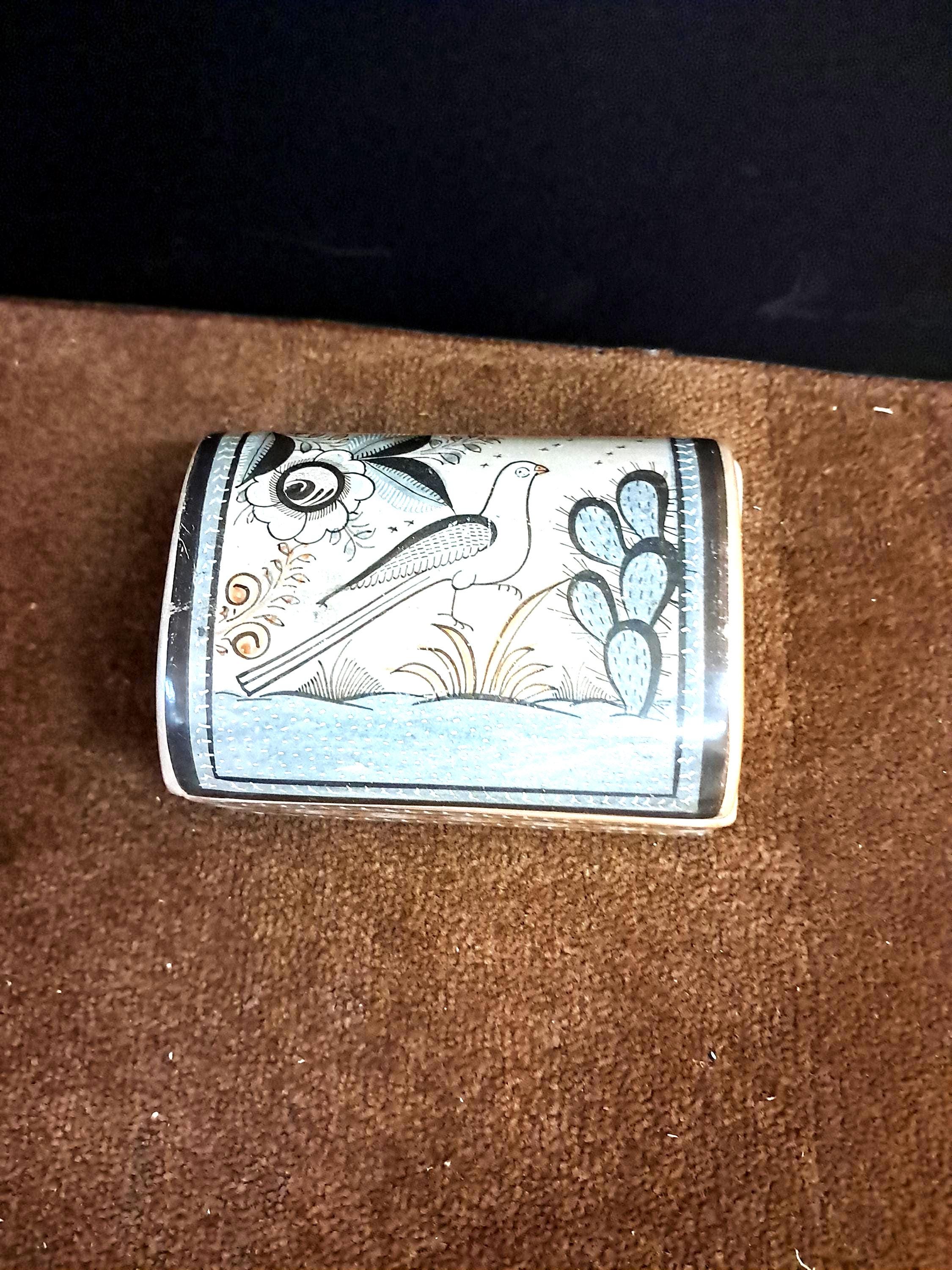 Mexican Tonala Jimon Pottery Trinket BoxFolk Art Paloma Bird Hamd madeBurnished Clay Hand Painted folk art5.5" w x 3.75" t x 3" dExcellent Condition with no damages
