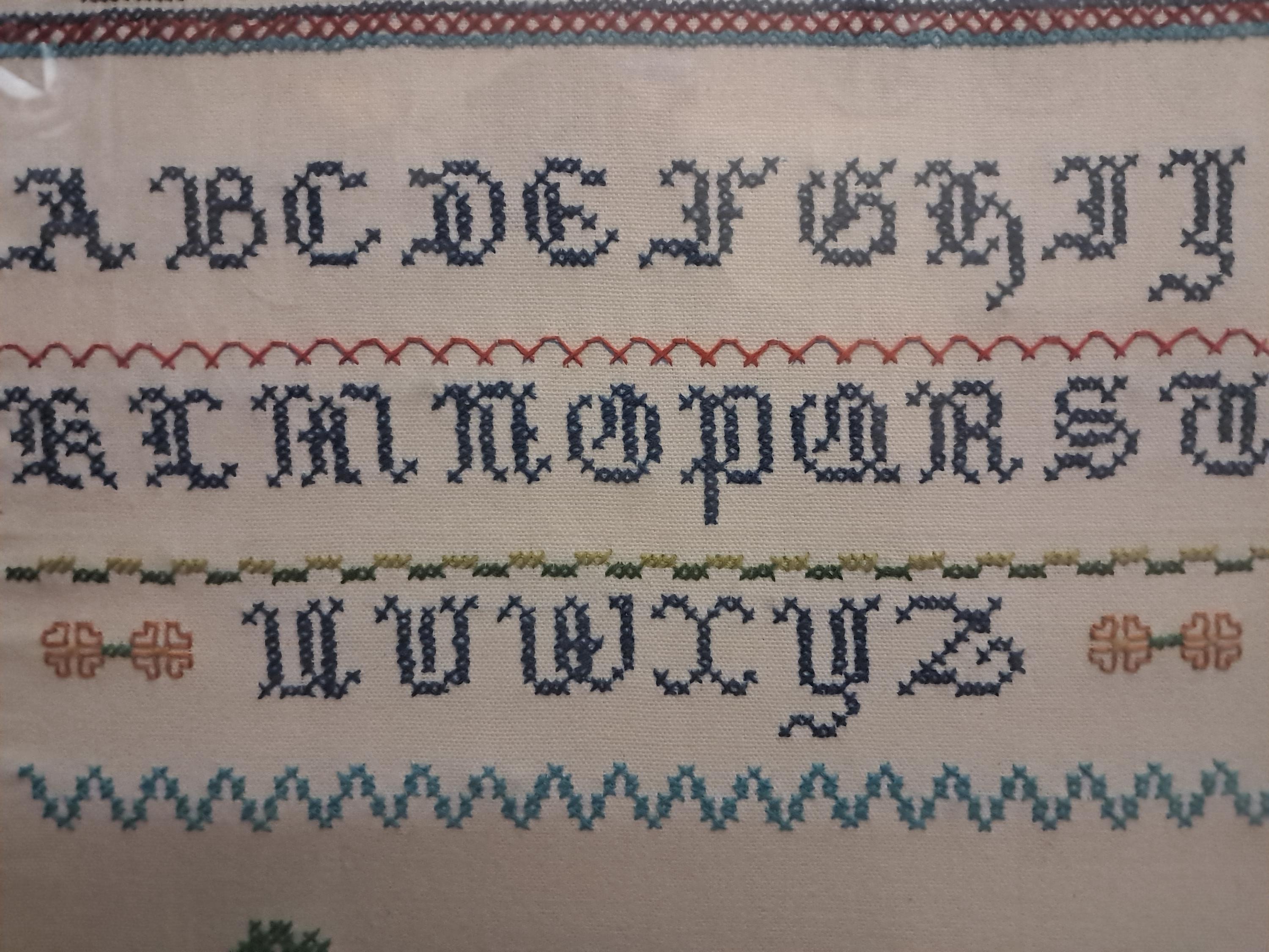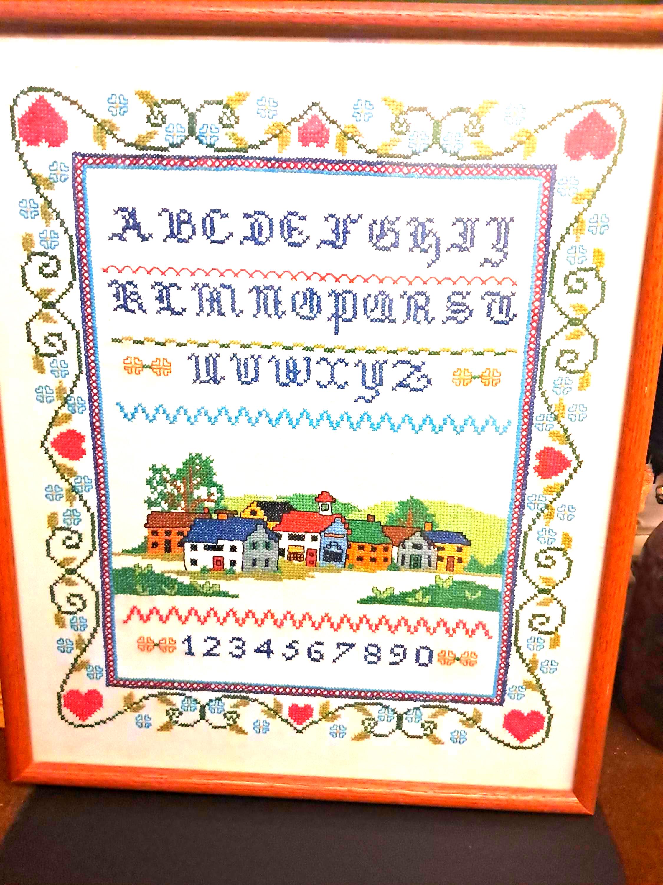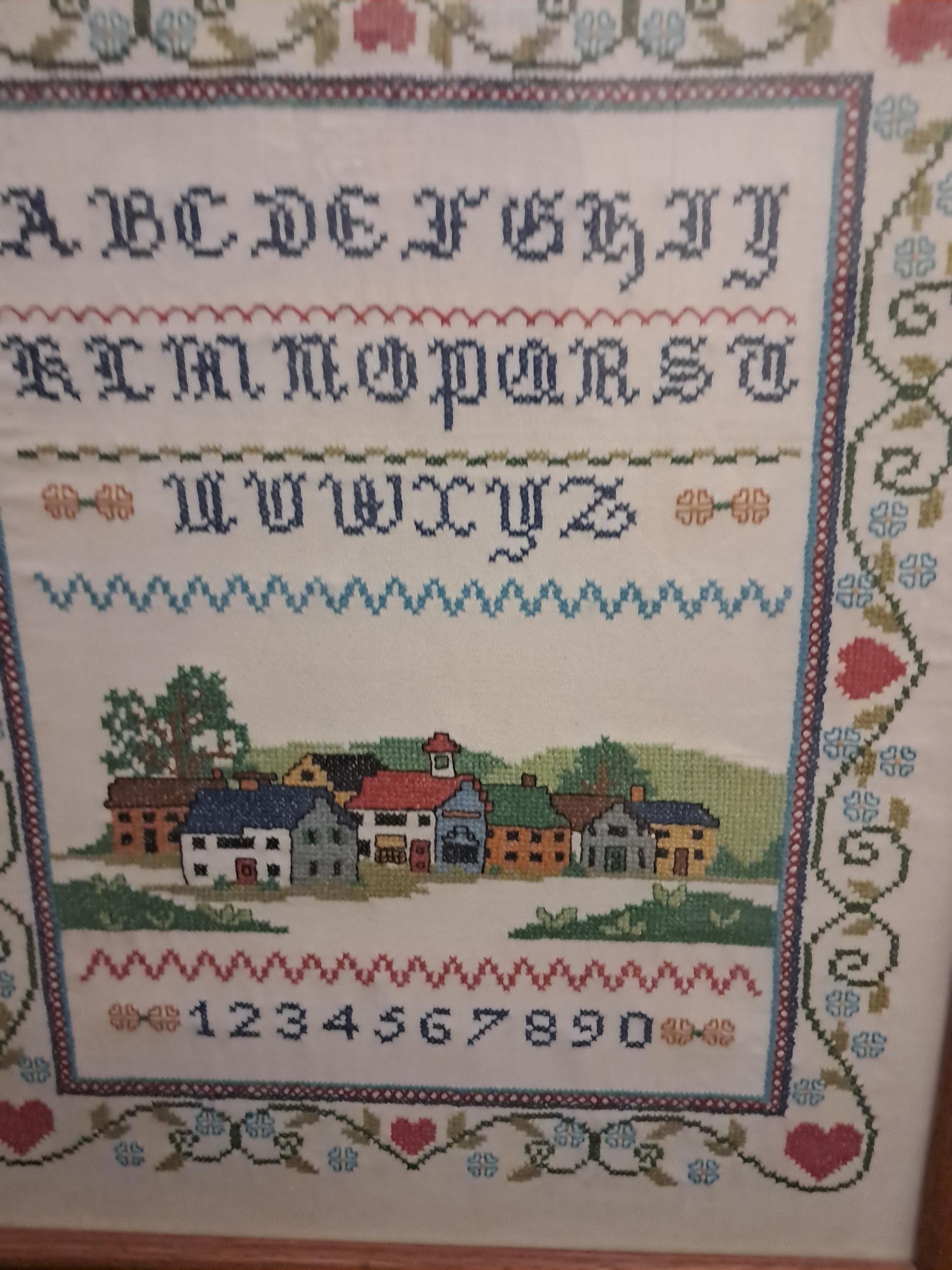 Needlework Sampler, Alphabet, Farm House and Numbers Nicely Framed23" tall x 19" wide x 1.5" deep Excellent Condition