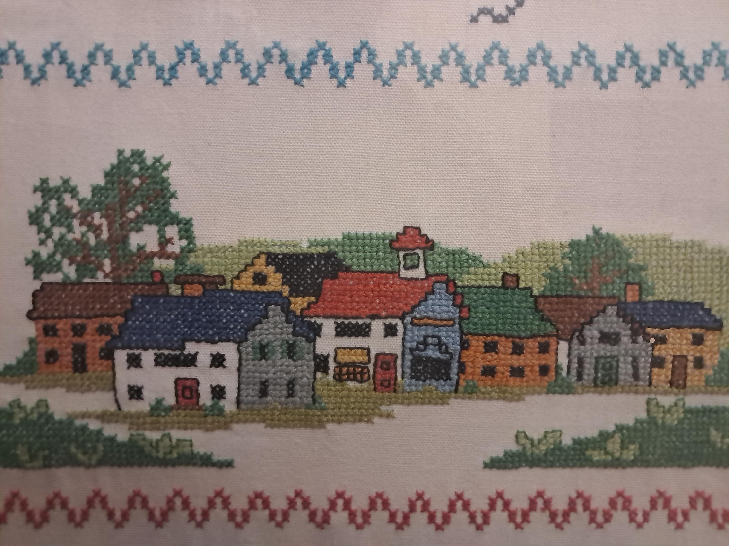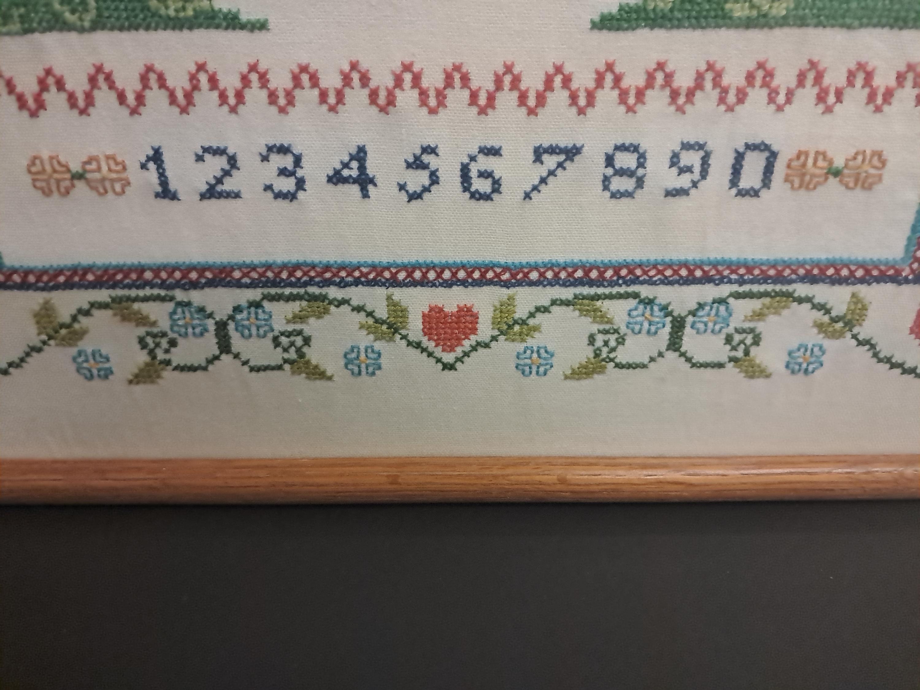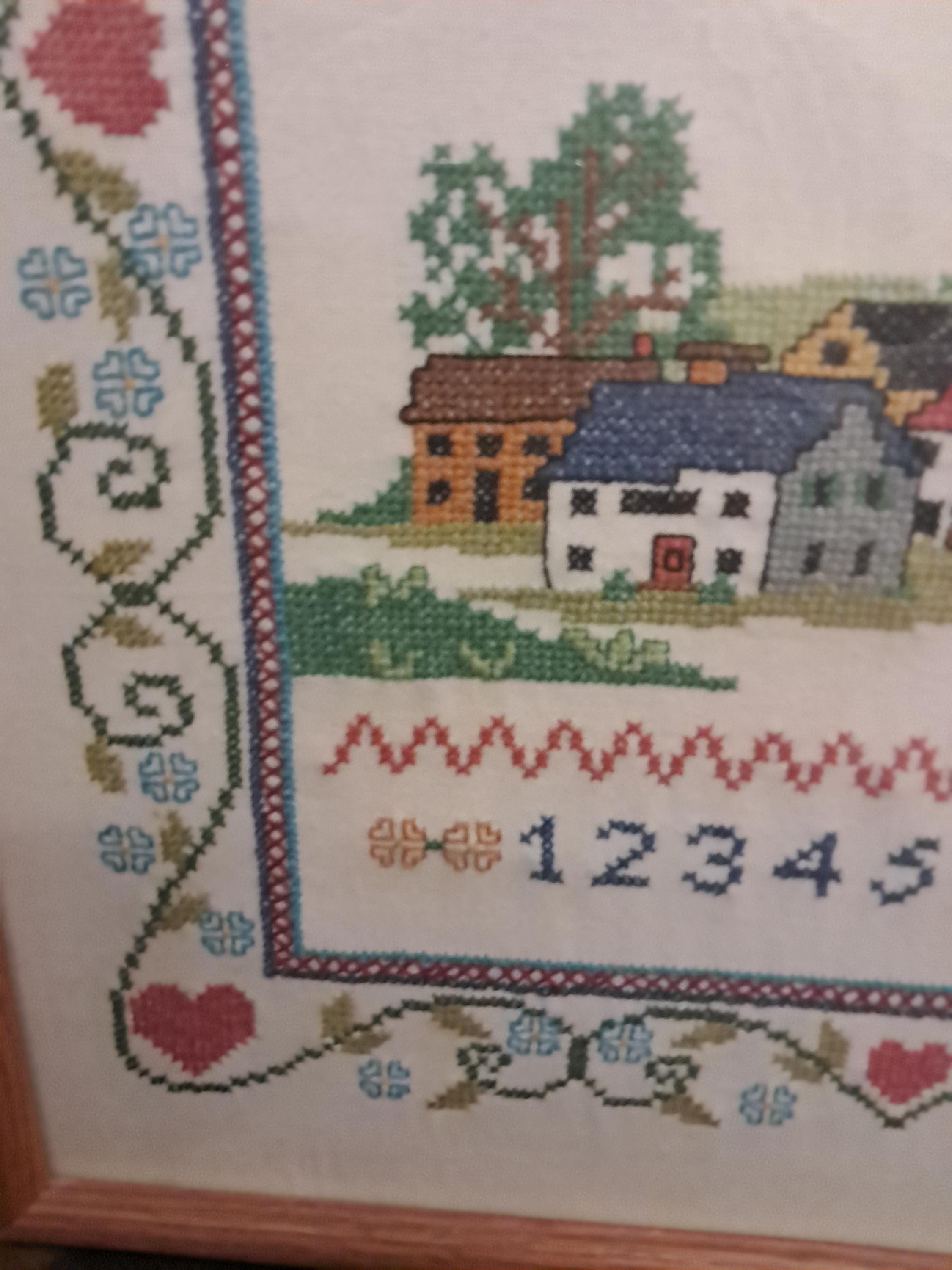 Needlework Sampler, Alphabet, Farm House and Numbers Nicely Framed23" tall x 19" wide x 1.5" deep Excellent Condition